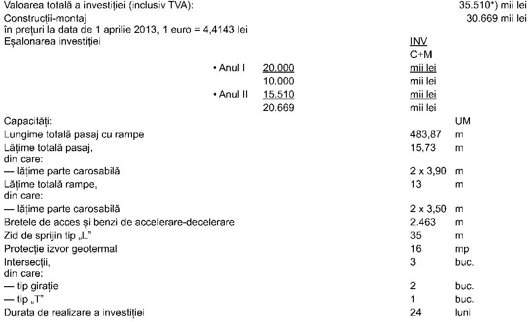 ANEXĂINDICATORII TEHNICO-ECONOMICI ai obiectivului de investiţii „Pasaj suprateran peste drumul de centură al municipiului Oradea în zona Străzii Ciheiului“ Titular: Secretariatul General al Guvernului - Departamentul pentru Proiecte de Infrastructură şi Investiţii Străine Beneficiar: Compania Naţională de Autostrăzi şi Drumuri Naţionale din România - S.A. - Direcţia Regională de Drumuri şi Poduri Bucureşti Amplasament: judeţul Bihor ____*) Valoarea se va actualiza potrivit evoluţiei ulterioare a preţurilor.Factori de risc Obiectivul se va proteja antiseismic, conform Normativului P 100-1/2006. Finanţarea investiţiei Finanţarea obiectivului de investiţii se realizează de la bugetul de stat, prin bugetul Secretariatului General al Guvernului pentru Departamentul pentru Proiecte de Infrastructură şi Investiţii Străine, capitolul 84.01 „Transporturi“, titlul 56 „Proiecte cu finanţare din fonduri externe nerambursabile (FEN) postaderare“, articolul 56.01 „Programe din Fondul European de Dezvoltare Regională - FEDR“, în limita sumelor aprobate anual cu această destinaţie, precum şi din alte surse legal constituite, conform programelor de investiţii publice aprobate potrivit legii.