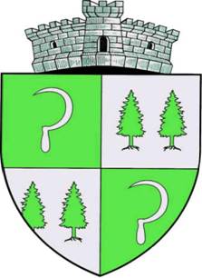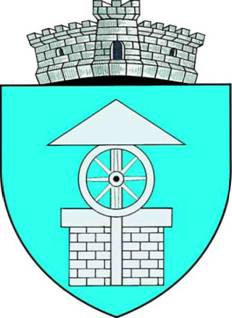 Scutul, pe fond de azur, are o fântână cu roată, de argint.