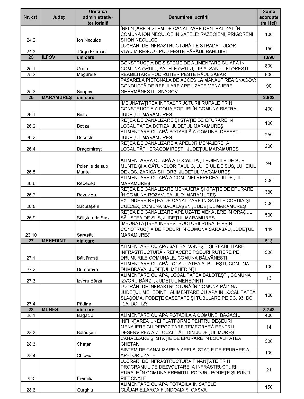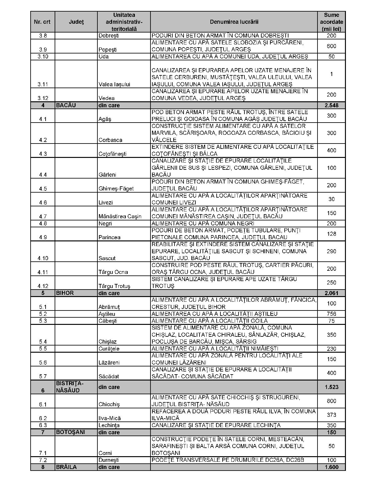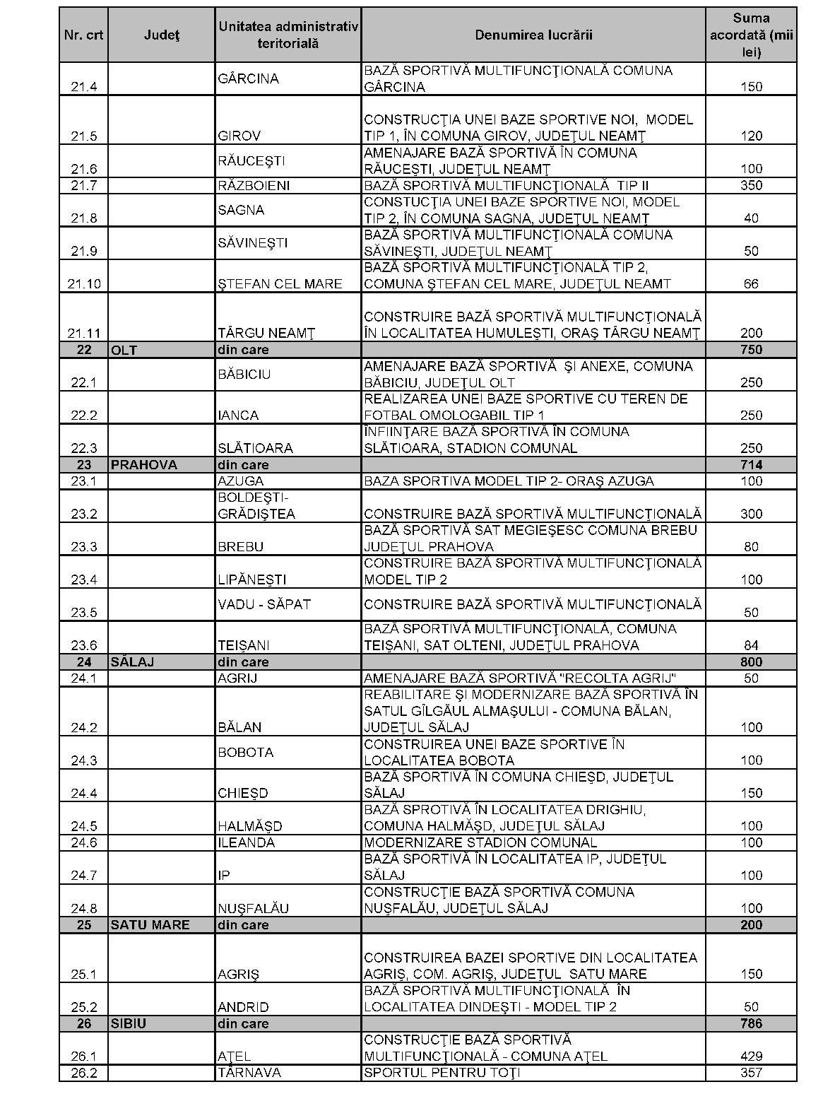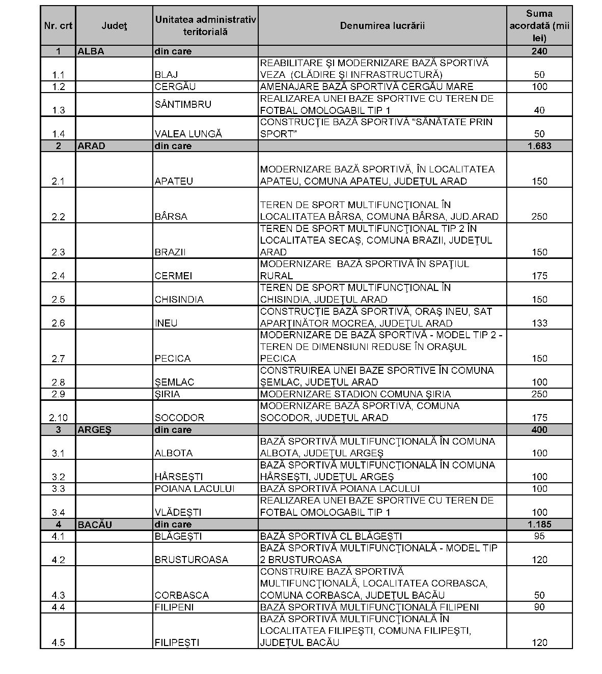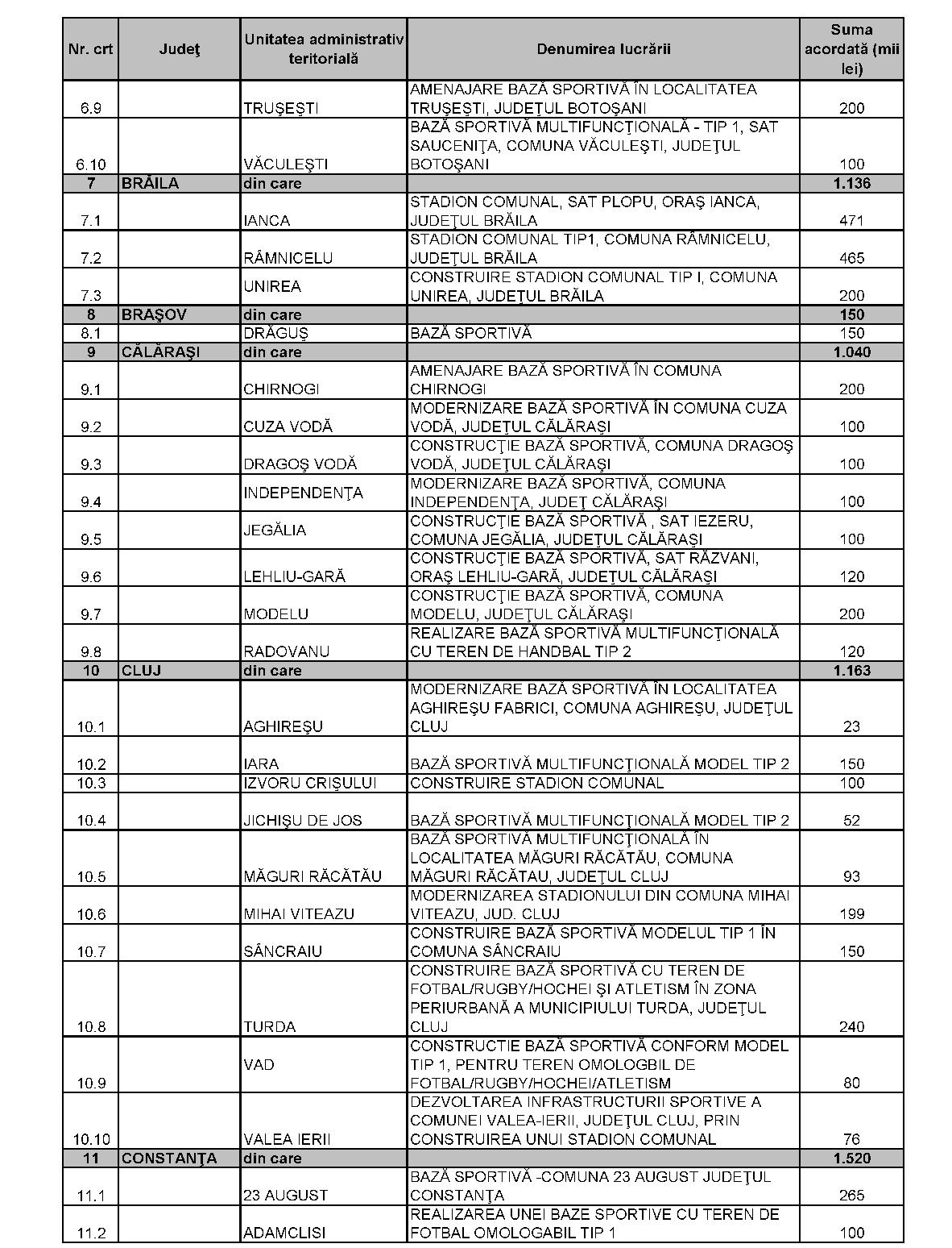 Având în vedere prevederile art. 8 alin. (2) din Ordonanţa Guvernului nr. 7/2006 privind instituirea Programului de dezvoltare a infrastructurii şi a unor baze sportive din spaţiul rural, aprobată cu modificări şi completări prin Legea nr. 71/2007, cu modificările ulterioare,în temeiul art. 108 din Constituţia României, republicată, şi al Legii bugetului de stat pe anul 2010 nr. 11/2010, cu modificările şi completările ulterioare,Guvernul României adoptă prezenta hotărâre. Articolul 1(1) Se aprobă repartizarea sumei de 107.492 mii lei pe proiecte din sume defalcate din taxa pe valoarea adăugată pentru finanţarea Programului de dezvoltare a infrastructurii şi a unor baze sportive din spaţiul rural pe anul 2010, potrivit anexelor nr. 1 şi 2.(2) Suma prevăzută la alin. (1) se utilizează pentru finanţarea cheltuielilor necesare execuţiei lucrărilor de investiţii prevăzute în cererile de finanţare declarate eligibile, selectate în condiţiile legii, în baza criteriilor stabilite în Ghidul de eligibilitate.(3) Unităţilor administrativ-teritoriale prevăzute în anexa nr. 3 li se retrag sume alocate prin Hotărârea Guvernului nr. 977/2010 privind repartizarea pe proiecte a sumelor defalcate din taxa pe valoarea adăugată pentru finanţarea Programului de dezvoltare a infrastructurii şi a unor baze sportive din spaţiul rural pe anul 2010, instituit prin Ordonanţa Guvernului nr. 7/2006 privind instituirea Programului de dezvoltare a infrastructurii şi a unor baze sportive din spaţiul rural, pentru execuţia lucrărilor prevăzute în cererile de finanţare declarate eligibile în cadrul Programului de dezvoltare a infrastructurii şi a unor baze sportive din spaţiul rural, ca urmare a disponibilizării sumelor de către unităţile administrativ-teritoriale. Articolul 2Ordonatorii principali de credite răspund de modul de utilizare, în conformitate cu dispoziţiile legale, a sumei alocate potrivit prevederilor art. 1. Articolul 3Unităţilor administrativ-teritoriale prevăzute în anexe li se asigură finanţarea proiectelor respective din sume defalcate din taxa pe valoarea adăugată alocate bugetelor locale, până la nivelul sumei rezultate în urma îndeplinirii procedurii de atribuire a contractului de achiziţie publică, dar nu mai mult decât suma prevăzută în cererea de finanţare aprobată, potrivit prevederilor Ordonanţei Guvernului nr. 7/2006 privind instituirea Programului de dezvoltare a infrastructurii şi a unor baze sportive din spaţiul rural, aprobată cu modificări şi completări prin Legea nr. 71/2007, cu modificările ulterioare. Articolul 4Ministerul Finanţelor Publice este autorizat să introducă modificările corespunzătoare în volumul şi în structura bugetului de stat pe anul 2010. Articolul 5Anexele nr. 1-3*) fac parte integrantă din prezenta hotărâre.*) Anexele nr. 1-3 sunt reproduse în facsimil. PRIM-MINISTRU EMIL BOC Contrasemnează: Secretarul general al Guvernului, Daniela Nicoleta Andreescu Ministrul dezvoltării regionale şi turismului, Elena Gabriela Udrea Ministrul finanţelor publice, Gheorghe Ialomiţianu Ministrul administraţiei şi internelor, Constantin-Traian Igaş ANEXA Nr. 1ETAPA II Repartizarea pe proiecte a sumelor defalcate din taxa pe valoarea adăugată pentru finanţarea Programului de dezvoltare a infrastructurii din spaţiul rural ANEXA Nr. 2ETAPA II Repartizarea pe proiecte a sumelor defalcate din taxa pe valoarea adăugată pentru finanţarea Programului de dezvoltare a infrastructurii unor baze sportive din spaţiul rural Total general pe judeţe (mii lei) 27.929 ANEXA Nr. 3Retragerea unor sume alocate prin Hotărârea Guvernului nr. 977/2010 privind repartizarea pe proiecte a sumelor defalcate din taxa pe valoarea adăugată pentru finanţarea Programului de dezvoltare a infrastructurii şi a unor baze sportive din spaţiul rural pe anul 2010, instituit prin Ordonanţa Guvernului nr. 7/2006 privind instituirea Programului de dezvoltare a infrastructurii şi a unor baze sportive din spaţiul rural, pentru execuţia de lucrări în cadrul Programului de dezvoltare a infrastructurii şi a unor baze sportive din spaţiul rural