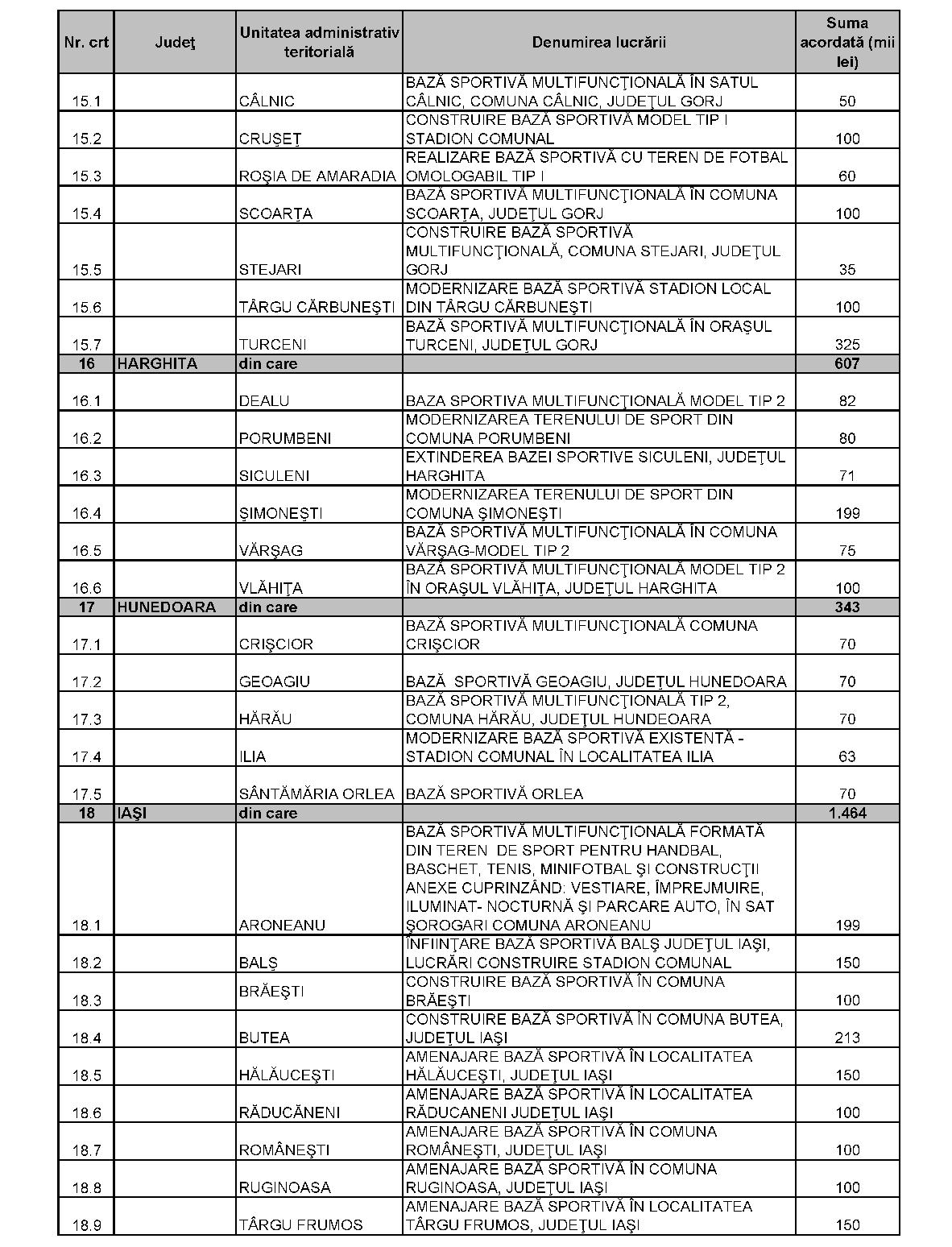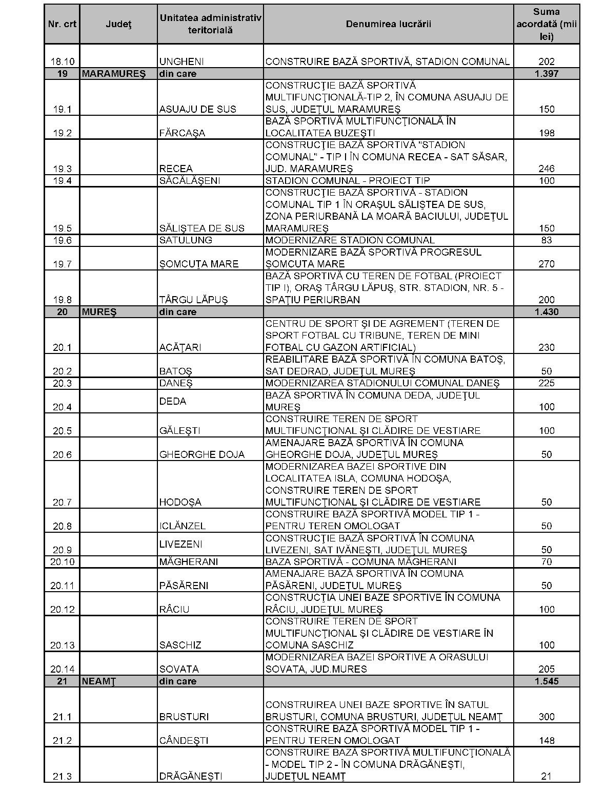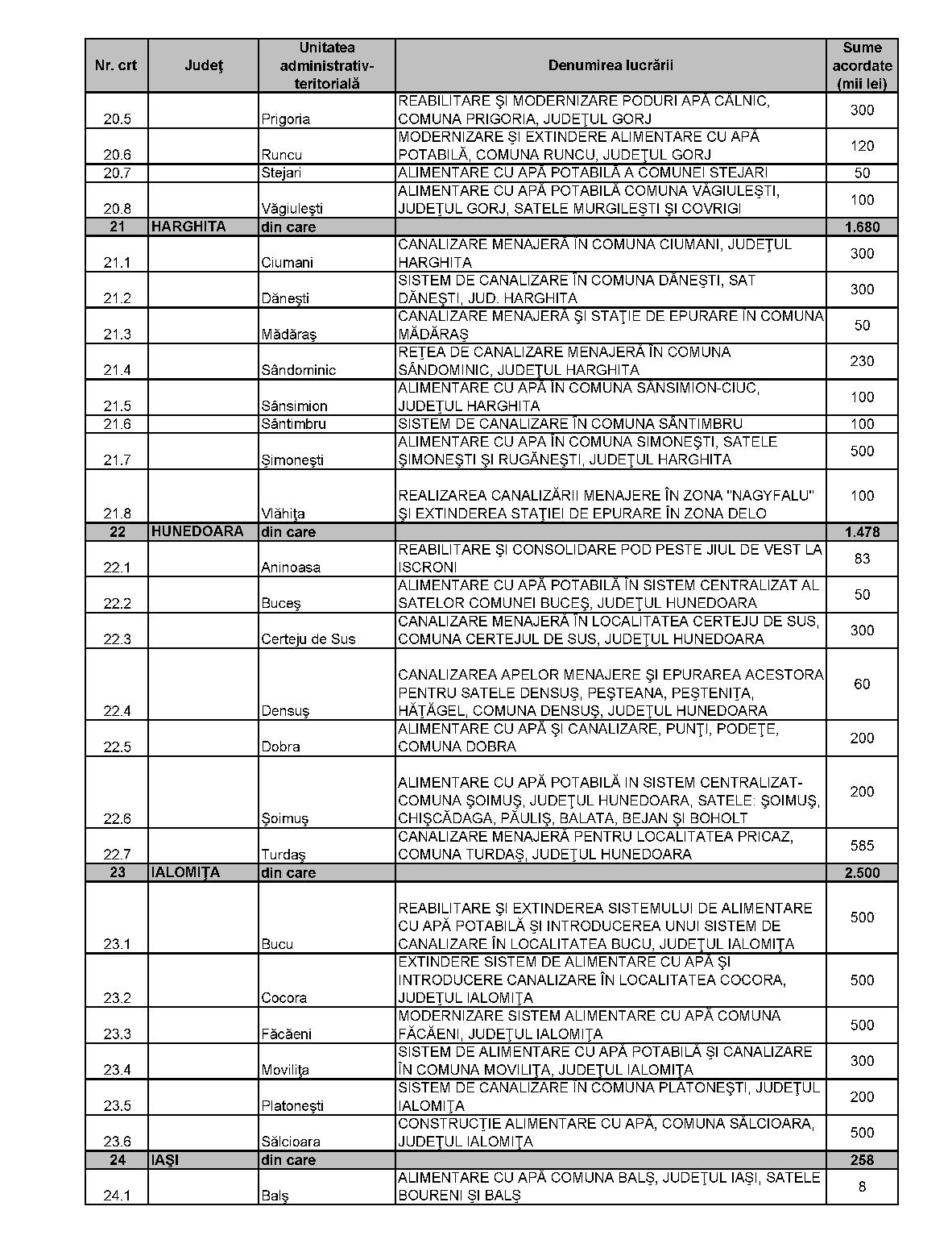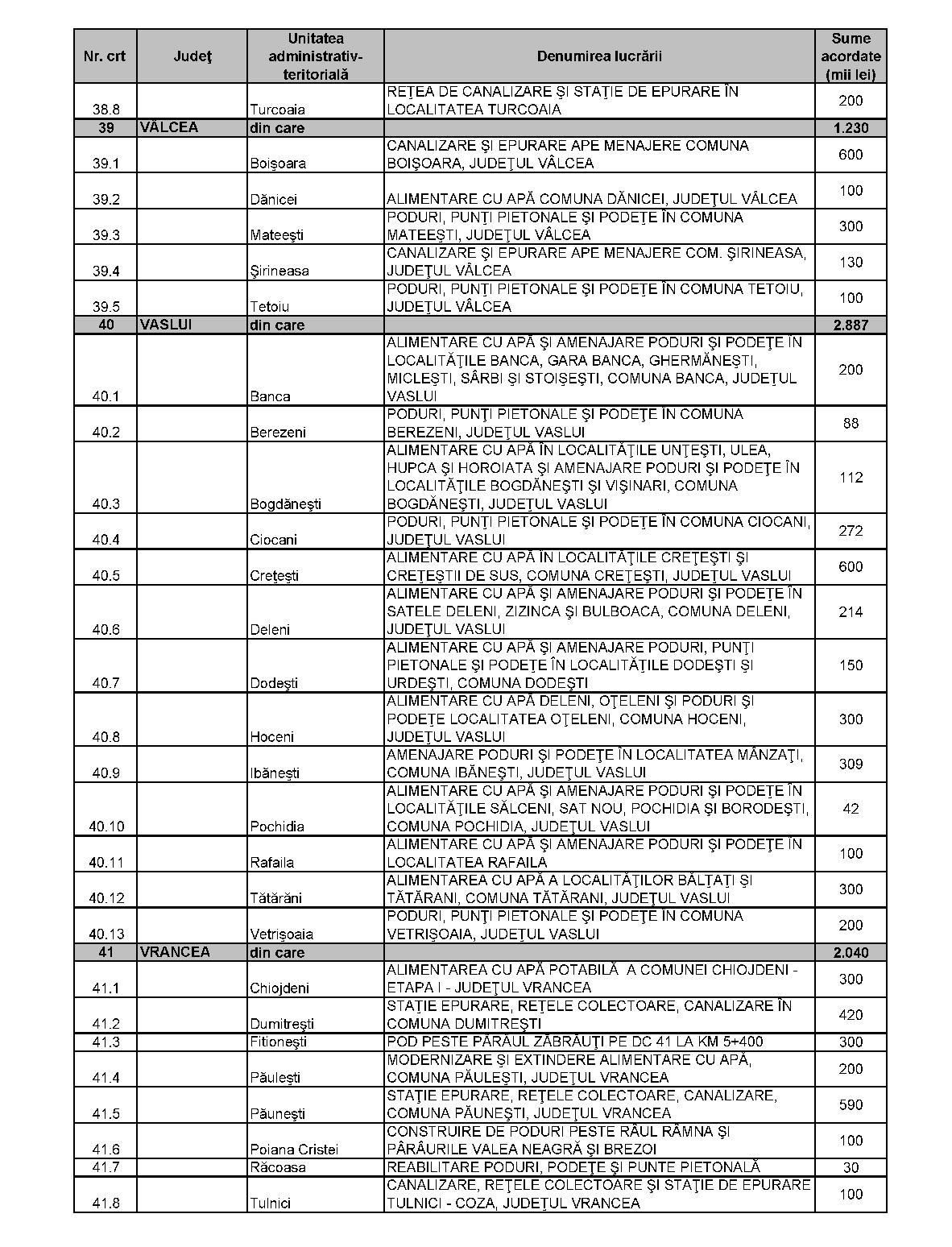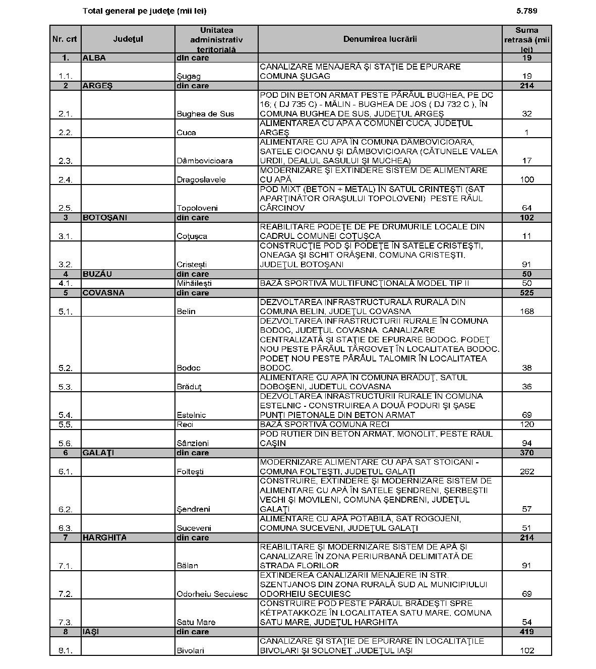 Având în vedere prevederile art. 8 alin. (2) din Ordonanţa Guvernului nr. 7/2006 privind instituirea Programului de dezvoltare a infrastructurii şi a unor baze sportive din spaţiul rural, aprobată cu modificări şi completări prin Legea nr. 71/2007, cu modificările ulterioare,în temeiul art. 108 din Constituţia României, republicată, şi al Legii bugetului de stat pe anul 2010 nr. 11/2010, cu modificările şi completările ulterioare,Guvernul României adoptă prezenta hotărâre. Articolul 1(1) Se aprobă repartizarea sumei de 107.492 mii lei pe proiecte din sume defalcate din taxa pe valoarea adăugată pentru finanţarea Programului de dezvoltare a infrastructurii şi a unor baze sportive din spaţiul rural pe anul 2010, potrivit anexelor nr. 1 şi 2.(2) Suma prevăzută la alin. (1) se utilizează pentru finanţarea cheltuielilor necesare execuţiei lucrărilor de investiţii prevăzute în cererile de finanţare declarate eligibile, selectate în condiţiile legii, în baza criteriilor stabilite în Ghidul de eligibilitate.(3) Unităţilor administrativ-teritoriale prevăzute în anexa nr. 3 li se retrag sume alocate prin Hotărârea Guvernului nr. 977/2010 privind repartizarea pe proiecte a sumelor defalcate din taxa pe valoarea adăugată pentru finanţarea Programului de dezvoltare a infrastructurii şi a unor baze sportive din spaţiul rural pe anul 2010, instituit prin Ordonanţa Guvernului nr. 7/2006 privind instituirea Programului de dezvoltare a infrastructurii şi a unor baze sportive din spaţiul rural, pentru execuţia lucrărilor prevăzute în cererile de finanţare declarate eligibile în cadrul Programului de dezvoltare a infrastructurii şi a unor baze sportive din spaţiul rural, ca urmare a disponibilizării sumelor de către unităţile administrativ-teritoriale. Articolul 2Ordonatorii principali de credite răspund de modul de utilizare, în conformitate cu dispoziţiile legale, a sumei alocate potrivit prevederilor art. 1. Articolul 3Unităţilor administrativ-teritoriale prevăzute în anexe li se asigură finanţarea proiectelor respective din sume defalcate din taxa pe valoarea adăugată alocate bugetelor locale, până la nivelul sumei rezultate în urma îndeplinirii procedurii de atribuire a contractului de achiziţie publică, dar nu mai mult decât suma prevăzută în cererea de finanţare aprobată, potrivit prevederilor Ordonanţei Guvernului nr. 7/2006 privind instituirea Programului de dezvoltare a infrastructurii şi a unor baze sportive din spaţiul rural, aprobată cu modificări şi completări prin Legea nr. 71/2007, cu modificările ulterioare. Articolul 4Ministerul Finanţelor Publice este autorizat să introducă modificările corespunzătoare în volumul şi în structura bugetului de stat pe anul 2010. Articolul 5Anexele nr. 1-3*) fac parte integrantă din prezenta hotărâre.*) Anexele nr. 1-3 sunt reproduse în facsimil. PRIM-MINISTRU EMIL BOC Contrasemnează: Secretarul general al Guvernului, Daniela Nicoleta Andreescu Ministrul dezvoltării regionale şi turismului, Elena Gabriela Udrea Ministrul finanţelor publice, Gheorghe Ialomiţianu Ministrul administraţiei şi internelor, Constantin-Traian Igaş ANEXA Nr. 1ETAPA II Repartizarea pe proiecte a sumelor defalcate din taxa pe valoarea adăugată pentru finanţarea Programului de dezvoltare a infrastructurii din spaţiul rural ANEXA Nr. 2ETAPA II Repartizarea pe proiecte a sumelor defalcate din taxa pe valoarea adăugată pentru finanţarea Programului de dezvoltare a infrastructurii unor baze sportive din spaţiul rural Total general pe judeţe (mii lei) 27.929 ANEXA Nr. 3Retragerea unor sume alocate prin Hotărârea Guvernului nr. 977/2010 privind repartizarea pe proiecte a sumelor defalcate din taxa pe valoarea adăugată pentru finanţarea Programului de dezvoltare a infrastructurii şi a unor baze sportive din spaţiul rural pe anul 2010, instituit prin Ordonanţa Guvernului nr. 7/2006 privind instituirea Programului de dezvoltare a infrastructurii şi a unor baze sportive din spaţiul rural, pentru execuţia de lucrări în cadrul Programului de dezvoltare a infrastructurii şi a unor baze sportive din spaţiul rural