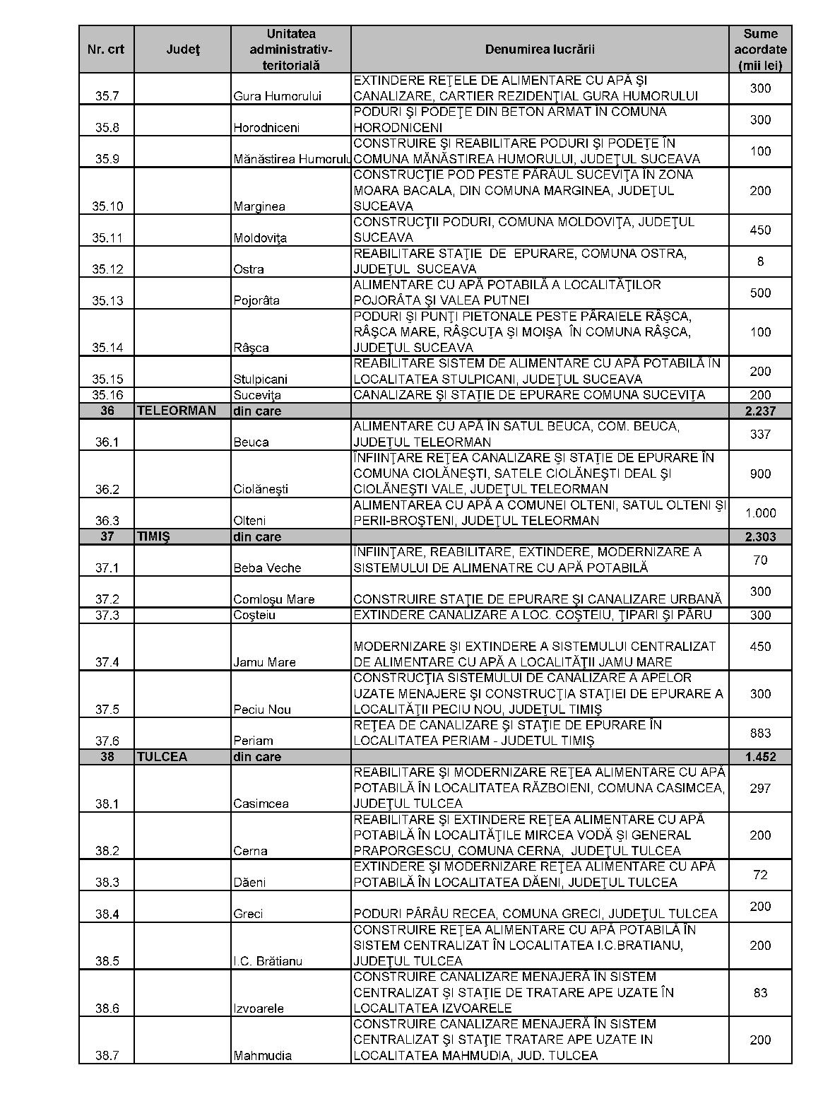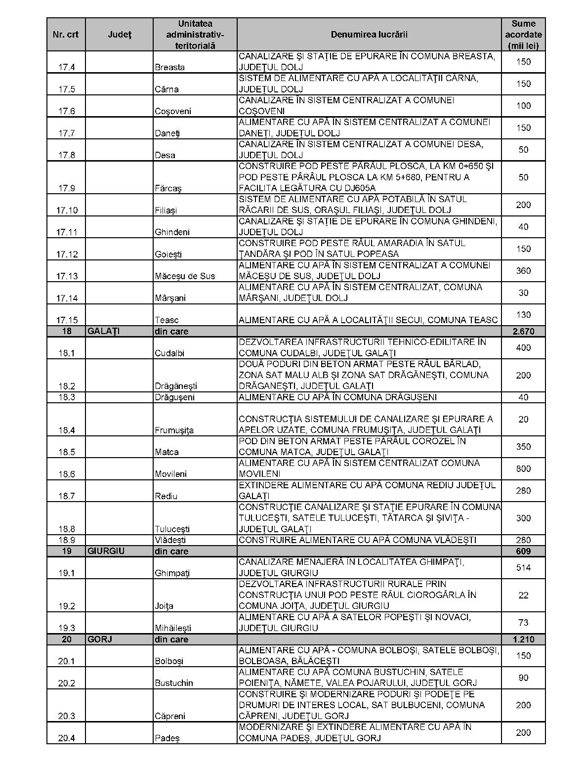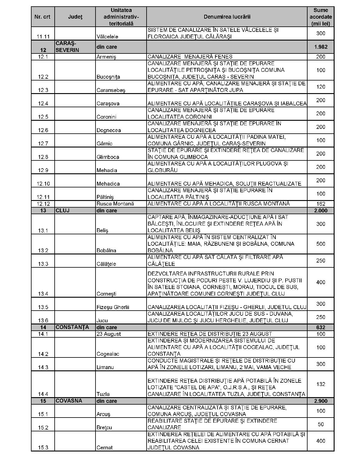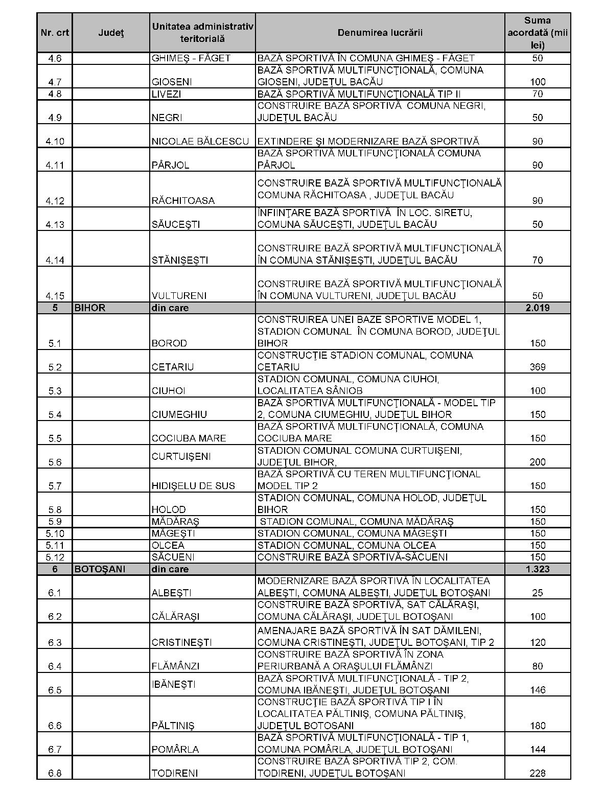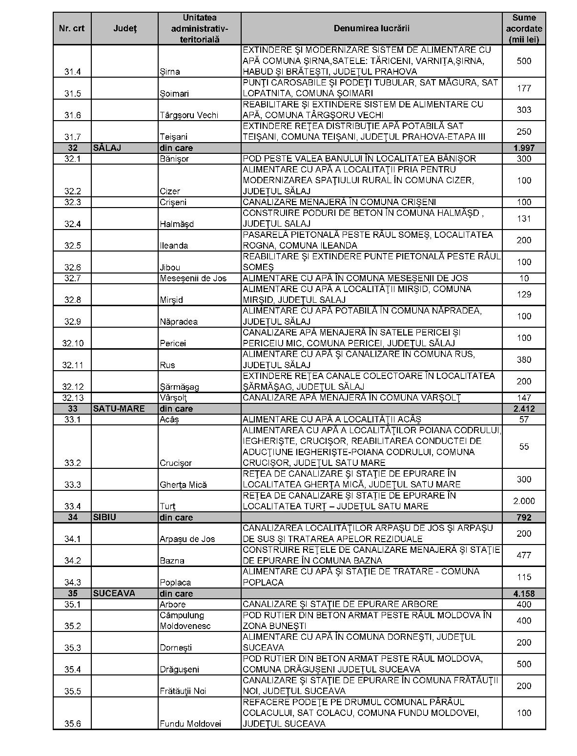 Având în vedere prevederile art. 8 alin. (2) din Ordonanţa Guvernului nr. 7/2006 privind instituirea Programului de dezvoltare a infrastructurii şi a unor baze sportive din spaţiul rural, aprobată cu modificări şi completări prin Legea nr. 71/2007, cu modificările ulterioare,în temeiul art. 108 din Constituţia României, republicată, şi al Legii bugetului de stat pe anul 2010 nr. 11/2010, cu modificările şi completările ulterioare,Guvernul României adoptă prezenta hotărâre. Articolul 1(1) Se aprobă repartizarea sumei de 107.492 mii lei pe proiecte din sume defalcate din taxa pe valoarea adăugată pentru finanţarea Programului de dezvoltare a infrastructurii şi a unor baze sportive din spaţiul rural pe anul 2010, potrivit anexelor nr. 1 şi 2.(2) Suma prevăzută la alin. (1) se utilizează pentru finanţarea cheltuielilor necesare execuţiei lucrărilor de investiţii prevăzute în cererile de finanţare declarate eligibile, selectate în condiţiile legii, în baza criteriilor stabilite în Ghidul de eligibilitate.(3) Unităţilor administrativ-teritoriale prevăzute în anexa nr. 3 li se retrag sume alocate prin Hotărârea Guvernului nr. 977/2010 privind repartizarea pe proiecte a sumelor defalcate din taxa pe valoarea adăugată pentru finanţarea Programului de dezvoltare a infrastructurii şi a unor baze sportive din spaţiul rural pe anul 2010, instituit prin Ordonanţa Guvernului nr. 7/2006 privind instituirea Programului de dezvoltare a infrastructurii şi a unor baze sportive din spaţiul rural, pentru execuţia lucrărilor prevăzute în cererile de finanţare declarate eligibile în cadrul Programului de dezvoltare a infrastructurii şi a unor baze sportive din spaţiul rural, ca urmare a disponibilizării sumelor de către unităţile administrativ-teritoriale. Articolul 2Ordonatorii principali de credite răspund de modul de utilizare, în conformitate cu dispoziţiile legale, a sumei alocate potrivit prevederilor art. 1. Articolul 3Unităţilor administrativ-teritoriale prevăzute în anexe li se asigură finanţarea proiectelor respective din sume defalcate din taxa pe valoarea adăugată alocate bugetelor locale, până la nivelul sumei rezultate în urma îndeplinirii procedurii de atribuire a contractului de achiziţie publică, dar nu mai mult decât suma prevăzută în cererea de finanţare aprobată, potrivit prevederilor Ordonanţei Guvernului nr. 7/2006 privind instituirea Programului de dezvoltare a infrastructurii şi a unor baze sportive din spaţiul rural, aprobată cu modificări şi completări prin Legea nr. 71/2007, cu modificările ulterioare. Articolul 4Ministerul Finanţelor Publice este autorizat să introducă modificările corespunzătoare în volumul şi în structura bugetului de stat pe anul 2010. Articolul 5Anexele nr. 1-3*) fac parte integrantă din prezenta hotărâre.*) Anexele nr. 1-3 sunt reproduse în facsimil. PRIM-MINISTRU EMIL BOC Contrasemnează: Secretarul general al Guvernului, Daniela Nicoleta Andreescu Ministrul dezvoltării regionale şi turismului, Elena Gabriela Udrea Ministrul finanţelor publice, Gheorghe Ialomiţianu Ministrul administraţiei şi internelor, Constantin-Traian Igaş ANEXA Nr. 1ETAPA II Repartizarea pe proiecte a sumelor defalcate din taxa pe valoarea adăugată pentru finanţarea Programului de dezvoltare a infrastructurii din spaţiul rural ANEXA Nr. 2ETAPA II Repartizarea pe proiecte a sumelor defalcate din taxa pe valoarea adăugată pentru finanţarea Programului de dezvoltare a infrastructurii unor baze sportive din spaţiul rural Total general pe judeţe (mii lei) 27.929 ANEXA Nr. 3Retragerea unor sume alocate prin Hotărârea Guvernului nr. 977/2010 privind repartizarea pe proiecte a sumelor defalcate din taxa pe valoarea adăugată pentru finanţarea Programului de dezvoltare a infrastructurii şi a unor baze sportive din spaţiul rural pe anul 2010, instituit prin Ordonanţa Guvernului nr. 7/2006 privind instituirea Programului de dezvoltare a infrastructurii şi a unor baze sportive din spaţiul rural, pentru execuţia de lucrări în cadrul Programului de dezvoltare a infrastructurii şi a unor baze sportive din spaţiul rural