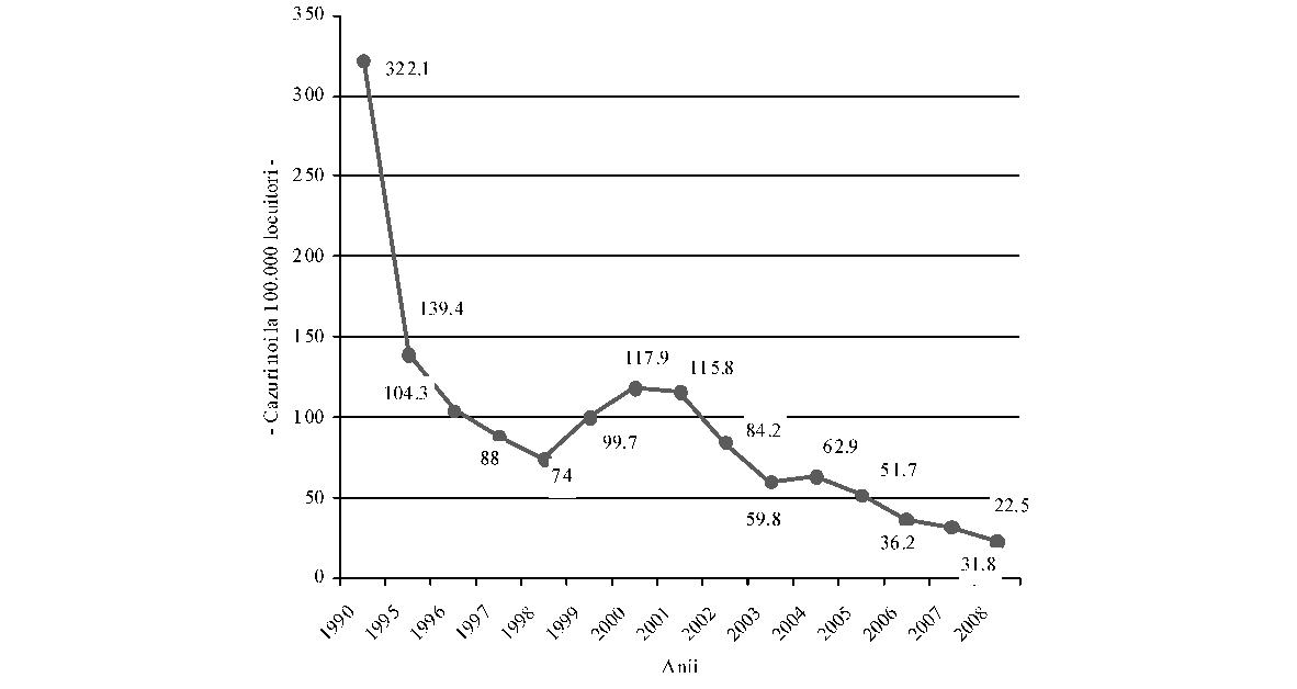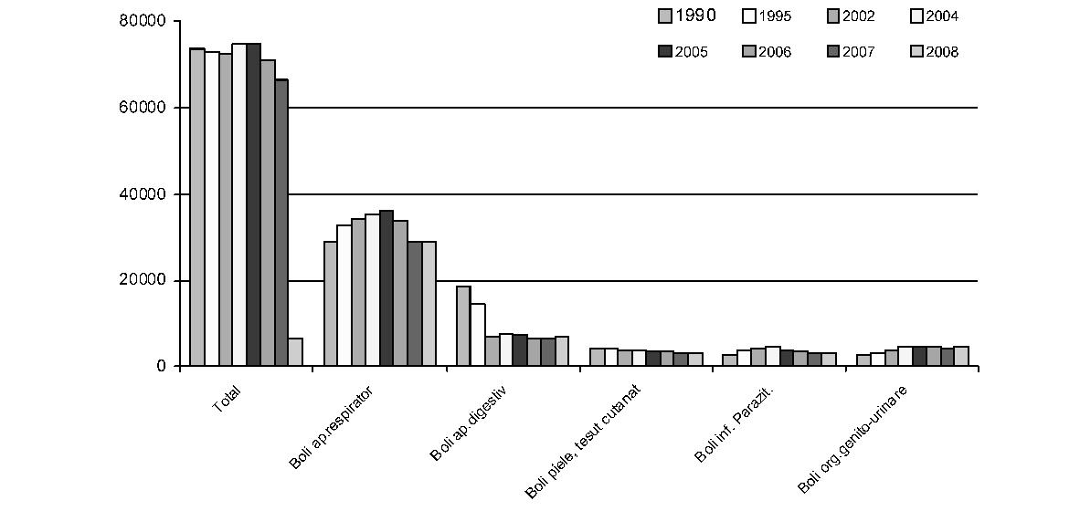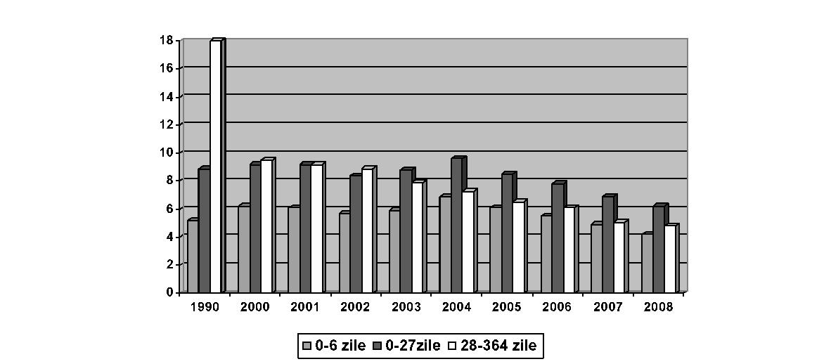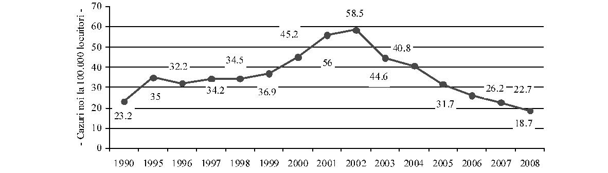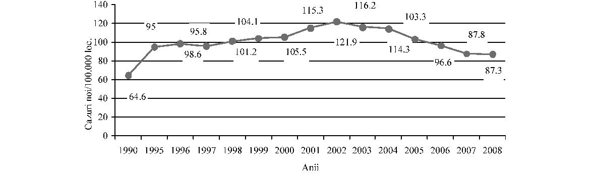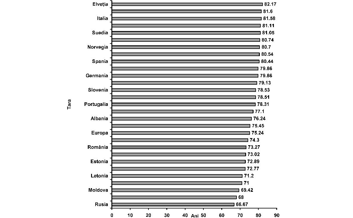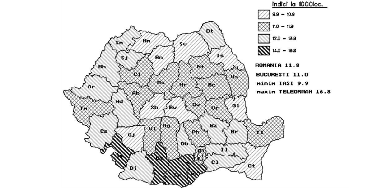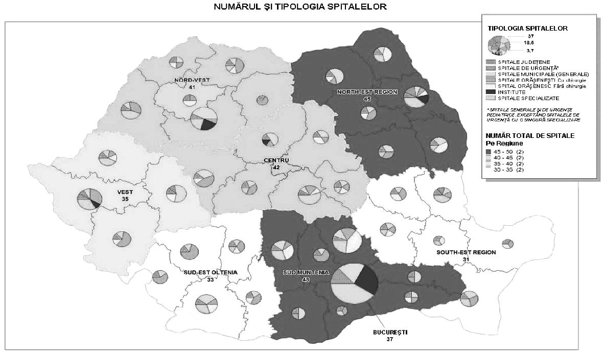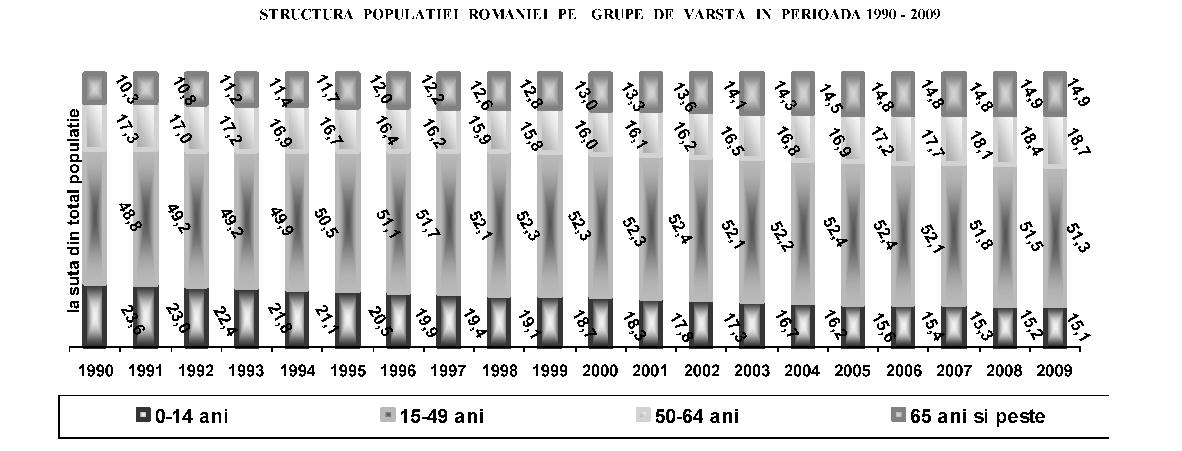Fig. 2. Caracteristici ale celor 8 regiuni de dezvoltare din România Sursa: 2009, Banca Mondială, „România - asistenţă tehnică pentru sprijinirea actualizării strategiei spitaliceşti“ Din analiza datelor din tabel corelate cu împărţirea judeţelor în euroregiuni, având în vedere barierele geografice şi infrastructura slabă de transporturi, rezultă că delimitarea celor 8 regiuni nu rezolvă şi, în unele cazuri, poate chiar agrava problemele legate de transport. Un exemplu este judeţul Buzău sau judeţul Vrancea, mai apropiate de alte centre (Bucureşti, Iaşi) decât de propriul centru regional (Constanţa). În unele cazuri, un pacient trebuie să traverseze câteva cursuri de apă (la vest de judeţul Suceava spre Iaşi), un efort dificil în timpul iernii, pentru a ajunge la centrul regional. Ca atare, o planificare a sistemului de sănătate va trebui să ia în considerare atât aspectele regionale, cât şi pe cele privitoare la acces, pentru a estima posibilitatea de a utiliza euroregiunile de dezvoltare ca unităţi pentru planificarea reţelelor medicale. B. Aspecte demografice şi de morbiditate Din punctul de vedere al stării de sănătate, populaţia României prezintă unii dintre cei mai defavorabili indicatori din întreaga zonă europeană, nu doar de la nivelul Uniunii Europene. Datele de morbiditate şi mortalitate prezintă un amestec de indicatori specifici ţărilor dezvoltate, mortalitate ridicată prin boli cardiovasculare, creşterea bolilor neoplazice, cu indicatori specifici mai ales în ţările în curs de dezvoltare, precum recrudescenţa bolilor infecţioase, de la tuberculoză la cele cu transmitere sexuală. Astfel, deşi prezintă o uşoară îmbunătăţire, speranţa medie de viaţă de 71,7 ani continuă să fie printre cele mai scăzute din regiune. Indicatorii de mortalitate infantilă şi mortalitate maternă, care au o puternică asociere cu nivelul socio-economic, plasează în continuare România pe unul dintre ultimele locuri în Uniunea Europeană. Principalele cauze de deces în România sunt reprezentate de bolile aparatului cardiovascular, urmate de tumori, boli digestive, leziuni traumatice, otrăviri şi boli ale aparatului respirator. De remarcat că, spre deosebire de tendinţa de reducere a mortalităţii cauzate de bolile cardiovasculare din vestul Uniunii Europene, în România se înregistrează o puternică tendinţă de creştere a acesteia. În ceea ce priveşte decesele prin afecţiuni maligne, chiar dacă frecvenţa acestora este sub media Uniunii Europene, se remarcă decesele evitabile precum cele în cazul cancerului de col, aspect ce reprezintă un indicator direct al inadecvării sistemului sanitar la nevoile reale ale populaţiei. Se poate astfel constata că în România modelele de morbiditate şi mortalitate au suferit modificări importante în ultimele decenii, în sensul creşterii prevalenţei bolilor cronice şi a mortalităţii din aceste cauze, în contextul creşterii ponderii populaţiei vârstnice, asociată cu acţiunea multiplă a factorilor de risc biologici, de mediu, comportamentali şi cu influenţa condiţiilor socio-economice şi de asistenţă medicală. Analizele Uniunii Europene referitoare la decesele evitabile datorate sistemului sanitar arată că România ocupă primul loc în Uniunea Europeană atât la mortalitatea la femei, cât şi la bărbaţi; mai mult, dacă tendinţa în acest domeniu este de scădere semnificativă în toate celelalte ţări ale Uniunii Europene, în România aceasta este fie redusă (la femei), fie staţionară (la bărbaţi). În acelaşi timp, afecţiuni care în multe state ale Uniunii Europene sunt aproape eradicate continuă să afecteze un număr mult prea mare de români, mai ales dintre acelea care pot fi prevenite şi controlate printr-un sistem sanitar public eficient şi aici se află atât multe dintre bolile transmisibile, cât şi multe alte afecţiuni. Spre exemplu: incidenţa hepatitei B este dublă faţă de media Uniunii Europene, România are cea mai mare incidenţă a tuberculozei din Uniunea Europeană, iar femeile din România au cea mai mare rată a decesului prin cancerul de col uterin, riscul de deces prin această afecţiune fiind de peste 10 ori mai mare în România decât în ţări precum Franţa sau Finlanda şi de 3-4 ori mai mari decât în Slovacia sau Cehia, deşi această formă de cancer este actualmente uşor de prevenit şi de vindecat prin depistarea precoce. Referindu-ne la mortalitatea evitabilă, adică la acele afecţiuni care pot fi tratate de către un sistem de sănătate funcţional, datele statistice plasează România într-o situaţie şi mai dificilă: aproape jumătate din decesele la bărbaţi şi peste o treime din cele la femei puteau fi evitate (Health Status and Living Conditions Network, European Comission, „Employment, Social Affairs and Equal Opportunities“, 2006). În perioada 1990-2009 populaţia României a urmat un trend constant de scădere, de la 23.206.720 la 21.469.959 în 2009 (1 iulie), în bună parte din cauza emigrării după revoluţie, dar şi scăderii natalităţii, în contextul menţinerii mortalităţii generale la un nivel ridicat, chiar a creşterii ei în unii ani. În consecinţă, sporul natural s-a negativat începând cu anul 1992 (–0,2‰). Ca urmare a scăzut în mod accentuat populaţia tânără, de 0-14 ani (de la 23,6% în 1990 la 15,1% în 2009), şi a crescut cea în vârstă de 65 de ani şi peste (de la 10,3% în 1990 la 14,9% în 2009), determinând aşa zisa „îmbătrânire demografică a populaţiei“ (fig. 3). Deşi la grupa de vârstă 0-14 ani în toate regiunile urbane valoarea este în scădere, cea mai mare înregistrare o întâlnim în regiunea Nord-Est, iar minima în Bucureşti, în timp ce la grupa de vârstă 15-64 de ani situaţia se prezintă invers. Cea mai îmbătrânită populaţie se înregistrează în regiunile de S
