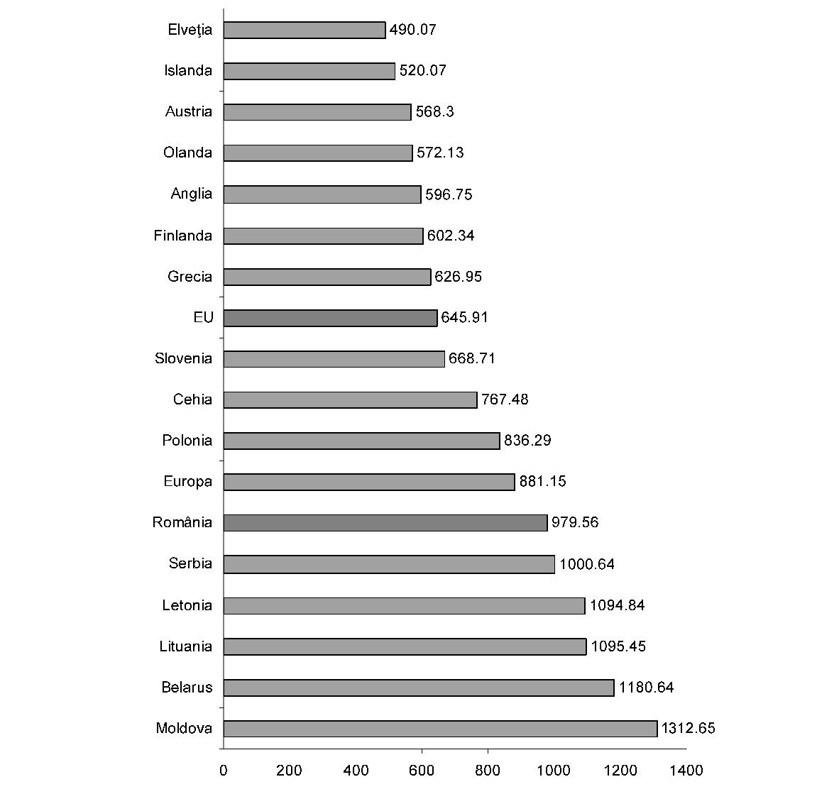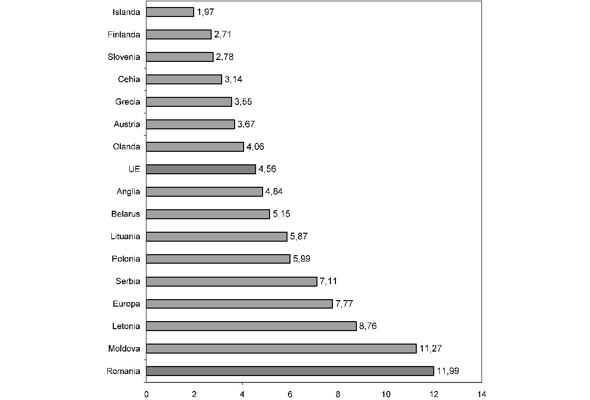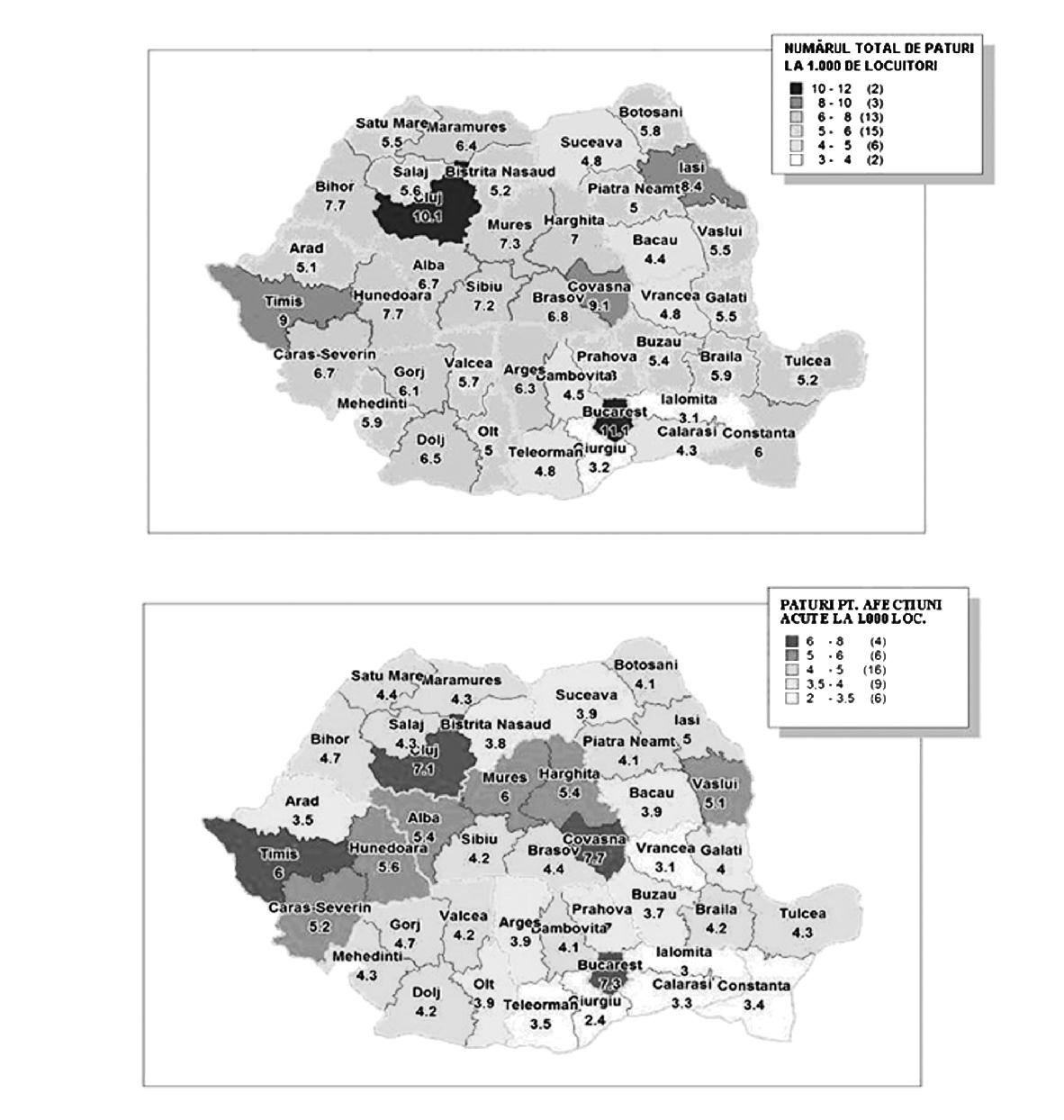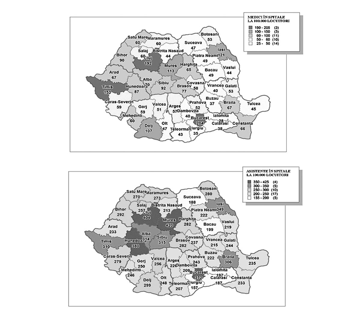 NOTĂ: Începând cu anul 1997 sunt cuprinşi farmaciştii, stomatologii, medicii, personalul mediu sanitar din sectorul public, particular şi mixt. Fig. 30. Numărul şi rata densităţii categoriilor de personal sanitar Sursa: MS - CNOASIIDS Alte probleme se referă la lipsa stimulentelor pentru alegerea carierei medicale şi a susţinerii specialiştilor tineri, nivelul scăzut al salariilor şi lipsa de legătură între performanţa medicală şi veniturile realizate oficial etc. Toate aceste aspecte relevă anumite disfuncţii la nivelul procesului de planificare şi formare a personalului medical, aspecte ce ţin de mai multe instituţii care nu au politici coordonate coerente în domeniu. Concomitent, modelul educaţional din sănătate are o performanţă redusă, niciuna dintre instituţiile medicale româneşti neaflându-se în primele 500 din lume, în niciunul dintre clasamentele importante existente. Personalul medical spitalicesc din România reprezintă unul dintre cele mai reduse procente comparativ cu media Uniunii Europene şi chiar cu cea a noilor state membre din 2004, integrarea în Uniunea Europeană sporind şansele ca acest aspect să se deterioreze şi mai mult, prin emigrarea în special a medicilor tineri. Această insuficienţă maschează şi alte dezechilibre importante în repartiţia personalului medical, în special a medicilor şi a asistentelor specializate, fiind frecvent întâlnite cazurile când la nivelul unor spitale există un singur medic specialist pe o secţie, care în principiu trebuie să asigure continuitatea îngrijirii pentru toţi bolnavii internaţi, 24 de ore, 7 zile pe săptămână. Una dintre cauzele frecvent invocate pentru această penurie de personal medical este modalitatea de salarizare, neatractivă atât din perspectiva veniturilor obţinute, cât şi datorită faptului că nu stimulează personalul performant. În Raportul Comisiei prezidenţiale pentru analiza şi elaborarea politicilor din domeniul sănătăţii publice din România, intitulat „Un sistem sanitar centrat pe nevoile cetăţeanului“, se arată că analiza densităţii medicilor în ţările din regiunea europeană a Organizaţiei Mondiale a Sănătăţii arată că România se află pe locul 31 din 33 de ţări, cu o densitate de 1,9 medici la 1.000 de locuitori, doar Albania şi Bosnia-Herţegovina înregistrând densităţi mai mici decât ţara noastră. România ocupă ultimele locuri, înregistrând o situaţie la fel de critică şi pentru asistentele medicale (3,89 asistente medicale la 1.000 locuitori), dentişti (cu 0,22 dentişti la 1.000 de locuitori) şi farmacişti (0,06 farmacişti la 1.000 de locuitori). Aceleaşi comentarii se pot face şi pentru moaşe, în toate aceste situaţii România având un număr cu cel puţin o treime mai mic decât media europeană, în condiţii de mortalitate şi morbiditate mult superioare mediei Uniunii Europene, iar la nivelul anumitor specialităţi medicale deficitul de personal este şi mai mare. Trebuie menţionat că această situaţie reprezintă o continuitate a sistemului sanitar din România ultimelor 4 decenii, resursele umane sanitare din România fiind în permanenţă mult reduse faţă de media europeană. Astfel, chiar dacă în anumite domenii după 1990 a avut loc o dezvoltare importantă, spre exemplu numărul absolvenţilor facultăţilor de farmacie crescând de aproape 4 ori în această perioadă, aceste creşteri au avut loc fără existenţa unui program coerent pe termen lung, nereuşind astfel să recupereze deficitele existente deja. În acelaşi timp, în afara numărului redus de personal medical la nivel naţional, există şi importante dezechilibre geografice, prin concentrarea resursei umane în mediul urban în detrimentul celui rural, precum şi prin evitarea regiunilor sărace sau a celor populate cu grupuri specifice şi care sunt cele mai expuse la risc (minorităţi, săraci etc.). Astfel sistemul nu poate răspunde adecvat la nevoile specifice acelor grupuri sau regiuni. În acelaşi raport al Comisiei prezidenţiale se subliniază că, din punctul de vedere al distribuţiei geografice, cele mai defavorizate regiuni sunt Sud şi Sud-Est (773, respectiv 655 locuitori/1 medic). Regiunea de Nord-Est este cel mai slab acoperită cu medici în mediul rural (2.778 locuitori/1 medic). În mediul rural există 98 de localităţi fără medic. Şi pe specialităţi acoperirea judeţelor cu medici este disproporţionată. În mai mult de o treime din judeţele ţării, o treime dintre specialităţi nu sunt acoperite. Printre specialităţile lipsă în unele judeţe se numără şi specialităţi clinice extrem de importante pentru asigurarea accesului la servicii, care se adresează unor patologii frecvente: de exemplu, în chirurgie pediatrică, urologie, cardiologie, endocrinologie. Ca şi la medici, există un dezechilibru geografic şi la nivelul asistenţilor medicali, în judeţe precum Giurgiu, Harghita, Vrancea sau Suceava cu o densitate de sub 3 asistenţi la 1.000 de locuitori, faţă de 4,5 la 1.000 de locuitori (media pe ţară) şi 7 la 1.000 de locuitori (media în Uniunea Europeană). O situaţie asemănătoare se întâlneşte şi la farmacişti şi dentişti, concentrarea făcându-se şi în aceste cazuri în zonele urbane puternic dezvoltate economic şi, cu prioritate, în centrele universitare. Situaţia este pe cale de a se înrăutăţi ca urmare a posibilităţii personalului medical din România de a lucra în ţările Uniunii Europene, fapt ce va duce la o diminuare a personalului în domeniul medical, mai ales în rândul tinerilor şi al celor înalt specializaţi. Este de aşteptat ca structura pe vârste a medicilor de familie şi mobilitatea crescândă a forţei de muncă (odată cu integrarea în Uniunea Europeană) să supună sistemul de sănătate la presiuni considerabile. Ca urmare a acestor aspecte, analiza comparativă a ţărilor 