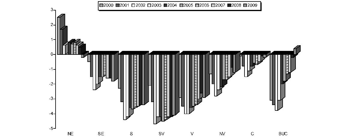 Fig. 4. Structura populaţiei României pe regiuni în perioada 2004-2009 Sursa: MS - CNOASIIDS Natalitatea Rata natalităţii scade de la 13,6 la 1.000 de locuitori în anul 1990, la 10,5‰ în 2000, la 9,8‰ în 2001, la 9,7‰ în 2002, în 2003 revine la nivelul anului 2001, în 2004 creşte la 10,0‰, în 2005 creşte la 10,2 ‰, în 2006 se menţine la nivelul anului 2005, în 2007 coboară la nivelul anului 2004 (10,0‰), în 2008 creşte la 10,3‰, iar în 2009 creşte la 10,4‰ (fig. 5 şi 6).
