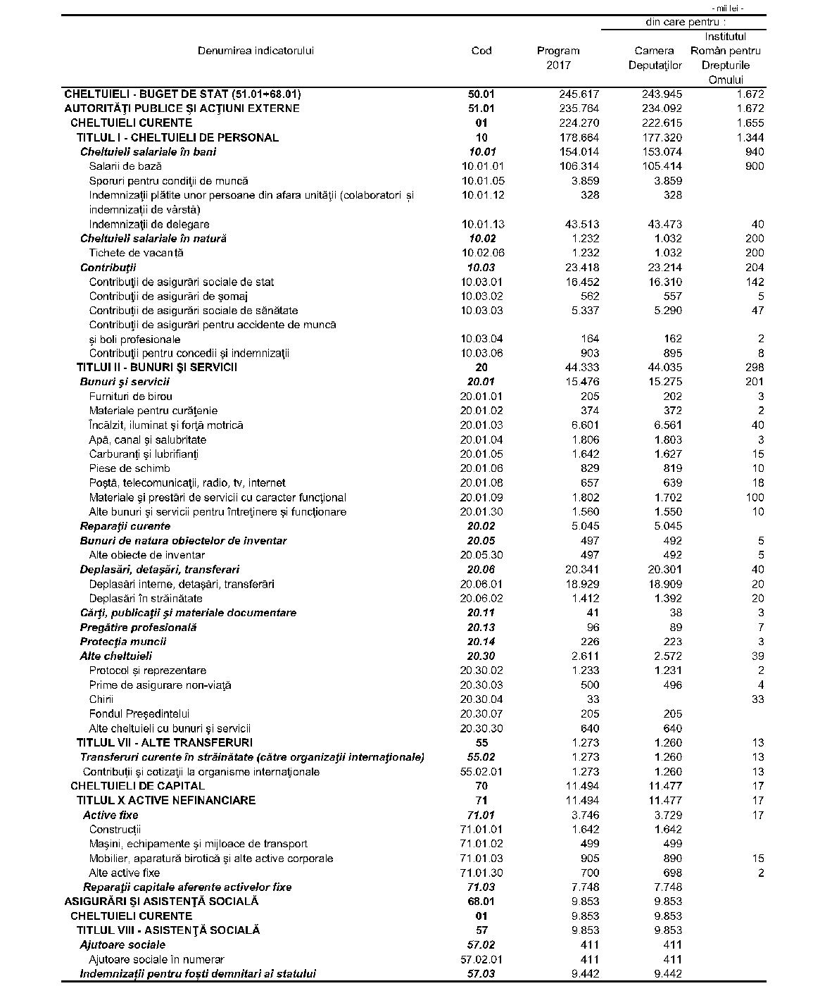 În temeiul prevederilor art. 64 alin. (1) şi ale art. 67 din Constituţia României, republicată, precum şi ale art. 252 din Regulamentul Camerei Deputaţilor, aprobat prin Hotărârea Camerei Deputaţilor nr. 8/1994, republicat,Camera Deputaţilor adoptă prezenta hotărâre. Articolul 1(1) Bugetul Camerei Deputaţilor pe anul 2017, finanţat de la bugetul de stat, se stabileşte la suma de 245.617 mii lei, din care 235.764 mii lei la capitolul 51.01 „Autorităţi publice şi acţiuni externe" şi 9.853 mii lei la capitolul 68.01 „Asigurări şi asistenţă socială".(2) La capitolul 51.01, suma de 235.764 mii lei a fost repartizată astfel:a)cheltuieli pentru activitatea proprie a Camerei Deputaţilor, în sumă de 234.092 mii lei, din care:cheltuieli curente, în sumă de 222.615 mii lei; cheltuieli de capital, în sumă de 11.477 mii lei; b)cheltuieli pentru funcţionarea Institutului Român pentru Drepturile Omului, în sumă de 1.672 mii lei, din care:cheltuieli curente, în sumă de 1.655 mii lei; cheltuieli de capital, în sumă de 17 mii lei.