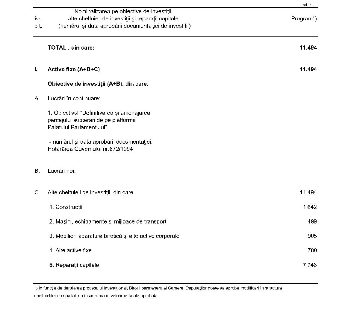 Articolul 2(1) Structura cheltuielilor curente, în sumă de 222.615 mii lei, necesare în vederea funcţionării Camerei Deputaţilor şi întreţinerii şi administrării Palatului Parlamentului, este următoarea:a)cheltuieli de personal, în sumă de 177.320 mii lei; b)cheltuieli pentru bunuri şi servicii, în sumă de 44.035 mii lei; c)cheltuieli pentru transferuri (contribuţii şi cotizaţii la organisme internaţionale), în sumă de 1.260 mii lei. (2) La titlul „Cheltuieli curente" sunt prevăzute şi sumele necesare pentru fondul preşedintelui Camerei Deputaţilor şi pentru întreţinerea şi funcţionarea Clubului Parlamentarilor Români, inclusiv a terenurilor sportive şi a cabinetului medical din cadrul Palatului Parlamentului.(3) Cheltuielile de întreţinere şi reparaţii aferente bunurilor din patrimoniul administrat de Camera Deputaţilor, repartizate în scopul exercitării mandatului de către deputaţi în circumscripţiile electorale, se suportă din suma forfetară acordată conform Legii nr. 96/2006 privind Statutul deputaţilor şi al senatorilor, republicată. Articolul 3(1) Cheltuielile de capital sunt în sumă de 11.494 mii lei, din care 3.746 mii lei pentru active fixe şi 7.748 mii lei pentru reparaţii capitale aferente activelor fixe.(2) Detalierea cheltuielilor de capital pe anul 2017 este prezentată în anexa nr. 2. Articolul 4(1) Bugetul de venituri şi cheltuieli pentru activităţile finanţate integral din venituri proprii desfăşurate pe lângă Camera Deputaţilor în anul 2017 cuprinde, atât la resurse, cât şi la cheltuieli, suma de 20.900 mii lei.(2) Veniturile realizate de Camera Deputaţilor vor fi reţinute integral de către aceasta pentru acoperirea unor cheltuieli curente şi de capital aferente activităţilor finanţate din venituri proprii, organizate cu aprobarea Biroului permanent. Disponibilităţile de la sfârşitul anului se vor reporta în anul următor pentru a fi cheltuite cu aceleaşi destinaţii. Biroul permanent al Camerei Deputaţilor poate aproba utilizarea încasărilor în lei sau în valută şi pentru alte destinaţii, în condiţiile legii.(3) Organizarea activităţilor finanţate din venituri proprii, tarifele şi cotele de adaos comercial aferente acestora se aprobă de Biroul permanent al Camerei Deputaţilor.(4) Numărul de personal salarizat din venituri proprii se aprobă de Biroul permanent al Camerei Deputaţilor, în funcţie de necesităţi şi de veniturile realizate.(5) Cheltuielile prevăzute în bugetul activităţilor finanţate din venituri proprii pot fi depăşite numai în cazul obţinerii unor venituri suplimentare.(6) Detalierea bugetului activităţilor finanţate integral din venituri proprii ale Camerei Deputaţilor în anul 2017 este prezentată în anexa nr. 3. Articolul 5Biroul permanent al Camerei Deputaţilor va lua măsuri pentru încadrarea în alocaţiile bugetare prevăzute în prezenta hotărâre. Articolul 6 Anexele nr. 1-3*) fac parte integrantă din prezenta hotărâre. *) Anexele nr. 1-3 sunt reproduse în facsimil.Această hotărâre a fost adoptată de Camera Deputaţilor în şedinţa din 16 ianuarie 2017, cu respectarea prevederilor art. 76 alin. (2) din Constituţia României, republicată. p. PREŞEDINTELE CAMEREI DEPUTAŢILOR,PETRU-GABRIEL VLASE ANEXA Nr. 1BUGETUL PE ANUL 2017 Detalierea pe alineate de cheltuieli ANEXA Nr. 2CHELTUIELI DE CAPITAL pe anul 2017 ANEXA Nr. 3BUGETUL DE VENITURI ŞI CHELTUIELI al activităţilor finanţate integral din venituri proprii pe anul 2017