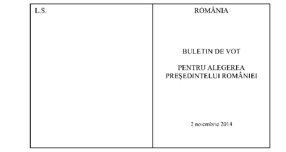 ANEXA Nr. 1Modelul1), dimensiunile şi condiţiile de tipărire ale buletinului de vot care va fi folosit la primul tur de scrutin pentru alegerea Preşedintelui României din anul 20141) Modelul este reprodus în facsimil. Pagina exterioară NOTĂ: L.S. reprezintă locul unde se aplică ştampila de control a biroului electoral al secţiei de votare. Pagina interioară NOTE: a)Se scrie denumirea integrală a partidului politic, organizaţiei cetăţenilor aparţinând minorităţilor naţionale, alianţei politice sau alianţei electorale sau, după caz, menţiunea „Candidat independent“. b)Se reproduce semnul electoral; între denumirea partidului politic, alianţei politice, alianţei electorale sau organizaţiei cetăţenilor aparţinând minorităţilor naţionale sau, după caz, menţiunea „Candidat independent“ şi semnul electoral se păstrează o distanţă de cel puţin 3 litere. Semnul electoral se imprimă într-un spaţiu grafic de 3 cm x 3 cm. c)Se înscriu prenumele şi numele candidatului.Pentru fiecare candidat independent se imprimă doar semnul electoral, prenumele şi numele. Buletinul de vot are forma unui pliant A4, dimensionat astfel: înălţimea are dimensiunea unei foi A4, iar lăţimea este dimensionată în funcţie de numărul candidaţilor, astfel încât prin pliere pe orizontală să rezulte pagini de mărimea unei foi A4. Patrulaterele se vor imprima paralel între ele, distanţa dintre acestea fiind mai mare decât diametrul ştampilei cu menţiunea „VOTAT“. Pe pagina interioară a buletinului de vot se imprimă patrulaterele cuprinzând candidaturile. Denumirea integrală a partidului politic, a organizaţiei cetăţenilor aparţinând minorităţilor naţionale, a alianţei politice sau a alianţei electorale se tipăreşte cu litere corp 12 verzale drepte. Prenumele şi numele, precum şi cuvintele ce se înscriu în interiorul patrulaterului se tipăresc cu litere corp 12 verzale drepte. Patrulaterele se numerotează şi se înscriu în ordinea rezultată din tragerea la sorţi potrivit prevederilor
