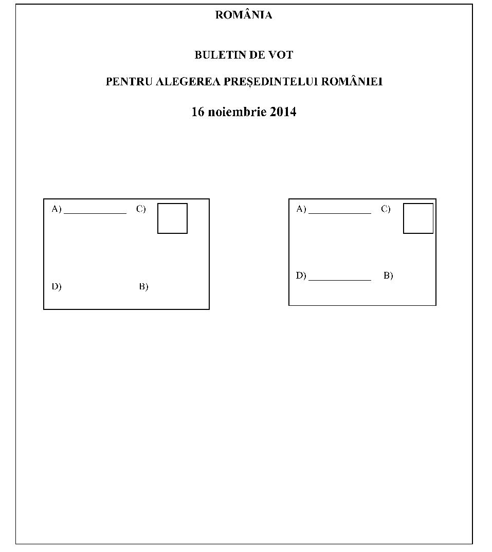 art. 17 alin. (1) lit. c) din Legea nr. 370/2004 pentru alegerea Preşedintelui României, republicată, cu modificările şi completările ulterioare. ANEXA Nr. 2MODELUL1), dimensiunile şi condiţiile de tipărire ale buletinului de vot care va fi folosit la al doilea tur de scrutin pentru alegerea Preşedintelui României din anul 20141) Modelul este reprodus în facsimil. Faţă Verso A)Se înscrie denumirea integrală a partidului politic, alianţei politice, alianţei electorale sau a organizaţiei cetăţenilor aparţinând minorităţilor naţionale. Dimensiunea literelor din cele două patrulatere va fi egală. B)Se înscrie denumirea prescurtată a partidului politic, alianţei politice, alianţei electorale sau a organizaţiei cetăţenilor aparţinând minorităţilor naţionale. Dimensiunea literelor din cele două patrulatere va fi egală. C)Se înscrie semnul electoral care se imprimă într-un spaţiu grafic de cel puţin 3 cm x 3 cm. Dimensiunea spaţiului grafic din cele două patrulatere va fi egală. D)Se înscriu prenumele şi numele candidatului. Dimensiunea literelor din cele două patrulatere va fi egală. Dimensiunile literelor ce se înscriu în interiorul patrulaterului se stabilesc de Biroul Electoral Central.NOTE: