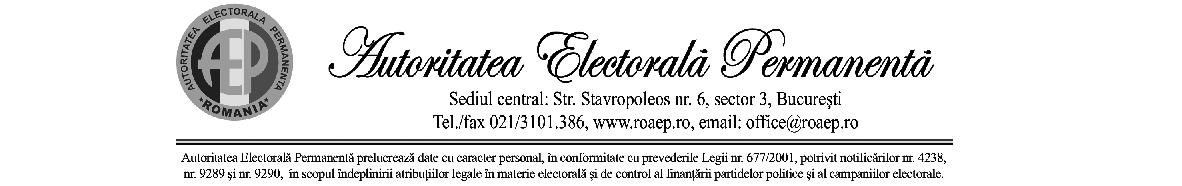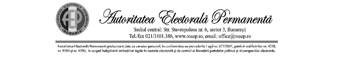 ACREDITARE Având în vedere Cererea Ministerului Afacerilor Externe cu nr. ........ ........ ..........., înregistrată la Autoritatea Electorală Permanentă cu nr. ........ ................ .............., în temeiul prevederilor art. 43 alin. (5) din Legea nr. 35/2008 pentru alegerea Camerei Deputaţilor şi a Senatului şi pentru modificarea şi completarea Legii nr. 67/2004 pentru alegerea autorităţilor administraţiei publice locale, a Legii administraţiei publice locale nr. 215/2001 şi a Legii nr. 393/2004 privind Statutul aleşilor locali, cu modificările şi completările ulterioare, Autoritatea Electorală Permanentă acreditează reprezentanţii ........ ........ ............1 pe lângă birourile şi oficiile electorale constituite la alegerile pentru Camera Deputaţilor şi Senat din 9 decembrie 2012: 1. ........ ................ ........ .........2; 2. ........ ................ ........ .........; 3. ........ ................ ........ .........; 4. ..... Preşedintele Autorităţii Electorale Permanente, Ana Maria Pătru 1 Se trece denumirea instituţiei mass-media străine sau a organizaţiei internaţionale cu activitate în domeniul democraţiei şi al drepturilor omului. 2 Se trec numele şi prenumele reprezentantului instituţiei mass-media străine sau al organizaţiei internaţionale cu activitate în domeniul democraţiei şi al drepturilor omului. NOTĂ: Persoanele acreditate pot asista la operaţiunile electorale în ziua votării, începând cu ora 6,00 şi terminând cu momentul încheierii şi semnării de către membrii biroului electoral al secţiei de votare a procesului-verbal de constatare a rezultatelor votării în secţia respectivă, numai dacă prezintă actul de acreditare. Acestea nu pot interveni în niciun mod în organizarea şi desfăşurarea alegerilor, având numai dreptul de a sesiza în scris preşedintele biroului electoral în cazul constatării unei neregularităţi. Orice act de propagandă pentru sau împotriva unui partid politic, unei alianţe politice, unei alianţe electorale sau unei organizaţii a cetăţenilor aparţinând unei minorităţi naţionale care participă la alegeri conform legii ori a unui candidat independent sau încercarea de a influenţa opţiunea alegătorului, precum şi încălcarea în orice mod a actului de acreditare atrag aplicarea sancţiunilor legale, suspendarea acreditării de către biroul electoral care a constatat abaterea, iar în ziua votării, îndepărtarea imediată a persoanei respective din secţia de votare. Prezenta acreditare (în original sau în copie) însoţită de actul de identitate al titularului acreditării permite accesul acestuia în localul oricărei secţii de votare, iar la Biroul Electoral Central, birourile electorale de circumscripţie sau, după caz, la oficiile electorale, în spaţiile special stabilite în acest sens. Încălcarea condiţiilor de acreditare atrage de drept încetarea acreditării. ANEXA Nr. 5– Model -CERERE pentru eliberarea adeverinţei privind îndeplinirea condiţiilor prevăzute de art. 43 alin. (2) din Legea nr. 35/2008 pentru alegerea Camerei Deputaţilor şi a Senatului şi pentru modificarea şi completarea Legii nr. 67/2004 pentru alegerea autorităţilor administraţiei publice locale, a Legii administraţiei publice locale nr. 215/2001 şi a Legii nr. 393/2004 privind Statutul aleşilor locali, cu modificările şi completările ulterioare Subsemnatul, ........ ................ ..............1, ........ ........ ...........2, în cadrul ........ ................ ........3, solicit eliberarea adeverinţei privind îndeplinirea condiţiilor prevăzute de art. 43 alin. (2) din Legea nr. 35/2008 pentru alegerea Camerei Deputaţilor şi a Senatului şi pentru modificarea şi completarea Legii nr. 67/2004 pentru alegerea autorităţilor administraţiei publice locale, a Legii administraţiei publice locale nr. 215/2001 şi a Legii nr. 393/2004 privind Statutul aleşilor locali, cu modificările şi completările ulterioare, de către ........ ................ ..............3. Menţionez că toate persoanele care fac parte din organele de conducere ale organizaţiei neguvernamentale pe care o reprezint au declarat că nu sunt membri ai vreunui partid politic. Depun anexat o copie a statutului organizaţiei neguvernamentale pe care o reprezint, precum şi o copie a hotărârii judecătoreşti de înfiinţare a organizaţiei, din care rezultă că organizaţia este înfiinţată cu cel puţin 6 luni anterior datei de 9 decembrie 2012. ........ ................ ................ ..........4 ........ ........ ............5 1 Se înscriu numele şi prenumele persoanei care face cererea din partea organizaţiei neguvernamentale. 2 Se trece funcţia pe care persoana care face cererea o are în organizaţia neguvernamentală. 3 Se trece denumirea organizaţiei neguvernamentale. 4 Se semnează şi se aplică ştampila organizaţiei neguvernamentale. 5 Se trece data. ANEXA Nr. 6– Model -