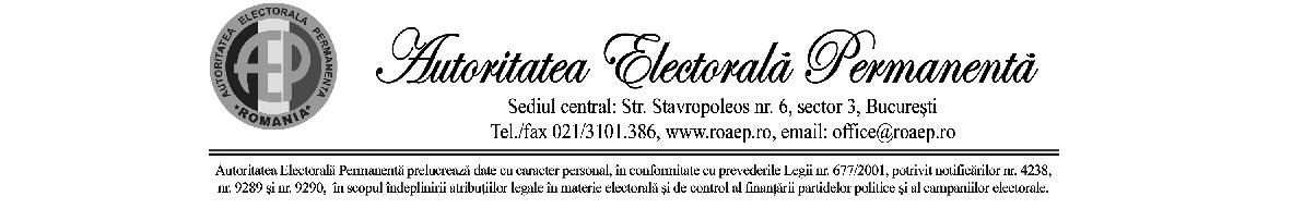 ADEVERINŢĂ Prin prezenta, adeverim că organizaţia neguvernamentală ........ ................ ........ ........1 îndeplineşte condiţiile prevăzute de art. 43 alin. (2) din Legea nr. 35/2008 pentru alegerea Camerei Deputaţilor şi a Senatului şi pentru modificarea şi completarea Legii nr. 67/2004 pentru alegerea autorităţilor administraţiei publice locale, a Legii administraţiei publice locale nr. 215/2001 şi a Legii nr. 393/2004 privind Statutul aleşilor locali, cu modificările şi completările ulterioare, pentru a participa cu observatori interni la alegerile pentru Camera Deputaţilor şi Senat din 9 decembrie 2012. Preşedintele Autorităţii Electorale Permanente, Ana Maria Pătru NOTĂ: Prezenta adeverinţă (în original sau în copie) permite organizaţiei neguvernamentale să obţină de la birourile electorale de circumscripţie acreditarea ca observatori interni a persoanelor pe care le propune acestora. 1 Se trece denumirea organizaţiei neguvernamentale din România.