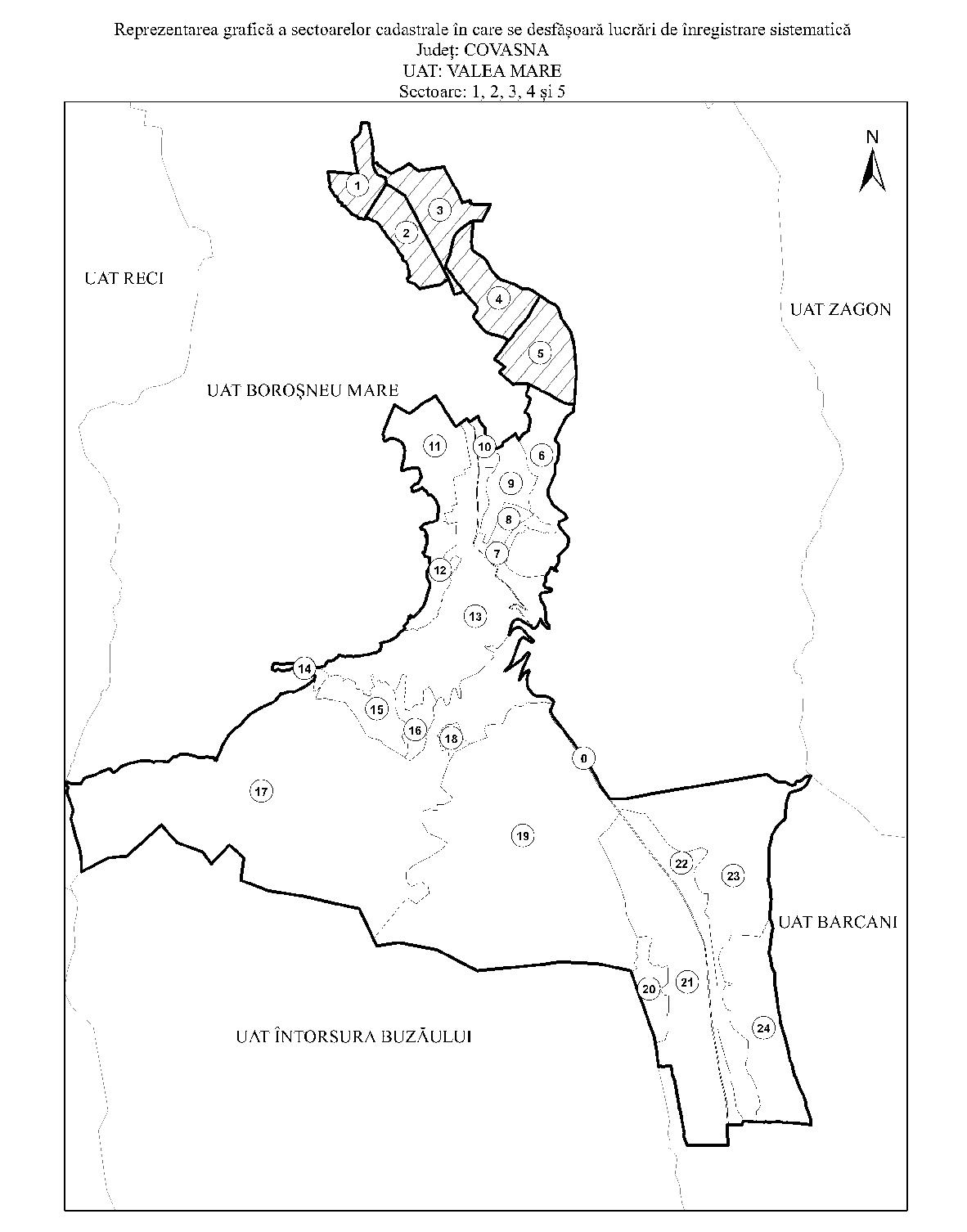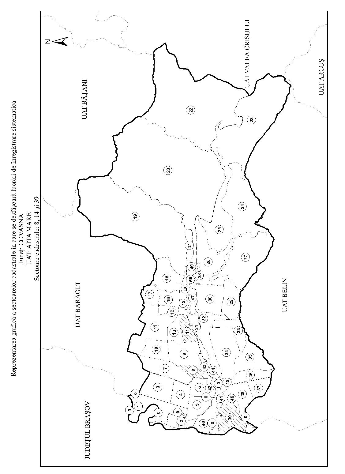Având în vedere prevederile art. 11 alin. (1) din Legea cadastrului şi a publicităţii imobiliare nr. 7/1996, republicată, cu modificările şi completările ulterioare,în temeiul art. 3 alin. (13) din Legea cadastrului şi a publicităţii imobiliare nr. 7/1996, republicată, cu modificările şi completările ulterioare,directorul general al Agenţiei Naţionale de Cadastru şi Publicitate Imobiliară emite prezentul ordin. Articolul 1Se aprobă începerea lucrărilor de înregistrare sistematică a imobilelor, pe sectoare cadastrale, situate pe teritoriul a 3 unităţi administrativ-teritoriale din judeţul Covasna, după cum urmează: a)unitatea administrativ-teritorială Aita Mare - sectoarele cadastrale nr. 8, 14, 39; b)unitatea administrativ-teritorială Băţani - sectoarele cadastrale nr. 109, 115; c)unitatea administrativ-teritorială Valea Mare - sectoarele cadastrale nr. 1, 2, 3, 4, 5. Articolul 2Reprezentarea grafică a sectoarelor cadastrale în care se desfăşoară lucrările de înregistrare sistematică a imobilelor este prevăzută în anexele nr. 1-3 la prezentul ordin. Articolul 3Anexele nr. 1-3*) fac parte integrantă din prezentul ordin.*) Anexele nr. 1-3 sunt reproduse în facsimil. Articolul 4 Prezentul ordin se publică în Monitorul Oficial al României, Partea I.Directorul general al Agenţiei Naţionale de Cadastru şi Publicitate Imobiliară,Radu-Codruţ ŞtefănescuANEXA Nr. 1 ANEXA Nr. 2 ANEXA Nr. 3