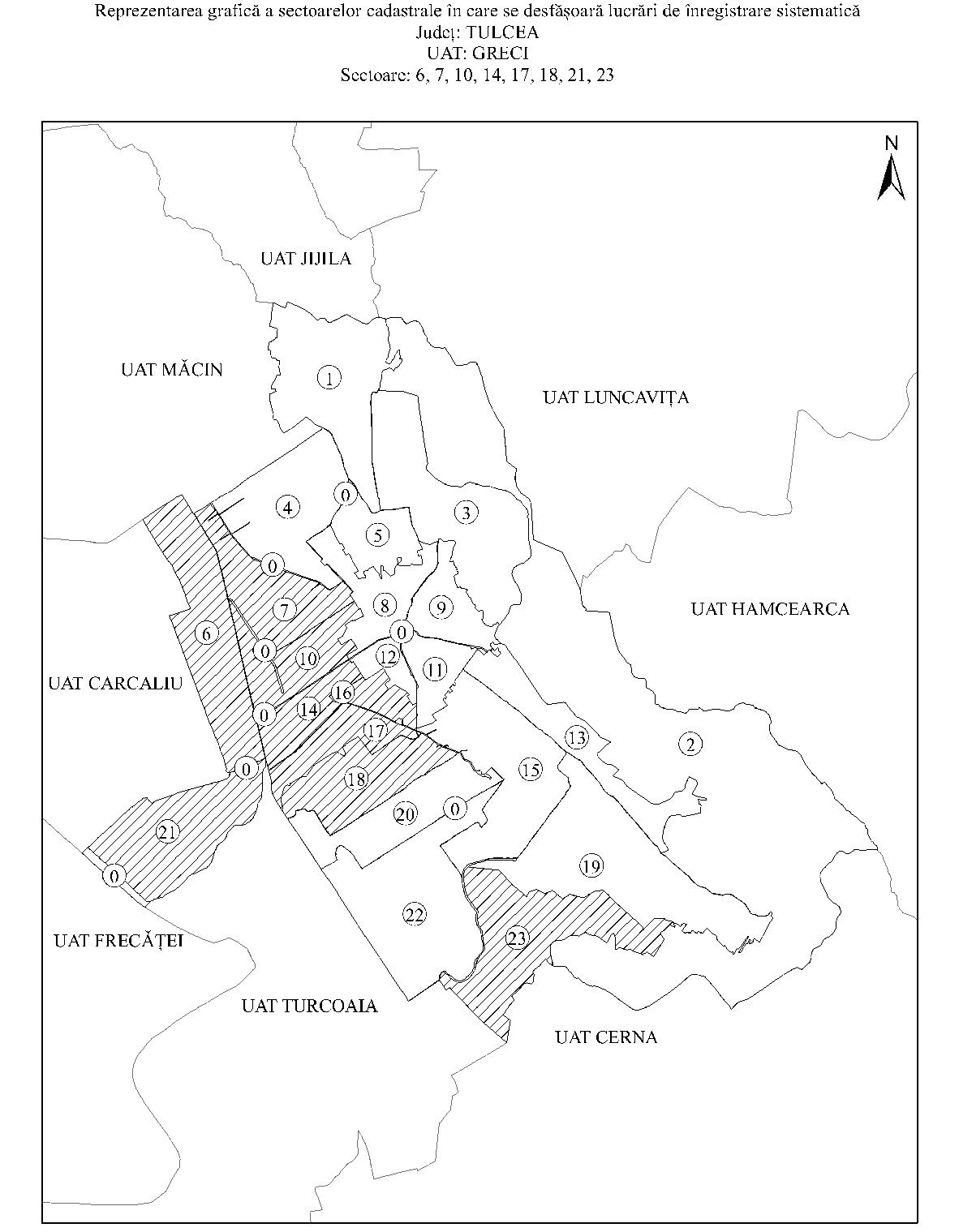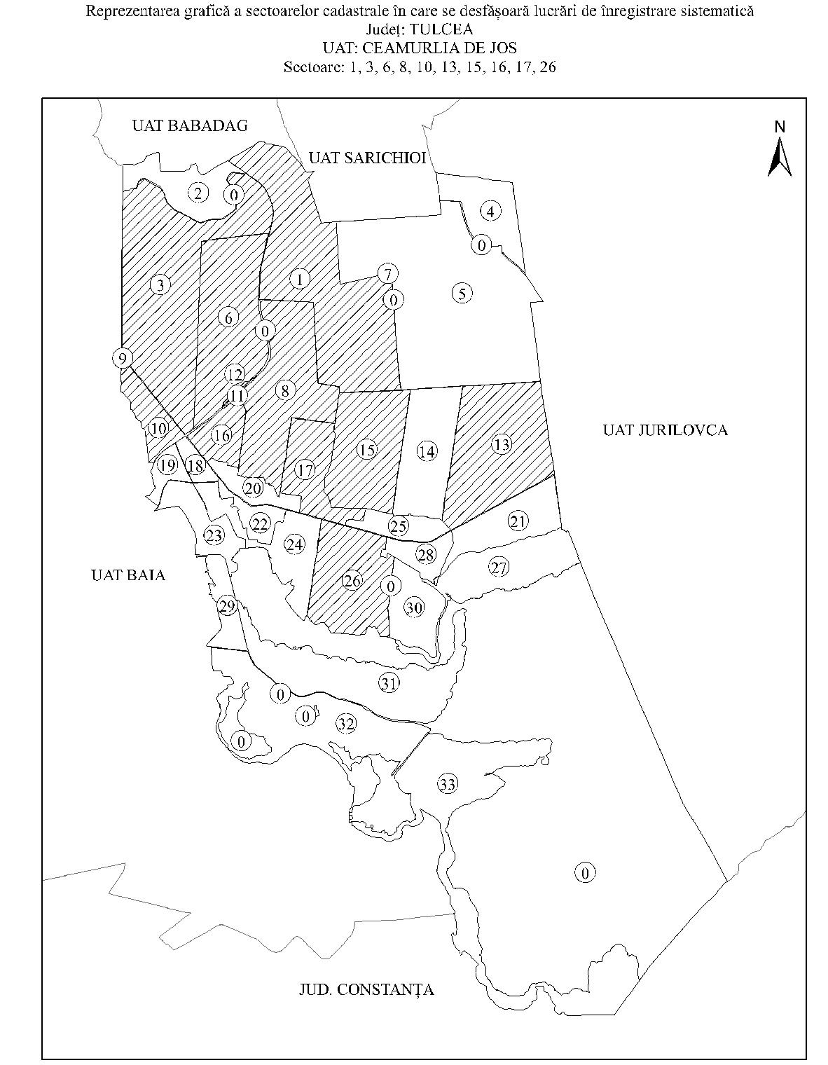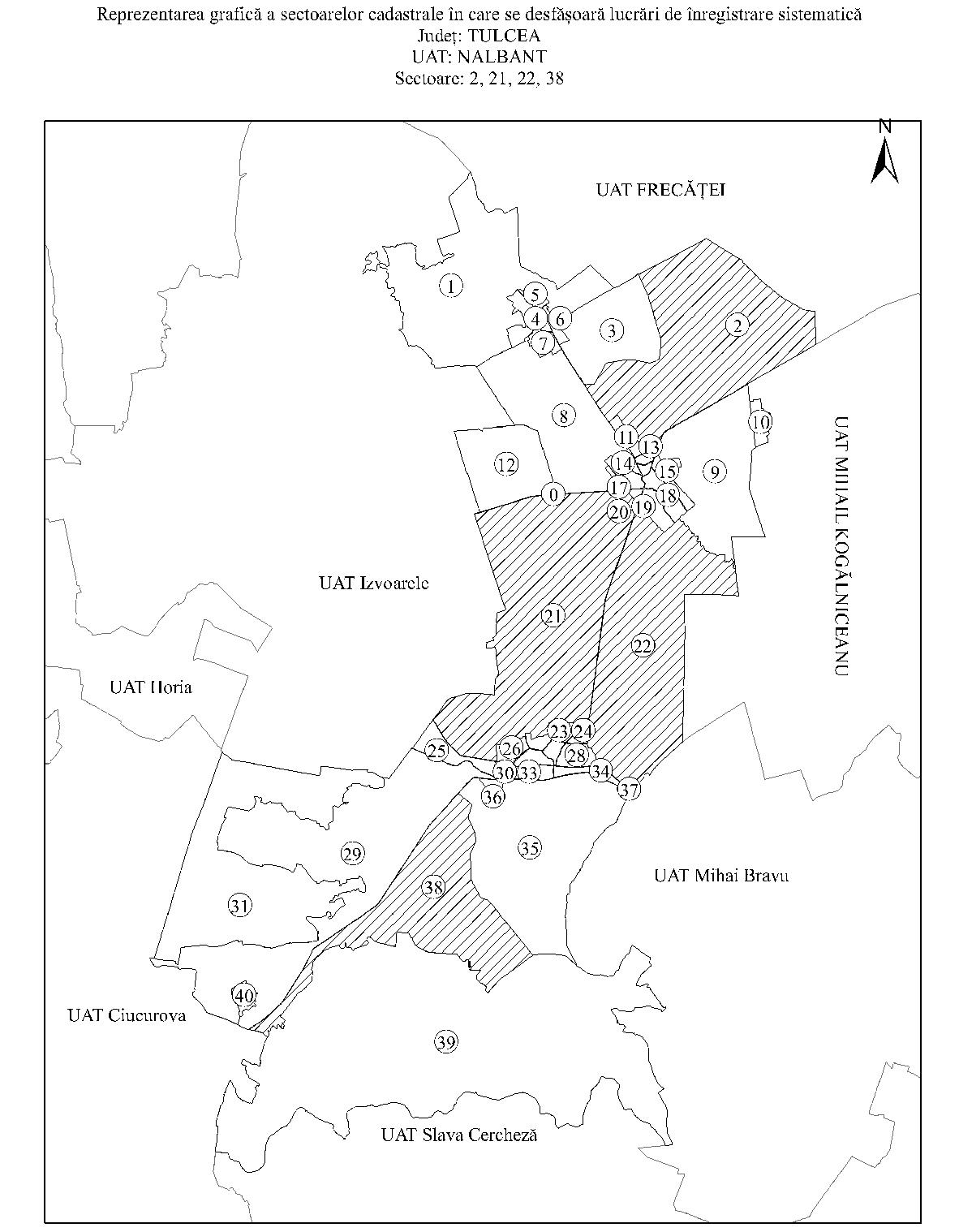 Având în vedere prevederile art. 11 alin. (1) din Legea cadastrului şi a publicităţii imobiliare nr. 7/1996, republicată, cu modificările şi completările ulterioare, în temeiul art. 3 alin. (13) din Legea cadastrului şi a publicităţii imobiliare nr. 7/1996, republicată, cu modificările şi completările ulterioare, şi al art. 15 alin. (3) din Regulamentul de organizare şi funcţionare a Agenţiei Naţionale de Cadastru şi Publicitate Imobiliară, aprobat prin Hotărârea Guvernului nr. 1.288/2012, cu modificările şi completările ulterioare, directorul general al Agenţiei Naţionale de Cadastru şi Publicitate Imobiliară emite prezentul ordin. Articolul 1 Se aprobă începerea lucrărilor de înregistrare sistematică a imobilelor, pe sectoare cadastrale, situate pe teritoriul a 14 unităţi administrativ-teritoriale din judeţul Tulcea, după cum urmează: a)unitatea administrativ-teritorială Babadag - sectoarele cadastrale nr. 14 şi 26; b)unitatea administrativ-teritorială Carcaliu - sectoarele cadastrale nr. 1, 2, 3, 5, 7, 8, 9, 10 şi 11; c)unitatea administrativ-teritorială Casimcea - sectoarele cadastrale nr. 5, 18, 31 şi 38; d)unitatea administrativ-teritorială Ceamurlia de Jos - sectoarele cadastrale nr. 1, 3, 6, 8, 10, 13, 15, 16, 17 şi 26; e)unitatea administrativ-teritorială Cerna - sectoarele cadastrale nr. 3, 21, 38, 68 şi 70; f)unitatea administrativ-teritorială Chilia Veche - sectoarele cadastrale nr. 12, 13, 16, 20 şi 21; g)unitatea administrativ-teritorială Dorobanţu - sectoarele cadastrale nr. 4, 5, 19, 27, 29 şi 45; h)unitatea administrativ-teritorială Greci - sectoarele cadastrale nr. 6, 7, 10, 14, 17, 18, 21 şi 23; i)unitatea administrativ-teritorială Mahmudia - sectoarele cadastrale nr. 7, 15 şi 16; j)unitatea administrativ-teritorială Nalbant - sectoarele cadastrale nr. 2, 21, 22 şi 38; k)unitatea administrativ-teritorială Nufăru - sectoarele cadastrale nr. 1, 7, 10, 14 şi 18; l)unitatea administrativ-teritorială Stejaru - sectoarele cadastrale nr. 1, 2, 3, 4, 7, 9, 10, 11, 14 şi 19; m)unitatea administrativ-teritorială Topolog - sectoarele cadastrale nr. 14, 19, 24, 30, 31, 38, 39, 45, 49, 50 şi 55; n)unitatea administrativ-teritorială Valea Teilor - sectoarele cadastrale nr. 3, 4, 5, 6, 7 şi 10. Articolul 2 Reprezentarea grafică a sectoarelor cadastrale în care se desfăşoară lucrările de înregistrare sistematică a imobilelor este prevăzută în anexele nr. 1-14 la prezentul ordin. Articolul 3 Anexele nr. 1-14*) fac parte integrantă din prezentul ordin. *) Anexele nr. 1-14 sunt reproduse în facsimil. Articolul 4 Prezentul ordin se publică în Monitorul Oficial al României, Partea I. Directorul general al Agenţiei Naţionale de Cadastru şi Publicitate Imobiliară, Radu Codruţ Ştefănescu ANEXA Nr. 1