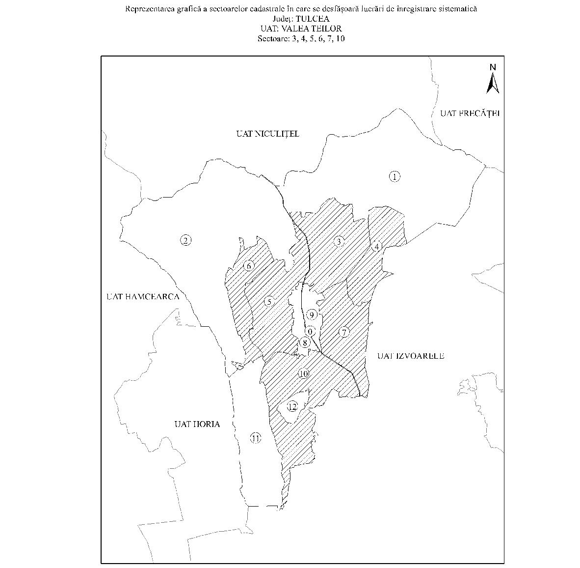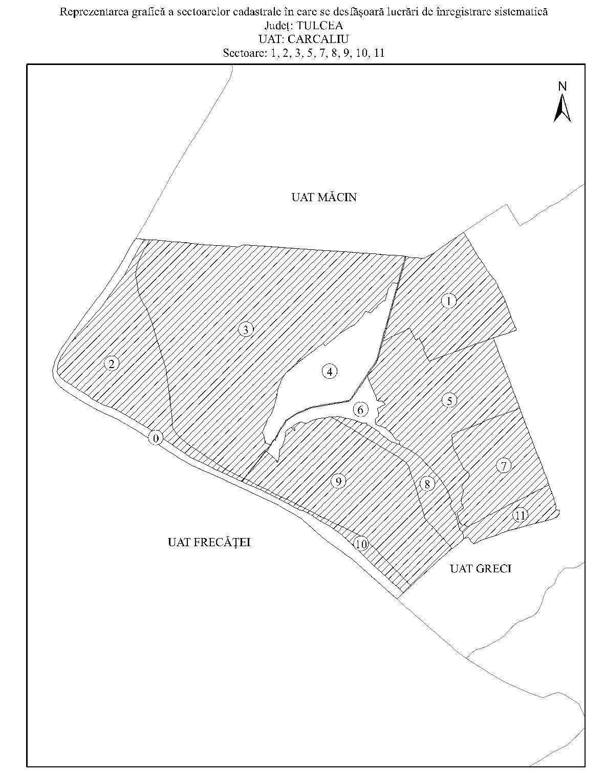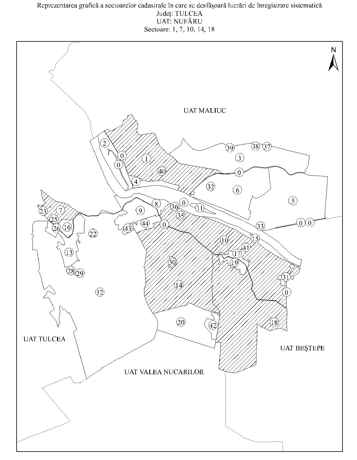 Având în vedere prevederile art. 11 alin. (1) din Legea cadastrului şi a publicităţii imobiliare nr. 7/1996, republicată, cu modificările şi completările ulterioare, în temeiul art. 3 alin. (13) din Legea cadastrului şi a publicităţii imobiliare nr. 7/1996, republicată, cu modificările şi completările ulterioare, şi al art. 15 alin. (3) din Regulamentul de organizare şi funcţionare a Agenţiei Naţionale de Cadastru şi Publicitate Imobiliară, aprobat prin Hotărârea Guvernului nr. 1.288/2012, cu modificările şi completările ulterioare, directorul general al Agenţiei Naţionale de Cadastru şi Publicitate Imobiliară emite prezentul ordin. Articolul 1 Se aprobă începerea lucrărilor de înregistrare sistematică a imobilelor, pe sectoare cadastrale, situate pe teritoriul a 14 unităţi administrativ-teritoriale din judeţul Tulcea, după cum urmează: a)unitatea administrativ-teritorială Babadag - sectoarele cadastrale nr. 14 şi 26; b)unitatea administrativ-teritorială Carcaliu - sectoarele cadastrale nr. 1, 2, 3, 5, 7, 8, 9, 10 şi 11; c)unitatea administrativ-teritorială Casimcea - sectoarele cadastrale nr. 5, 18, 31 şi 38; d)unitatea administrativ-teritorială Ceamurlia de Jos - sectoarele cadastrale nr. 1, 3, 6, 8, 10, 13, 15, 16, 17 şi 26; e)unitatea administrativ-teritorială Cerna - sectoarele cadastrale nr. 3, 21, 38, 68 şi 70; f)unitatea administrativ-teritorială Chilia Veche - sectoarele cadastrale nr. 12, 13, 16, 20 şi 21; g)unitatea administrativ-teritorială Dorobanţu - sectoarele cadastrale nr. 4, 5, 19, 27, 29 şi 45; h)unitatea administrativ-teritorială Greci - sectoarele cadastrale nr. 6, 7, 10, 14, 17, 18, 21 şi 23; i)unitatea administrativ-teritorială Mahmudia - sectoarele cadastrale nr. 7, 15 şi 16; j)unitatea administrativ-teritorială Nalbant - sectoarele cadastrale nr. 2, 21, 22 şi 38; k)unitatea administrativ-teritorială Nufăru - sectoarele cadastrale nr. 1, 7, 10, 14 şi 18; l)unitatea administrativ-teritorială Stejaru - sectoarele cadastrale nr. 1, 2, 3, 4, 7, 9, 10, 11, 14 şi 19; m)unitatea administrativ-teritorială Topolog - sectoarele cadastrale nr. 14, 19, 24, 30, 31, 38, 39, 45, 49, 50 şi 55; n)unitatea administrativ-teritorială Valea Teilor - sectoarele cadastrale nr. 3, 4, 5, 6, 7 şi 10. Articolul 2 Reprezentarea grafică a sectoarelor cadastrale în care se desfăşoară lucrările de înregistrare sistematică a imobilelor este prevăzută în anexele nr. 1-14 la prezentul ordin. Articolul 3 Anexele nr. 1-14*) fac parte integrantă din prezentul ordin. *) Anexele nr. 1-14 sunt reproduse în facsimil. Articolul 4 Prezentul ordin se publică în Monitorul Oficial al României, Partea I. Directorul general al Agenţiei Naţionale de Cadastru şi Publicitate Imobiliară, Radu Codruţ Ştefănescu ANEXA Nr. 1