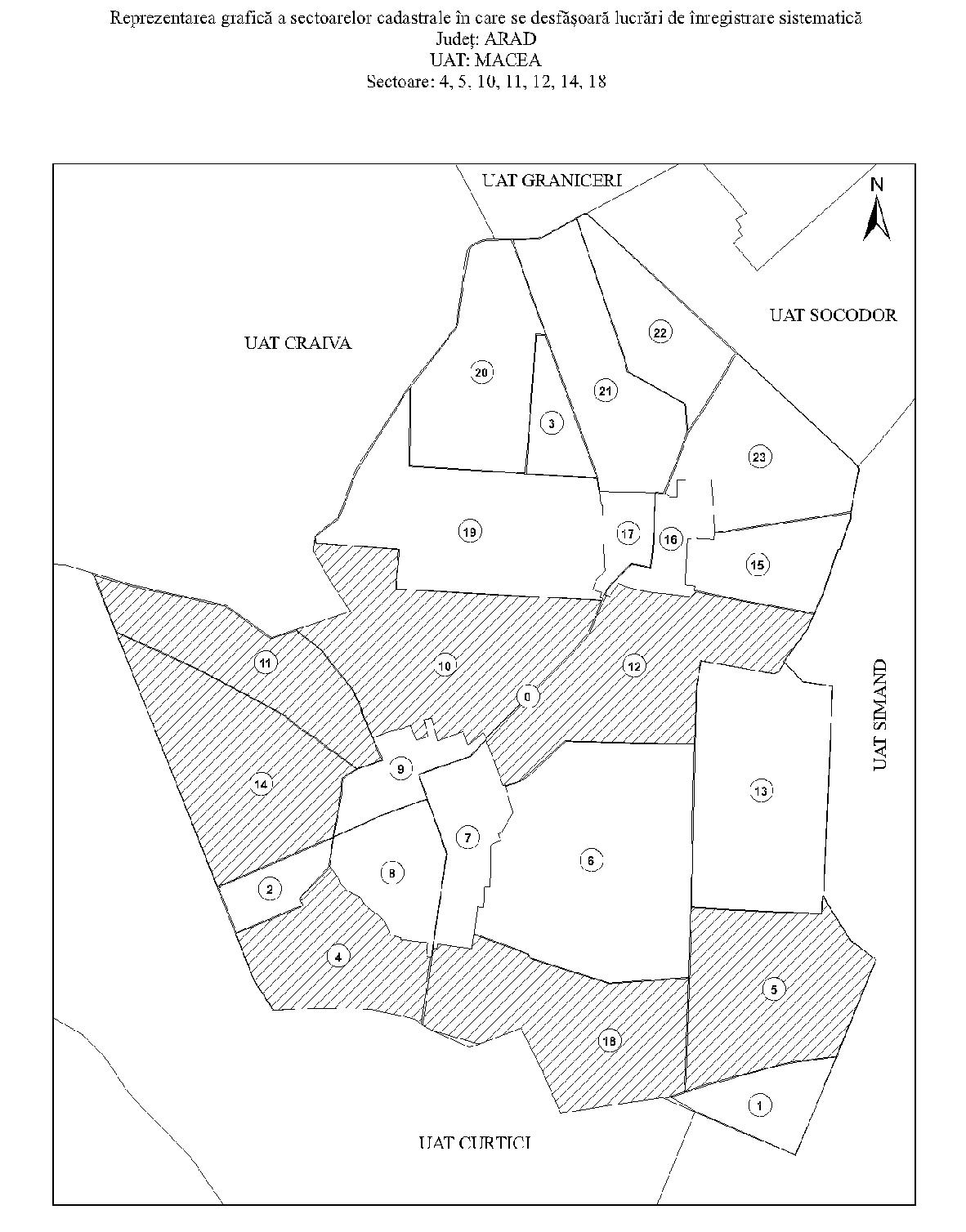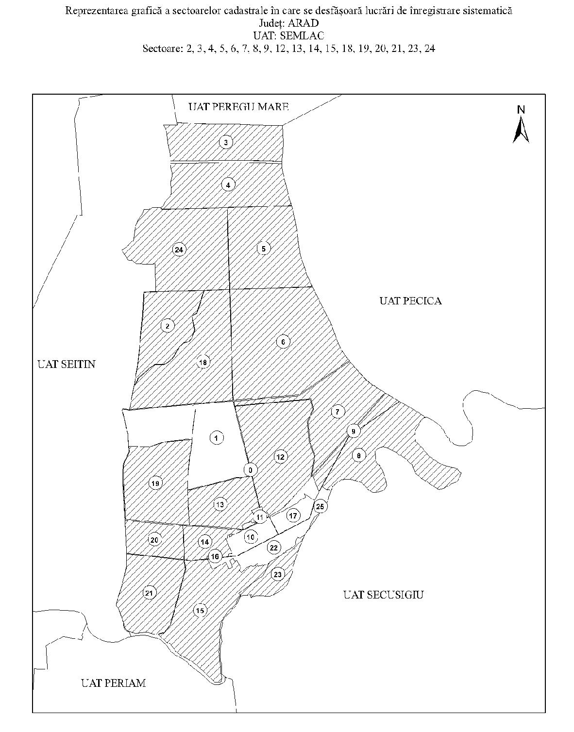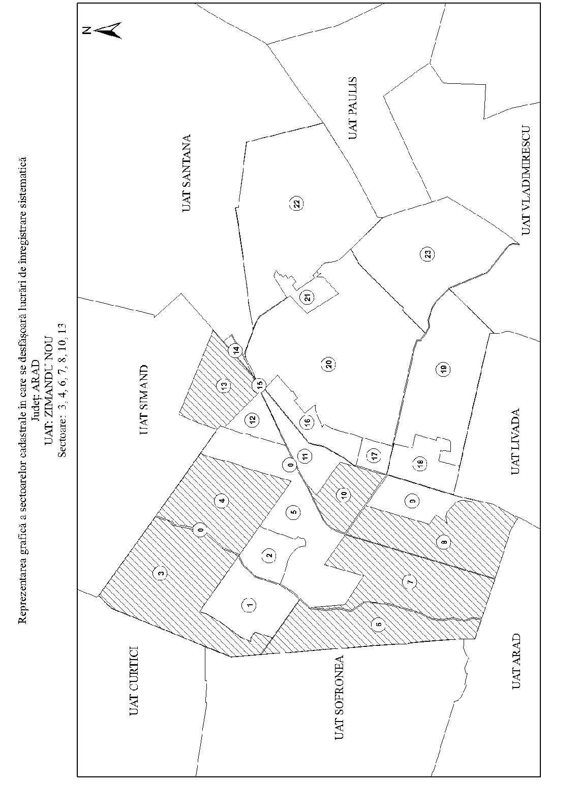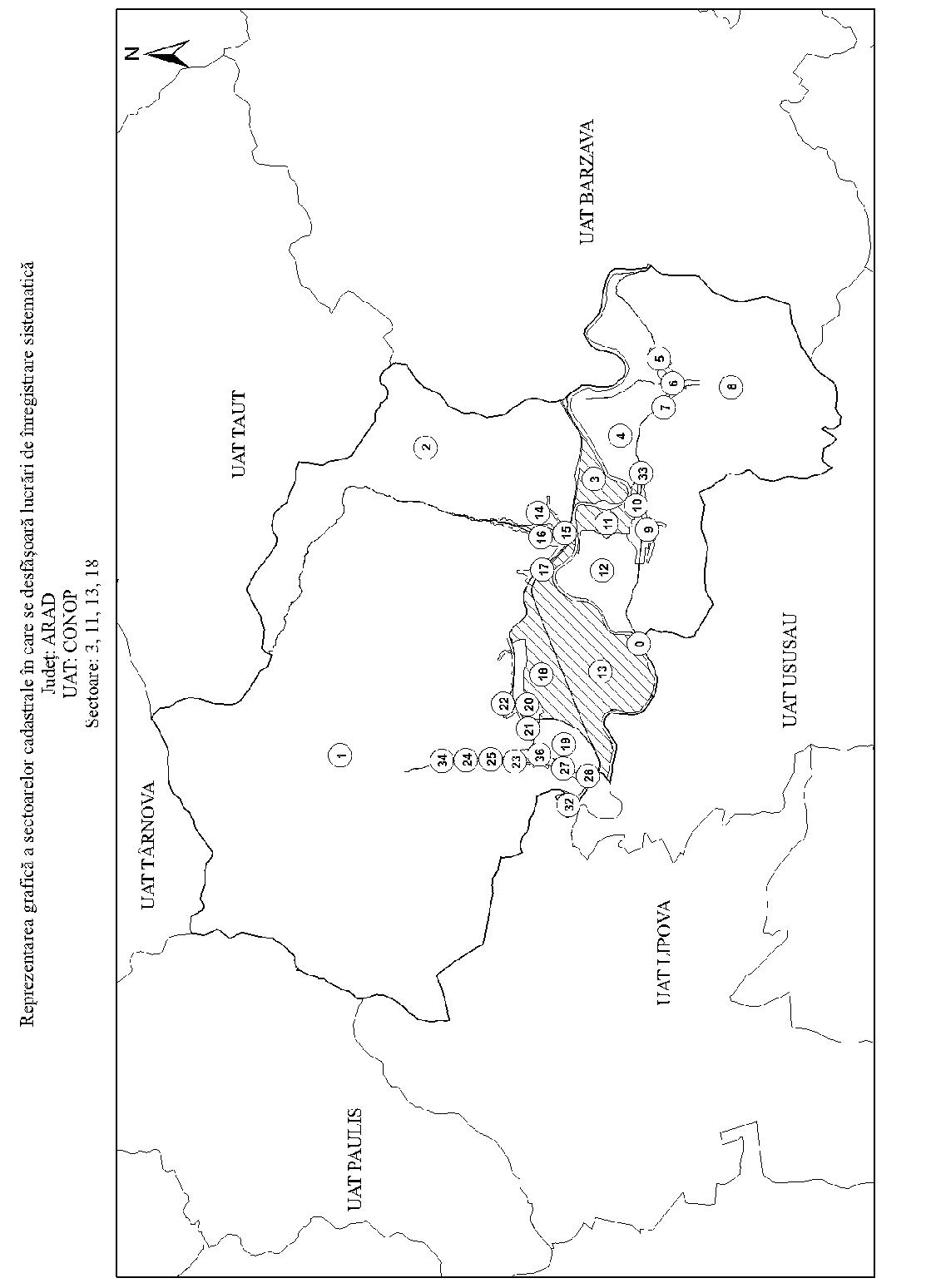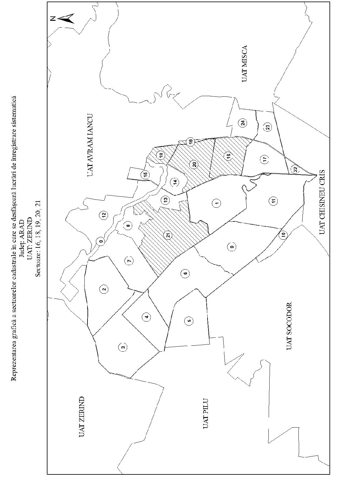Având în vedere prevederile art. 11 alin. (1) din Legea cadastrului şi a publicităţii imobiliare nr. 7/1996, republicată, cu modificările şi completările ulterioare, în temeiul art. 3 alin. (13) din Legea cadastrului şi a publicităţii imobiliare nr. 7/1996, republicată, cu modificările şi completările ulterioare, şi al art. 15 alin. (3) din Regulamentul de organizare şi funcţionare a Agenţiei Naţionale de Cadastru şi Publicitate Imobiliară, aprobat prin Hotărârea Guvernului nr. 1.288/2012, cu modificările şi completările ulterioare, directorul general al Agenţiei Naţionale de Cadastru şi Publicitate Imobiliară emite prezentul ordin. Articolul 1 Se aprobă începerea lucrărilor de înregistrare sistematică a imobilelor, pe sectoare cadastrale, situate pe teritoriul a 23 de unităţi administrativ-teritoriale din judeţul Arad, după cum urmează: a)unitatea administrativ-teritorială Birchiş - sectoarele cadastrale nr. 1, 5, 6, 8, 16 şi 17; b)unitatea administrativ-teritorială Bocsig - sectoarele cadastrale nr. 4, 15 şi 16; c)unitatea administrativ-teritorială Chisindia - sectoarele cadastrale nr. 1, 2, 6, 7, 8 şi 16; d)unitatea administrativ-teritorială Conop - sectoarele cadastrale nr. 3, 11, 13 şi 18; e)unitatea administrativ-teritorială Craiva - sectoarele cadastrale nr. 4 şi 5; f)unitatea administrativ-teritorială Dorobanţi - sectoarele cadastrale nr. 1, 2, 4, 5, 6, 7 şi 8; g)unitatea administrativ-teritorială Hăşmaş - sectoarele cadastrale nr. 11, 12, 13, 14 şi 15; h)unitatea administrativ-teritorială Macea - sectoarele cadastrale nr. 4, 5, 10, 11, 12, 14 şi 18; i)unitatea administrativ-teritorială Peregu Mare - sectoarele cadastrale nr. 4 şi 6; j)unitatea administrativ-teritorială Petriş - sectoarele cadastrale nr. 3, 4, 5, 6, 10, 11, 13, 14, 17 şi 18; k)unitatea administrativ-teritorială Pilu - sectoarele cadastrale nr. 2, 3, 5, 6, 7, 8, 12 şi 13; l)unitatea administrativ-teritorială Pâncota - sectoarele cadastrale nr. 1, 2, 3, 4, 5, 6, 7, 8 şi 9; m)unitatea administrativ-teritorială Pleşcuţa - sectoarele cadastrale nr. 7, 9, 10, 20, 21, 22, 28 şi 55; n)unitatea administrativ-teritorială Seleuş - sectoarele cadastrale nr. 3, 4, 6, 7, 9, 10 şi 19; o)unitatea administrativ-teritorială Semlac - sectoarele cadastrale nr. 2, 3, 4, 5, 6, 7, 8, 9, 12, 13, 14, 15, 18, 19, 20, 21, 23 şi 24; p)unitatea administrativ-teritorială Şofronea - sectoarele cadastrale nr. 1, 2, 3, 4, 6, 7, 9, 16 şi 17; q)unitatea administrativ-teritorială Tauţ - sectoarele cadastrale nr. 1, 2, 3, 4 şi 5; r)unitatea administrativ-teritorială Târnova - sectoarele cadastrale nr. 28, 29, 30, 34, 37, 39 şi 47; s)unitatea administrativ-teritorială Ususău - sectoarele cadastrale nr. 1, 2 şi 3; t)unitatea administrativ-teritorială Vârfurile - sectoarele cadastrale nr. 5, 6, 16 şi 22; u)unitatea administrativ-teritorială Vinga - sectoarele cadastrale nr. 7, 8, 11, 12, 13, 14 şi 15; v)unitatea administrativ-teritorială Zerind - sectoarele cadastrale nr. 16, 18, 19, 20 şi 21; w)unitatea administrativ-teritorială Zimandu Nou - sectoarele cadastrale nr. 3, 4, 6, 7, 8, 10 şi 13. Articolul 2 Reprezentarea grafică a sectoarelor cadastrale în care se desfăşoară lucrările de înregistrare sistematică a imobilelor este prevăzută în anexele nr. 1-23 la prezentul ordin. Articolul 3 Anexele nr. 1-23*) fac parte integrantă din prezentul ordin. *) Anexele nr. 1-23 sunt reproduse în facsimil. Articolul 4 Prezentul ordin se publică în Monitorul Oficial al României, Partea I. p. Directorul general al Agenţiei Naţionale de Cadastru şi Publicitate Imobiliară, Vasile Marcel Grigore ANEXA Nr. 1