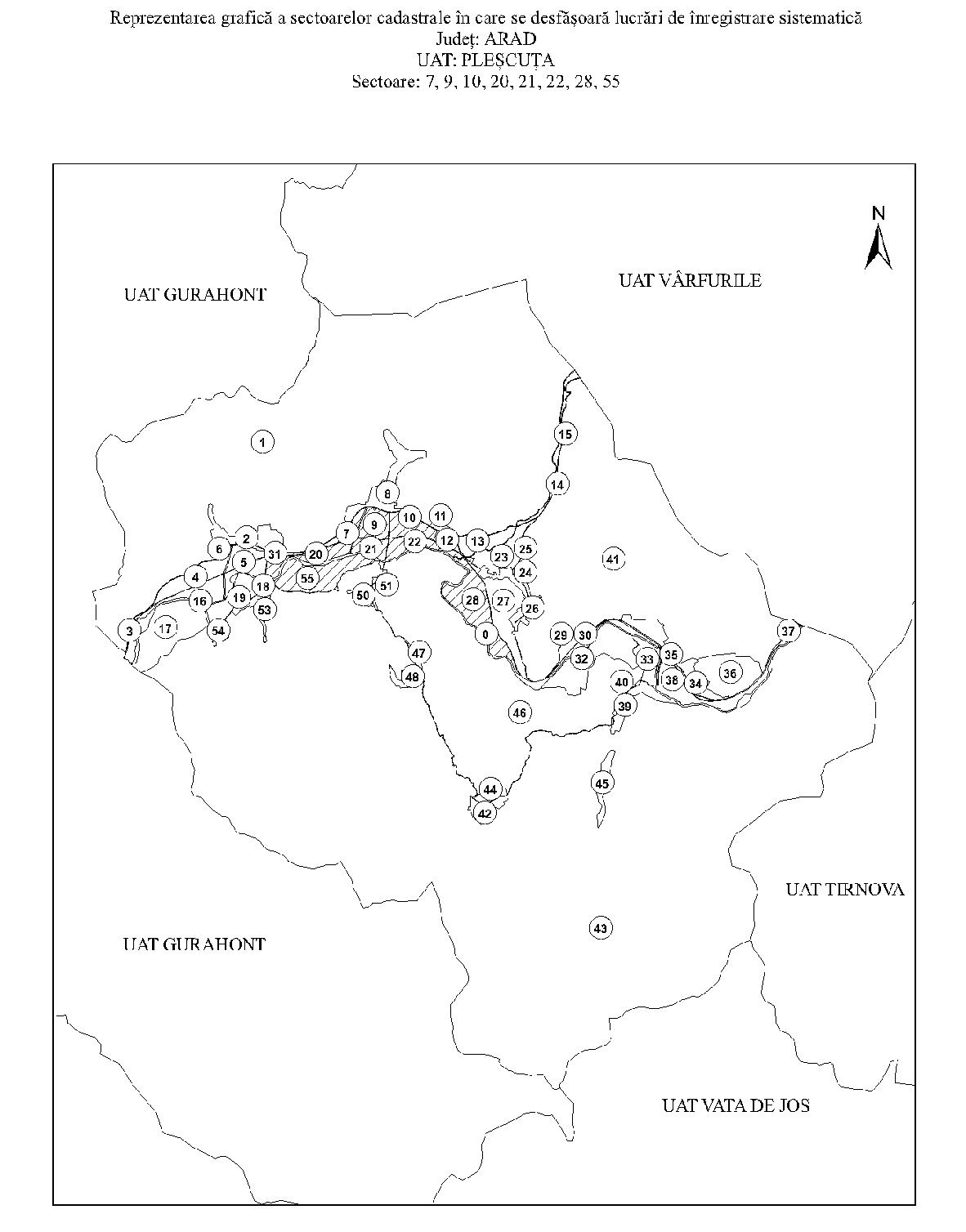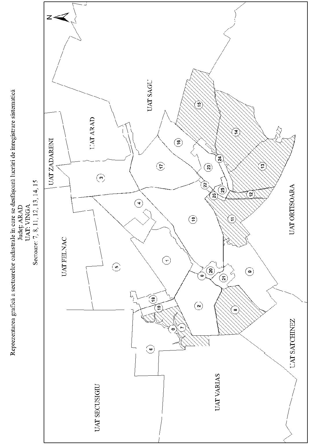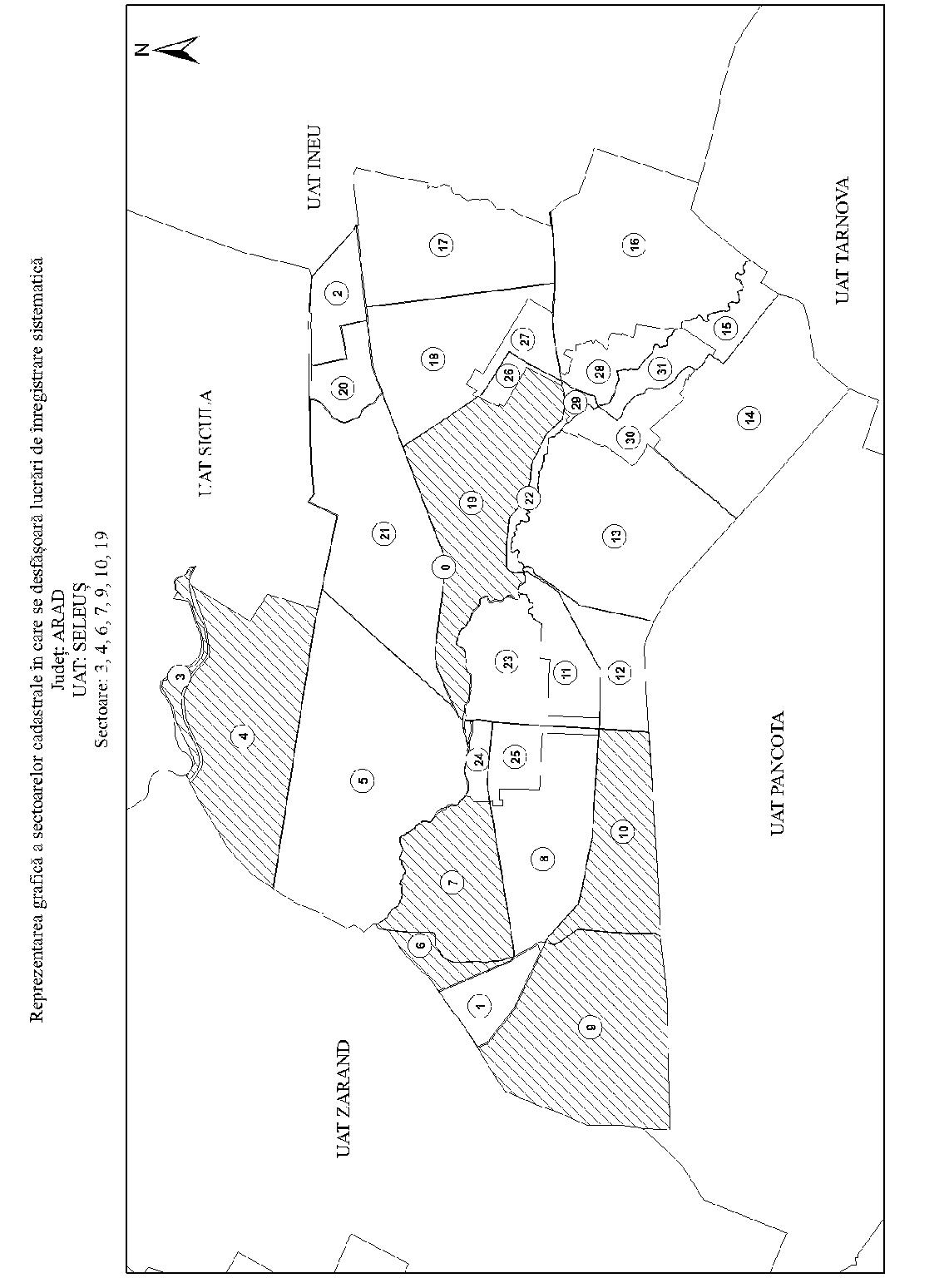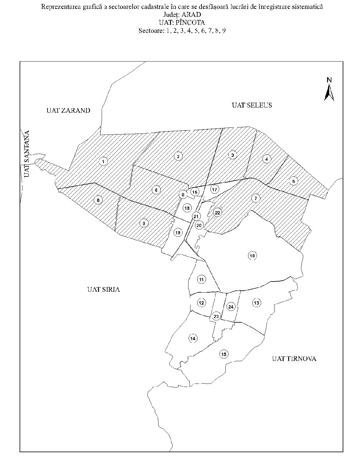 Având în vedere prevederile art. 11 alin. (1) din Legea cadastrului şi a publicităţii imobiliare nr. 7/1996, republicată, cu modificările şi completările ulterioare, în temeiul art. 3 alin. (13) din Legea cadastrului şi a publicităţii imobiliare nr. 7/1996, republicată, cu modificările şi completările ulterioare, şi al art. 15 alin. (3) din Regulamentul de organizare şi funcţionare a Agenţiei Naţionale de Cadastru şi Publicitate Imobiliară, aprobat prin Hotărârea Guvernului nr. 1.288/2012, cu modificările şi completările ulterioare, directorul general al Agenţiei Naţionale de Cadastru şi Publicitate Imobiliară emite prezentul ordin. Articolul 1 Se aprobă începerea lucrărilor de înregistrare sistematică a imobilelor, pe sectoare cadastrale, situate pe teritoriul a 23 de unităţi administrativ-teritoriale din judeţul Arad, după cum urmează: a)unitatea administrativ-teritorială Birchiş - sectoarele cadastrale nr. 1, 5, 6, 8, 16 şi 17; b)unitatea administrativ-teritorială Bocsig - sectoarele cadastrale nr. 4, 15 şi 16; c)unitatea administrativ-teritorială Chisindia - sectoarele cadastrale nr. 1, 2, 6, 7, 8 şi 16; d)unitatea administrativ-teritorială Conop - sectoarele cadastrale nr. 3, 11, 13 şi 18; e)unitatea administrativ-teritorială Craiva - sectoarele cadastrale nr. 4 şi 5; f)unitatea administrativ-teritorială Dorobanţi - sectoarele cadastrale nr. 1, 2, 4, 5, 6, 7 şi 8; g)unitatea administrativ-teritorială Hăşmaş - sectoarele cadastrale nr. 11, 12, 13, 14 şi 15; h)unitatea administrativ-teritorială Macea - sectoarele cadastrale nr. 4, 5, 10, 11, 12, 14 şi 18; i)unitatea administrativ-teritorială Peregu Mare - sectoarele cadastrale nr. 4 şi 6; j)unitatea administrativ-teritorială Petriş - sectoarele cadastrale nr. 3, 4, 5, 6, 10, 11, 13, 14, 17 şi 18; k)unitatea administrativ-teritorială Pilu - sectoarele cadastrale nr. 2, 3, 5, 6, 7, 8, 12 şi 13; l)unitatea administrativ-teritorială Pâncota - sectoarele cadastrale nr. 1, 2, 3, 4, 5, 6, 7, 8 şi 9; m)unitatea administrativ-teritorială Pleşcuţa - sectoarele cadastrale nr. 7, 9, 10, 20, 21, 22, 28 şi 55; n)unitatea administrativ-teritorială Seleuş - sectoarele cadastrale nr. 3, 4, 6, 7, 9, 10 şi 19; o)unitatea administrativ-teritorială Semlac - sectoarele cadastrale nr. 2, 3, 4, 5, 6, 7, 8, 9, 12, 13, 14, 15, 18, 19, 20, 21, 23 şi 24; p)unitatea administrativ-teritorială Şofronea - sectoarele cadastrale nr. 1, 2, 3, 4, 6, 7, 9, 16 şi 17; q)unitatea administrativ-teritorială Tauţ - sectoarele cadastrale nr. 1, 2, 3, 4 şi 5; r)unitatea administrativ-teritorială Târnova - sectoarele cadastrale nr. 28, 29, 30, 34, 37, 39 şi 47; s)unitatea administrativ-teritorială Ususău - sectoarele cadastrale nr. 1, 2 şi 3; t)unitatea administrativ-teritorială Vârfurile - sectoarele cadastrale nr. 5, 6, 16 şi 22; u)unitatea administrativ-teritorială Vinga - sectoarele cadastrale nr. 7, 8, 11, 12, 13, 14 şi 15; v)unitatea administrativ-teritorială Zerind - sectoarele cadastrale nr. 16, 18, 19, 20 şi 21; w)unitatea administrativ-teritorială Zimandu Nou - sectoarele cadastrale nr. 3, 4, 6, 7, 8, 10 şi 13. Articolul 2 Reprezentarea grafică a sectoarelor cadastrale în care se desfăşoară lucrările de înregistrare sistematică a imobilelor este prevăzută în anexele nr. 1-23 la prezentul ordin. Articolul 3 Anexele nr. 1-23*) fac parte integrantă din prezentul ordin. *) Anexele nr. 1-23 sunt reproduse în facsimil. Articolul 4 Prezentul ordin se publică în Monitorul Oficial al României, Partea I. p. Directorul general al Agenţiei Naţionale de Cadastru şi Publicitate Imobiliară, Vasile Marcel Grigore ANEXA Nr. 1