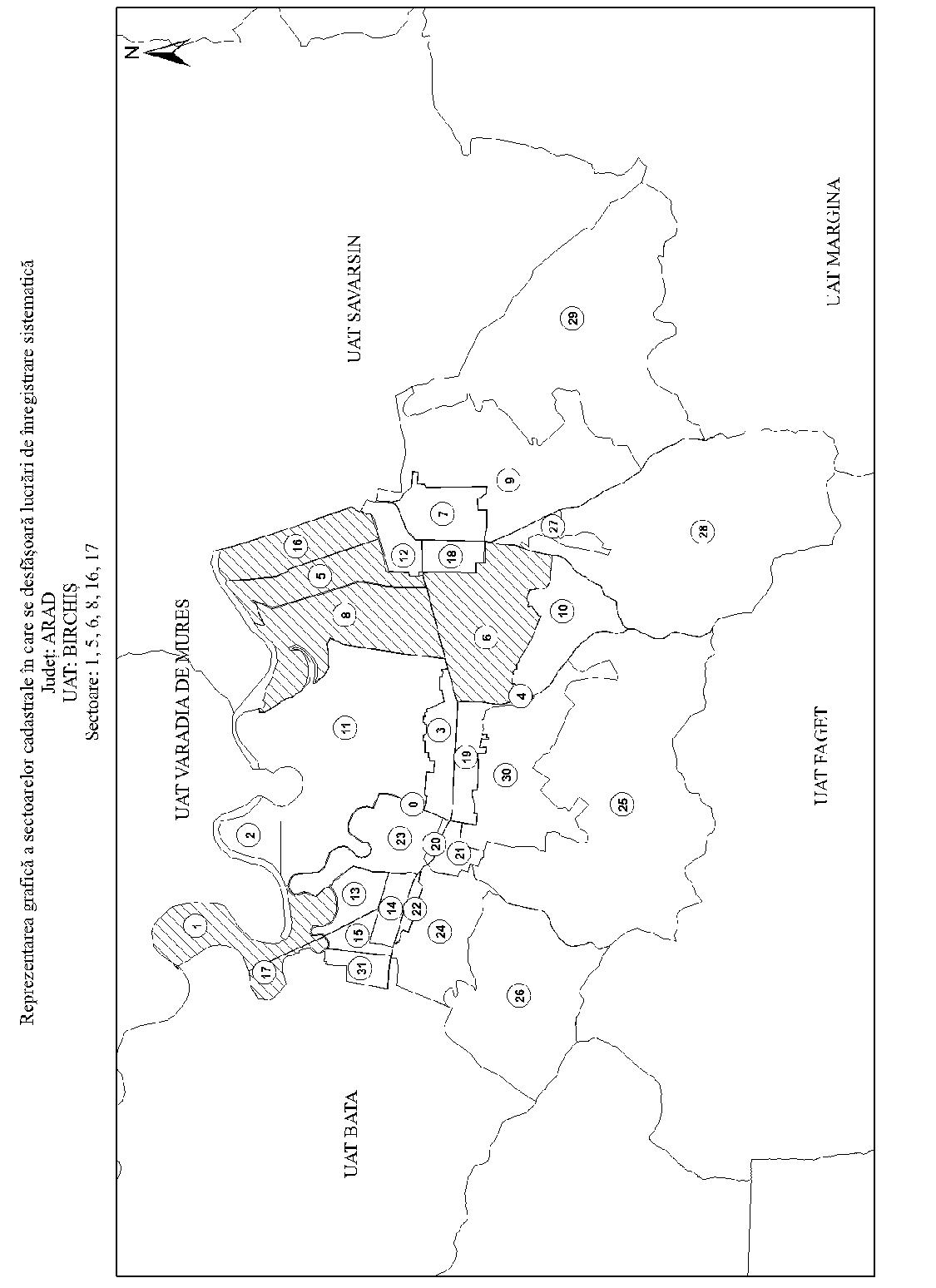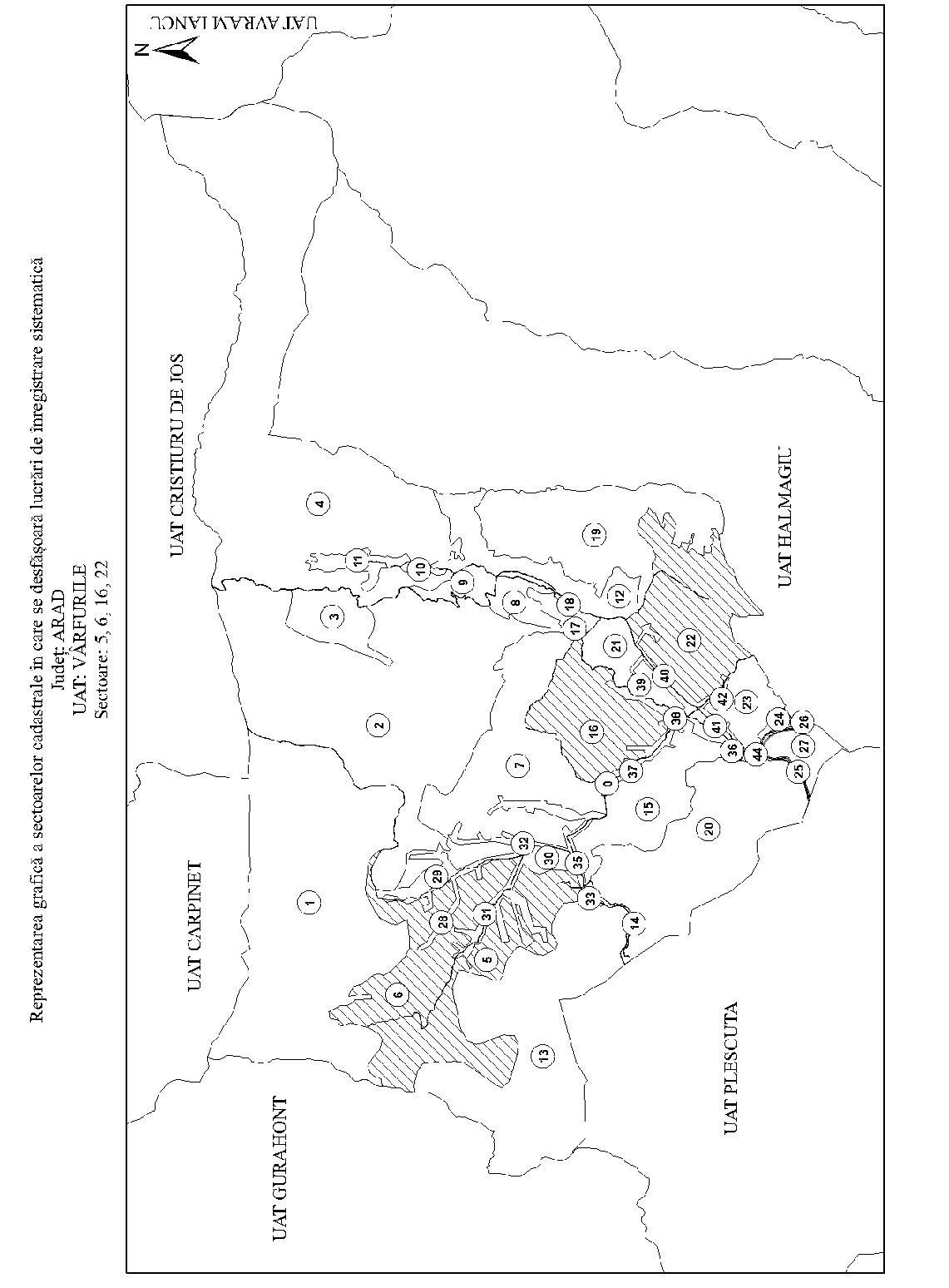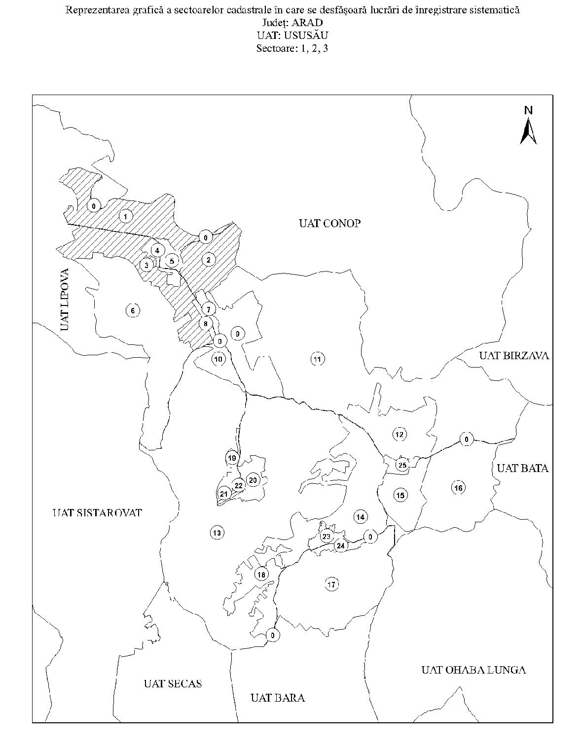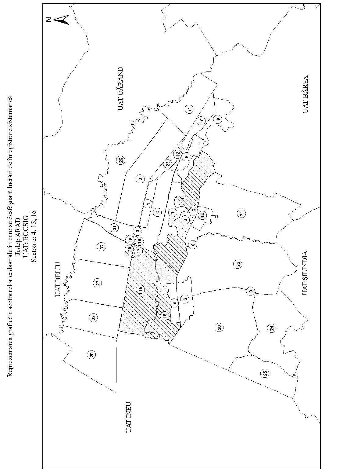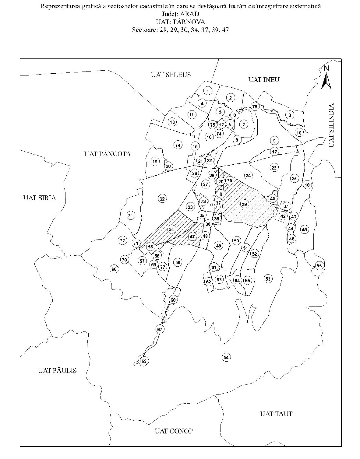 Având în vedere prevederile art. 11 alin. (1) din Legea cadastrului şi a publicităţii imobiliare nr. 7/1996, republicată, cu modificările şi completările ulterioare, în temeiul art. 3 alin. (13) din Legea cadastrului şi a publicităţii imobiliare nr. 7/1996, republicată, cu modificările şi completările ulterioare, şi al art. 15 alin. (3) din Regulamentul de organizare şi funcţionare a Agenţiei Naţionale de Cadastru şi Publicitate Imobiliară, aprobat prin Hotărârea Guvernului nr. 1.288/2012, cu modificările şi completările ulterioare, directorul general al Agenţiei Naţionale de Cadastru şi Publicitate Imobiliară emite prezentul ordin. Articolul 1 Se aprobă începerea lucrărilor de înregistrare sistematică a imobilelor, pe sectoare cadastrale, situate pe teritoriul a 23 de unităţi administrativ-teritoriale din judeţul Arad, după cum urmează: a)unitatea administrativ-teritorială Birchiş - sectoarele cadastrale nr. 1, 5, 6, 8, 16 şi 17; b)unitatea administrativ-teritorială Bocsig - sectoarele cadastrale nr. 4, 15 şi 16; c)unitatea administrativ-teritorială Chisindia - sectoarele cadastrale nr. 1, 2, 6, 7, 8 şi 16; d)unitatea administrativ-teritorială Conop - sectoarele cadastrale nr. 3, 11, 13 şi 18; e)unitatea administrativ-teritorială Craiva - sectoarele cadastrale nr. 4 şi 5; f)unitatea administrativ-teritorială Dorobanţi - sectoarele cadastrale nr. 1, 2, 4, 5, 6, 7 şi 8; g)unitatea administrativ-teritorială Hăşmaş - sectoarele cadastrale nr. 11, 12, 13, 14 şi 15; h)unitatea administrativ-teritorială Macea - sectoarele cadastrale nr. 4, 5, 10, 11, 12, 14 şi 18; i)unitatea administrativ-teritorială Peregu Mare - sectoarele cadastrale nr. 4 şi 6; j)unitatea administrativ-teritorială Petriş - sectoarele cadastrale nr. 3, 4, 5, 6, 10, 11, 13, 14, 17 şi 18; k)unitatea administrativ-teritorială Pilu - sectoarele cadastrale nr. 2, 3, 5, 6, 7, 8, 12 şi 13; l)unitatea administrativ-teritorială Pâncota - sectoarele cadastrale nr. 1, 2, 3, 4, 5, 6, 7, 8 şi 9; m)unitatea administrativ-teritorială Pleşcuţa - sectoarele cadastrale nr. 7, 9, 10, 20, 21, 22, 28 şi 55; n)unitatea administrativ-teritorială Seleuş - sectoarele cadastrale nr. 3, 4, 6, 7, 9, 10 şi 19; o)unitatea administrativ-teritorială Semlac - sectoarele cadastrale nr. 2, 3, 4, 5, 6, 7, 8, 9, 12, 13, 14, 15, 18, 19, 20, 21, 23 şi 24; p)unitatea administrativ-teritorială Şofronea - sectoarele cadastrale nr. 1, 2, 3, 4, 6, 7, 9, 16 şi 17; q)unitatea administrativ-teritorială Tauţ - sectoarele cadastrale nr. 1, 2, 3, 4 şi 5; r)unitatea administrativ-teritorială Târnova - sectoarele cadastrale nr. 28, 29, 30, 34, 37, 39 şi 47; s)unitatea administrativ-teritorială Ususău - sectoarele cadastrale nr. 1, 2 şi 3; t)unitatea administrativ-teritorială Vârfurile - sectoarele cadastrale nr. 5, 6, 16 şi 22; u)unitatea administrativ-teritorială Vinga - sectoarele cadastrale nr. 7, 8, 11, 12, 13, 14 şi 15; v)unitatea administrativ-teritorială Zerind - sectoarele cadastrale nr. 16, 18, 19, 20 şi 21; w)unitatea administrativ-teritorială Zimandu Nou - sectoarele cadastrale nr. 3, 4, 6, 7, 8, 10 şi 13. Articolul 2 Reprezentarea grafică a sectoarelor cadastrale în care se desfăşoară lucrările de înregistrare sistematică a imobilelor este prevăzută în anexele nr. 1-23 la prezentul ordin. Articolul 3 Anexele nr. 1-23*) fac parte integrantă din prezentul ordin. *) Anexele nr. 1-23 sunt reproduse în facsimil. Articolul 4 Prezentul ordin se publică în Monitorul Oficial al României, Partea I. p. Directorul general al Agenţiei Naţionale de Cadastru şi Publicitate Imobiliară, Vasile Marcel Grigore ANEXA Nr. 1