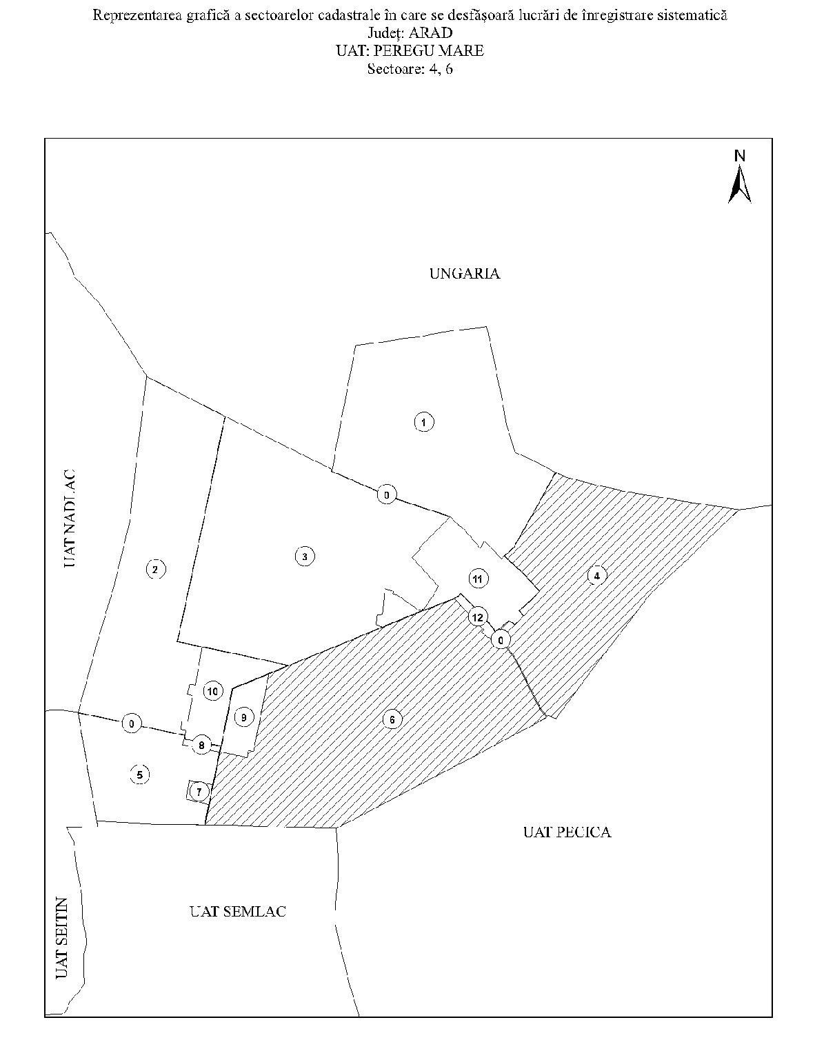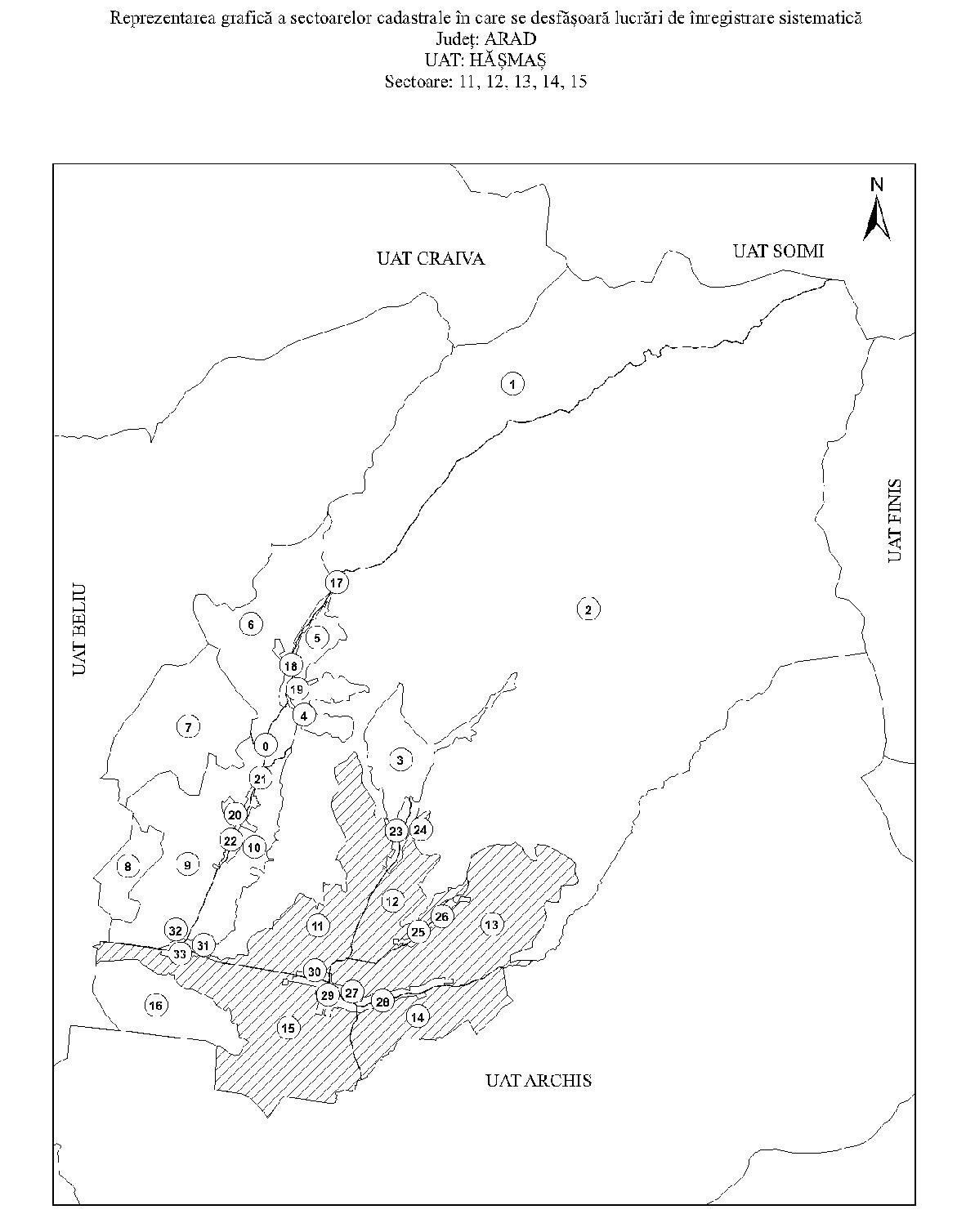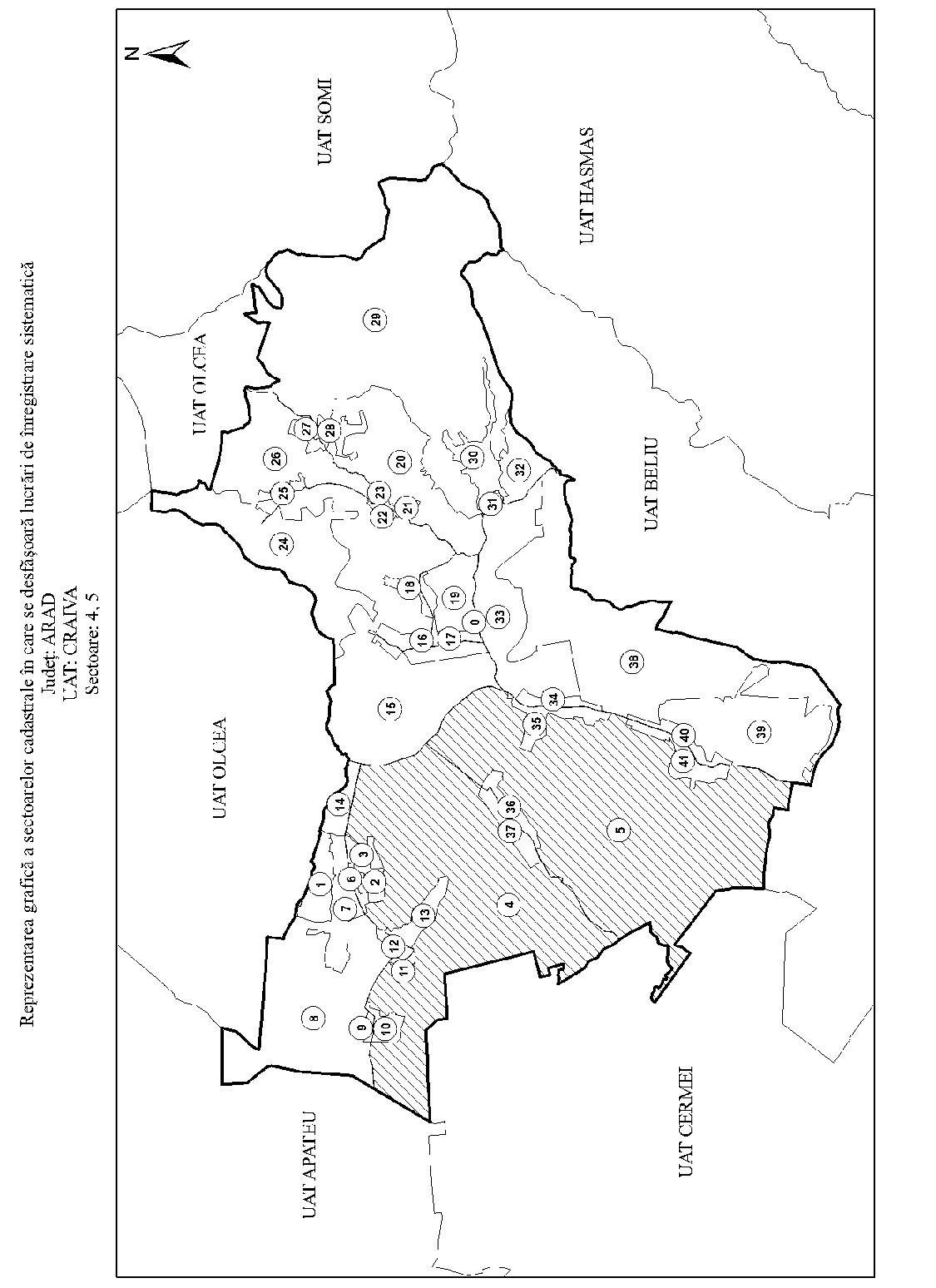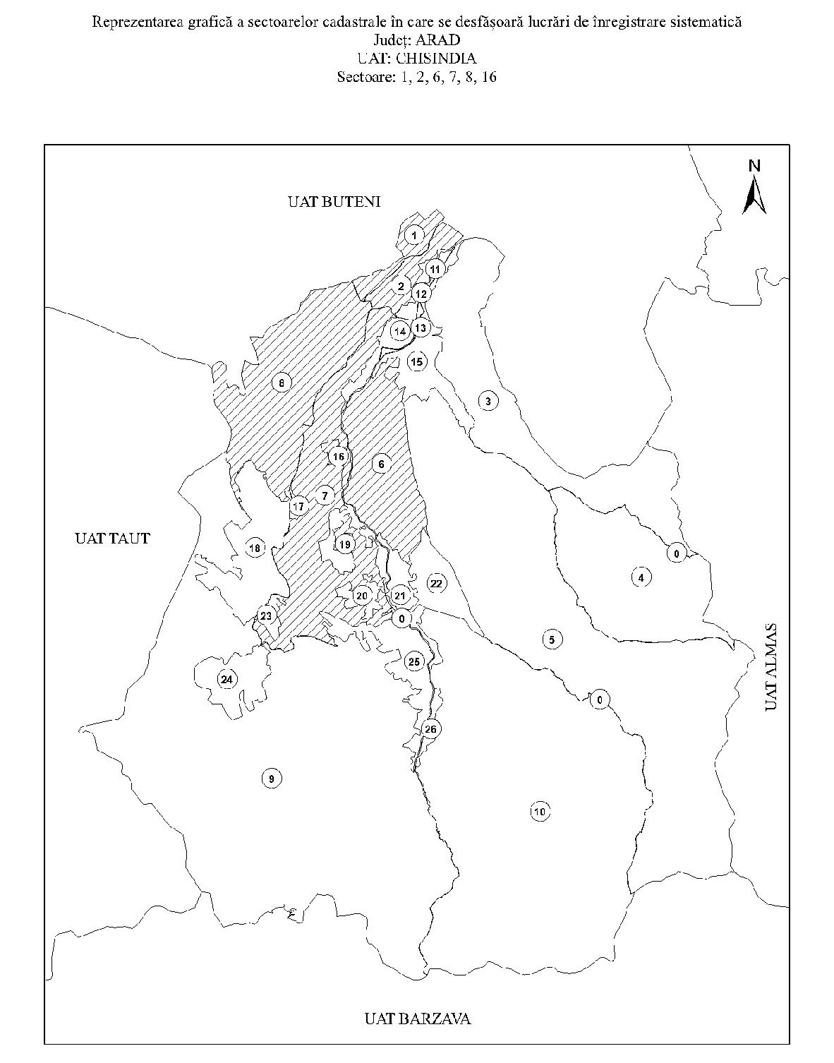 Având în vedere prevederile art. 11 alin. (1) din Legea cadastrului şi a publicităţii imobiliare nr. 7/1996, republicată, cu modificările şi completările ulterioare, în temeiul art. 3 alin. (13) din Legea cadastrului şi a publicităţii imobiliare nr. 7/1996, republicată, cu modificările şi completările ulterioare, şi al art. 15 alin. (3) din Regulamentul de organizare şi funcţionare a Agenţiei Naţionale de Cadastru şi Publicitate Imobiliară, aprobat prin Hotărârea Guvernului nr. 1.288/2012, cu modificările şi completările ulterioare, directorul general al Agenţiei Naţionale de Cadastru şi Publicitate Imobiliară emite prezentul ordin. Articolul 1 Se aprobă începerea lucrărilor de înregistrare sistematică a imobilelor, pe sectoare cadastrale, situate pe teritoriul a 23 de unităţi administrativ-teritoriale din judeţul Arad, după cum urmează: a)unitatea administrativ-teritorială Birchiş - sectoarele cadastrale nr. 1, 5, 6, 8, 16 şi 17; b)unitatea administrativ-teritorială Bocsig - sectoarele cadastrale nr. 4, 15 şi 16; c)unitatea administrativ-teritorială Chisindia - sectoarele cadastrale nr. 1, 2, 6, 7, 8 şi 16; d)unitatea administrativ-teritorială Conop - sectoarele cadastrale nr. 3, 11, 13 şi 18; e)unitatea administrativ-teritorială Craiva - sectoarele cadastrale nr. 4 şi 5; f)unitatea administrativ-teritorială Dorobanţi - sectoarele cadastrale nr. 1, 2, 4, 5, 6, 7 şi 8; g)unitatea administrativ-teritorială Hăşmaş - sectoarele cadastrale nr. 11, 12, 13, 14 şi 15; h)unitatea administrativ-teritorială Macea - sectoarele cadastrale nr. 4, 5, 10, 11, 12, 14 şi 18; i)unitatea administrativ-teritorială Peregu Mare - sectoarele cadastrale nr. 4 şi 6; j)unitatea administrativ-teritorială Petriş - sectoarele cadastrale nr. 3, 4, 5, 6, 10, 11, 13, 14, 17 şi 18; k)unitatea administrativ-teritorială Pilu - sectoarele cadastrale nr. 2, 3, 5, 6, 7, 8, 12 şi 13; l)unitatea administrativ-teritorială Pâncota - sectoarele cadastrale nr. 1, 2, 3, 4, 5, 6, 7, 8 şi 9; m)unitatea administrativ-teritorială Pleşcuţa - sectoarele cadastrale nr. 7, 9, 10, 20, 21, 22, 28 şi 55; n)unitatea administrativ-teritorială Seleuş - sectoarele cadastrale nr. 3, 4, 6, 7, 9, 10 şi 19; o)unitatea administrativ-teritorială Semlac - sectoarele cadastrale nr. 2, 3, 4, 5, 6, 7, 8, 9, 12, 13, 14, 15, 18, 19, 20, 21, 23 şi 24; p)unitatea administrativ-teritorială Şofronea - sectoarele cadastrale nr. 1, 2, 3, 4, 6, 7, 9, 16 şi 17; q)unitatea administrativ-teritorială Tauţ - sectoarele cadastrale nr. 1, 2, 3, 4 şi 5; r)unitatea administrativ-teritorială Târnova - sectoarele cadastrale nr. 28, 29, 30, 34, 37, 39 şi 47; s)unitatea administrativ-teritorială Ususău - sectoarele cadastrale nr. 1, 2 şi 3; t)unitatea administrativ-teritorială Vârfurile - sectoarele cadastrale nr. 5, 6, 16 şi 22; u)unitatea administrativ-teritorială Vinga - sectoarele cadastrale nr. 7, 8, 11, 12, 13, 14 şi 15; v)unitatea administrativ-teritorială Zerind - sectoarele cadastrale nr. 16, 18, 19, 20 şi 21; w)unitatea administrativ-teritorială Zimandu Nou - sectoarele cadastrale nr. 3, 4, 6, 7, 8, 10 şi 13. Articolul 2 Reprezentarea grafică a sectoarelor cadastrale în care se desfăşoară lucrările de înregistrare sistematică a imobilelor este prevăzută în anexele nr. 1-23 la prezentul ordin. Articolul 3 Anexele nr. 1-23*) fac parte integrantă din prezentul ordin. *) Anexele nr. 1-23 sunt reproduse în facsimil. Articolul 4 Prezentul ordin se publică în Monitorul Oficial al României, Partea I. p. Directorul general al Agenţiei Naţionale de Cadastru şi Publicitate Imobiliară, Vasile Marcel Grigore ANEXA Nr. 1