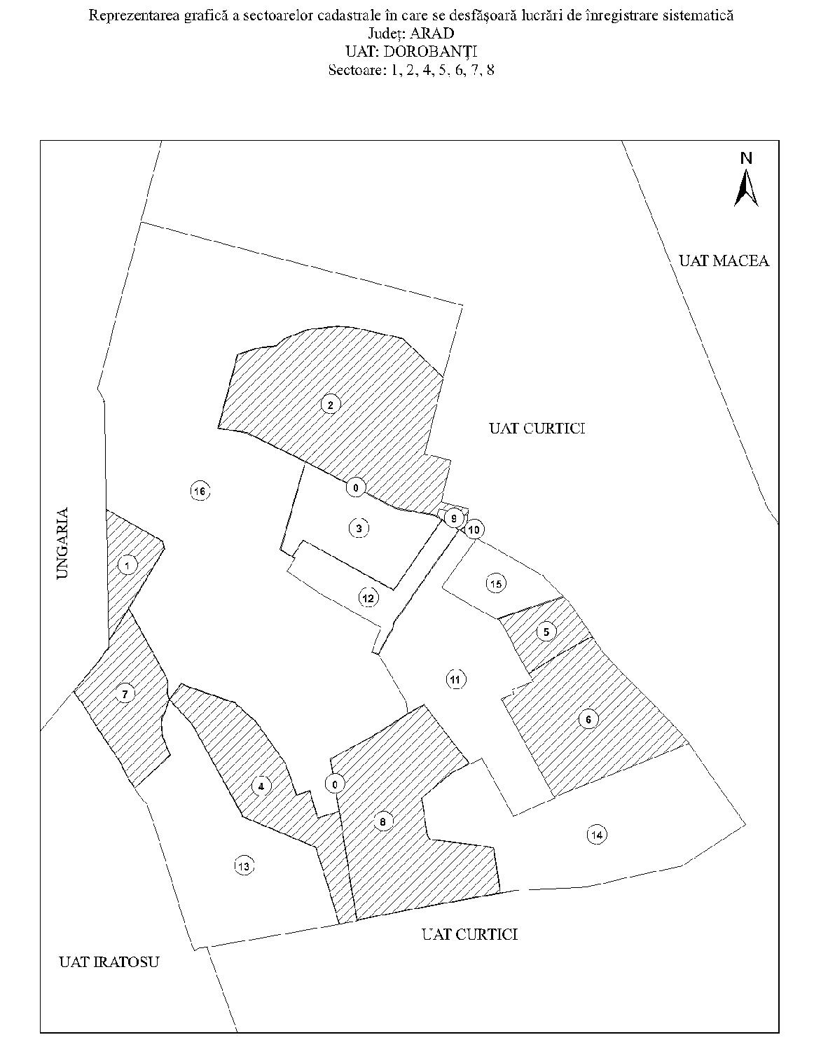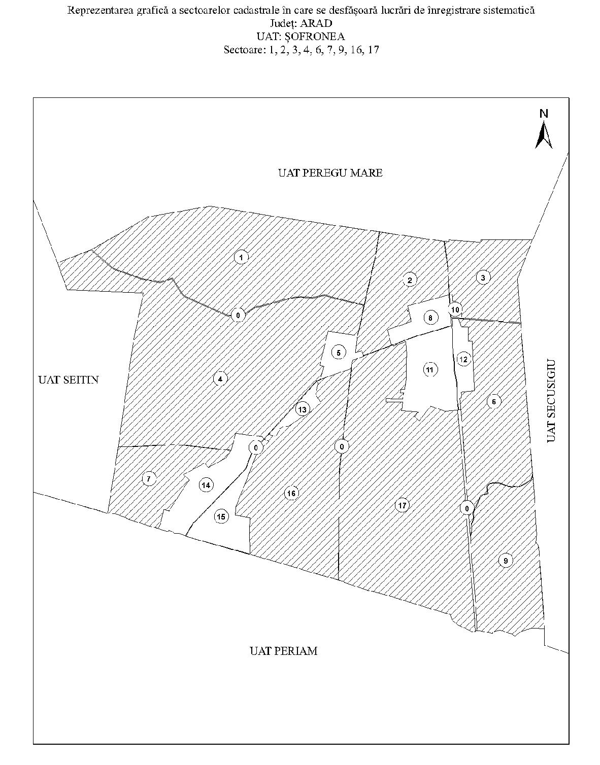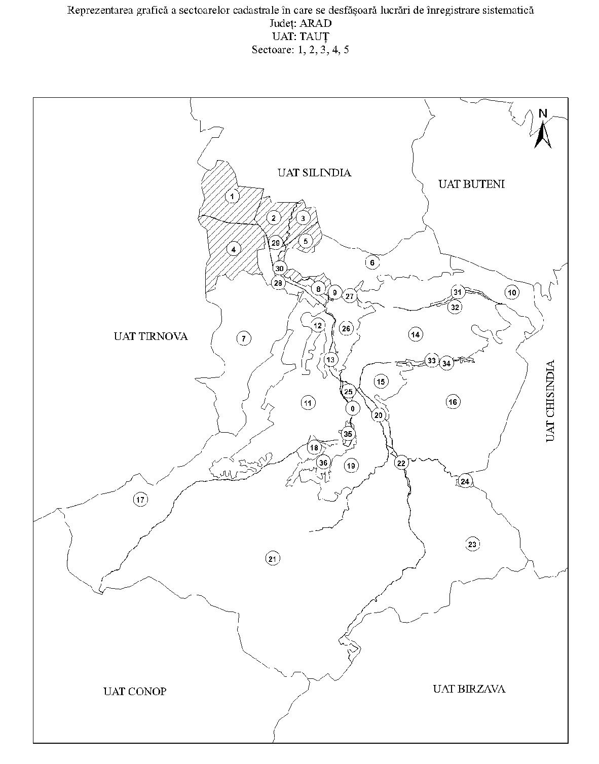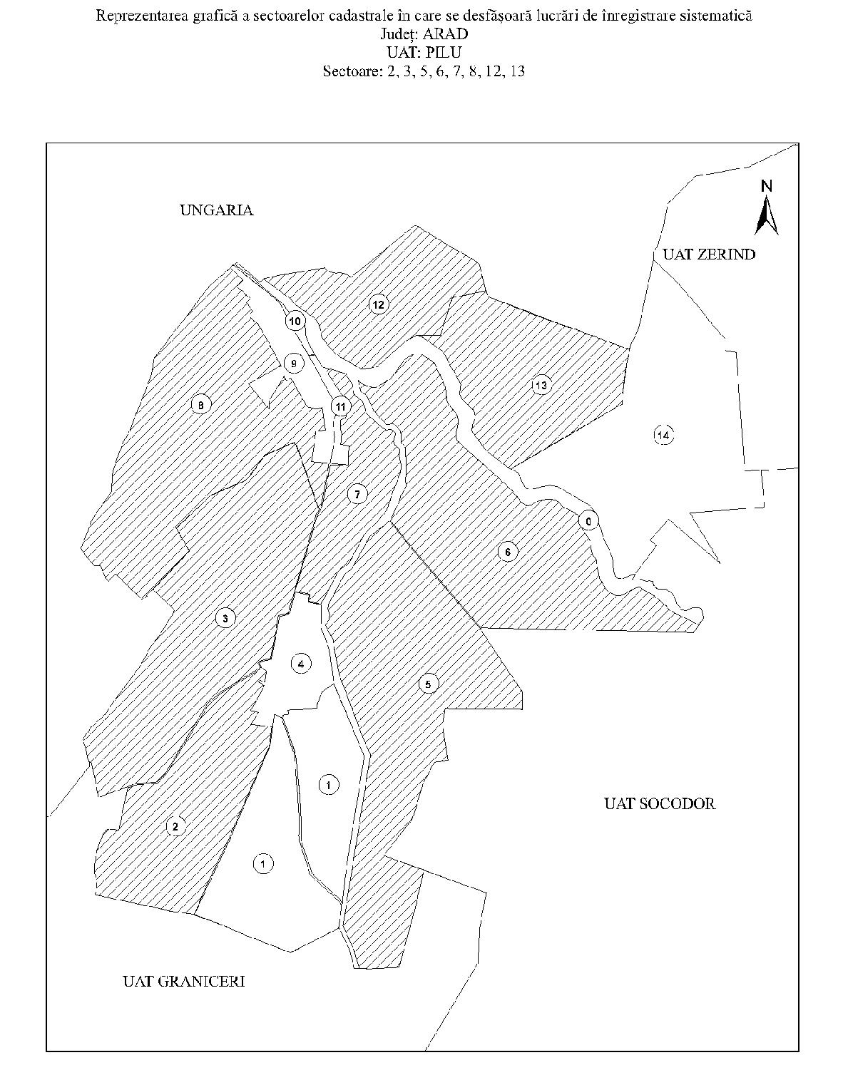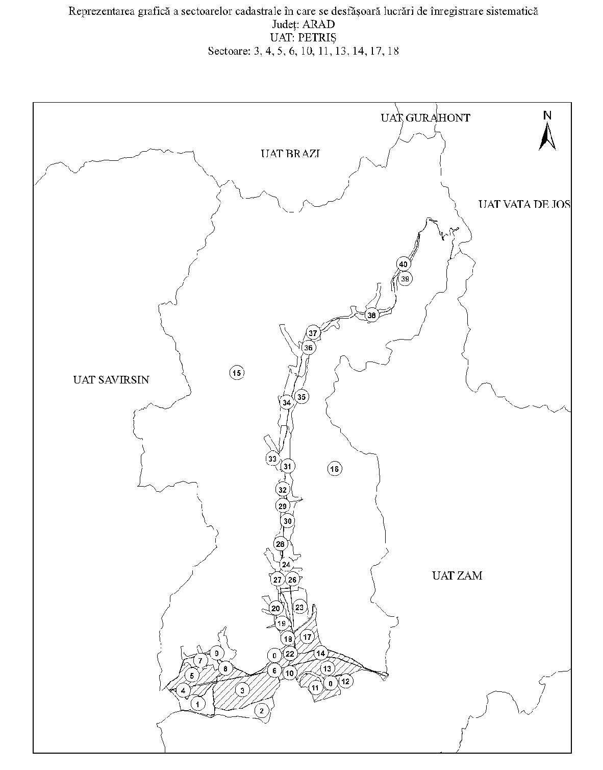 Având în vedere prevederile art. 11 alin. (1) din Legea cadastrului şi a publicităţii imobiliare nr. 7/1996, republicată, cu modificările şi completările ulterioare, în temeiul art. 3 alin. (13) din Legea cadastrului şi a publicităţii imobiliare nr. 7/1996, republicată, cu modificările şi completările ulterioare, şi al art. 15 alin. (3) din Regulamentul de organizare şi funcţionare a Agenţiei Naţionale de Cadastru şi Publicitate Imobiliară, aprobat prin Hotărârea Guvernului nr. 1.288/2012, cu modificările şi completările ulterioare, directorul general al Agenţiei Naţionale de Cadastru şi Publicitate Imobiliară emite prezentul ordin. Articolul 1 Se aprobă începerea lucrărilor de înregistrare sistematică a imobilelor, pe sectoare cadastrale, situate pe teritoriul a 23 de unităţi administrativ-teritoriale din judeţul Arad, după cum urmează: a)unitatea administrativ-teritorială Birchiş - sectoarele cadastrale nr. 1, 5, 6, 8, 16 şi 17; b)unitatea administrativ-teritorială Bocsig - sectoarele cadastrale nr. 4, 15 şi 16; c)unitatea administrativ-teritorială Chisindia - sectoarele cadastrale nr. 1, 2, 6, 7, 8 şi 16; d)unitatea administrativ-teritorială Conop - sectoarele cadastrale nr. 3, 11, 13 şi 18; e)unitatea administrativ-teritorială Craiva - sectoarele cadastrale nr. 4 şi 5; f)unitatea administrativ-teritorială Dorobanţi - sectoarele cadastrale nr. 1, 2, 4, 5, 6, 7 şi 8; g)unitatea administrativ-teritorială Hăşmaş - sectoarele cadastrale nr. 11, 12, 13, 14 şi 15; h)unitatea administrativ-teritorială Macea - sectoarele cadastrale nr. 4, 5, 10, 11, 12, 14 şi 18; i)unitatea administrativ-teritorială Peregu Mare - sectoarele cadastrale nr. 4 şi 6; j)unitatea administrativ-teritorială Petriş - sectoarele cadastrale nr. 3, 4, 5, 6, 10, 11, 13, 14, 17 şi 18; k)unitatea administrativ-teritorială Pilu - sectoarele cadastrale nr. 2, 3, 5, 6, 7, 8, 12 şi 13; l)unitatea administrativ-teritorială Pâncota - sectoarele cadastrale nr. 1, 2, 3, 4, 5, 6, 7, 8 şi 9; m)unitatea administrativ-teritorială Pleşcuţa - sectoarele cadastrale nr. 7, 9, 10, 20, 21, 22, 28 şi 55; n)unitatea administrativ-teritorială Seleuş - sectoarele cadastrale nr. 3, 4, 6, 7, 9, 10 şi 19; o)unitatea administrativ-teritorială Semlac - sectoarele cadastrale nr. 2, 3, 4, 5, 6, 7, 8, 9, 12, 13, 14, 15, 18, 19, 20, 21, 23 şi 24; p)unitatea administrativ-teritorială Şofronea - sectoarele cadastrale nr. 1, 2, 3, 4, 6, 7, 9, 16 şi 17; q)unitatea administrativ-teritorială Tauţ - sectoarele cadastrale nr. 1, 2, 3, 4 şi 5; r)unitatea administrativ-teritorială Târnova - sectoarele cadastrale nr. 28, 29, 30, 34, 37, 39 şi 47; s)unitatea administrativ-teritorială Ususău - sectoarele cadastrale nr. 1, 2 şi 3; t)unitatea administrativ-teritorială Vârfurile - sectoarele cadastrale nr. 5, 6, 16 şi 22; u)unitatea administrativ-teritorială Vinga - sectoarele cadastrale nr. 7, 8, 11, 12, 13, 14 şi 15; v)unitatea administrativ-teritorială Zerind - sectoarele cadastrale nr. 16, 18, 19, 20 şi 21; w)unitatea administrativ-teritorială Zimandu Nou - sectoarele cadastrale nr. 3, 4, 6, 7, 8, 10 şi 13. Articolul 2 Reprezentarea grafică a sectoarelor cadastrale în care se desfăşoară lucrările de înregistrare sistematică a imobilelor este prevăzută în anexele nr. 1-23 la prezentul ordin. Articolul 3 Anexele nr. 1-23*) fac parte integrantă din prezentul ordin. *) Anexele nr. 1-23 sunt reproduse în facsimil. Articolul 4 Prezentul ordin se publică în Monitorul Oficial al României, Partea I. p. Directorul general al Agenţiei Naţionale de Cadastru şi Publicitate Imobiliară, Vasile Marcel Grigore ANEXA Nr. 1