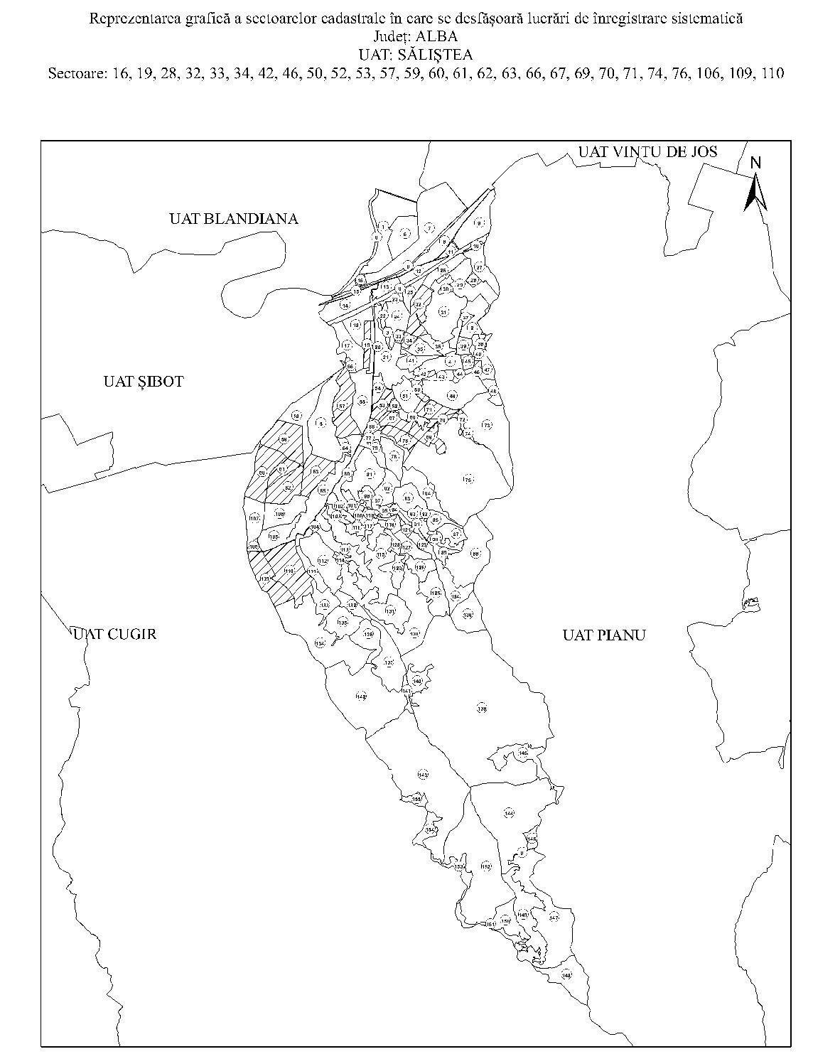 Având în vedere prevederile art. 11 alin. (1) din Legea cadastrului şi a publicităţii imobiliare nr. 7/1996, republicată, cu modificările şi completările ulterioare,în temeiul art. 3 alin. (13) din Legea cadastrului şi a publicităţii imobiliare nr. 7/1996, republicată, cu modificările şi completările ulterioare, şi al art. 15 alin. (3) din Regulamentul de organizare şi funcţionare a Agenţiei Naţionale de Cadastru şi Publicitate Imobiliară, aprobat prin Hotărârea Guvernului nr. 1.288/2012, cu modificările şi completările ulterioare,directorul general al Agenţiei Naţionale de Cadastru şi Publicitate Imobiliară emite prezentul ordin. Articolul 1Se aprobă începerea lucrărilor de înregistrare sistematică a imobilelor din sectoarele cadastrale nr. 16, 19, 28, 32, 33, 34, 42, 46, 50, 52, 53, 57, 59, 60, 61, 62, 63, 66, 67, 69, 70, 71, 74, 76, 106, 109 şi 110 din unitatea administrativ-teritorială Săliştea, judeţul Alba. Articolul 2Reprezentarea grafică a sectoarelor cadastrale în care se desfăşoară lucrările de înregistrare sistematică a imobilelor este prevăzută în anexa care face parte integrantă din prezentul ordin. Articolul 3 Prezentul ordin se publică în Monitorul Oficial al României, Partea I. p. Directorul general al Agenţiei Naţionale de Cadastru şi Publicitate Imobiliară, Vasile Marcel Grigore ANEXĂ*)*) Anexa este reprodusă în facsimil.