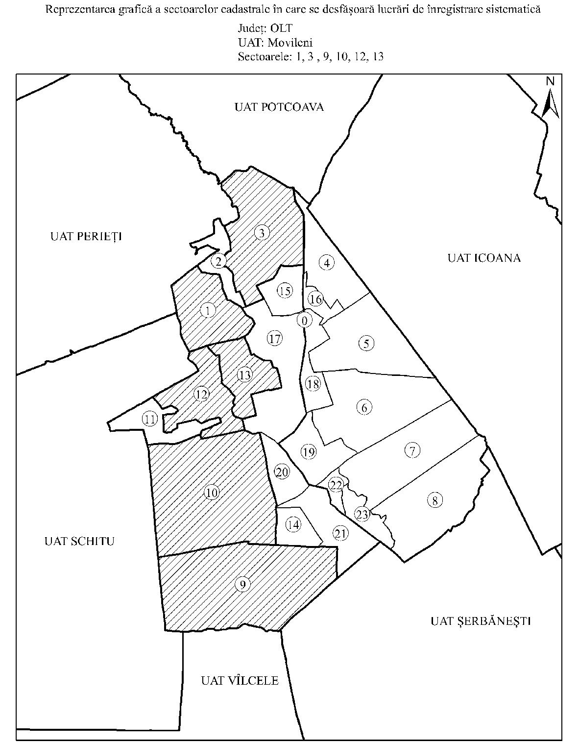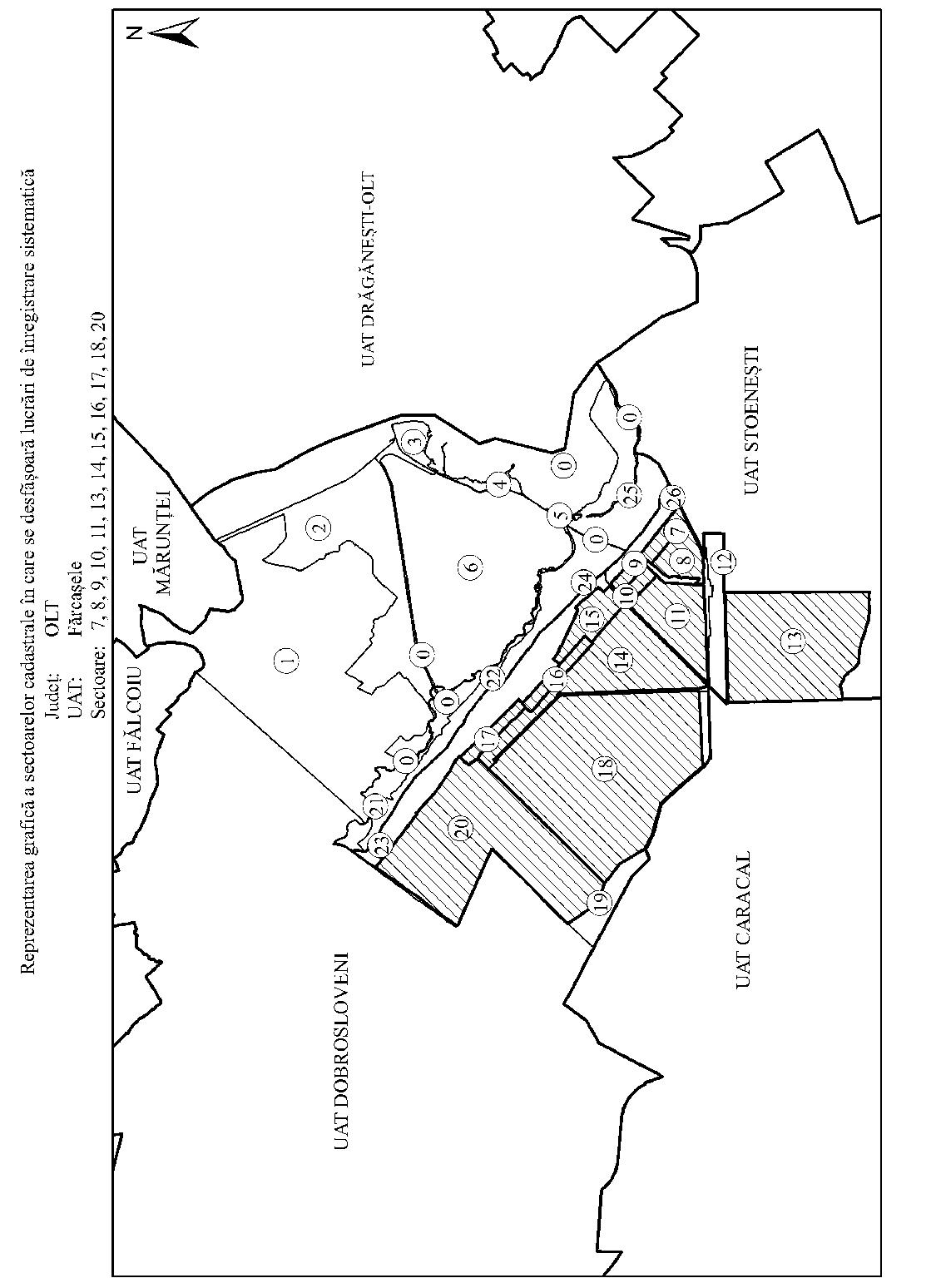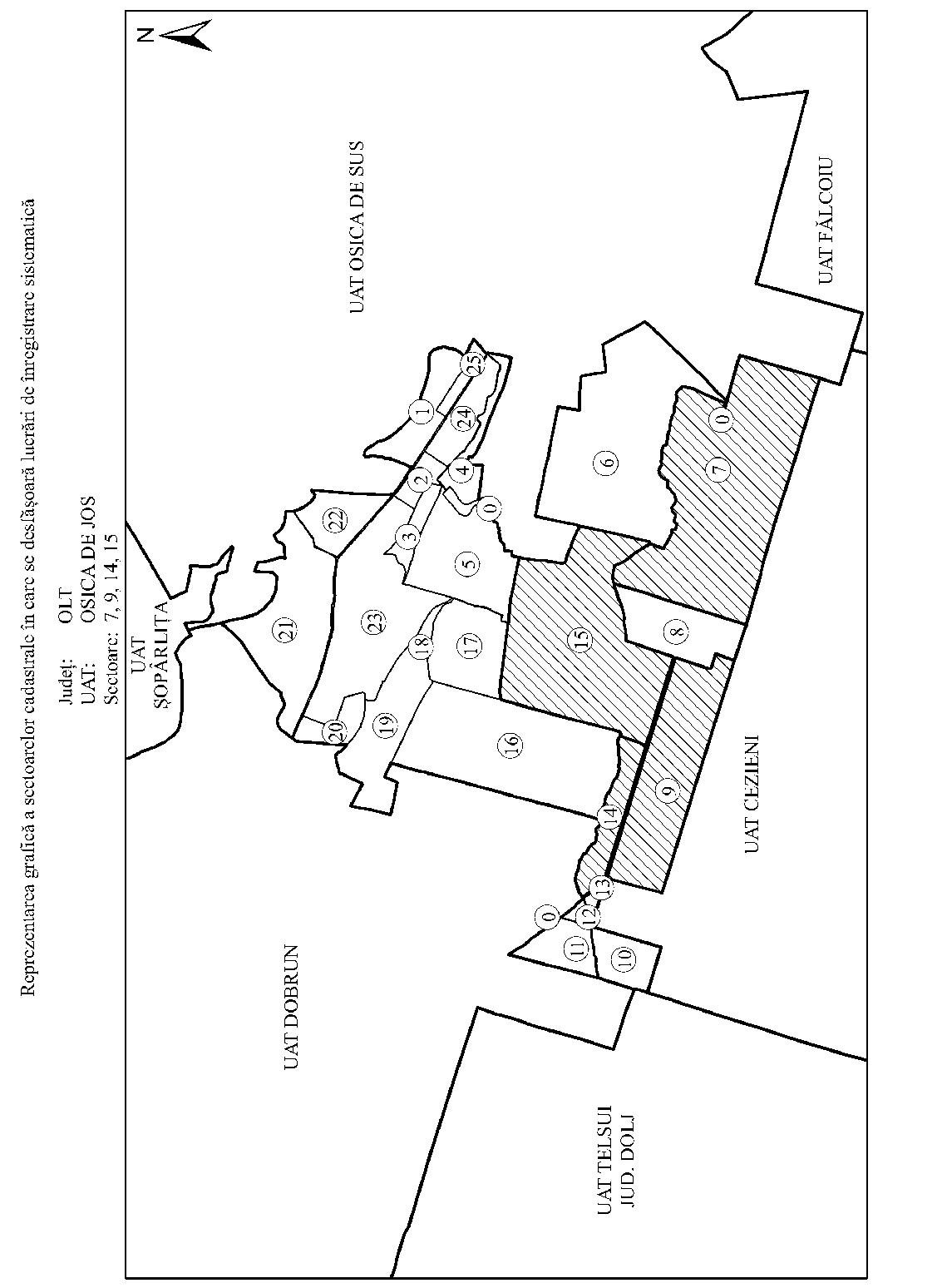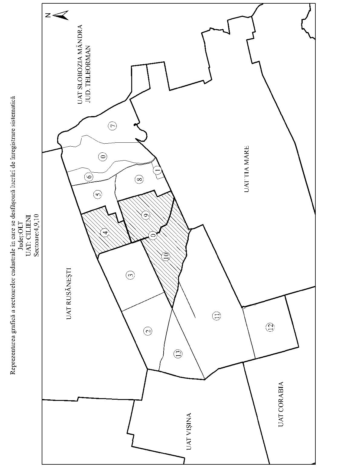 Având în vedere prevederile art. 11 alin. (1) din Legea cadastrului şi a publicităţii imobiliare nr. 7/1996, republicată, cu modificările şi completările ulterioare, şi ale art. 15 alin. (3) din Regulamentul de organizare şi funcţionare a Agenţiei Naţionale de Cadastru şi Publicitate Imobiliară, aprobat prin Hotărârea Guvernului nr. 1.288/2012, cu modificările şi completările ulterioare,în temeiul art. 3 alin. (13) din Legea cadastrului şi a publicităţii imobiliare nr. 7/1996, republicată, cu modificările şi completările ulterioare,directorul general al Agenţiei Naţionale de Cadastru şi Publicitate Imobiliară emite prezentul ordin. Articolul 1Se aprobă începerea lucrărilor de înregistrare sistematică a imobilelor, pe sectoare cadastrale, situate pe teritoriul a 8 unităţi administrativ-teritoriale din judeţul Olt, după cum urmează: a)unitatea administrativ-teritorială Bucinişu - sectoarele cadastrale nr. 2, 3, 4, 5 şi 7; b)unitatea administrativ-teritorială Cilieni - sectoarele cadastrale nr. 4, 9 şi 10; c)unitatea administrativ-teritorială Coloneşti - sectoarele cadastrale nr. 3, 4, 6, 11, 12 şi 23; d)unitatea administrativ-teritorială Fărcaşele – sectoarele cadastrale nr. 7, 8, 9, 10, 11, 13, 14, 15, 16, 17, 18 şi 20; e)unitatea administrativ-teritorială Movileni - sectoarele cadastrale nr. 1, 3, 9, 10, 12 şi 13; f)unitatea administrativ-teritorială Osica de Jos - sectoarele cadastrale nr. 7, 9, 14 şi 15; g)unitatea administrativ-teritorială Rotunda - sectoarele cadastrale nr. 7, 8, 9 şi 10; h)unitatea administrativ-teritorială Scorniceşti - sectoarele cadastrale nr. 9, 11, 12, 18 şi 24. Articolul 2Reprezentarea grafică a sectoarelor cadastrale în care se desfăşoară lucrările de înregistrare sistematică a imobilelor este prevăzută în anexele nr. 1-8 la prezentul ordin. Articolul 3Anexele nr. 1-8*) fac parte integrantă din prezentul ordin.*) Anexele nr. 1-8 sunt reproduse în facsimil. Articolul 4 Prezentul ordin se publică în Monitorul Oficial al României, Partea I.p. Directorul general al Agenţiei Naţionale de Cadastru şi Publicitate Imobiliară,Vasile Marcel GrigoreANEXA Nr. 1 ANEXA Nr. 2 ANEXA Nr. 3 ANEXA Nr. 4 ANEXA Nr. 5 ANEXA Nr. 6 ANEXA Nr. 7 ANEXA Nr. 8