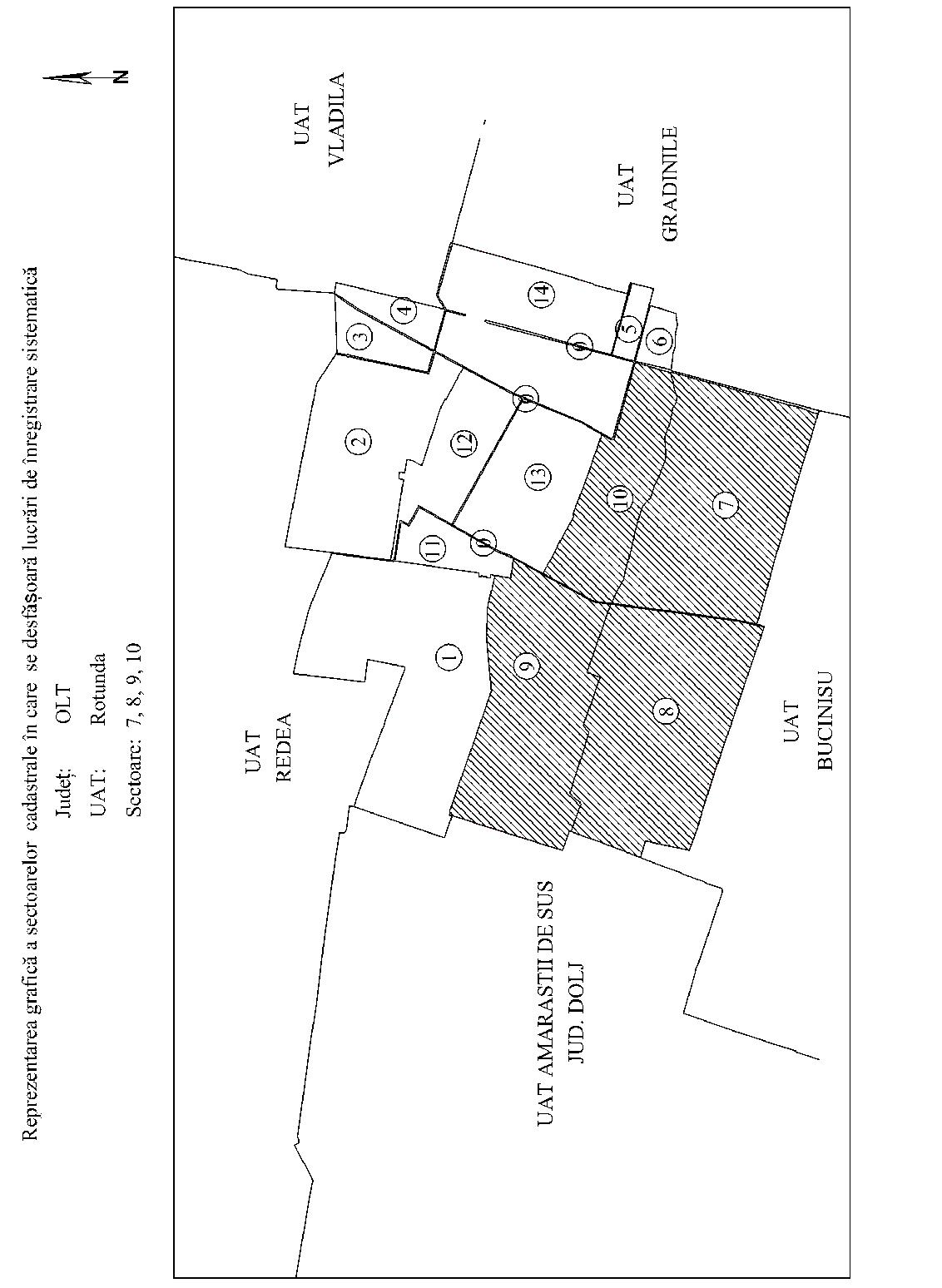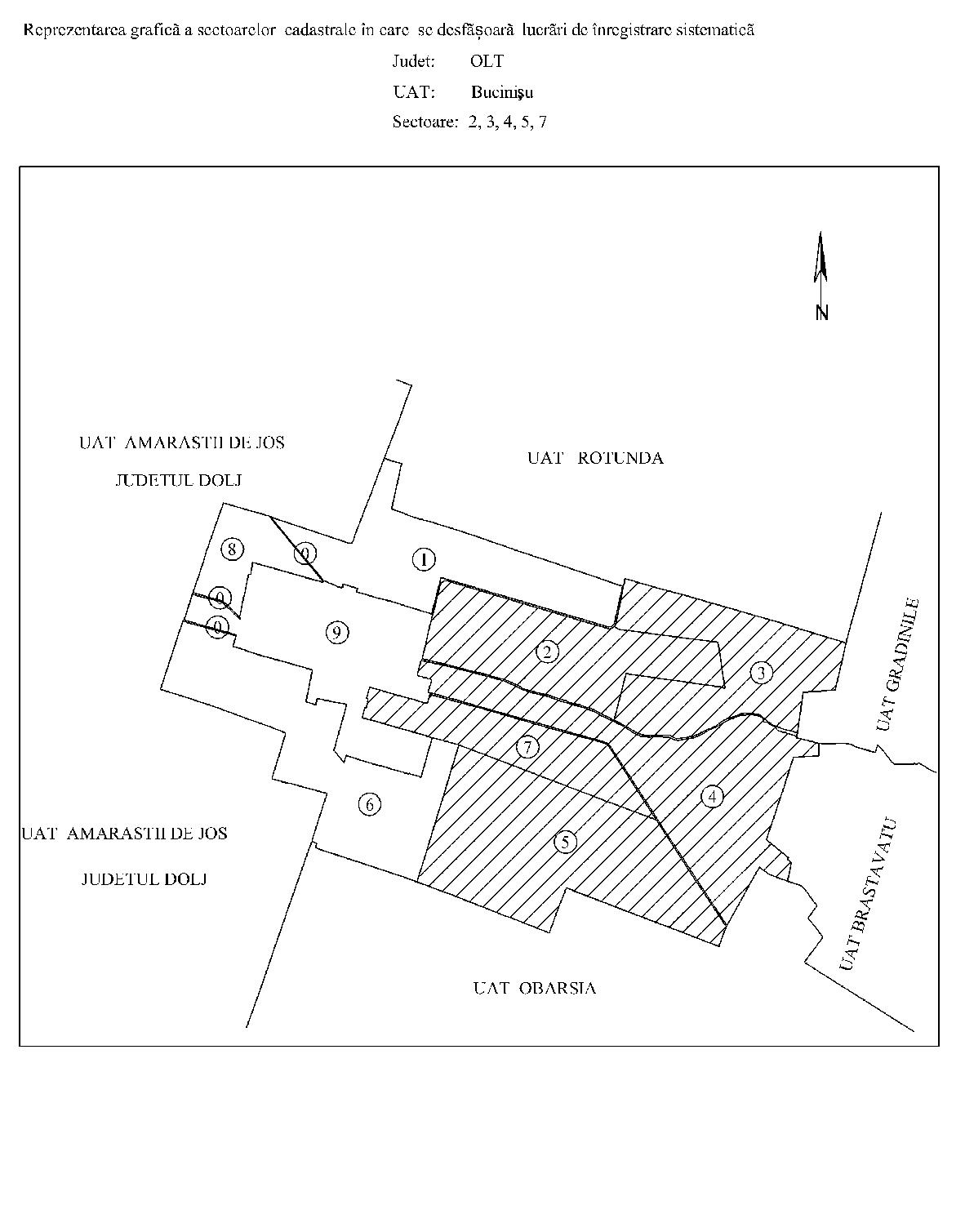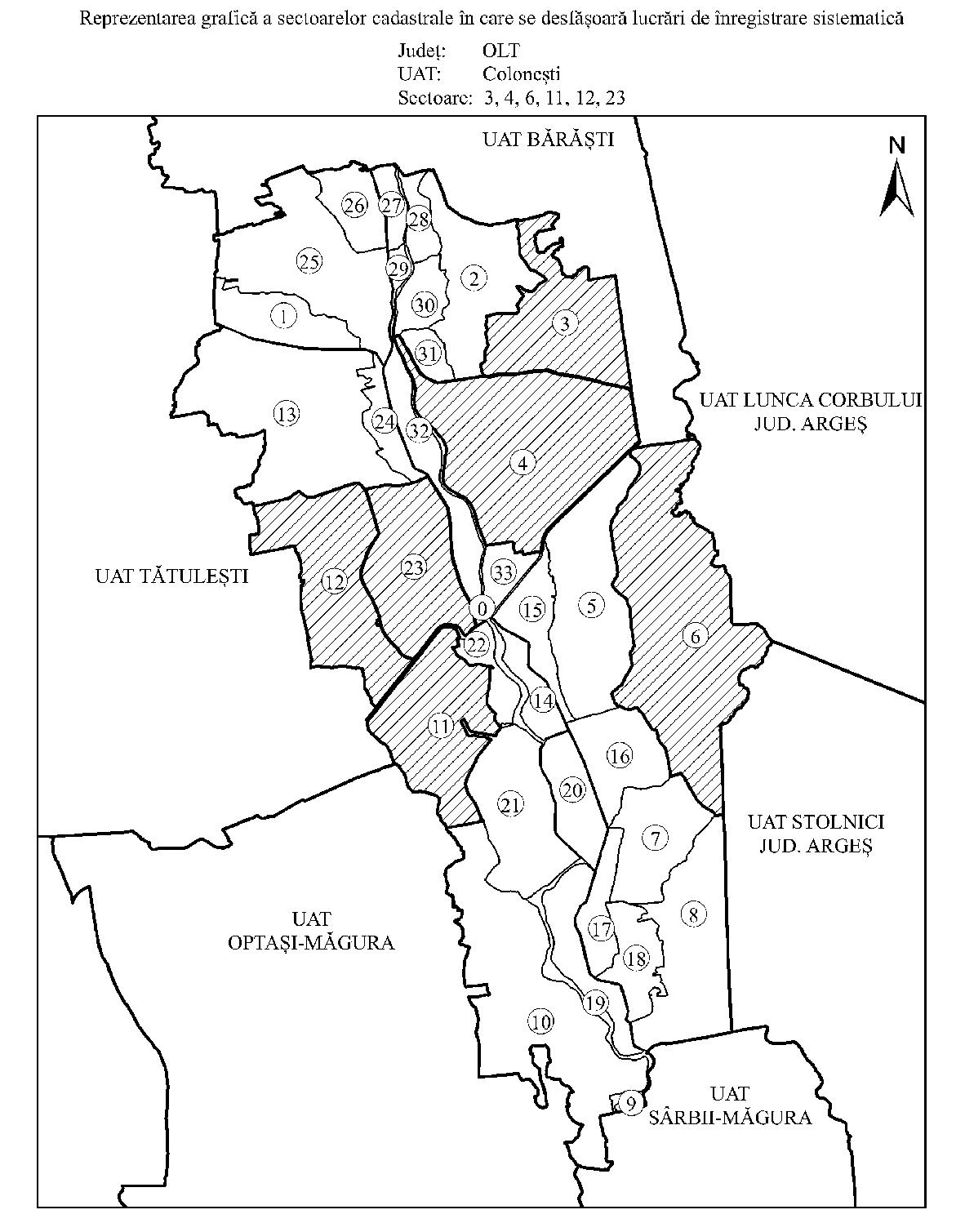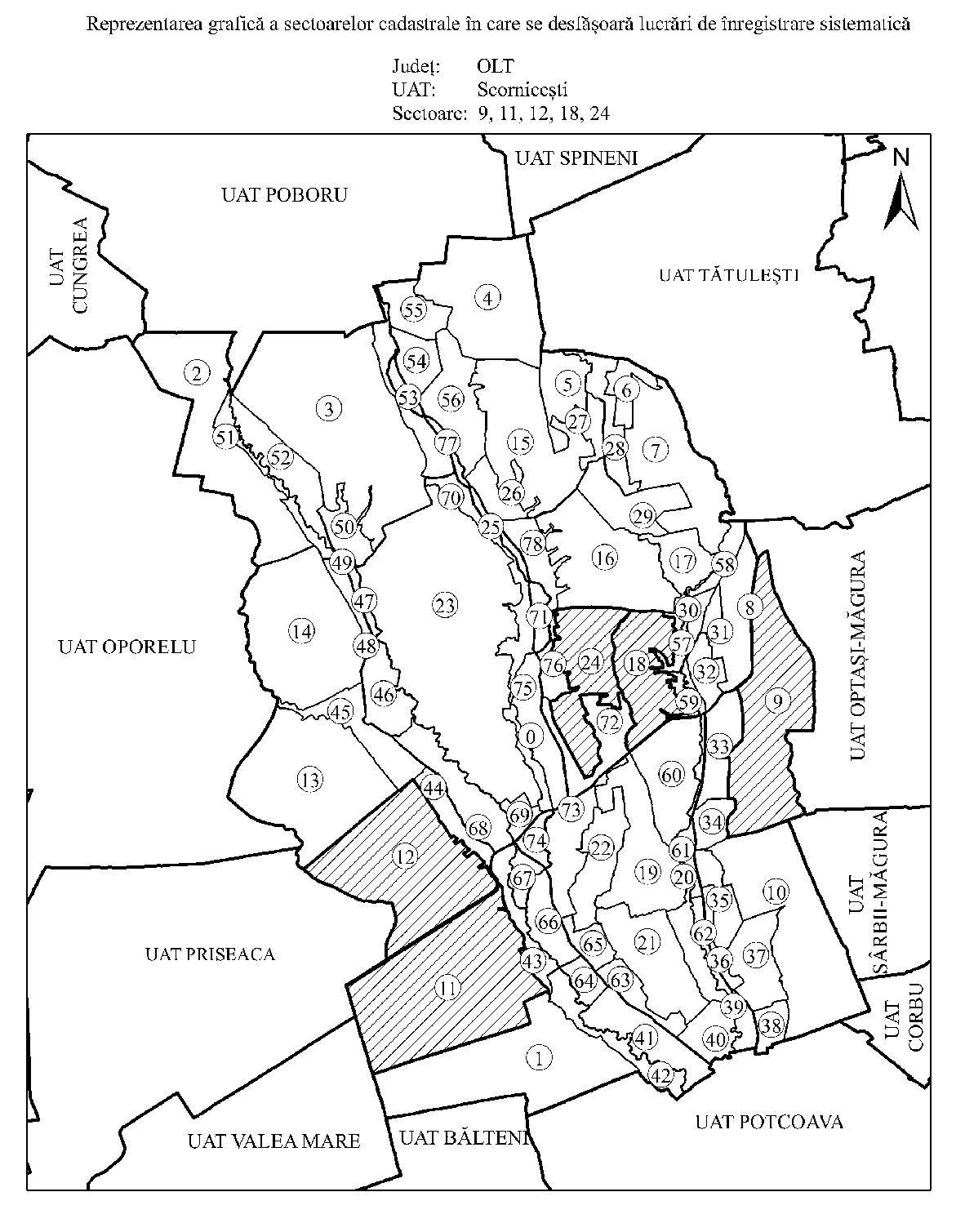 Având în vedere prevederile art. 11 alin. (1) din Legea cadastrului şi a publicităţii imobiliare nr. 7/1996, republicată, cu modificările şi completările ulterioare, şi ale art. 15 alin. (3) din Regulamentul de organizare şi funcţionare a Agenţiei Naţionale de Cadastru şi Publicitate Imobiliară, aprobat prin Hotărârea Guvernului nr. 1.288/2012, cu modificările şi completările ulterioare,în temeiul art. 3 alin. (13) din Legea cadastrului şi a publicităţii imobiliare nr. 7/1996, republicată, cu modificările şi completările ulterioare,directorul general al Agenţiei Naţionale de Cadastru şi Publicitate Imobiliară emite prezentul ordin. Articolul 1Se aprobă începerea lucrărilor de înregistrare sistematică a imobilelor, pe sectoare cadastrale, situate pe teritoriul a 8 unităţi administrativ-teritoriale din judeţul Olt, după cum urmează: a)unitatea administrativ-teritorială Bucinişu - sectoarele cadastrale nr. 2, 3, 4, 5 şi 7; b)unitatea administrativ-teritorială Cilieni - sectoarele cadastrale nr. 4, 9 şi 10; c)unitatea administrativ-teritorială Coloneşti - sectoarele cadastrale nr. 3, 4, 6, 11, 12 şi 23; d)unitatea administrativ-teritorială Fărcaşele – sectoarele cadastrale nr. 7, 8, 9, 10, 11, 13, 14, 15, 16, 17, 18 şi 20; e)unitatea administrativ-teritorială Movileni - sectoarele cadastrale nr. 1, 3, 9, 10, 12 şi 13; f)unitatea administrativ-teritorială Osica de Jos - sectoarele cadastrale nr. 7, 9, 14 şi 15; g)unitatea administrativ-teritorială Rotunda - sectoarele cadastrale nr. 7, 8, 9 şi 10; h)unitatea administrativ-teritorială Scorniceşti - sectoarele cadastrale nr. 9, 11, 12, 18 şi 24. Articolul 2Reprezentarea grafică a sectoarelor cadastrale în care se desfăşoară lucrările de înregistrare sistematică a imobilelor este prevăzută în anexele nr. 1-8 la prezentul ordin. Articolul 3Anexele nr. 1-8*) fac parte integrantă din prezentul ordin.*) Anexele nr. 1-8 sunt reproduse în facsimil. Articolul 4 Prezentul ordin se publică în Monitorul Oficial al României, Partea I.p. Directorul general al Agenţiei Naţionale de Cadastru şi Publicitate Imobiliară,Vasile Marcel GrigoreANEXA Nr. 1 ANEXA Nr. 2 ANEXA Nr. 3 ANEXA Nr. 4 ANEXA Nr. 5 ANEXA Nr. 6 ANEXA Nr. 7 ANEXA Nr. 8