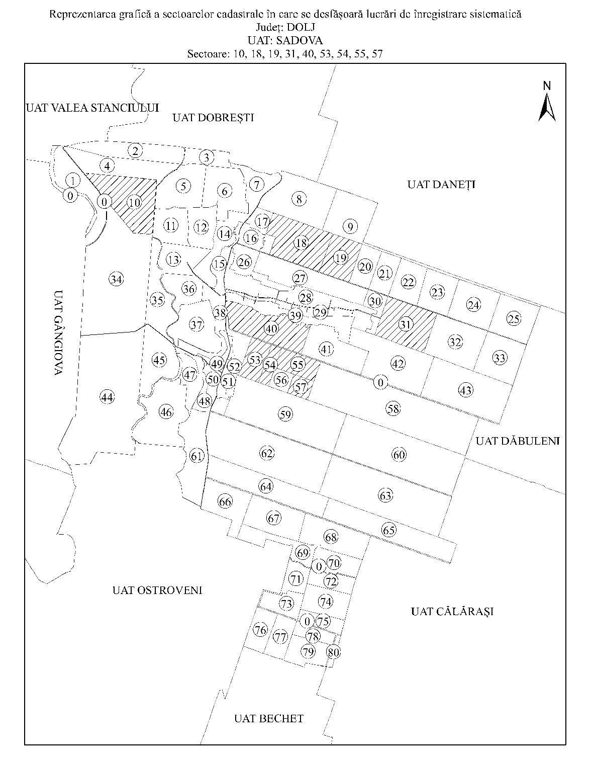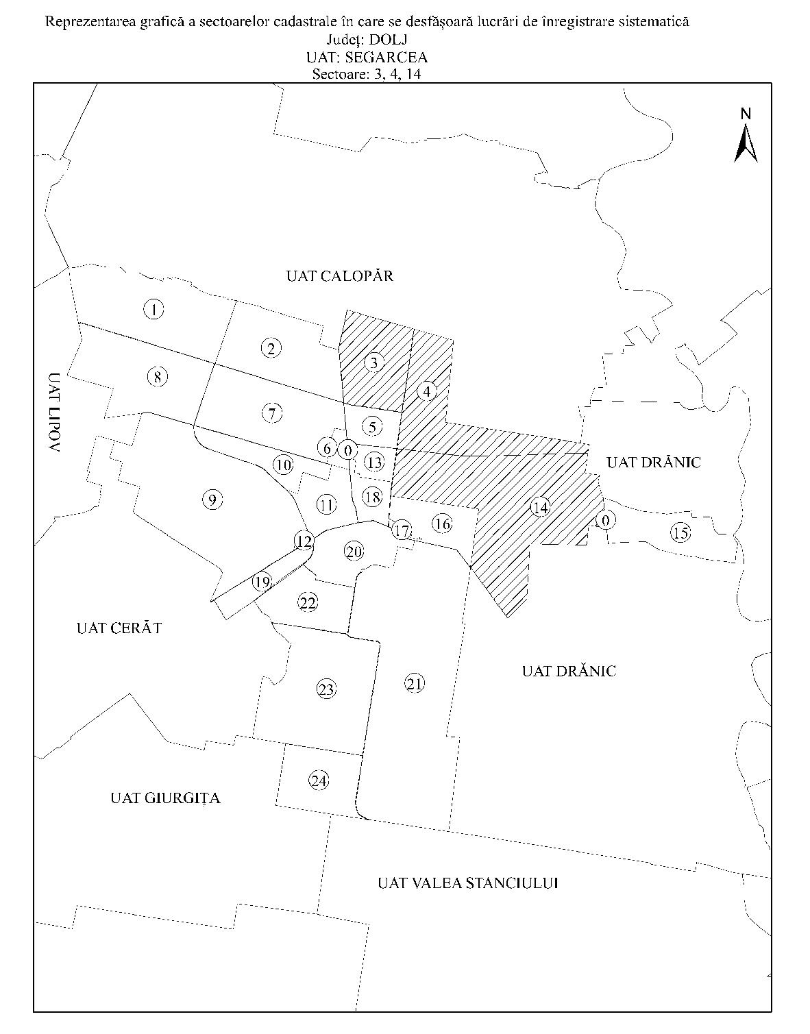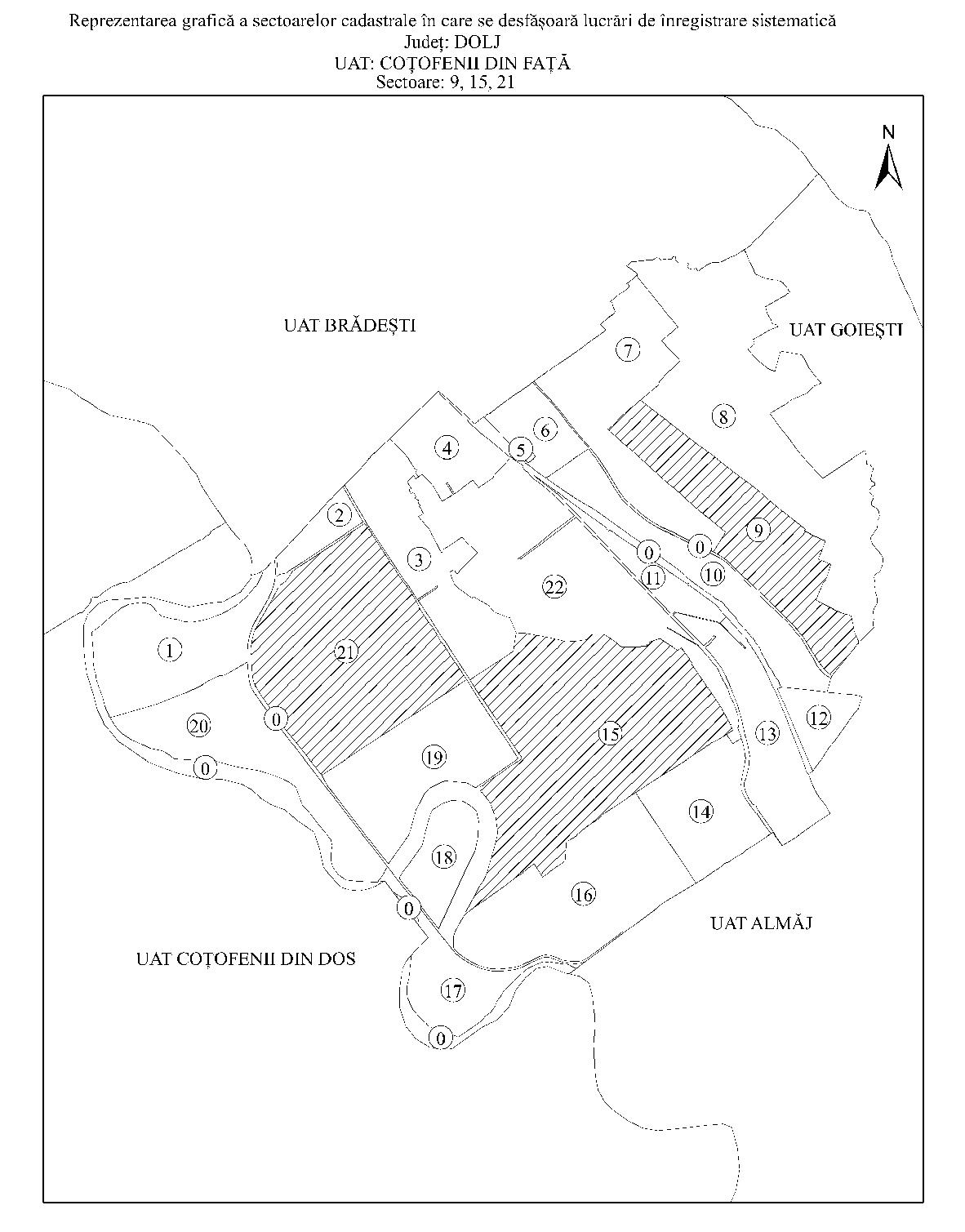 Având în vedere prevederile art. 11 alin. (1) din Legea cadastrului şi a publicităţii imobiliare nr. 7/1996, republicată, cu modificările şi completările ulterioare, şi ale art. 15 alin. (3) din Regulamentul de organizare şi funcţionare a Agenţiei Naţionale de Cadastru şi Publicitate Imobiliară, aprobat prin Hotărârea Guvernului nr. 1.288/2012, cu modificările şi completările ulterioare, în temeiul art. 3 alin. (13) din Legea cadastrului şi a publicităţii imobiliare nr. 7/1996, republicată, cu modificările şi completările ulterioare, directorul general al Agenţiei Naţionale de Cadastru şi Publicitate Imobiliară emite prezentul ordin. Articolul 1 Se aprobă începerea lucrărilor de înregistrare sistematică a imobilelor, pe sectoare cadastrale, situate pe teritoriul a 7 unităţi administrativ-teritoriale din judeţul Dolj, după cum urmează: a)unitatea administrativ-teritorială Coţofenii din Faţă - sectoarele cadastrale nr. 9, 15 şi 21; b)unitatea administrativ-teritorială Gighera - sectoarele cadastrale nr. 23, 24 şi 46; c)unitatea administrativ-teritorială Ostroveni - sectorul cadastral nr. 13; d)unitatea administrativ-teritorială Rast - sectoarele cadastrale nr. 5 şi 10; e)unitatea administrativ-teritorială Sadova - sectoarele cadastrale nr. 10, 18, 19, 31, 40, 53, 54, 55 şi 57; f)unitatea administrativ-teritorială Segarcea - sectoarele cadastrale nr. 3, 4 şi 14; g)unitatea administrativ-teritorială Teasc - sectoarele cadastrale nr. 8, 10, 11, 13 şi 14. Articolul 2 Reprezentarea grafică a sectoarelor cadastrale în care se desfăşoară lucrările de înregistrare sistematică a imobilelor este prevăzută în anexele nr. 1-7 la prezentul ordin. Articolul 3 Anexele nr. 1-7*) fac parte integrantă din prezentul ordin. *) Anexele nr. 1-7 sunt reproduse în facsimil. Articolul 4 Prezentul ordin se publică în Monitorul Oficial al României, Partea I. Directorul general al Agenţiei Naţionale de Cadastru şi Publicitate Imobiliară, Radu Codruţ Ştefănescu ANEXA Nr. 1 ANEXA Nr. 2 ANEXA Nr. 3 ANEXA Nr. 4 ANEXA Nr. 5 ANEXA Nr. 6 ANEXA Nr. 7