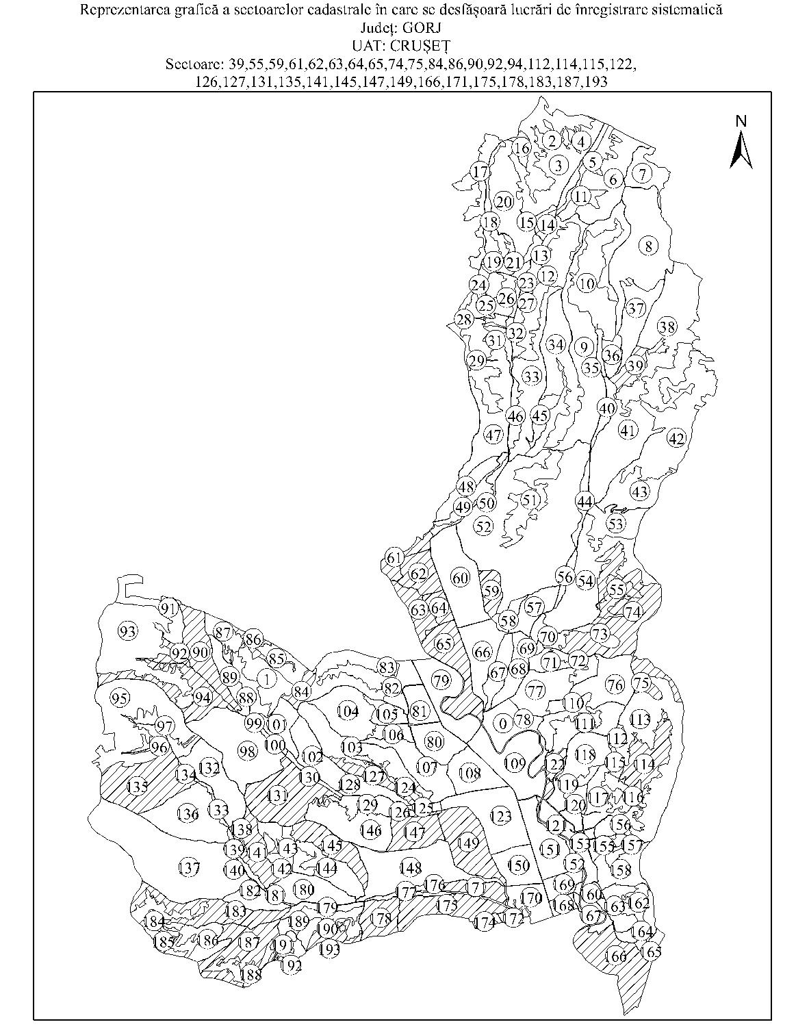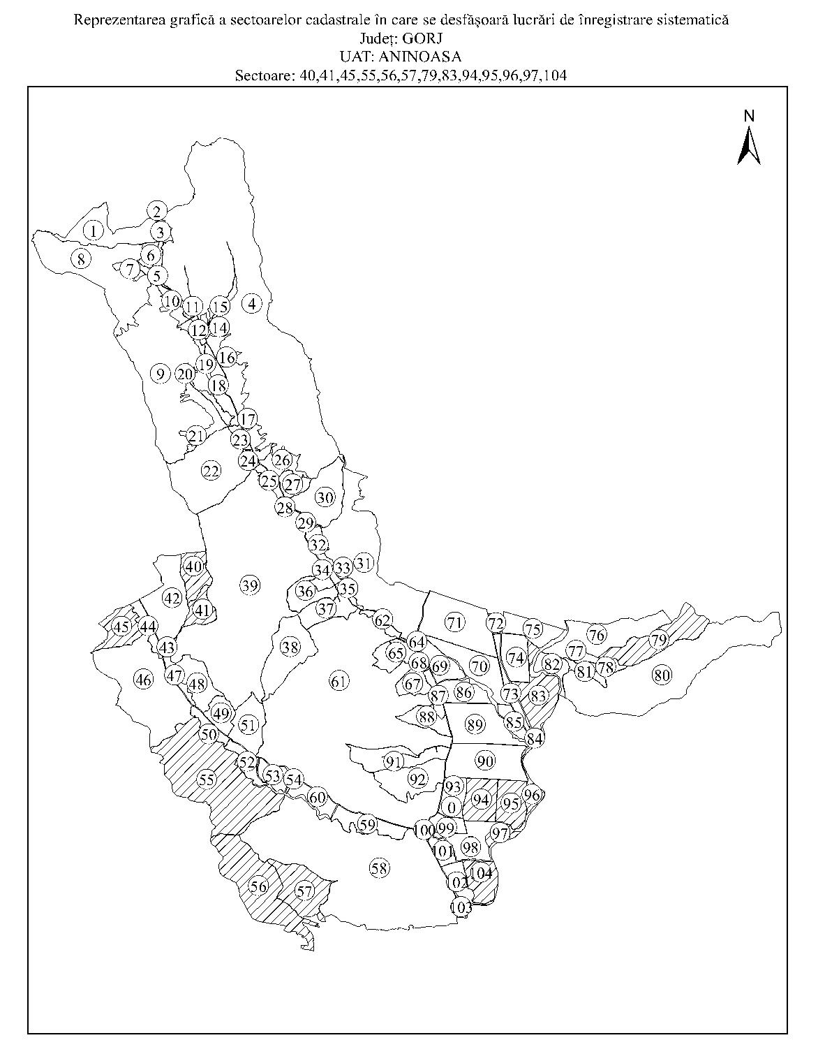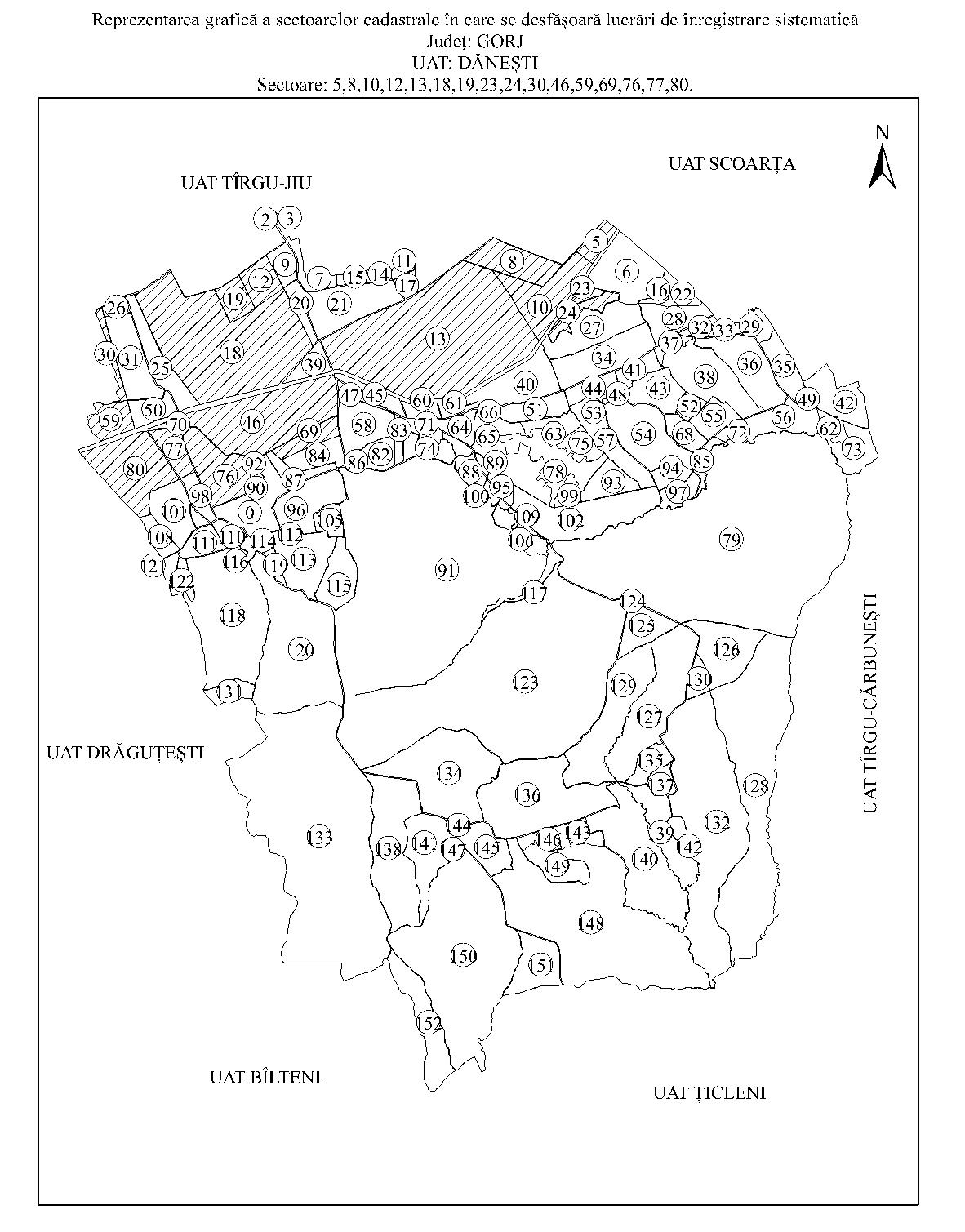 Având în vedere prevederile art. 11 alin. (1) din Legea cadastrului şi a publicităţii imobiliare nr. 7/1996, republicată, cu modificările şi completările ulterioare, şi ale art. 15 alin. (3) din Regulamentul de organizare şi funcţionare a Agenţiei Naţionale de Cadastru şi Publicitate Imobiliară, aprobat prin Hotărârea Guvernului nr. 1.288/2012, cu modificările şi completările ulterioare, în temeiul art. 3 alin. (13) din Legea cadastrului şi a publicităţii imobiliare nr. 7/1996, republicată, cu modificările şi completările ulterioare, directorul general al Agenţiei Naţionale de Cadastru şi Publicitate Imobiliară emite prezentul ordin. Articolul 1 Se aprobă începerea lucrărilor de înregistrare sistematică a imobilelor, pe sectoare cadastrale, situate pe teritoriul a 7 unităţi administrativ-teritoriale din judeţul Gorj, după cum urmează: a)unitatea administrativ-teritorială Albeni - sectoarele cadastrale nr. 5, 7 şi 46; b)unitatea administrativ-teritorială Aninoasa - sectoarele cadastrale nr. 40, 41, 45, 55, 56, 57, 79, 83, 94, 95, 96, 97 şi 104; c)unitatea administrativ-teritorială Bengeşti-Ciocadia - sectoarele cadastrale nr. 100, 118 şi 123; d)unitatea administrativ-teritorială Borăscu - sectoarele cadastrale nr. 12, 13, 14, 17, 18, 21, 22, 32, 33, 45, 53, 54, 55, 56, 57, 62, 64, 72, 78, 80, 89, 99 şi 123; e)unitatea administrativ-teritorială Cruşeţ - sectoarele cadastrale nr. 39, 55, 59, 61, 62, 63, 64, 65, 74, 75, 84, 86, 90, 92, 94, 112, 114, 115, 122, 126, 127, 131, 135, 141, 145, 147, 149, 166, 171, 175, 178, 183, 187 şi 193; f)unitatea administrativ-teritorială Dăneşti - sectoarele cadastrale nr. 5, 8, 10, 12, 13, 18, 19, 23, 24, 30, 46, 59, 69, 76, 77 şi 80; g)unitatea administrativ-teritorială Drăgoteşti - sectoarele cadastrale nr. 7, 8, 16, 18 şi 23. Articolul 2 Reprezentarea grafică a sectoarelor cadastrale în care se desfăşoară lucrările de înregistrare sistematică a imobilelor este prevăzută în anexele nr. 1-7 la prezentul ordin. Articolul 3 Anexele nr. 1-7*) fac parte integrantă din prezentul ordin. *) Anexele nr. 1-7 sunt reproduse în facsimil. Articolul 4 Prezentul ordin se publică în Monitorul Oficial al României, Partea I. Directorul general al Agenţiei Naţionale de Cadastru şi Publicitate Imobiliară, Radu Codruţ Ştefănescu ANEXA Nr. 1