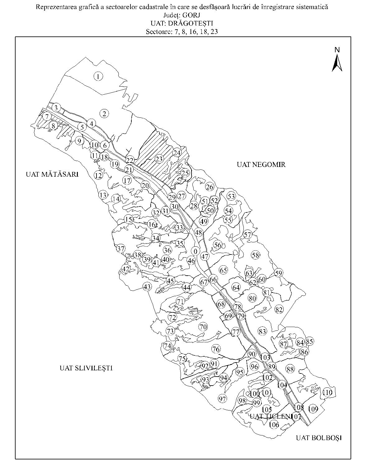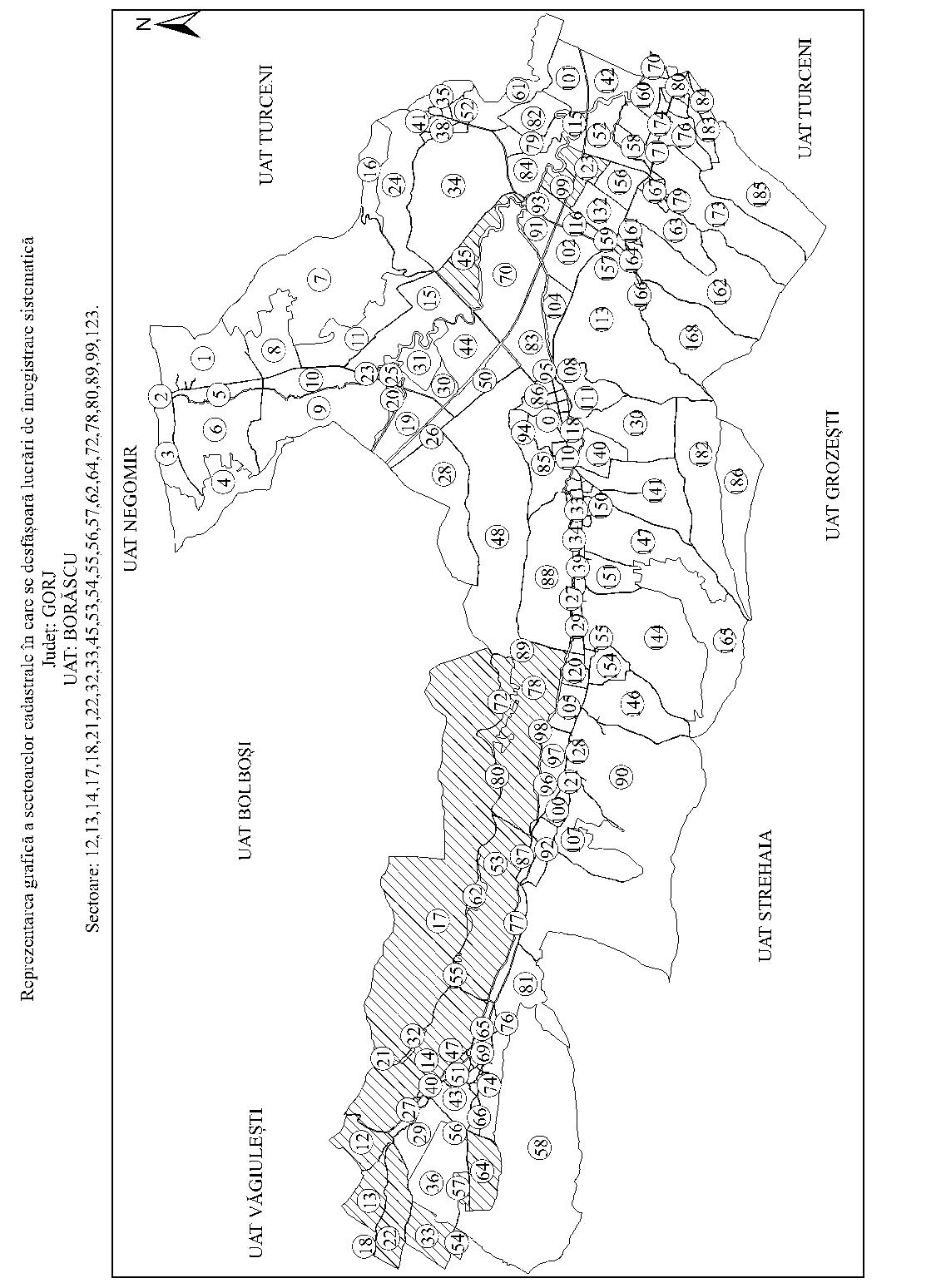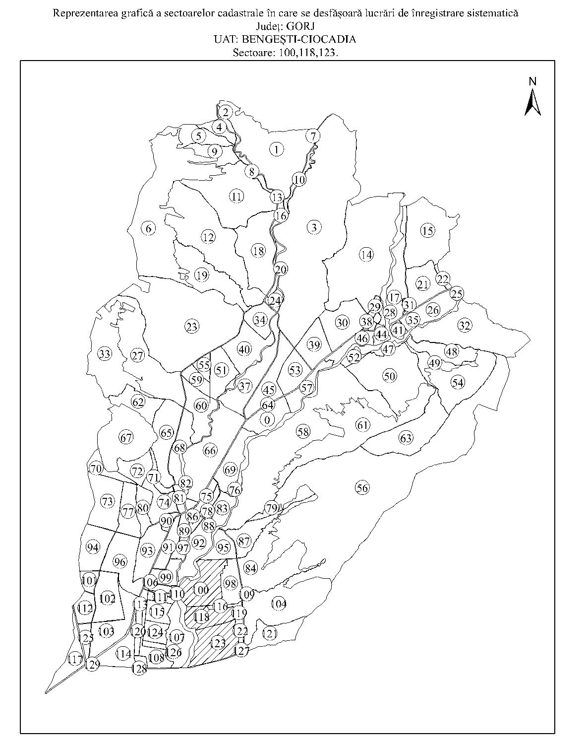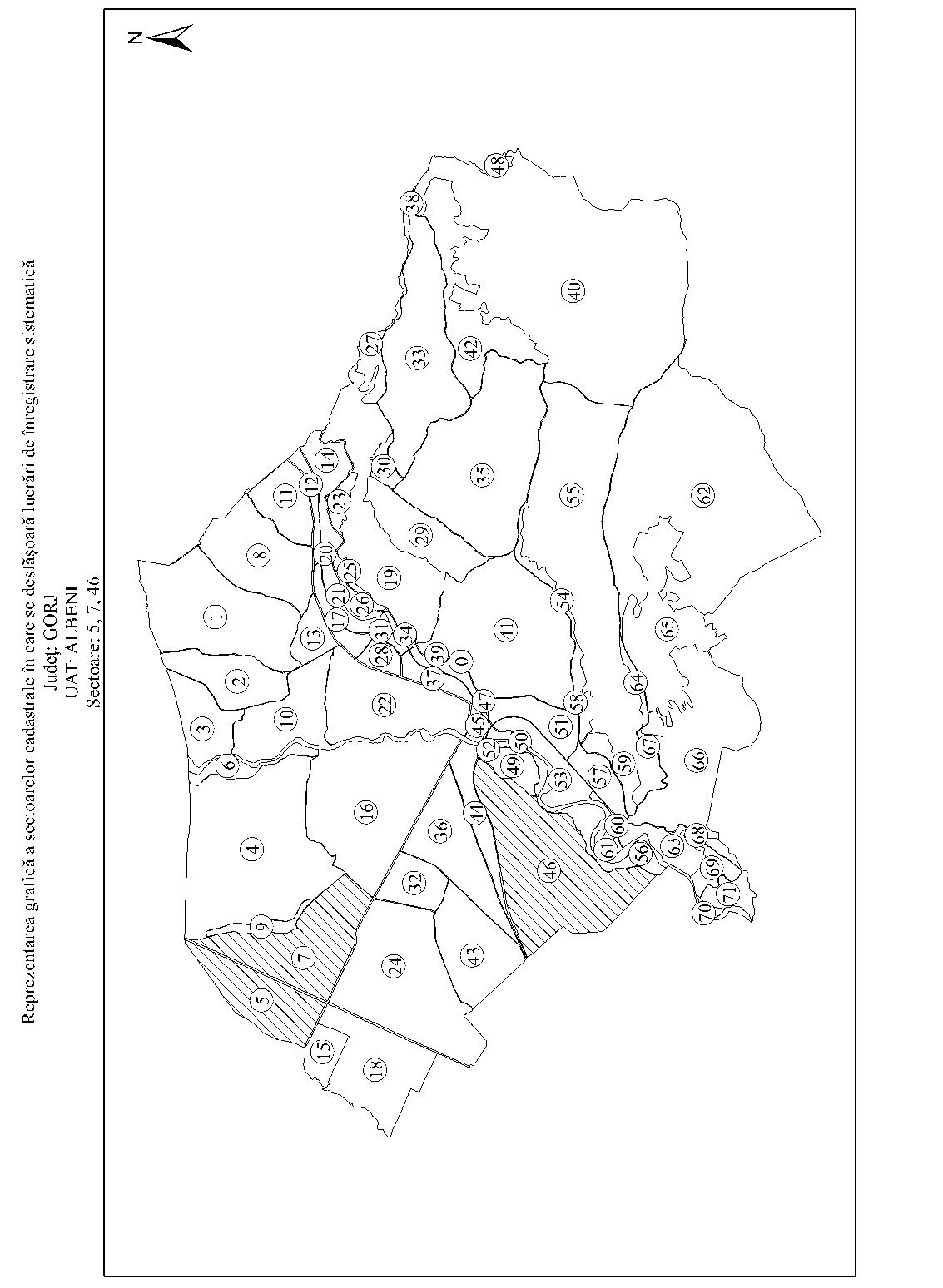 Având în vedere prevederile art. 11 alin. (1) din Legea cadastrului şi a publicităţii imobiliare nr. 7/1996, republicată, cu modificările şi completările ulterioare, şi ale art. 15 alin. (3) din Regulamentul de organizare şi funcţionare a Agenţiei Naţionale de Cadastru şi Publicitate Imobiliară, aprobat prin Hotărârea Guvernului nr. 1.288/2012, cu modificările şi completările ulterioare, în temeiul art. 3 alin. (13) din Legea cadastrului şi a publicităţii imobiliare nr. 7/1996, republicată, cu modificările şi completările ulterioare, directorul general al Agenţiei Naţionale de Cadastru şi Publicitate Imobiliară emite prezentul ordin. Articolul 1 Se aprobă începerea lucrărilor de înregistrare sistematică a imobilelor, pe sectoare cadastrale, situate pe teritoriul a 7 unităţi administrativ-teritoriale din judeţul Gorj, după cum urmează: a)unitatea administrativ-teritorială Albeni - sectoarele cadastrale nr. 5, 7 şi 46; b)unitatea administrativ-teritorială Aninoasa - sectoarele cadastrale nr. 40, 41, 45, 55, 56, 57, 79, 83, 94, 95, 96, 97 şi 104; c)unitatea administrativ-teritorială Bengeşti-Ciocadia - sectoarele cadastrale nr. 100, 118 şi 123; d)unitatea administrativ-teritorială Borăscu - sectoarele cadastrale nr. 12, 13, 14, 17, 18, 21, 22, 32, 33, 45, 53, 54, 55, 56, 57, 62, 64, 72, 78, 80, 89, 99 şi 123; e)unitatea administrativ-teritorială Cruşeţ - sectoarele cadastrale nr. 39, 55, 59, 61, 62, 63, 64, 65, 74, 75, 84, 86, 90, 92, 94, 112, 114, 115, 122, 126, 127, 131, 135, 141, 145, 147, 149, 166, 171, 175, 178, 183, 187 şi 193; f)unitatea administrativ-teritorială Dăneşti - sectoarele cadastrale nr. 5, 8, 10, 12, 13, 18, 19, 23, 24, 30, 46, 59, 69, 76, 77 şi 80; g)unitatea administrativ-teritorială Drăgoteşti - sectoarele cadastrale nr. 7, 8, 16, 18 şi 23. Articolul 2 Reprezentarea grafică a sectoarelor cadastrale în care se desfăşoară lucrările de înregistrare sistematică a imobilelor este prevăzută în anexele nr. 1-7 la prezentul ordin. Articolul 3 Anexele nr. 1-7*) fac parte integrantă din prezentul ordin. *) Anexele nr. 1-7 sunt reproduse în facsimil. Articolul 4 Prezentul ordin se publică în Monitorul Oficial al României, Partea I. Directorul general al Agenţiei Naţionale de Cadastru şi Publicitate Imobiliară, Radu Codruţ Ştefănescu ANEXA Nr. 1