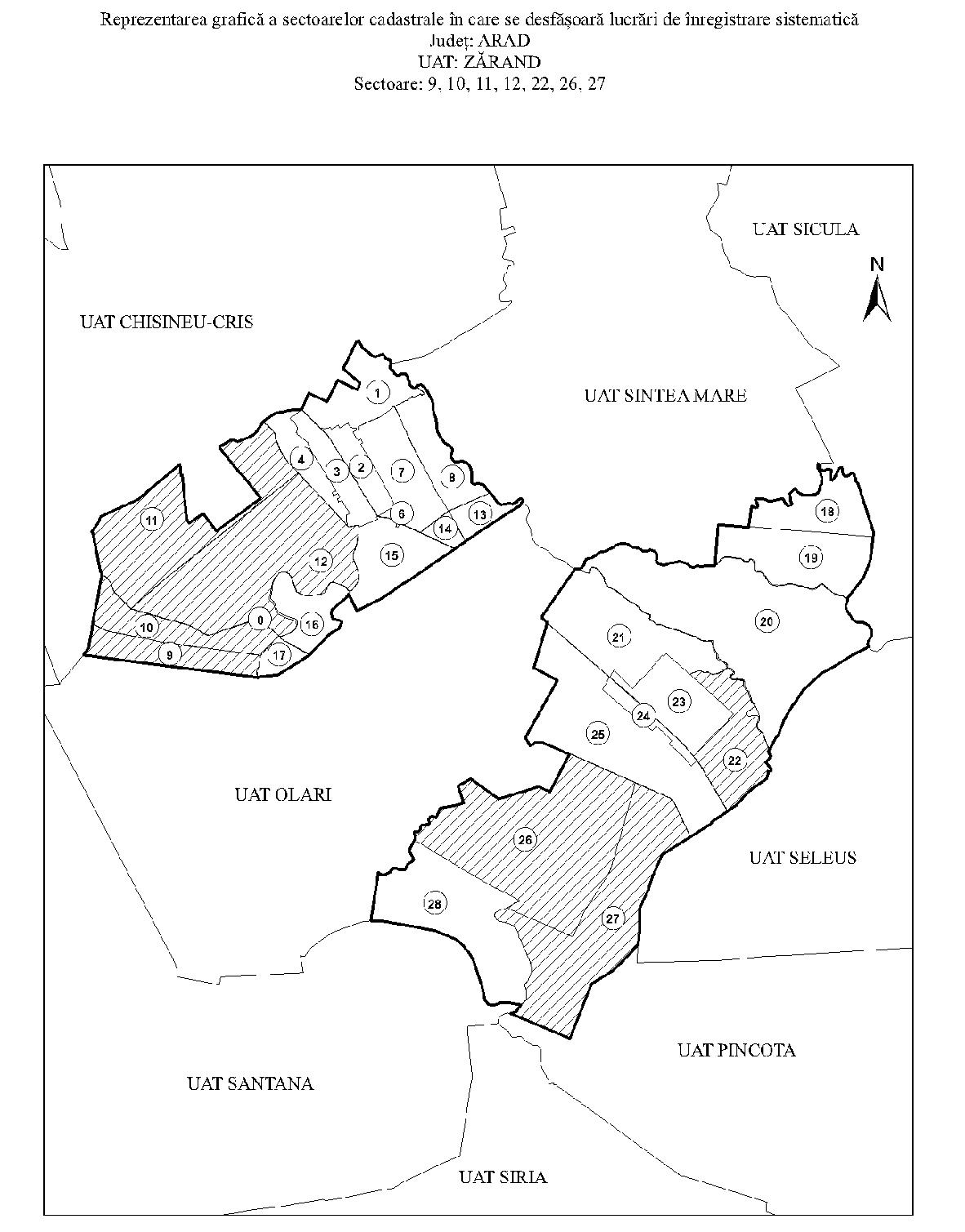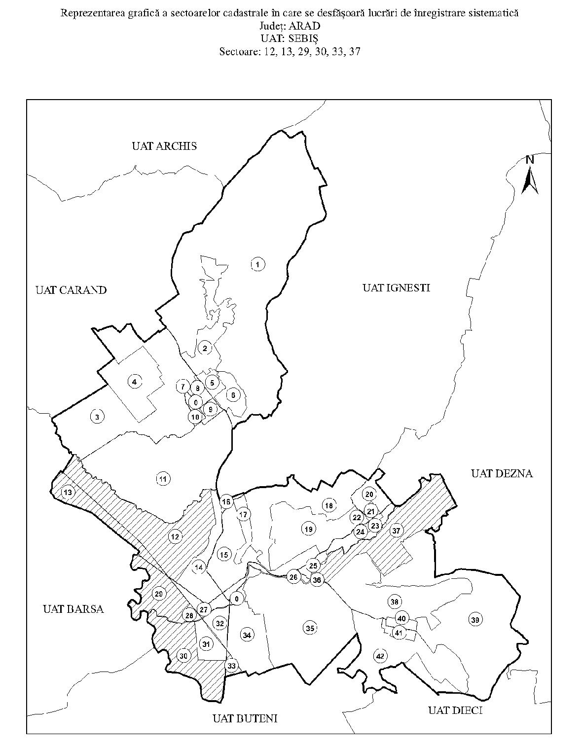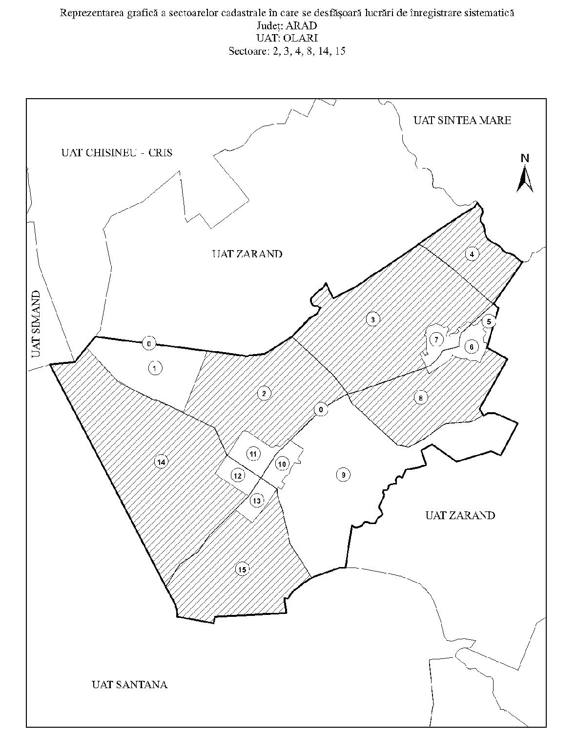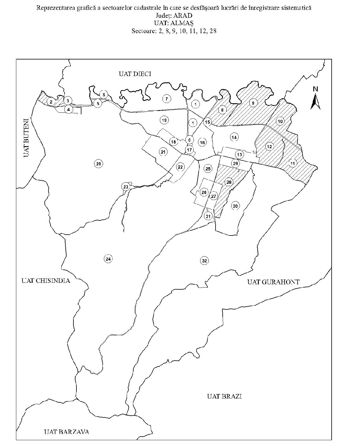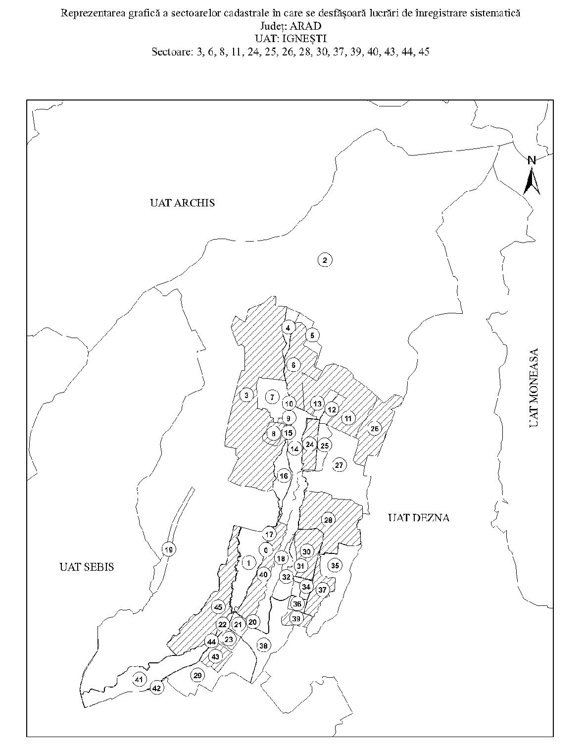 Având în vedere prevederile art. 11 alin. (1) din Legea cadastrului şi a publicităţii imobiliare nr. 7/1996, republicată, cu modificările şi completările ulterioare, şi ale art. 15 alin. (3) din Regulamentul de organizare şi funcţionare a Agenţiei Naţionale de Cadastru şi Publicitate Imobiliară, aprobat prin Hotărârea Guvernului nr. 1.288/2012, cu modificările şi completările ulterioare,în temeiul art. 3 alin. (13) din Legea cadastrului şi a publicităţii imobiliare nr. 7/1996, republicată, cu modificările şi completările ulterioare,directorul general al Agenţiei Naţionale de Cadastru şi Publicitate Imobiliară emite prezentul ordin. Articolul 1 Se aprobă începerea lucrărilor de înregistrare sistematică a imobilelor, pe sectoare cadastrale, situate pe teritoriul a 41 de unităţi administrativ-teritoriale din judeţul Arad, după cum urmează: a)unitatea administrativ-teritorială Almaş - sectoarele cadastrale nr. 2, 8, 9, 10, 11, 12 şi 28; b)unitatea administrativ-teritorială Apateu - sectoarele cadastrale nr. 6, 7, 8, 12, 15, 21, 24 şi 29; c)unitatea administrativ-teritorială Archiş - sectoarele cadastrale nr. 6, 7, 8, 9, 22, 36, 37 şi 40; d)unitatea administrativ-teritorială Beliu - sectoarele cadastrale nr. 1, 2, 3, 4, 5, 6 şi 7; e)unitatea administrativ-teritorială Bârzava - sectoarele cadastrale nr. 48, 52, 53, 54, 61 şi 65; f)unitatea administrativ-teritorială Brazii - sectoarele cadastrale nr. 1, 2, 16 şi 18; g)unitatea administrativ-teritorială Buteni - sectoarele cadastrale nr. 15, 18, 19, 30, 57, 58, 59, 60, 62, 63 şi 64; h)unitatea administrativ-teritorială Cărand - sectoarele cadastrale nr. 4, 5, 6, 7, 11, 12, 15, 21, 24, 28 şi 29; i)unitatea administrativ-teritorială Cermei - sectoarele cadastrale nr. 3, 8, 9, 12, 17, 20 şi 21; j)unitatea administrativ-teritorială Chişineu-Criş - sectoarele cadastrale nr. 4, 5, 17 şi 24; k)unitatea administrativ-teritorială Curtici - sectoarele cadastrale nr. 3, 4, 5, 6, 7, 11, 13, 14, 15 şi 16; l)unitatea administrativ-teritorială Dezna - sectoarele cadastrale nr. 15, 16, 17, 22, 23, 25, 40, 41 şi 70; m)unitatea administrativ-teritorială Dieci - sectoarele cadastrale nr. 6, 9 şi 13; n)unitatea administrativ-teritorială Felnac - sectoarele cadastrale nr. 1, 2, 3, 4, 9, 12 şi 13; o)unitatea administrativ-teritorială Grăniceri - sectoarele cadastrale nr. 1, 20 şi 21; p)unitatea administrativ-teritorială Gurahonţ - sectoarele cadastrale nr. 2, 3, 4, 5, 7, 9, 14, 15 şi 18; q)unitatea administrativ-teritorială Igneşti - sectoarele cadastrale nr. 3, 6, 8, 11, 24, 25, 26, 28, 30, 37, 39, 40, 43, 44 şi 45; r)unitatea administrativ-teritorială Ineu - sectoarele cadastrale nr. 5, 6 şi 8; s)unitatea administrativ-teritorială Iratoşu - sectoarele cadastrale nr. 4, 5, 9 şi 10; ş)unitatea administrativ-teritorială Lipova - sectoarele cadastrale nr. 7, 19, 20 şi 48; t)unitatea administrativ-teritorială Mişca - sectoarele cadastrale nr. 2, 3, 12, 15, 18, 41 şi 42; ţ)unitatea administrativ-teritorială Moneasa - sectoarele cadastrale nr. 19, 24, 29 şi 38; u)unitatea administrativ-teritorială Nădlac - sectoarele cadastrale nr. 11, 12, 14, 15 şi 40; v)unitatea administrativ-teritorială Olari - sectoarele cadastrale nr. 2, 3, 4, 8, 14 şi 15; w)unitatea administrativ-teritorială Păuliş - sectoarele cadastrale nr. 2, 7, 8, 25, 29 şi 35; x)unitatea administrativ-teritorială Pecica - sectoarele cadastrale nr. 4, 5, 21, 22, 23, 24, 25 şi 27; y)unitatea administrativ-teritorială Sântana - sectoarele cadastrale nr. 2, 3, 12, 16 şi 26; z)unitatea administrativ-teritorială Săvârşin - sectoarele cadastrale nr. 38, 39, 40, 41 şi 42;aa) unitatea administrativ-teritorială Sebiş - sectoarele cadastrale nr. 12, 13, 29, 30, 33 şi 37; bb) unitatea administrativ-teritorială Şeitin - sectoarele cadastrale nr. 3, 4, 6, 8, 15 şi 16; cc) unitatea administrativ-teritorială Şepreuş - sectoarele cadastrale nr. 9, 13, 14, 15, 16, 27, 30, 31, 46 şi 47; dd) unitatea administrativ-teritorială Şicula - sectoarele cadastrale nr. 10, 11, 12, 13 şi 14; ee) unitatea administrativ-teritorială Şilindia - sectoarele cadastrale nr. 2, 4, 5, 6, 10 şi 11; ff) unitatea administrativ-teritorială Şimand - sectoarele cadastrale nr. 4, 16, 18 şi 22; gg) unitatea administrativ-teritorială Sintea Mare - sectoarele cadastrale nr. 2, 7, 11 şi 12; hh) unitatea administrativ-teritorială Şiştarovăţ – sectoarele cadastrale nr. 1, 3, 5 şi 17; ii) unitatea administrativ-teritorială Socodor - sectoarele cadastrale nr. 5, 8, 9, 10, 12, 20, 21, 22, 25, 26, 27 şi 28; jj) unitatea administrativ-teritorială Vărădia de Mureş - sectoarele cadastrale nr. 50, 53, 54, 70, 72, 73 şi 74; kk) unitatea administrativ-teritorială Zăbrani - sectoarele cadastrale nr. 9, 10, 15, 18, 20, 25 şi 29; ll) unitatea administrativ-teritorială Zădăreni - sectoarele cadastrale nr. 20, 22 şi 27; mm) unitatea administrativ-teritorială Zărand - sectoarele cadastrale nr. 9, 10, 11, 12, 22, 26 şi 27. Articolul 2 Reprezentarea grafică a sectoarelor cadastrale în care se desfăşoară lucrările de înregistrare sistematică a imobilelor este prevăzută în anexele nr. 1-41 la prezentul ordin. Articolul 3 Anexele nr. 1-41*) fac parte integrantă din prezentul ordin. *) Anexele nr. 1-41 sunt reproduse în facsimil. Articolul 4 Prezentul ordin se publică în Monitorul Oficial al României, Partea I. Directorul general al Agenţiei Naţionale de Cadastru şi Publicitate Imobiliară,Radu Codruţ ŞtefănescuANEXA Nr. 1
