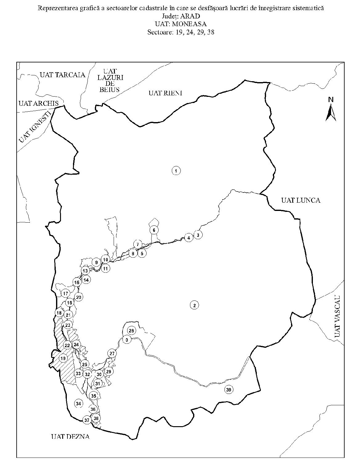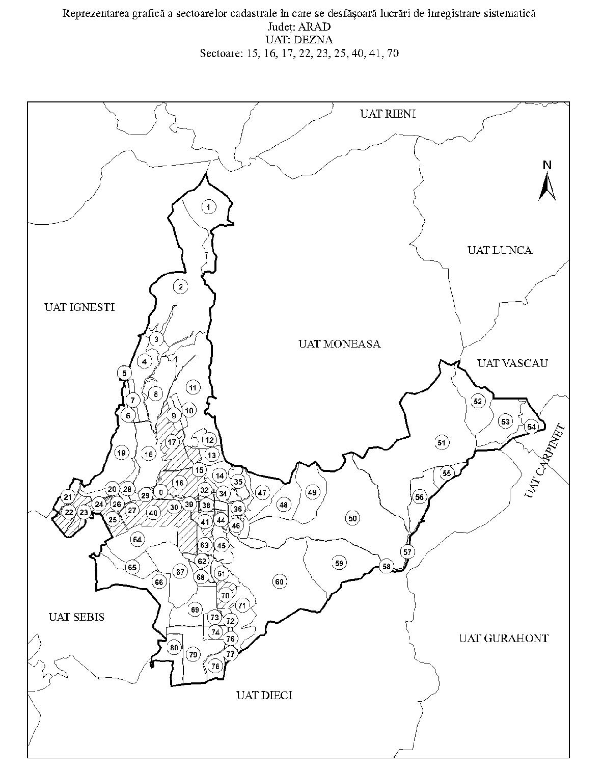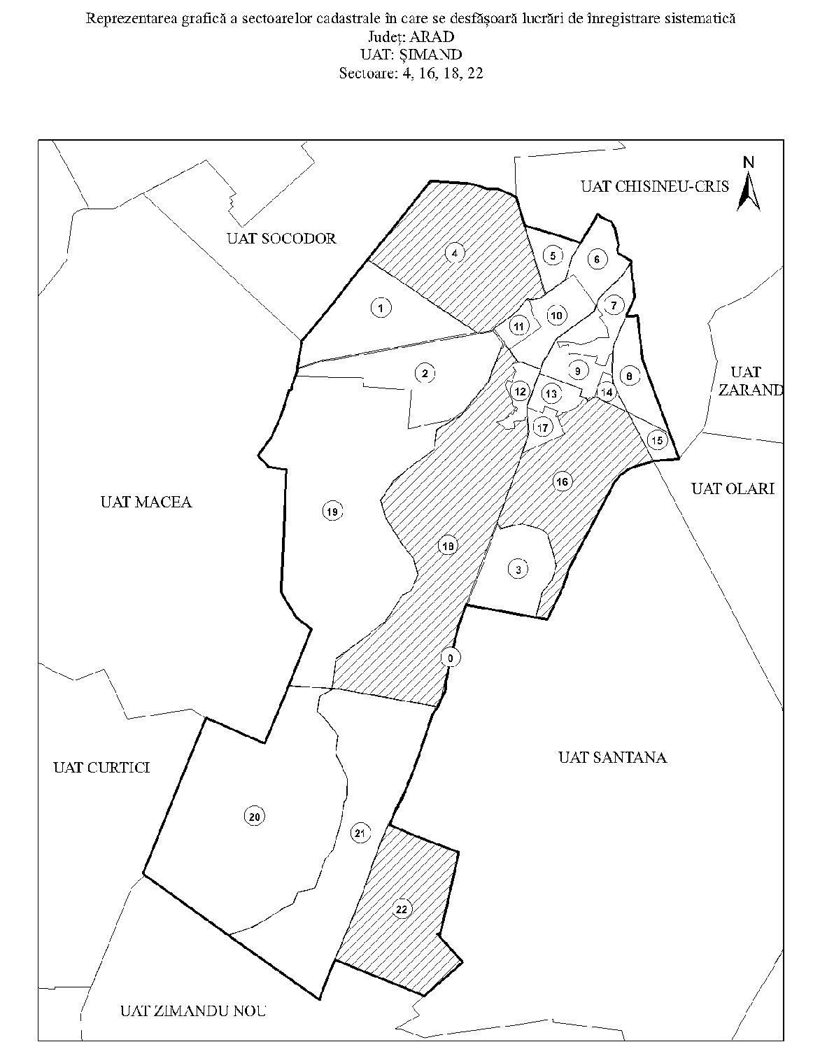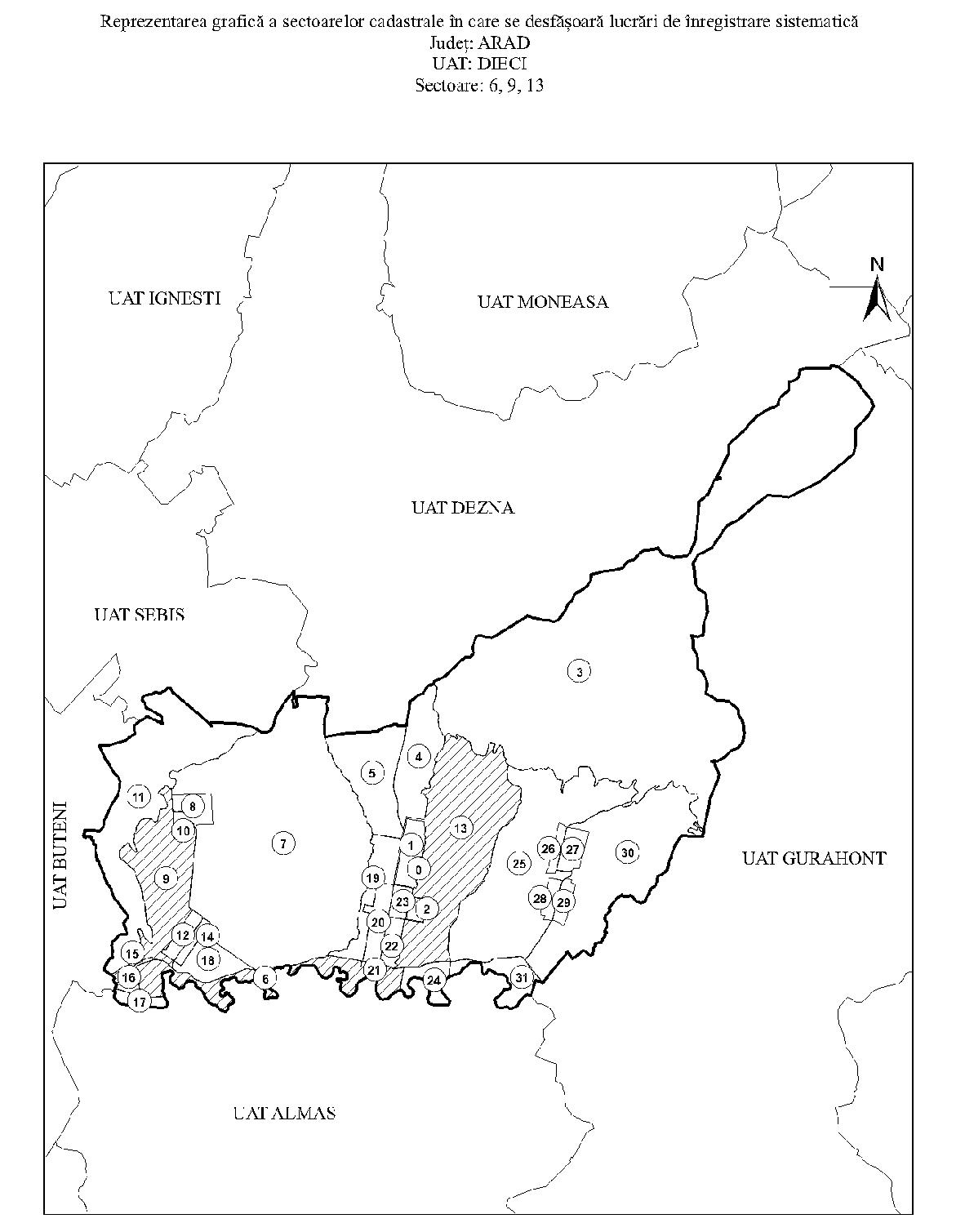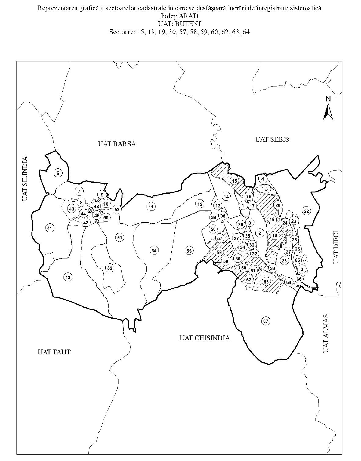 Având în vedere prevederile art. 11 alin. (1) din Legea cadastrului şi a publicităţii imobiliare nr. 7/1996, republicată, cu modificările şi completările ulterioare, şi ale art. 15 alin. (3) din Regulamentul de organizare şi funcţionare a Agenţiei Naţionale de Cadastru şi Publicitate Imobiliară, aprobat prin Hotărârea Guvernului nr. 1.288/2012, cu modificările şi completările ulterioare,în temeiul art. 3 alin. (13) din Legea cadastrului şi a publicităţii imobiliare nr. 7/1996, republicată, cu modificările şi completările ulterioare,directorul general al Agenţiei Naţionale de Cadastru şi Publicitate Imobiliară emite prezentul ordin. Articolul 1 Se aprobă începerea lucrărilor de înregistrare sistematică a imobilelor, pe sectoare cadastrale, situate pe teritoriul a 41 de unităţi administrativ-teritoriale din judeţul Arad, după cum urmează: a)unitatea administrativ-teritorială Almaş - sectoarele cadastrale nr. 2, 8, 9, 10, 11, 12 şi 28; b)unitatea administrativ-teritorială Apateu - sectoarele cadastrale nr. 6, 7, 8, 12, 15, 21, 24 şi 29; c)unitatea administrativ-teritorială Archiş - sectoarele cadastrale nr. 6, 7, 8, 9, 22, 36, 37 şi 40; d)unitatea administrativ-teritorială Beliu - sectoarele cadastrale nr. 1, 2, 3, 4, 5, 6 şi 7; e)unitatea administrativ-teritorială Bârzava - sectoarele cadastrale nr. 48, 52, 53, 54, 61 şi 65; f)unitatea administrativ-teritorială Brazii - sectoarele cadastrale nr. 1, 2, 16 şi 18; g)unitatea administrativ-teritorială Buteni - sectoarele cadastrale nr. 15, 18, 19, 30, 57, 58, 59, 60, 62, 63 şi 64; h)unitatea administrativ-teritorială Cărand - sectoarele cadastrale nr. 4, 5, 6, 7, 11, 12, 15, 21, 24, 28 şi 29; i)unitatea administrativ-teritorială Cermei - sectoarele cadastrale nr. 3, 8, 9, 12, 17, 20 şi 21; j)unitatea administrativ-teritorială Chişineu-Criş - sectoarele cadastrale nr. 4, 5, 17 şi 24; k)unitatea administrativ-teritorială Curtici - sectoarele cadastrale nr. 3, 4, 5, 6, 7, 11, 13, 14, 15 şi 16; l)unitatea administrativ-teritorială Dezna - sectoarele cadastrale nr. 15, 16, 17, 22, 23, 25, 40, 41 şi 70; m)unitatea administrativ-teritorială Dieci - sectoarele cadastrale nr. 6, 9 şi 13; n)unitatea administrativ-teritorială Felnac - sectoarele cadastrale nr. 1, 2, 3, 4, 9, 12 şi 13; o)unitatea administrativ-teritorială Grăniceri - sectoarele cadastrale nr. 1, 20 şi 21; p)unitatea administrativ-teritorială Gurahonţ - sectoarele cadastrale nr. 2, 3, 4, 5, 7, 9, 14, 15 şi 18; q)unitatea administrativ-teritorială Igneşti - sectoarele cadastrale nr. 3, 6, 8, 11, 24, 25, 26, 28, 30, 37, 39, 40, 43, 44 şi 45; r)unitatea administrativ-teritorială Ineu - sectoarele cadastrale nr. 5, 6 şi 8; s)unitatea administrativ-teritorială Iratoşu - sectoarele cadastrale nr. 4, 5, 9 şi 10; ş)unitatea administrativ-teritorială Lipova - sectoarele cadastrale nr. 7, 19, 20 şi 48; t)unitatea administrativ-teritorială Mişca - sectoarele cadastrale nr. 2, 3, 12, 15, 18, 41 şi 42; ţ)unitatea administrativ-teritorială Moneasa - sectoarele cadastrale nr. 19, 24, 29 şi 38; u)unitatea administrativ-teritorială Nădlac - sectoarele cadastrale nr. 11, 12, 14, 15 şi 40; v)unitatea administrativ-teritorială Olari - sectoarele cadastrale nr. 2, 3, 4, 8, 14 şi 15; w)unitatea administrativ-teritorială Păuliş - sectoarele cadastrale nr. 2, 7, 8, 25, 29 şi 35; x)unitatea administrativ-teritorială Pecica - sectoarele cadastrale nr. 4, 5, 21, 22, 23, 24, 25 şi 27; y)unitatea administrativ-teritorială Sântana - sectoarele cadastrale nr. 2, 3, 12, 16 şi 26; z)unitatea administrativ-teritorială Săvârşin - sectoarele cadastrale nr. 38, 39, 40, 41 şi 42;aa) unitatea administrativ-teritorială Sebiş - sectoarele cadastrale nr. 12, 13, 29, 30, 33 şi 37; bb) unitatea administrativ-teritorială Şeitin - sectoarele cadastrale nr. 3, 4, 6, 8, 15 şi 16; cc) unitatea administrativ-teritorială Şepreuş - sectoarele cadastrale nr. 9, 13, 14, 15, 16, 27, 30, 31, 46 şi 47; dd) unitatea administrativ-teritorială Şicula - sectoarele cadastrale nr. 10, 11, 12, 13 şi 14; ee) unitatea administrativ-teritorială Şilindia - sectoarele cadastrale nr. 2, 4, 5, 6, 10 şi 11; ff) unitatea administrativ-teritorială Şimand - sectoarele cadastrale nr. 4, 16, 18 şi 22; gg) unitatea administrativ-teritorială Sintea Mare - sectoarele cadastrale nr. 2, 7, 11 şi 12; hh) unitatea administrativ-teritorială Şiştarovăţ – sectoarele cadastrale nr. 1, 3, 5 şi 17; ii) unitatea administrativ-teritorială Socodor - sectoarele cadastrale nr. 5, 8, 9, 10, 12, 20, 21, 22, 25, 26, 27 şi 28; jj) unitatea administrativ-teritorială Vărădia de Mureş - sectoarele cadastrale nr. 50, 53, 54, 70, 72, 73 şi 74; kk) unitatea administrativ-teritorială Zăbrani - sectoarele cadastrale nr. 9, 10, 15, 18, 20, 25 şi 29; ll) unitatea administrativ-teritorială Zădăreni - sectoarele cadastrale nr. 20, 22 şi 27; mm) unitatea administrativ-teritorială Zărand - sectoarele cadastrale nr. 9, 10, 11, 12, 22, 26 şi 27. Articolul 2 Reprezentarea grafică a sectoarelor cadastrale în care se desfăşoară lucrările de înregistrare sistematică a imobilelor este prevăzută în anexele nr. 1-41 la prezentul ordin. Articolul 3 Anexele nr. 1-41*) fac parte integrantă din prezentul ordin. *) Anexele nr. 1-41 sunt reproduse în facsimil. Articolul 4 Prezentul ordin se publică în Monitorul Oficial al României, Partea I. Directorul general al Agenţiei Naţionale de Cadastru şi Publicitate Imobiliară,Radu Codruţ ŞtefănescuANEXA Nr. 1