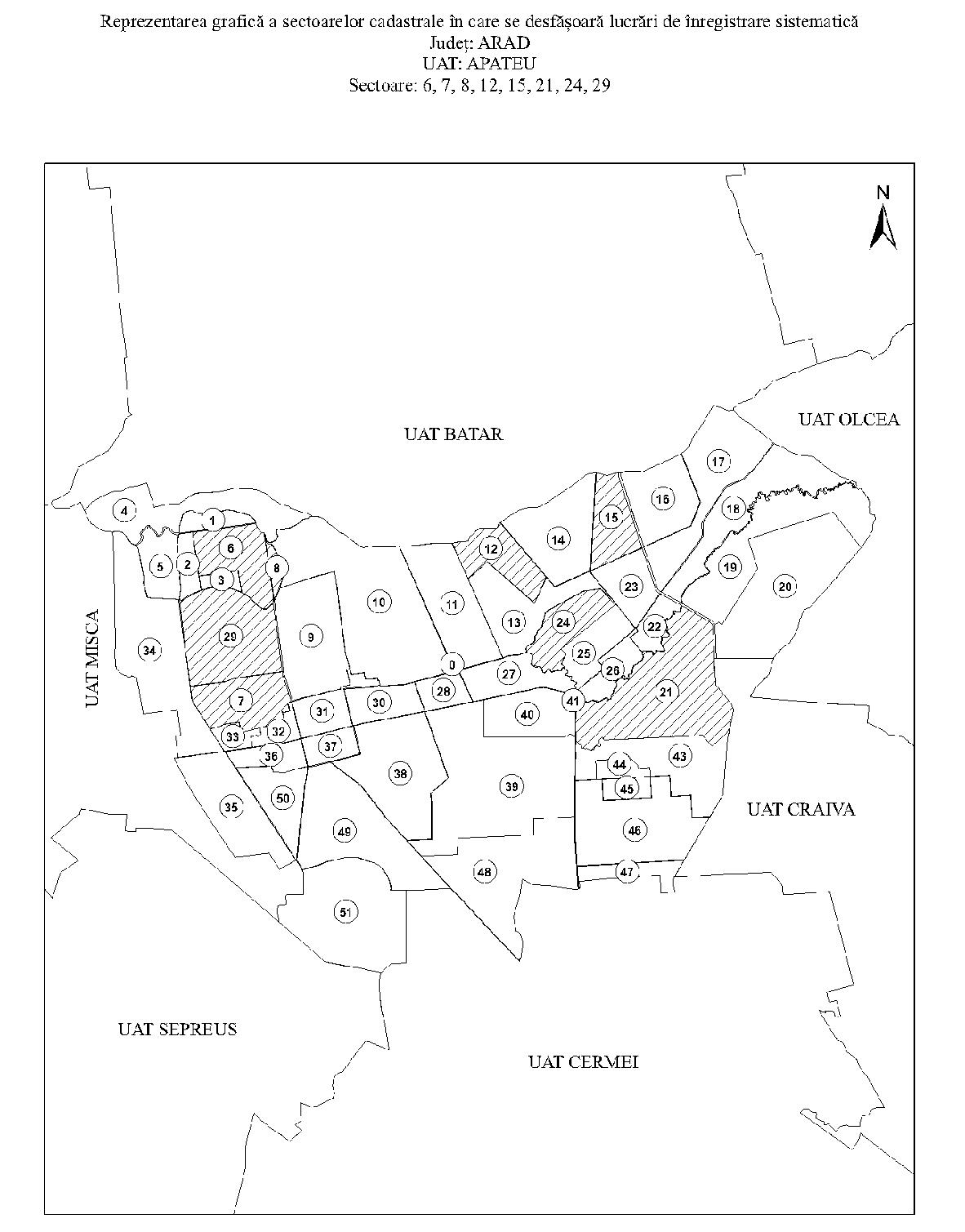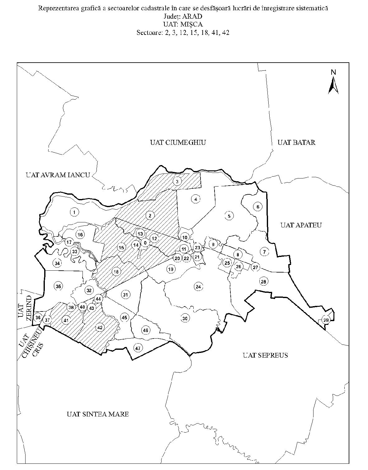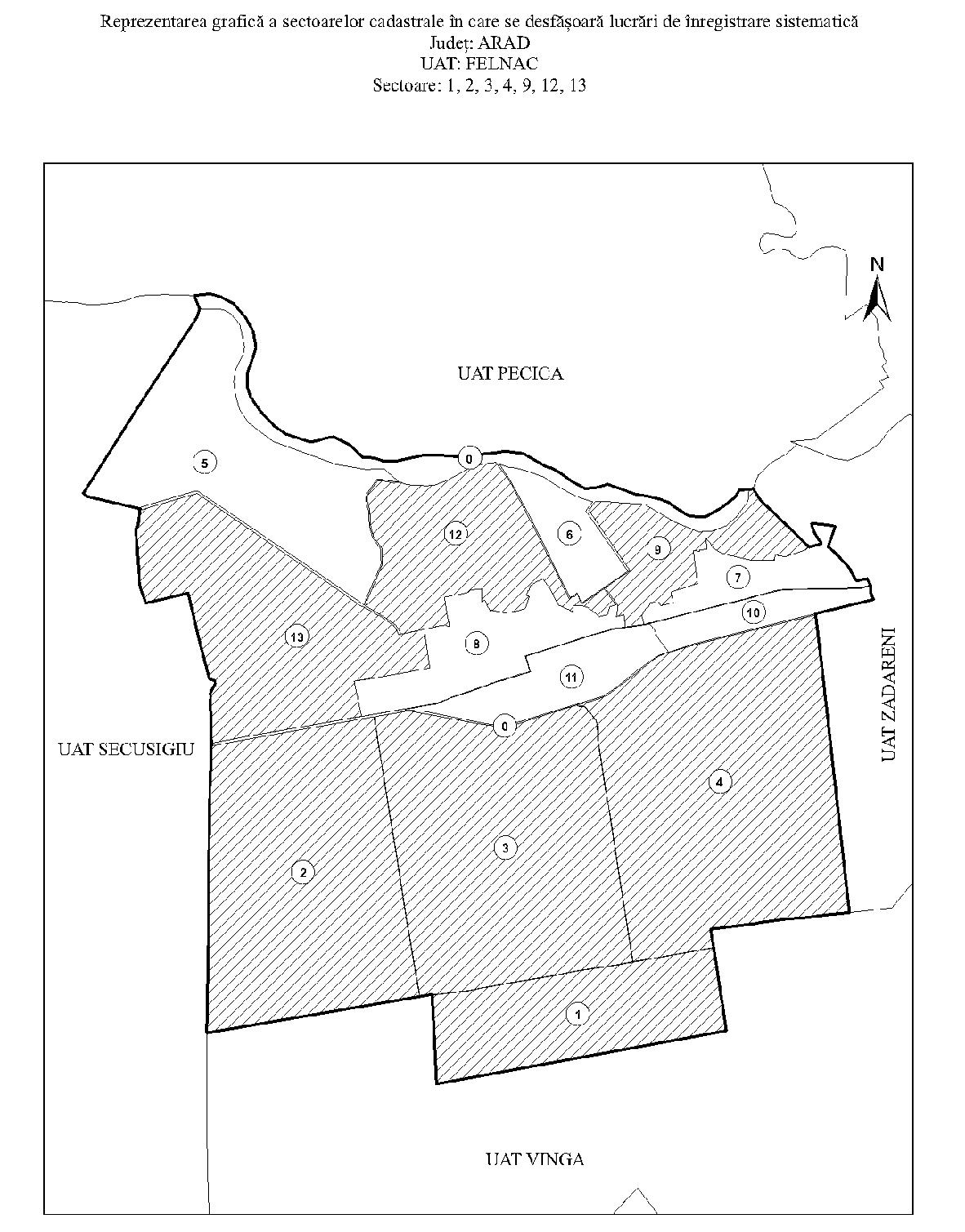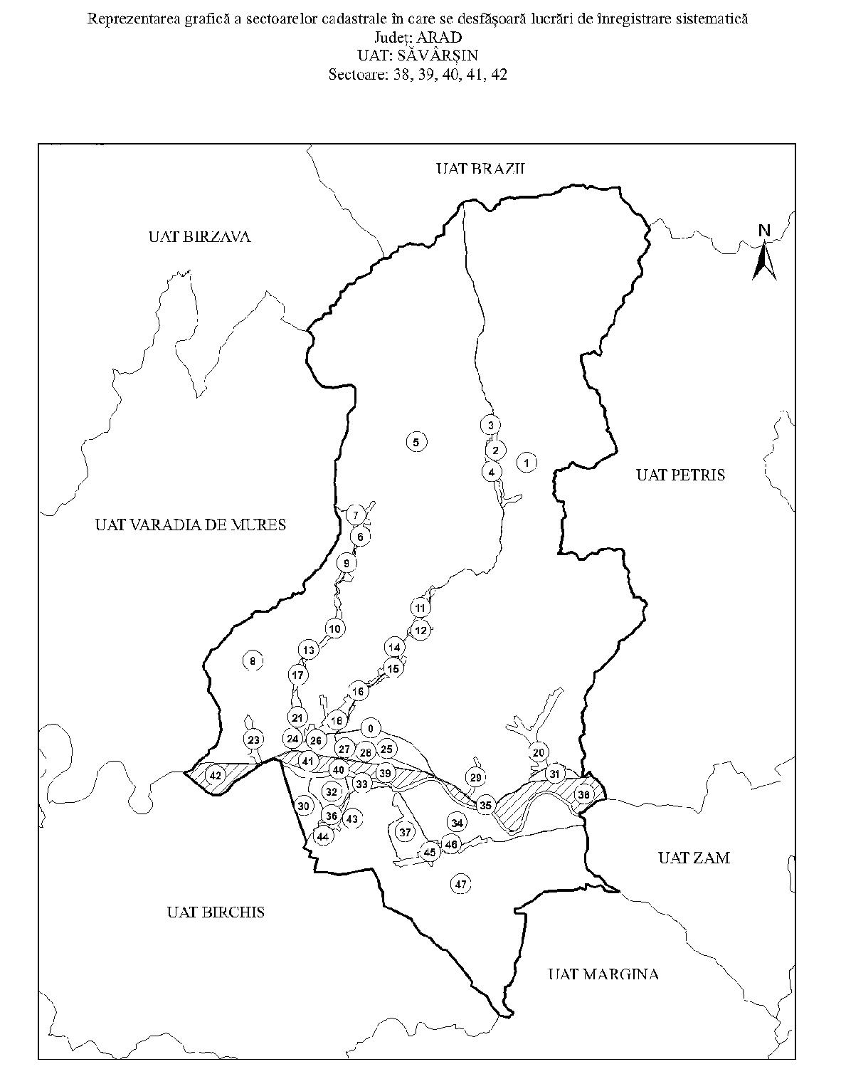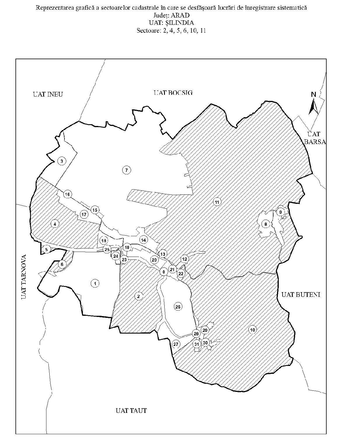 Având în vedere prevederile art. 11 alin. (1) din Legea cadastrului şi a publicităţii imobiliare nr. 7/1996, republicată, cu modificările şi completările ulterioare, şi ale art. 15 alin. (3) din Regulamentul de organizare şi funcţionare a Agenţiei Naţionale de Cadastru şi Publicitate Imobiliară, aprobat prin Hotărârea Guvernului nr. 1.288/2012, cu modificările şi completările ulterioare,în temeiul art. 3 alin. (13) din Legea cadastrului şi a publicităţii imobiliare nr. 7/1996, republicată, cu modificările şi completările ulterioare,directorul general al Agenţiei Naţionale de Cadastru şi Publicitate Imobiliară emite prezentul ordin. Articolul 1 Se aprobă începerea lucrărilor de înregistrare sistematică a imobilelor, pe sectoare cadastrale, situate pe teritoriul a 41 de unităţi administrativ-teritoriale din judeţul Arad, după cum urmează: a)unitatea administrativ-teritorială Almaş - sectoarele cadastrale nr. 2, 8, 9, 10, 11, 12 şi 28; b)unitatea administrativ-teritorială Apateu - sectoarele cadastrale nr. 6, 7, 8, 12, 15, 21, 24 şi 29; c)unitatea administrativ-teritorială Archiş - sectoarele cadastrale nr. 6, 7, 8, 9, 22, 36, 37 şi 40; d)unitatea administrativ-teritorială Beliu - sectoarele cadastrale nr. 1, 2, 3, 4, 5, 6 şi 7; e)unitatea administrativ-teritorială Bârzava - sectoarele cadastrale nr. 48, 52, 53, 54, 61 şi 65; f)unitatea administrativ-teritorială Brazii - sectoarele cadastrale nr. 1, 2, 16 şi 18; g)unitatea administrativ-teritorială Buteni - sectoarele cadastrale nr. 15, 18, 19, 30, 57, 58, 59, 60, 62, 63 şi 64; h)unitatea administrativ-teritorială Cărand - sectoarele cadastrale nr. 4, 5, 6, 7, 11, 12, 15, 21, 24, 28 şi 29; i)unitatea administrativ-teritorială Cermei - sectoarele cadastrale nr. 3, 8, 9, 12, 17, 20 şi 21; j)unitatea administrativ-teritorială Chişineu-Criş - sectoarele cadastrale nr. 4, 5, 17 şi 24; k)unitatea administrativ-teritorială Curtici - sectoarele cadastrale nr. 3, 4, 5, 6, 7, 11, 13, 14, 15 şi 16; l)unitatea administrativ-teritorială Dezna - sectoarele cadastrale nr. 15, 16, 17, 22, 23, 25, 40, 41 şi 70; m)unitatea administrativ-teritorială Dieci - sectoarele cadastrale nr. 6, 9 şi 13; n)unitatea administrativ-teritorială Felnac - sectoarele cadastrale nr. 1, 2, 3, 4, 9, 12 şi 13; o)unitatea administrativ-teritorială Grăniceri - sectoarele cadastrale nr. 1, 20 şi 21; p)unitatea administrativ-teritorială Gurahonţ - sectoarele cadastrale nr. 2, 3, 4, 5, 7, 9, 14, 15 şi 18; q)unitatea administrativ-teritorială Igneşti - sectoarele cadastrale nr. 3, 6, 8, 11, 24, 25, 26, 28, 30, 37, 39, 40, 43, 44 şi 45; r)unitatea administrativ-teritorială Ineu - sectoarele cadastrale nr. 5, 6 şi 8; s)unitatea administrativ-teritorială Iratoşu - sectoarele cadastrale nr. 4, 5, 9 şi 10; ş)unitatea administrativ-teritorială Lipova - sectoarele cadastrale nr. 7, 19, 20 şi 48; t)unitatea administrativ-teritorială Mişca - sectoarele cadastrale nr. 2, 3, 12, 15, 18, 41 şi 42; ţ)unitatea administrativ-teritorială Moneasa - sectoarele cadastrale nr. 19, 24, 29 şi 38; u)unitatea administrativ-teritorială Nădlac - sectoarele cadastrale nr. 11, 12, 14, 15 şi 40; v)unitatea administrativ-teritorială Olari - sectoarele cadastrale nr. 2, 3, 4, 8, 14 şi 15; w)unitatea administrativ-teritorială Păuliş - sectoarele cadastrale nr. 2, 7, 8, 25, 29 şi 35; x)unitatea administrativ-teritorială Pecica - sectoarele cadastrale nr. 4, 5, 21, 22, 23, 24, 25 şi 27; y)unitatea administrativ-teritorială Sântana - sectoarele cadastrale nr. 2, 3, 12, 16 şi 26; z)unitatea administrativ-teritorială Săvârşin - sectoarele cadastrale nr. 38, 39, 40, 41 şi 42;aa) unitatea administrativ-teritorială Sebiş - sectoarele cadastrale nr. 12, 13, 29, 30, 33 şi 37; bb) unitatea administrativ-teritorială Şeitin - sectoarele cadastrale nr. 3, 4, 6, 8, 15 şi 16; cc) unitatea administrativ-teritorială Şepreuş - sectoarele cadastrale nr. 9, 13, 14, 15, 16, 27, 30, 31, 46 şi 47; dd) unitatea administrativ-teritorială Şicula - sectoarele cadastrale nr. 10, 11, 12, 13 şi 14; ee) unitatea administrativ-teritorială Şilindia - sectoarele cadastrale nr. 2, 4, 5, 6, 10 şi 11; ff) unitatea administrativ-teritorială Şimand - sectoarele cadastrale nr. 4, 16, 18 şi 22; gg) unitatea administrativ-teritorială Sintea Mare - sectoarele cadastrale nr. 2, 7, 11 şi 12; hh) unitatea administrativ-teritorială Şiştarovăţ – sectoarele cadastrale nr. 1, 3, 5 şi 17; ii) unitatea administrativ-teritorială Socodor - sectoarele cadastrale nr. 5, 8, 9, 10, 12, 20, 21, 22, 25, 26, 27 şi 28; jj) unitatea administrativ-teritorială Vărădia de Mureş - sectoarele cadastrale nr. 50, 53, 54, 70, 72, 73 şi 74; kk) unitatea administrativ-teritorială Zăbrani - sectoarele cadastrale nr. 9, 10, 15, 18, 20, 25 şi 29; ll) unitatea administrativ-teritorială Zădăreni - sectoarele cadastrale nr. 20, 22 şi 27; mm) unitatea administrativ-teritorială Zărand - sectoarele cadastrale nr. 9, 10, 11, 12, 22, 26 şi 27. Articolul 2 Reprezentarea grafică a sectoarelor cadastrale în care se desfăşoară lucrările de înregistrare sistematică a imobilelor este prevăzută în anexele nr. 1-41 la prezentul ordin. Articolul 3 Anexele nr. 1-41*) fac parte integrantă din prezentul ordin. *) Anexele nr. 1-41 sunt reproduse în facsimil. Articolul 4 Prezentul ordin se publică în Monitorul Oficial al României, Partea I. Directorul general al Agenţiei Naţionale de Cadastru şi Publicitate Imobiliară,Radu Codruţ ŞtefănescuANEXA Nr. 1