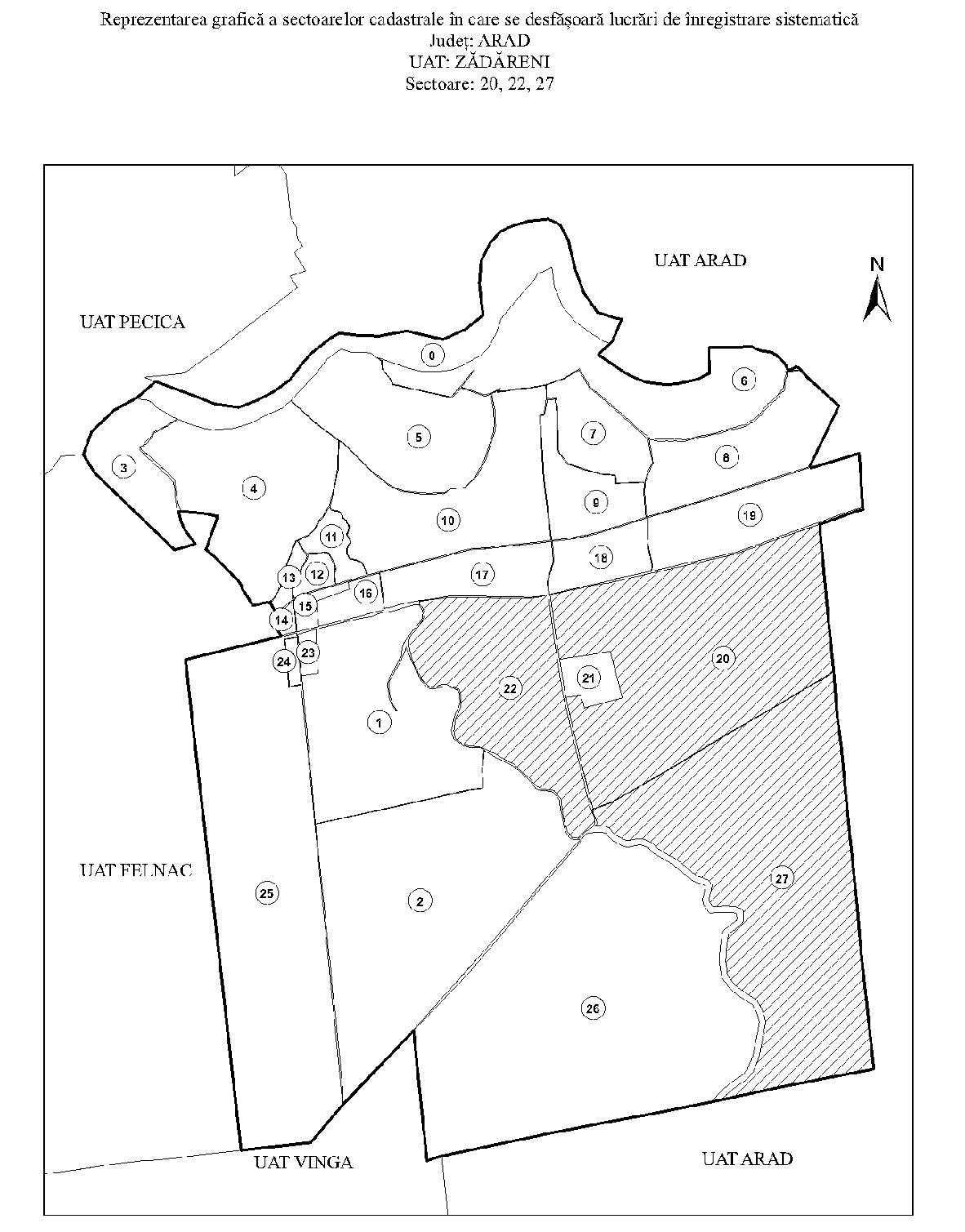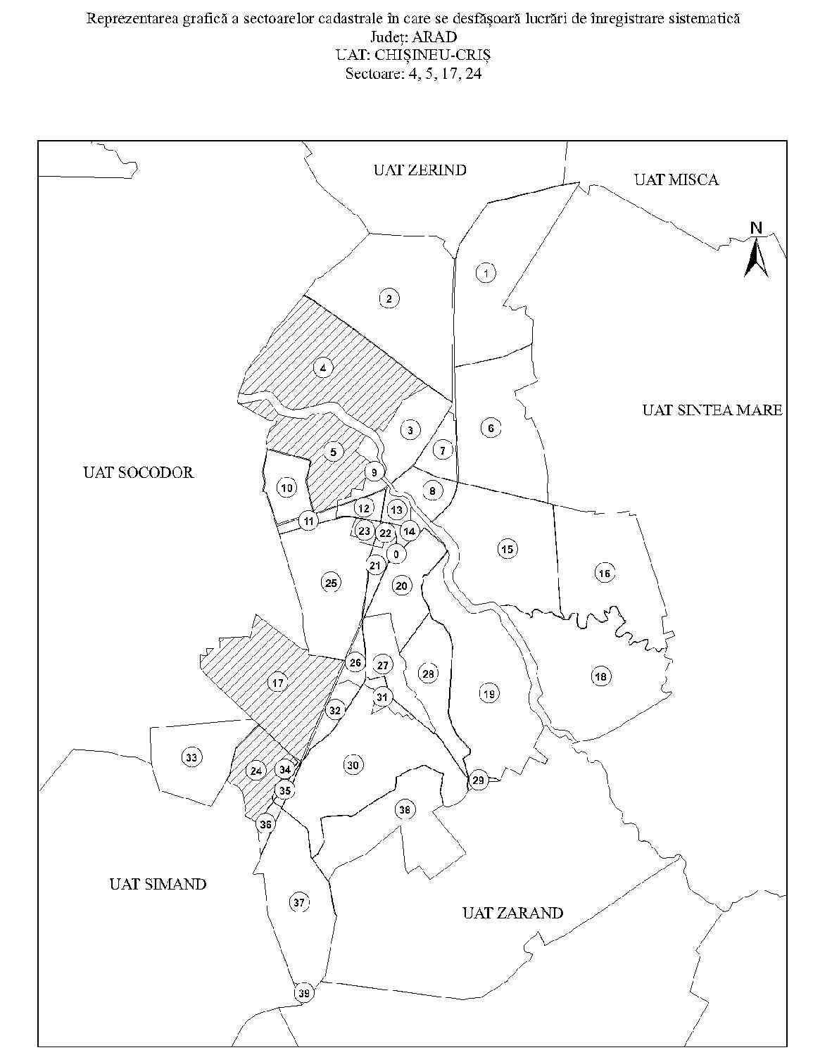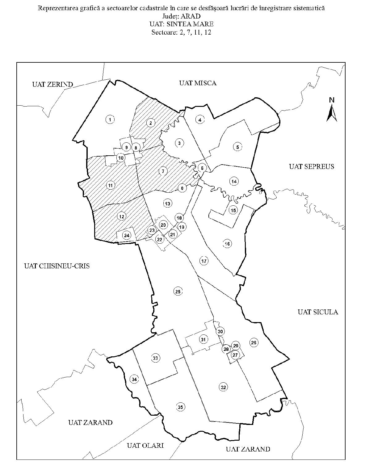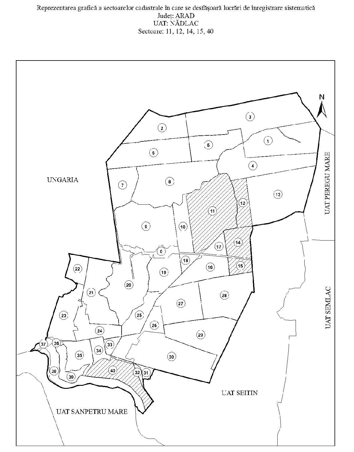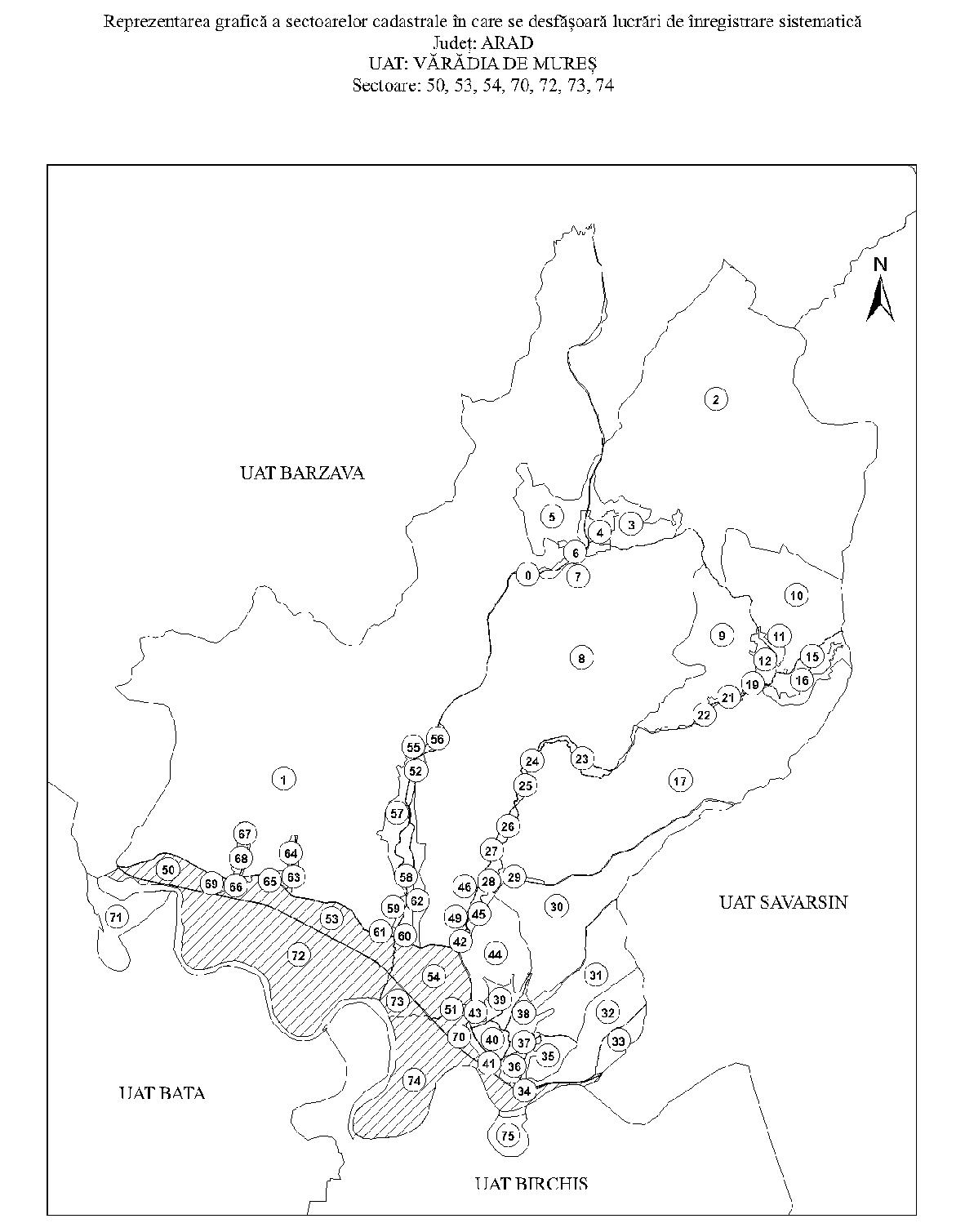 Având în vedere prevederile art. 11 alin. (1) din Legea cadastrului şi a publicităţii imobiliare nr. 7/1996, republicată, cu modificările şi completările ulterioare, şi ale art. 15 alin. (3) din Regulamentul de organizare şi funcţionare a Agenţiei Naţionale de Cadastru şi Publicitate Imobiliară, aprobat prin Hotărârea Guvernului nr. 1.288/2012, cu modificările şi completările ulterioare,în temeiul art. 3 alin. (13) din Legea cadastrului şi a publicităţii imobiliare nr. 7/1996, republicată, cu modificările şi completările ulterioare,directorul general al Agenţiei Naţionale de Cadastru şi Publicitate Imobiliară emite prezentul ordin. Articolul 1 Se aprobă începerea lucrărilor de înregistrare sistematică a imobilelor, pe sectoare cadastrale, situate pe teritoriul a 41 de unităţi administrativ-teritoriale din judeţul Arad, după cum urmează: a)unitatea administrativ-teritorială Almaş - sectoarele cadastrale nr. 2, 8, 9, 10, 11, 12 şi 28; b)unitatea administrativ-teritorială Apateu - sectoarele cadastrale nr. 6, 7, 8, 12, 15, 21, 24 şi 29; c)unitatea administrativ-teritorială Archiş - sectoarele cadastrale nr. 6, 7, 8, 9, 22, 36, 37 şi 40; d)unitatea administrativ-teritorială Beliu - sectoarele cadastrale nr. 1, 2, 3, 4, 5, 6 şi 7; e)unitatea administrativ-teritorială Bârzava - sectoarele cadastrale nr. 48, 52, 53, 54, 61 şi 65; f)unitatea administrativ-teritorială Brazii - sectoarele cadastrale nr. 1, 2, 16 şi 18; g)unitatea administrativ-teritorială Buteni - sectoarele cadastrale nr. 15, 18, 19, 30, 57, 58, 59, 60, 62, 63 şi 64; h)unitatea administrativ-teritorială Cărand - sectoarele cadastrale nr. 4, 5, 6, 7, 11, 12, 15, 21, 24, 28 şi 29; i)unitatea administrativ-teritorială Cermei - sectoarele cadastrale nr. 3, 8, 9, 12, 17, 20 şi 21; j)unitatea administrativ-teritorială Chişineu-Criş - sectoarele cadastrale nr. 4, 5, 17 şi 24; k)unitatea administrativ-teritorială Curtici - sectoarele cadastrale nr. 3, 4, 5, 6, 7, 11, 13, 14, 15 şi 16; l)unitatea administrativ-teritorială Dezna - sectoarele cadastrale nr. 15, 16, 17, 22, 23, 25, 40, 41 şi 70; m)unitatea administrativ-teritorială Dieci - sectoarele cadastrale nr. 6, 9 şi 13; n)unitatea administrativ-teritorială Felnac - sectoarele cadastrale nr. 1, 2, 3, 4, 9, 12 şi 13; o)unitatea administrativ-teritorială Grăniceri - sectoarele cadastrale nr. 1, 20 şi 21; p)unitatea administrativ-teritorială Gurahonţ - sectoarele cadastrale nr. 2, 3, 4, 5, 7, 9, 14, 15 şi 18; q)unitatea administrativ-teritorială Igneşti - sectoarele cadastrale nr. 3, 6, 8, 11, 24, 25, 26, 28, 30, 37, 39, 40, 43, 44 şi 45; r)unitatea administrativ-teritorială Ineu - sectoarele cadastrale nr. 5, 6 şi 8; s)unitatea administrativ-teritorială Iratoşu - sectoarele cadastrale nr. 4, 5, 9 şi 10; ş)unitatea administrativ-teritorială Lipova - sectoarele cadastrale nr. 7, 19, 20 şi 48; t)unitatea administrativ-teritorială Mişca - sectoarele cadastrale nr. 2, 3, 12, 15, 18, 41 şi 42; ţ)unitatea administrativ-teritorială Moneasa - sectoarele cadastrale nr. 19, 24, 29 şi 38; u)unitatea administrativ-teritorială Nădlac - sectoarele cadastrale nr. 11, 12, 14, 15 şi 40; v)unitatea administrativ-teritorială Olari - sectoarele cadastrale nr. 2, 3, 4, 8, 14 şi 15; w)unitatea administrativ-teritorială Păuliş - sectoarele cadastrale nr. 2, 7, 8, 25, 29 şi 35; x)unitatea administrativ-teritorială Pecica - sectoarele cadastrale nr. 4, 5, 21, 22, 23, 24, 25 şi 27; y)unitatea administrativ-teritorială Sântana - sectoarele cadastrale nr. 2, 3, 12, 16 şi 26; z)unitatea administrativ-teritorială Săvârşin - sectoarele cadastrale nr. 38, 39, 40, 41 şi 42;aa) unitatea administrativ-teritorială Sebiş - sectoarele cadastrale nr. 12, 13, 29, 30, 33 şi 37; bb) unitatea administrativ-teritorială Şeitin - sectoarele cadastrale nr. 3, 4, 6, 8, 15 şi 16; cc) unitatea administrativ-teritorială Şepreuş - sectoarele cadastrale nr. 9, 13, 14, 15, 16, 27, 30, 31, 46 şi 47; dd) unitatea administrativ-teritorială Şicula - sectoarele cadastrale nr. 10, 11, 12, 13 şi 14; ee) unitatea administrativ-teritorială Şilindia - sectoarele cadastrale nr. 2, 4, 5, 6, 10 şi 11; ff) unitatea administrativ-teritorială Şimand - sectoarele cadastrale nr. 4, 16, 18 şi 22; gg) unitatea administrativ-teritorială Sintea Mare - sectoarele cadastrale nr. 2, 7, 11 şi 12; hh) unitatea administrativ-teritorială Şiştarovăţ – sectoarele cadastrale nr. 1, 3, 5 şi 17; ii) unitatea administrativ-teritorială Socodor - sectoarele cadastrale nr. 5, 8, 9, 10, 12, 20, 21, 22, 25, 26, 27 şi 28; jj) unitatea administrativ-teritorială Vărădia de Mureş - sectoarele cadastrale nr. 50, 53, 54, 70, 72, 73 şi 74; kk) unitatea administrativ-teritorială Zăbrani - sectoarele cadastrale nr. 9, 10, 15, 18, 20, 25 şi 29; ll) unitatea administrativ-teritorială Zădăreni - sectoarele cadastrale nr. 20, 22 şi 27; mm) unitatea administrativ-teritorială Zărand - sectoarele cadastrale nr. 9, 10, 11, 12, 22, 26 şi 27. Articolul 2 Reprezentarea grafică a sectoarelor cadastrale în care se desfăşoară lucrările de înregistrare sistematică a imobilelor este prevăzută în anexele nr. 1-41 la prezentul ordin. Articolul 3 Anexele nr. 1-41*) fac parte integrantă din prezentul ordin. *) Anexele nr. 1-41 sunt reproduse în facsimil. Articolul 4 Prezentul ordin se publică în Monitorul Oficial al României, Partea I. Directorul general al Agenţiei Naţionale de Cadastru şi Publicitate Imobiliară,Radu Codruţ ŞtefănescuANEXA Nr. 1