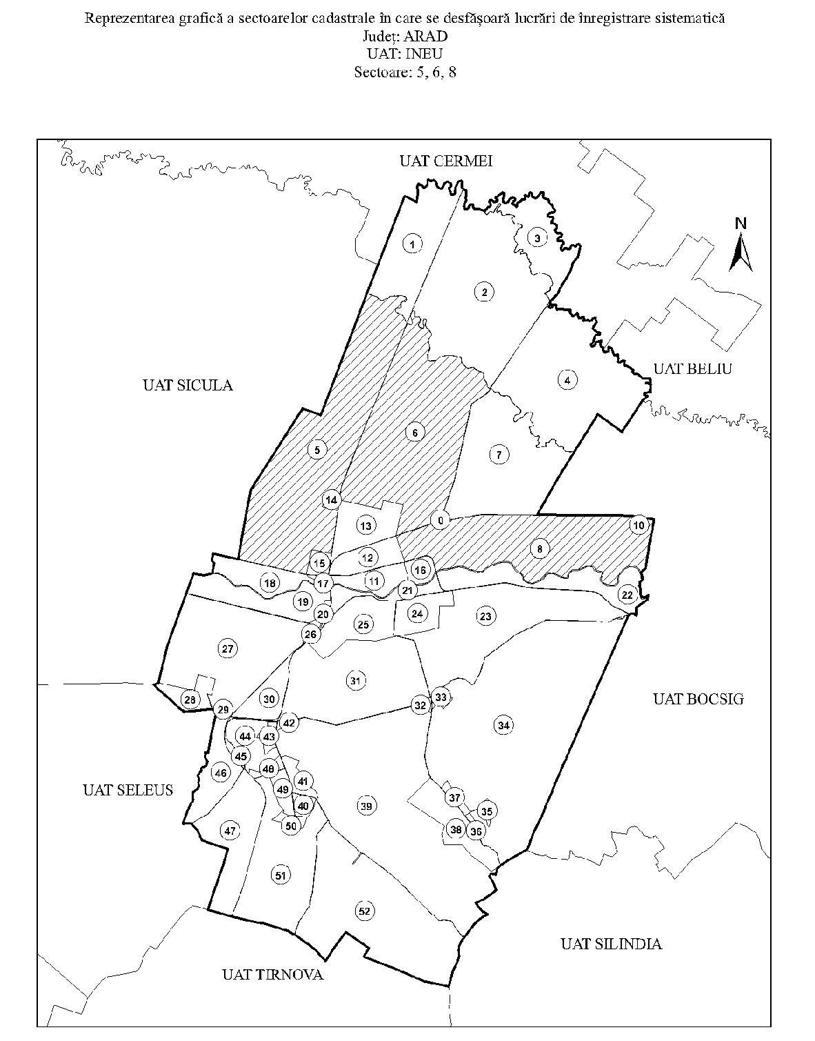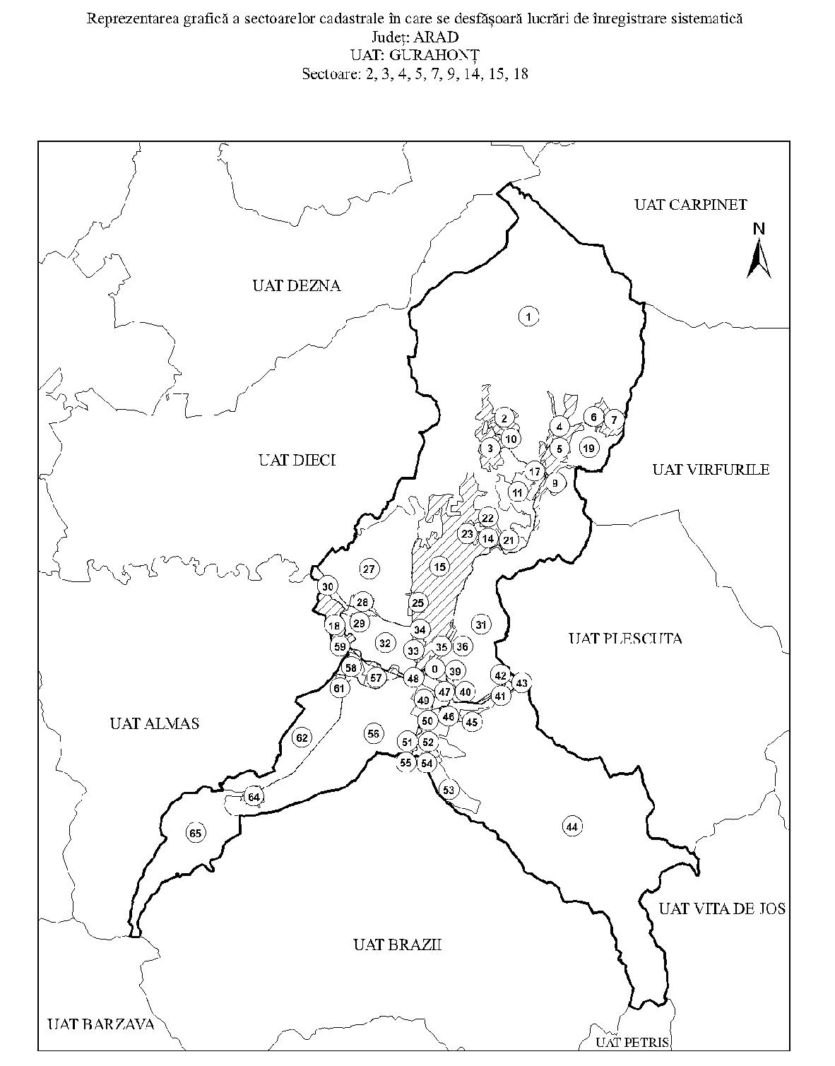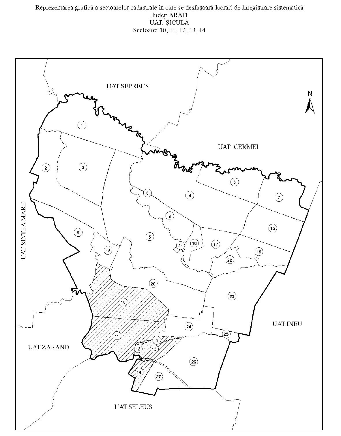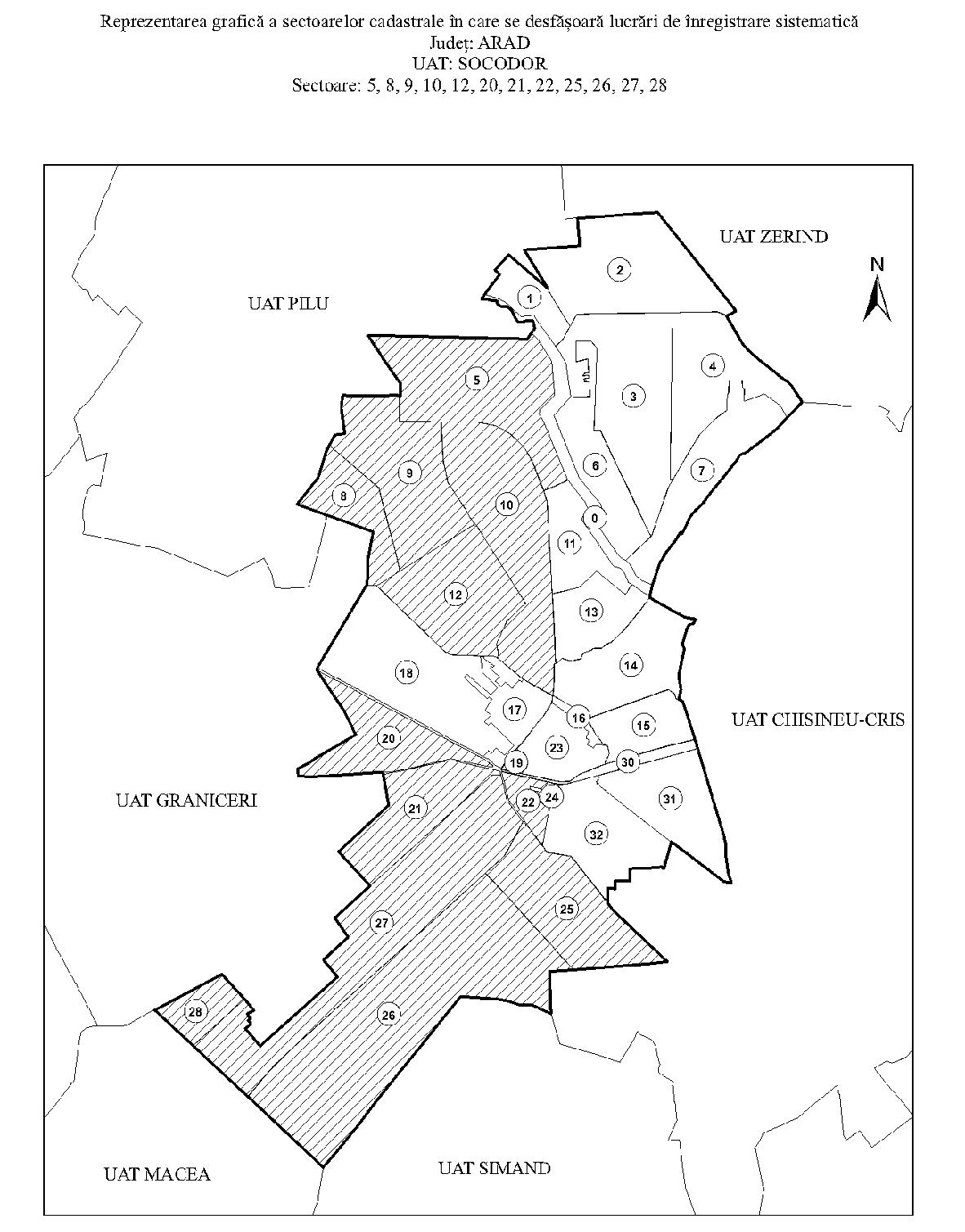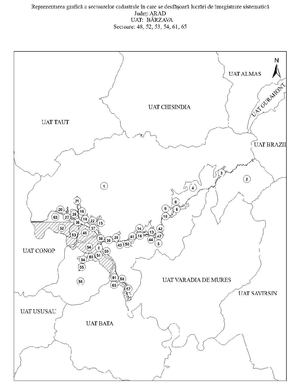 Având în vedere prevederile art. 11 alin. (1) din Legea cadastrului şi a publicităţii imobiliare nr. 7/1996, republicată, cu modificările şi completările ulterioare, şi ale art. 15 alin. (3) din Regulamentul de organizare şi funcţionare a Agenţiei Naţionale de Cadastru şi Publicitate Imobiliară, aprobat prin Hotărârea Guvernului nr. 1.288/2012, cu modificările şi completările ulterioare,în temeiul art. 3 alin. (13) din Legea cadastrului şi a publicităţii imobiliare nr. 7/1996, republicată, cu modificările şi completările ulterioare,directorul general al Agenţiei Naţionale de Cadastru şi Publicitate Imobiliară emite prezentul ordin. Articolul 1 Se aprobă începerea lucrărilor de înregistrare sistematică a imobilelor, pe sectoare cadastrale, situate pe teritoriul a 41 de unităţi administrativ-teritoriale din judeţul Arad, după cum urmează: a)unitatea administrativ-teritorială Almaş - sectoarele cadastrale nr. 2, 8, 9, 10, 11, 12 şi 28; b)unitatea administrativ-teritorială Apateu - sectoarele cadastrale nr. 6, 7, 8, 12, 15, 21, 24 şi 29; c)unitatea administrativ-teritorială Archiş - sectoarele cadastrale nr. 6, 7, 8, 9, 22, 36, 37 şi 40; d)unitatea administrativ-teritorială Beliu - sectoarele cadastrale nr. 1, 2, 3, 4, 5, 6 şi 7; e)unitatea administrativ-teritorială Bârzava - sectoarele cadastrale nr. 48, 52, 53, 54, 61 şi 65; f)unitatea administrativ-teritorială Brazii - sectoarele cadastrale nr. 1, 2, 16 şi 18; g)unitatea administrativ-teritorială Buteni - sectoarele cadastrale nr. 15, 18, 19, 30, 57, 58, 59, 60, 62, 63 şi 64; h)unitatea administrativ-teritorială Cărand - sectoarele cadastrale nr. 4, 5, 6, 7, 11, 12, 15, 21, 24, 28 şi 29; i)unitatea administrativ-teritorială Cermei - sectoarele cadastrale nr. 3, 8, 9, 12, 17, 20 şi 21; j)unitatea administrativ-teritorială Chişineu-Criş - sectoarele cadastrale nr. 4, 5, 17 şi 24; k)unitatea administrativ-teritorială Curtici - sectoarele cadastrale nr. 3, 4, 5, 6, 7, 11, 13, 14, 15 şi 16; l)unitatea administrativ-teritorială Dezna - sectoarele cadastrale nr. 15, 16, 17, 22, 23, 25, 40, 41 şi 70; m)unitatea administrativ-teritorială Dieci - sectoarele cadastrale nr. 6, 9 şi 13; n)unitatea administrativ-teritorială Felnac - sectoarele cadastrale nr. 1, 2, 3, 4, 9, 12 şi 13; o)unitatea administrativ-teritorială Grăniceri - sectoarele cadastrale nr. 1, 20 şi 21; p)unitatea administrativ-teritorială Gurahonţ - sectoarele cadastrale nr. 2, 3, 4, 5, 7, 9, 14, 15 şi 18; q)unitatea administrativ-teritorială Igneşti - sectoarele cadastrale nr. 3, 6, 8, 11, 24, 25, 26, 28, 30, 37, 39, 40, 43, 44 şi 45; r)unitatea administrativ-teritorială Ineu - sectoarele cadastrale nr. 5, 6 şi 8; s)unitatea administrativ-teritorială Iratoşu - sectoarele cadastrale nr. 4, 5, 9 şi 10; ş)unitatea administrativ-teritorială Lipova - sectoarele cadastrale nr. 7, 19, 20 şi 48; t)unitatea administrativ-teritorială Mişca - sectoarele cadastrale nr. 2, 3, 12, 15, 18, 41 şi 42; ţ)unitatea administrativ-teritorială Moneasa - sectoarele cadastrale nr. 19, 24, 29 şi 38; u)unitatea administrativ-teritorială Nădlac - sectoarele cadastrale nr. 11, 12, 14, 15 şi 40; v)unitatea administrativ-teritorială Olari - sectoarele cadastrale nr. 2, 3, 4, 8, 14 şi 15; w)unitatea administrativ-teritorială Păuliş - sectoarele cadastrale nr. 2, 7, 8, 25, 29 şi 35; x)unitatea administrativ-teritorială Pecica - sectoarele cadastrale nr. 4, 5, 21, 22, 23, 24, 25 şi 27; y)unitatea administrativ-teritorială Sântana - sectoarele cadastrale nr. 2, 3, 12, 16 şi 26; z)unitatea administrativ-teritorială Săvârşin - sectoarele cadastrale nr. 38, 39, 40, 41 şi 42;aa) unitatea administrativ-teritorială Sebiş - sectoarele cadastrale nr. 12, 13, 29, 30, 33 şi 37; bb) unitatea administrativ-teritorială Şeitin - sectoarele cadastrale nr. 3, 4, 6, 8, 15 şi 16; cc) unitatea administrativ-teritorială Şepreuş - sectoarele cadastrale nr. 9, 13, 14, 15, 16, 27, 30, 31, 46 şi 47; dd) unitatea administrativ-teritorială Şicula - sectoarele cadastrale nr. 10, 11, 12, 13 şi 14; ee) unitatea administrativ-teritorială Şilindia - sectoarele cadastrale nr. 2, 4, 5, 6, 10 şi 11; ff) unitatea administrativ-teritorială Şimand - sectoarele cadastrale nr. 4, 16, 18 şi 22; gg) unitatea administrativ-teritorială Sintea Mare - sectoarele cadastrale nr. 2, 7, 11 şi 12; hh) unitatea administrativ-teritorială Şiştarovăţ – sectoarele cadastrale nr. 1, 3, 5 şi 17; ii) unitatea administrativ-teritorială Socodor - sectoarele cadastrale nr. 5, 8, 9, 10, 12, 20, 21, 22, 25, 26, 27 şi 28; jj) unitatea administrativ-teritorială Vărădia de Mureş - sectoarele cadastrale nr. 50, 53, 54, 70, 72, 73 şi 74; kk) unitatea administrativ-teritorială Zăbrani - sectoarele cadastrale nr. 9, 10, 15, 18, 20, 25 şi 29; ll) unitatea administrativ-teritorială Zădăreni - sectoarele cadastrale nr. 20, 22 şi 27; mm) unitatea administrativ-teritorială Zărand - sectoarele cadastrale nr. 9, 10, 11, 12, 22, 26 şi 27. Articolul 2 Reprezentarea grafică a sectoarelor cadastrale în care se desfăşoară lucrările de înregistrare sistematică a imobilelor este prevăzută în anexele nr. 1-41 la prezentul ordin. Articolul 3 Anexele nr. 1-41*) fac parte integrantă din prezentul ordin. *) Anexele nr. 1-41 sunt reproduse în facsimil. Articolul 4 Prezentul ordin se publică în Monitorul Oficial al României, Partea I. Directorul general al Agenţiei Naţionale de Cadastru şi Publicitate Imobiliară,Radu Codruţ ŞtefănescuANEXA Nr. 1