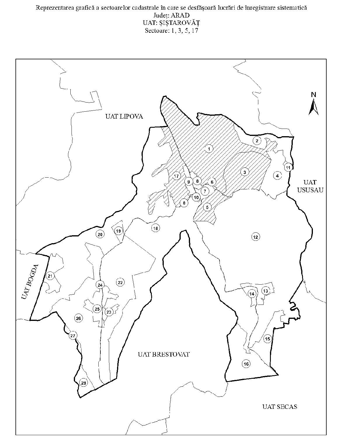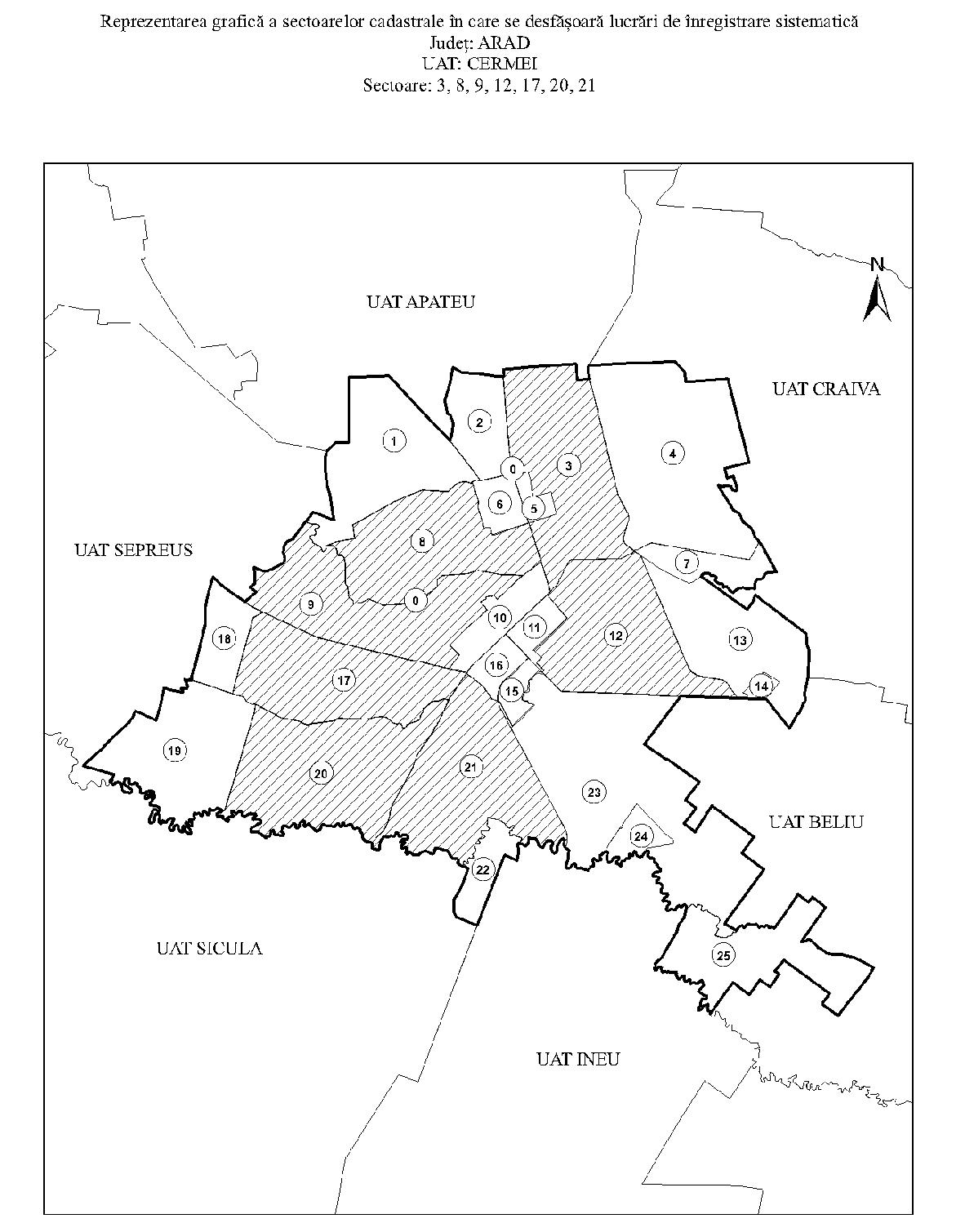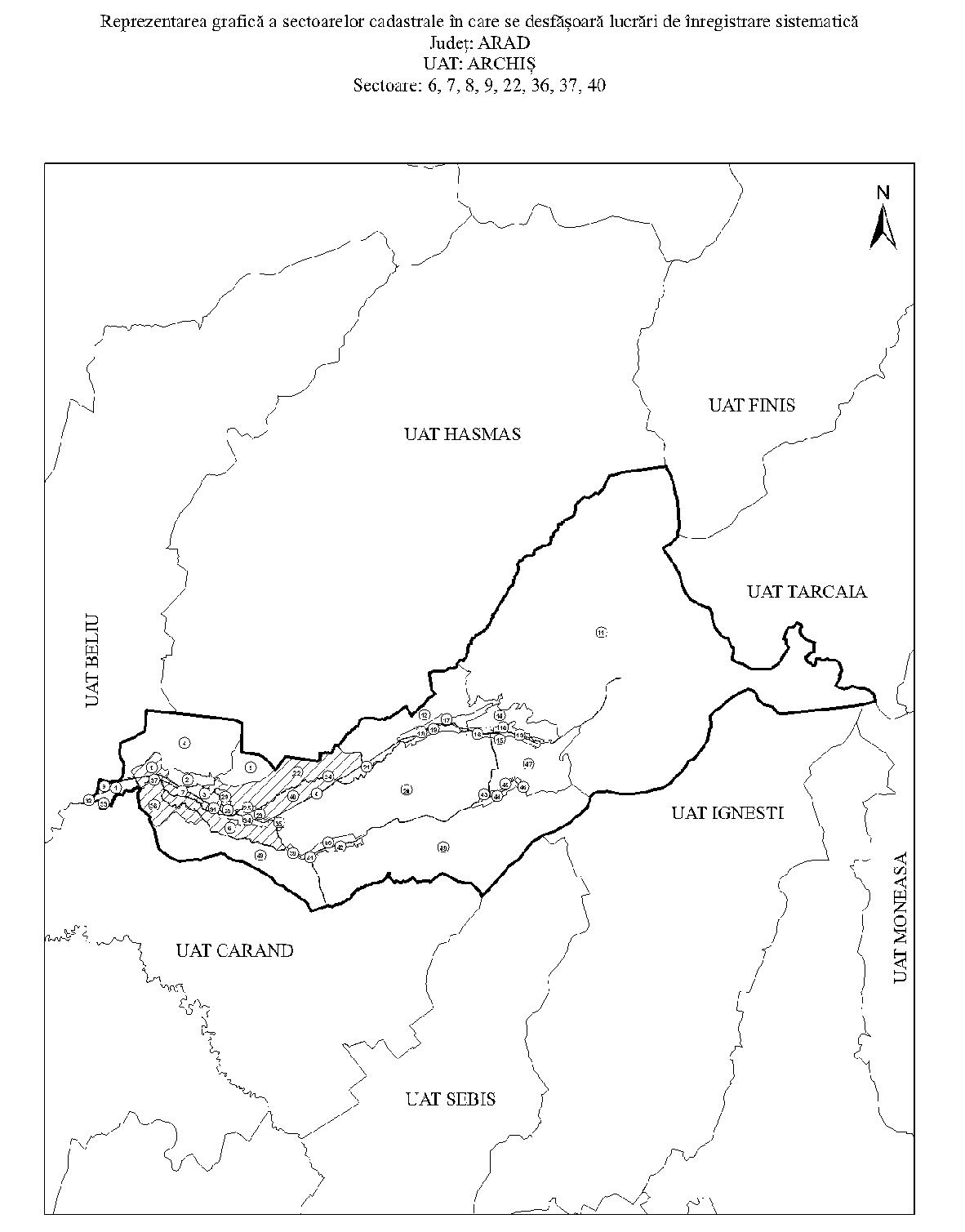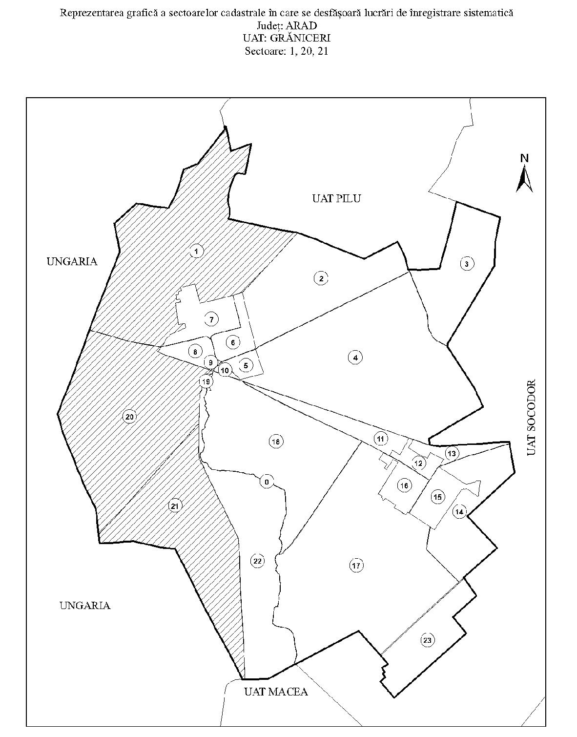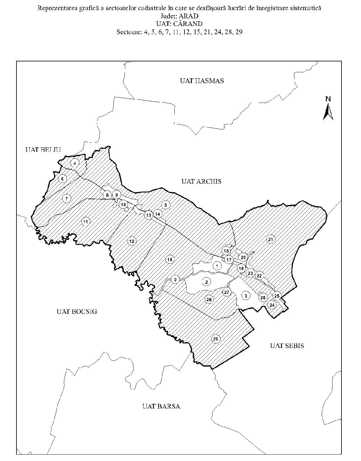 Având în vedere prevederile art. 11 alin. (1) din Legea cadastrului şi a publicităţii imobiliare nr. 7/1996, republicată, cu modificările şi completările ulterioare, şi ale art. 15 alin. (3) din Regulamentul de organizare şi funcţionare a Agenţiei Naţionale de Cadastru şi Publicitate Imobiliară, aprobat prin Hotărârea Guvernului nr. 1.288/2012, cu modificările şi completările ulterioare,în temeiul art. 3 alin. (13) din Legea cadastrului şi a publicităţii imobiliare nr. 7/1996, republicată, cu modificările şi completările ulterioare,directorul general al Agenţiei Naţionale de Cadastru şi Publicitate Imobiliară emite prezentul ordin. Articolul 1 Se aprobă începerea lucrărilor de înregistrare sistematică a imobilelor, pe sectoare cadastrale, situate pe teritoriul a 41 de unităţi administrativ-teritoriale din judeţul Arad, după cum urmează: a)unitatea administrativ-teritorială Almaş - sectoarele cadastrale nr. 2, 8, 9, 10, 11, 12 şi 28; b)unitatea administrativ-teritorială Apateu - sectoarele cadastrale nr. 6, 7, 8, 12, 15, 21, 24 şi 29; c)unitatea administrativ-teritorială Archiş - sectoarele cadastrale nr. 6, 7, 8, 9, 22, 36, 37 şi 40; d)unitatea administrativ-teritorială Beliu - sectoarele cadastrale nr. 1, 2, 3, 4, 5, 6 şi 7; e)unitatea administrativ-teritorială Bârzava - sectoarele cadastrale nr. 48, 52, 53, 54, 61 şi 65; f)unitatea administrativ-teritorială Brazii - sectoarele cadastrale nr. 1, 2, 16 şi 18; g)unitatea administrativ-teritorială Buteni - sectoarele cadastrale nr. 15, 18, 19, 30, 57, 58, 59, 60, 62, 63 şi 64; h)unitatea administrativ-teritorială Cărand - sectoarele cadastrale nr. 4, 5, 6, 7, 11, 12, 15, 21, 24, 28 şi 29; i)unitatea administrativ-teritorială Cermei - sectoarele cadastrale nr. 3, 8, 9, 12, 17, 20 şi 21; j)unitatea administrativ-teritorială Chişineu-Criş - sectoarele cadastrale nr. 4, 5, 17 şi 24; k)unitatea administrativ-teritorială Curtici - sectoarele cadastrale nr. 3, 4, 5, 6, 7, 11, 13, 14, 15 şi 16; l)unitatea administrativ-teritorială Dezna - sectoarele cadastrale nr. 15, 16, 17, 22, 23, 25, 40, 41 şi 70; m)unitatea administrativ-teritorială Dieci - sectoarele cadastrale nr. 6, 9 şi 13; n)unitatea administrativ-teritorială Felnac - sectoarele cadastrale nr. 1, 2, 3, 4, 9, 12 şi 13; o)unitatea administrativ-teritorială Grăniceri - sectoarele cadastrale nr. 1, 20 şi 21; p)unitatea administrativ-teritorială Gurahonţ - sectoarele cadastrale nr. 2, 3, 4, 5, 7, 9, 14, 15 şi 18; q)unitatea administrativ-teritorială Igneşti - sectoarele cadastrale nr. 3, 6, 8, 11, 24, 25, 26, 28, 30, 37, 39, 40, 43, 44 şi 45; r)unitatea administrativ-teritorială Ineu - sectoarele cadastrale nr. 5, 6 şi 8; s)unitatea administrativ-teritorială Iratoşu - sectoarele cadastrale nr. 4, 5, 9 şi 10; ş)unitatea administrativ-teritorială Lipova - sectoarele cadastrale nr. 7, 19, 20 şi 48; t)unitatea administrativ-teritorială Mişca - sectoarele cadastrale nr. 2, 3, 12, 15, 18, 41 şi 42; ţ)unitatea administrativ-teritorială Moneasa - sectoarele cadastrale nr. 19, 24, 29 şi 38; u)unitatea administrativ-teritorială Nădlac - sectoarele cadastrale nr. 11, 12, 14, 15 şi 40; v)unitatea administrativ-teritorială Olari - sectoarele cadastrale nr. 2, 3, 4, 8, 14 şi 15; w)unitatea administrativ-teritorială Păuliş - sectoarele cadastrale nr. 2, 7, 8, 25, 29 şi 35; x)unitatea administrativ-teritorială Pecica - sectoarele cadastrale nr. 4, 5, 21, 22, 23, 24, 25 şi 27; y)unitatea administrativ-teritorială Sântana - sectoarele cadastrale nr. 2, 3, 12, 16 şi 26; z)unitatea administrativ-teritorială Săvârşin - sectoarele cadastrale nr. 38, 39, 40, 41 şi 42;aa) unitatea administrativ-teritorială Sebiş - sectoarele cadastrale nr. 12, 13, 29, 30, 33 şi 37; bb) unitatea administrativ-teritorială Şeitin - sectoarele cadastrale nr. 3, 4, 6, 8, 15 şi 16; cc) unitatea administrativ-teritorială Şepreuş - sectoarele cadastrale nr. 9, 13, 14, 15, 16, 27, 30, 31, 46 şi 47; dd) unitatea administrativ-teritorială Şicula - sectoarele cadastrale nr. 10, 11, 12, 13 şi 14; ee) unitatea administrativ-teritorială Şilindia - sectoarele cadastrale nr. 2, 4, 5, 6, 10 şi 11; ff) unitatea administrativ-teritorială Şimand - sectoarele cadastrale nr. 4, 16, 18 şi 22; gg) unitatea administrativ-teritorială Sintea Mare - sectoarele cadastrale nr. 2, 7, 11 şi 12; hh) unitatea administrativ-teritorială Şiştarovăţ – sectoarele cadastrale nr. 1, 3, 5 şi 17; ii) unitatea administrativ-teritorială Socodor - sectoarele cadastrale nr. 5, 8, 9, 10, 12, 20, 21, 22, 25, 26, 27 şi 28; jj) unitatea administrativ-teritorială Vărădia de Mureş - sectoarele cadastrale nr. 50, 53, 54, 70, 72, 73 şi 74; kk) unitatea administrativ-teritorială Zăbrani - sectoarele cadastrale nr. 9, 10, 15, 18, 20, 25 şi 29; ll) unitatea administrativ-teritorială Zădăreni - sectoarele cadastrale nr. 20, 22 şi 27; mm) unitatea administrativ-teritorială Zărand - sectoarele cadastrale nr. 9, 10, 11, 12, 22, 26 şi 27. Articolul 2 Reprezentarea grafică a sectoarelor cadastrale în care se desfăşoară lucrările de înregistrare sistematică a imobilelor este prevăzută în anexele nr. 1-41 la prezentul ordin. Articolul 3 Anexele nr. 1-41*) fac parte integrantă din prezentul ordin. *) Anexele nr. 1-41 sunt reproduse în facsimil. Articolul 4 Prezentul ordin se publică în Monitorul Oficial al României, Partea I. Directorul general al Agenţiei Naţionale de Cadastru şi Publicitate Imobiliară,Radu Codruţ ŞtefănescuANEXA Nr. 1