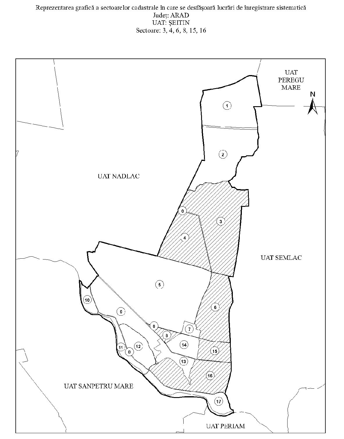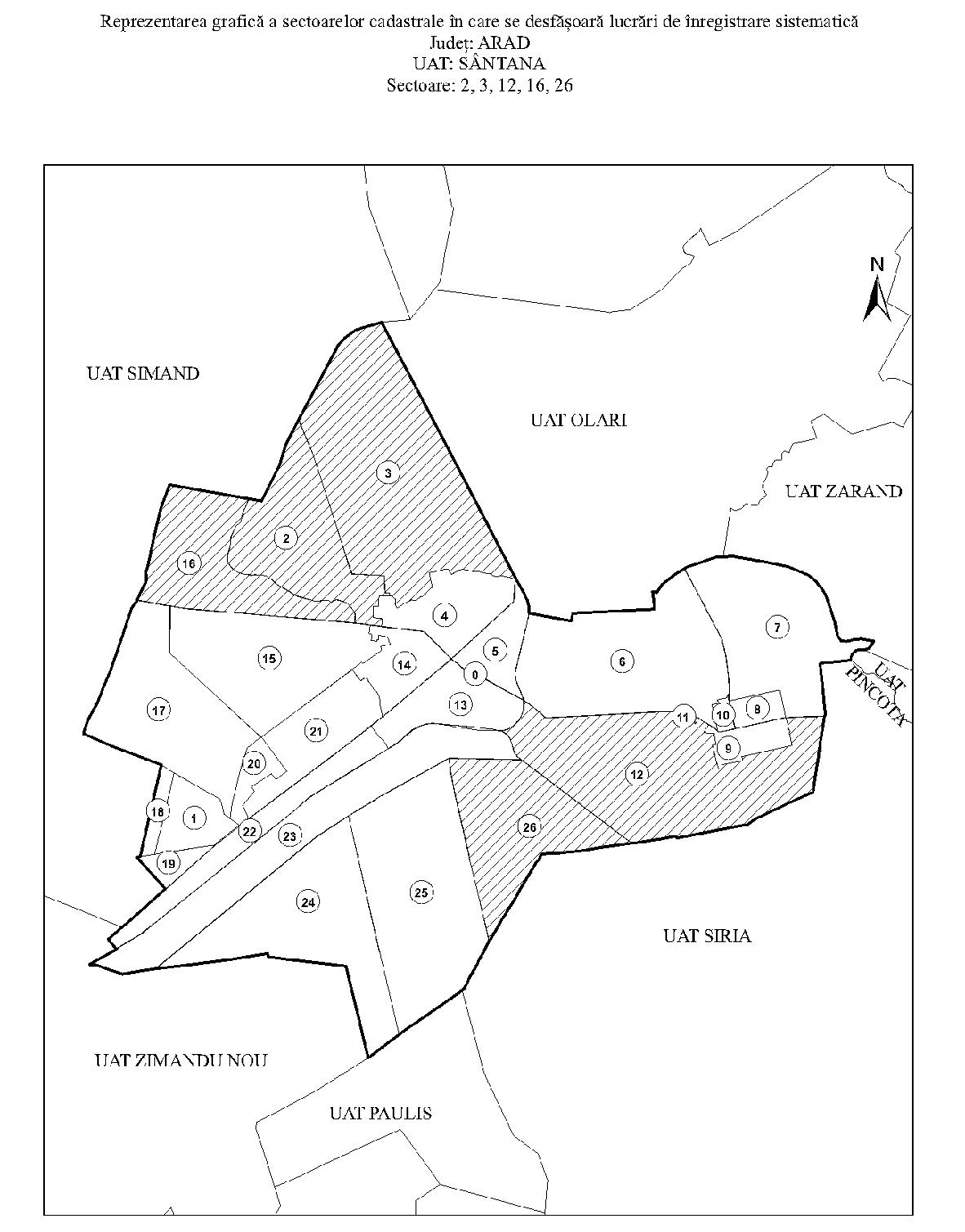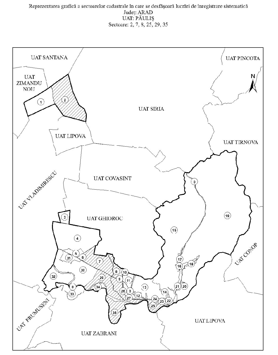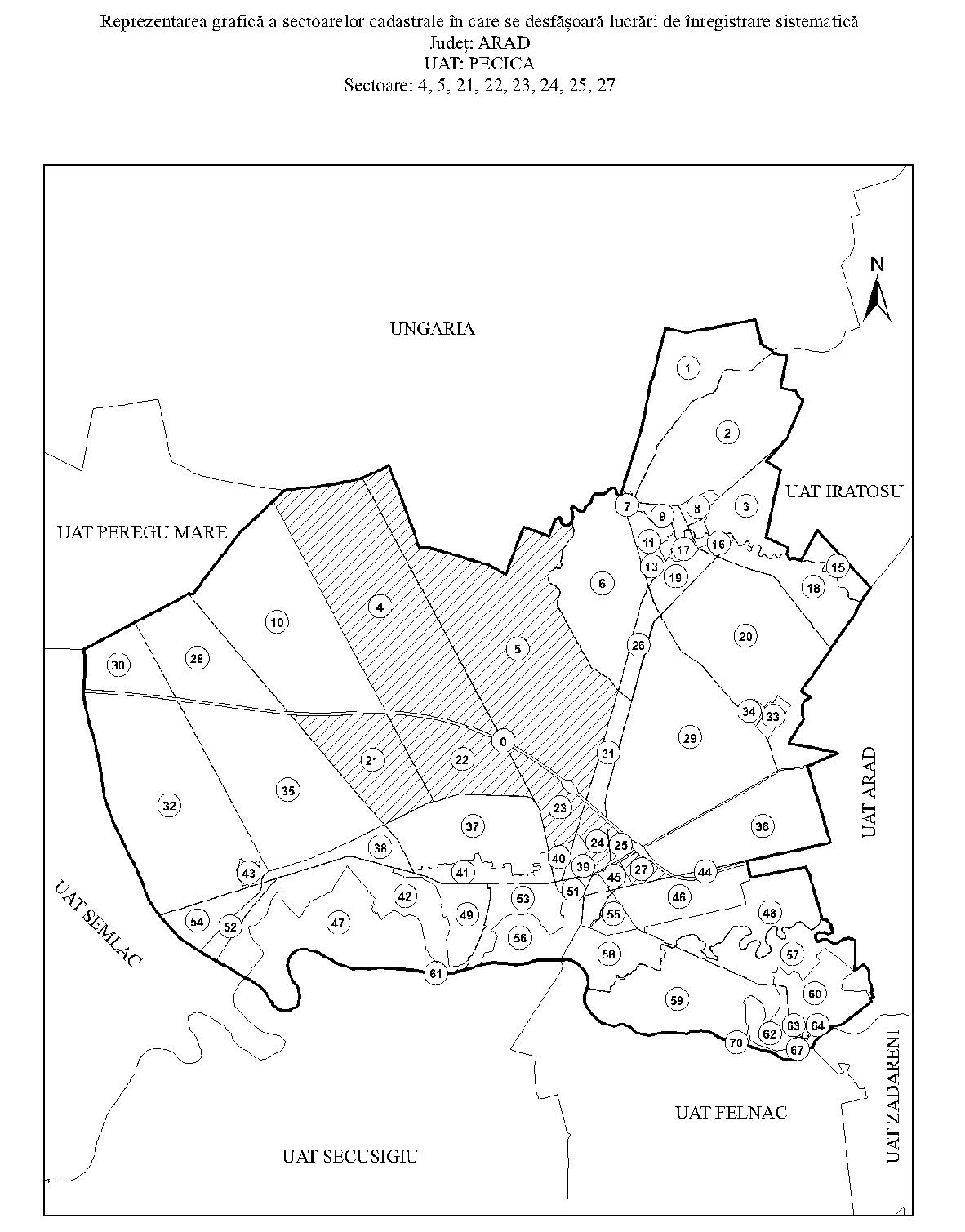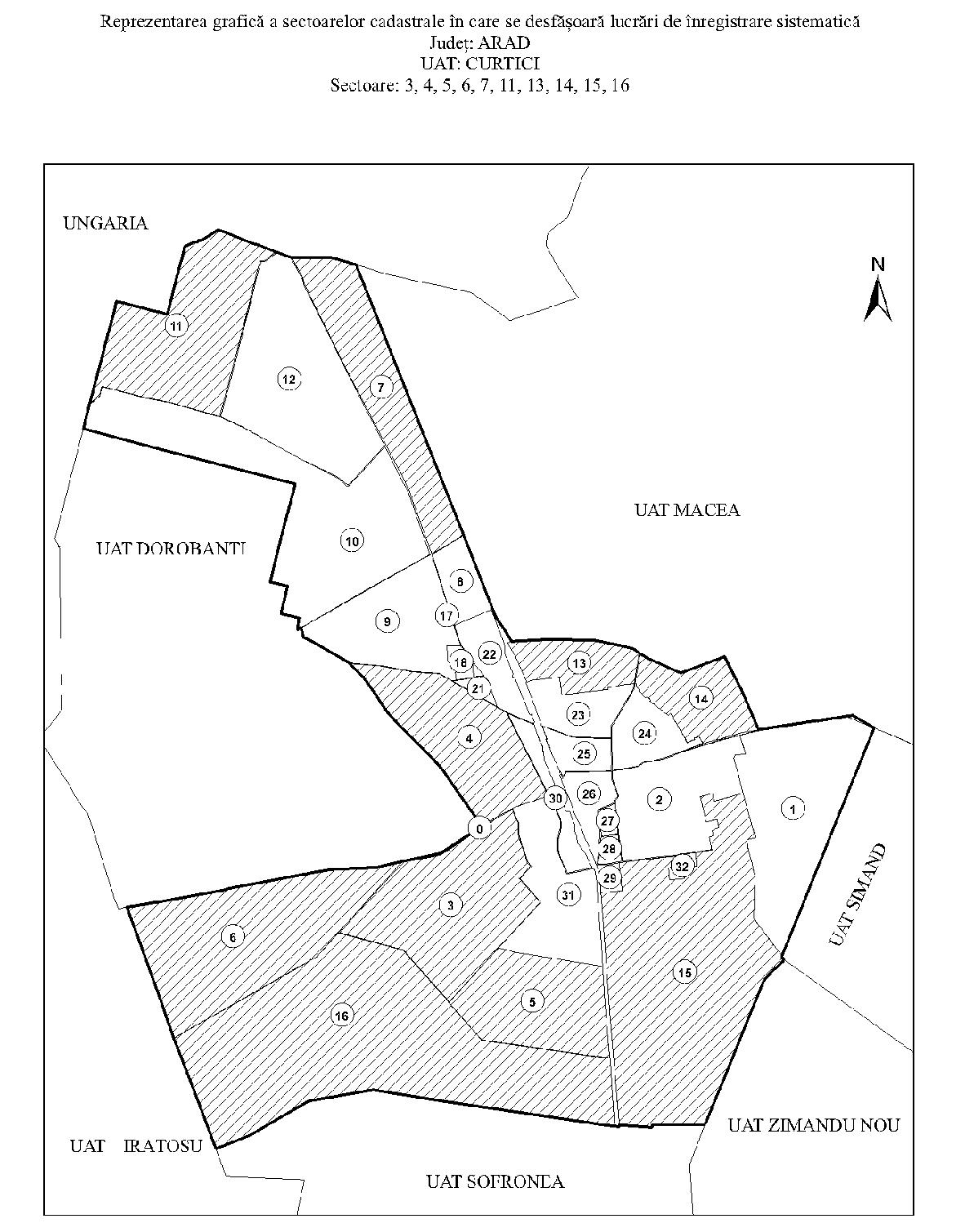 Având în vedere prevederile art. 11 alin. (1) din Legea cadastrului şi a publicităţii imobiliare nr. 7/1996, republicată, cu modificările şi completările ulterioare, şi ale art. 15 alin. (3) din Regulamentul de organizare şi funcţionare a Agenţiei Naţionale de Cadastru şi Publicitate Imobiliară, aprobat prin Hotărârea Guvernului nr. 1.288/2012, cu modificările şi completările ulterioare,în temeiul art. 3 alin. (13) din Legea cadastrului şi a publicităţii imobiliare nr. 7/1996, republicată, cu modificările şi completările ulterioare,directorul general al Agenţiei Naţionale de Cadastru şi Publicitate Imobiliară emite prezentul ordin. Articolul 1 Se aprobă începerea lucrărilor de înregistrare sistematică a imobilelor, pe sectoare cadastrale, situate pe teritoriul a 41 de unităţi administrativ-teritoriale din judeţul Arad, după cum urmează: a)unitatea administrativ-teritorială Almaş - sectoarele cadastrale nr. 2, 8, 9, 10, 11, 12 şi 28; b)unitatea administrativ-teritorială Apateu - sectoarele cadastrale nr. 6, 7, 8, 12, 15, 21, 24 şi 29; c)unitatea administrativ-teritorială Archiş - sectoarele cadastrale nr. 6, 7, 8, 9, 22, 36, 37 şi 40; d)unitatea administrativ-teritorială Beliu - sectoarele cadastrale nr. 1, 2, 3, 4, 5, 6 şi 7; e)unitatea administrativ-teritorială Bârzava - sectoarele cadastrale nr. 48, 52, 53, 54, 61 şi 65; f)unitatea administrativ-teritorială Brazii - sectoarele cadastrale nr. 1, 2, 16 şi 18; g)unitatea administrativ-teritorială Buteni - sectoarele cadastrale nr. 15, 18, 19, 30, 57, 58, 59, 60, 62, 63 şi 64; h)unitatea administrativ-teritorială Cărand - sectoarele cadastrale nr. 4, 5, 6, 7, 11, 12, 15, 21, 24, 28 şi 29; i)unitatea administrativ-teritorială Cermei - sectoarele cadastrale nr. 3, 8, 9, 12, 17, 20 şi 21; j)unitatea administrativ-teritorială Chişineu-Criş - sectoarele cadastrale nr. 4, 5, 17 şi 24; k)unitatea administrativ-teritorială Curtici - sectoarele cadastrale nr. 3, 4, 5, 6, 7, 11, 13, 14, 15 şi 16; l)unitatea administrativ-teritorială Dezna - sectoarele cadastrale nr. 15, 16, 17, 22, 23, 25, 40, 41 şi 70; m)unitatea administrativ-teritorială Dieci - sectoarele cadastrale nr. 6, 9 şi 13; n)unitatea administrativ-teritorială Felnac - sectoarele cadastrale nr. 1, 2, 3, 4, 9, 12 şi 13; o)unitatea administrativ-teritorială Grăniceri - sectoarele cadastrale nr. 1, 20 şi 21; p)unitatea administrativ-teritorială Gurahonţ - sectoarele cadastrale nr. 2, 3, 4, 5, 7, 9, 14, 15 şi 18; q)unitatea administrativ-teritorială Igneşti - sectoarele cadastrale nr. 3, 6, 8, 11, 24, 25, 26, 28, 30, 37, 39, 40, 43, 44 şi 45; r)unitatea administrativ-teritorială Ineu - sectoarele cadastrale nr. 5, 6 şi 8; s)unitatea administrativ-teritorială Iratoşu - sectoarele cadastrale nr. 4, 5, 9 şi 10; ş)unitatea administrativ-teritorială Lipova - sectoarele cadastrale nr. 7, 19, 20 şi 48; t)unitatea administrativ-teritorială Mişca - sectoarele cadastrale nr. 2, 3, 12, 15, 18, 41 şi 42; ţ)unitatea administrativ-teritorială Moneasa - sectoarele cadastrale nr. 19, 24, 29 şi 38; u)unitatea administrativ-teritorială Nădlac - sectoarele cadastrale nr. 11, 12, 14, 15 şi 40; v)unitatea administrativ-teritorială Olari - sectoarele cadastrale nr. 2, 3, 4, 8, 14 şi 15; w)unitatea administrativ-teritorială Păuliş - sectoarele cadastrale nr. 2, 7, 8, 25, 29 şi 35; x)unitatea administrativ-teritorială Pecica - sectoarele cadastrale nr. 4, 5, 21, 22, 23, 24, 25 şi 27; y)unitatea administrativ-teritorială Sântana - sectoarele cadastrale nr. 2, 3, 12, 16 şi 26; z)unitatea administrativ-teritorială Săvârşin - sectoarele cadastrale nr. 38, 39, 40, 41 şi 42;aa) unitatea administrativ-teritorială Sebiş - sectoarele cadastrale nr. 12, 13, 29, 30, 33 şi 37; bb) unitatea administrativ-teritorială Şeitin - sectoarele cadastrale nr. 3, 4, 6, 8, 15 şi 16; cc) unitatea administrativ-teritorială Şepreuş - sectoarele cadastrale nr. 9, 13, 14, 15, 16, 27, 30, 31, 46 şi 47; dd) unitatea administrativ-teritorială Şicula - sectoarele cadastrale nr. 10, 11, 12, 13 şi 14; ee) unitatea administrativ-teritorială Şilindia - sectoarele cadastrale nr. 2, 4, 5, 6, 10 şi 11; ff) unitatea administrativ-teritorială Şimand - sectoarele cadastrale nr. 4, 16, 18 şi 22; gg) unitatea administrativ-teritorială Sintea Mare - sectoarele cadastrale nr. 2, 7, 11 şi 12; hh) unitatea administrativ-teritorială Şiştarovăţ – sectoarele cadastrale nr. 1, 3, 5 şi 17; ii) unitatea administrativ-teritorială Socodor - sectoarele cadastrale nr. 5, 8, 9, 10, 12, 20, 21, 22, 25, 26, 27 şi 28; jj) unitatea administrativ-teritorială Vărădia de Mureş - sectoarele cadastrale nr. 50, 53, 54, 70, 72, 73 şi 74; kk) unitatea administrativ-teritorială Zăbrani - sectoarele cadastrale nr. 9, 10, 15, 18, 20, 25 şi 29; ll) unitatea administrativ-teritorială Zădăreni - sectoarele cadastrale nr. 20, 22 şi 27; mm) unitatea administrativ-teritorială Zărand - sectoarele cadastrale nr. 9, 10, 11, 12, 22, 26 şi 27. Articolul 2 Reprezentarea grafică a sectoarelor cadastrale în care se desfăşoară lucrările de înregistrare sistematică a imobilelor este prevăzută în anexele nr. 1-41 la prezentul ordin. Articolul 3 Anexele nr. 1-41*) fac parte integrantă din prezentul ordin. *) Anexele nr. 1-41 sunt reproduse în facsimil. Articolul 4 Prezentul ordin se publică în Monitorul Oficial al României, Partea I. Directorul general al Agenţiei Naţionale de Cadastru şi Publicitate Imobiliară,Radu Codruţ ŞtefănescuANEXA Nr. 1