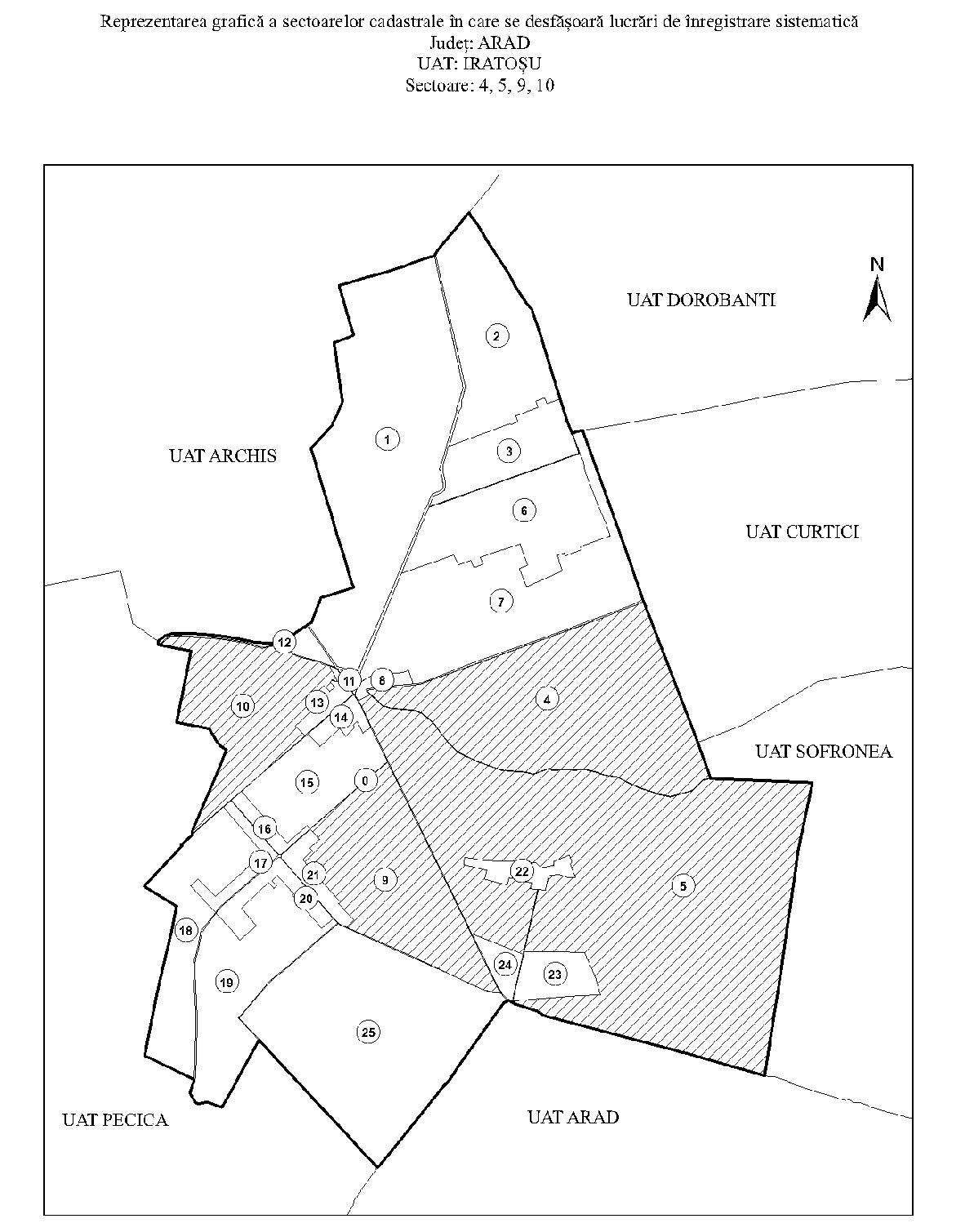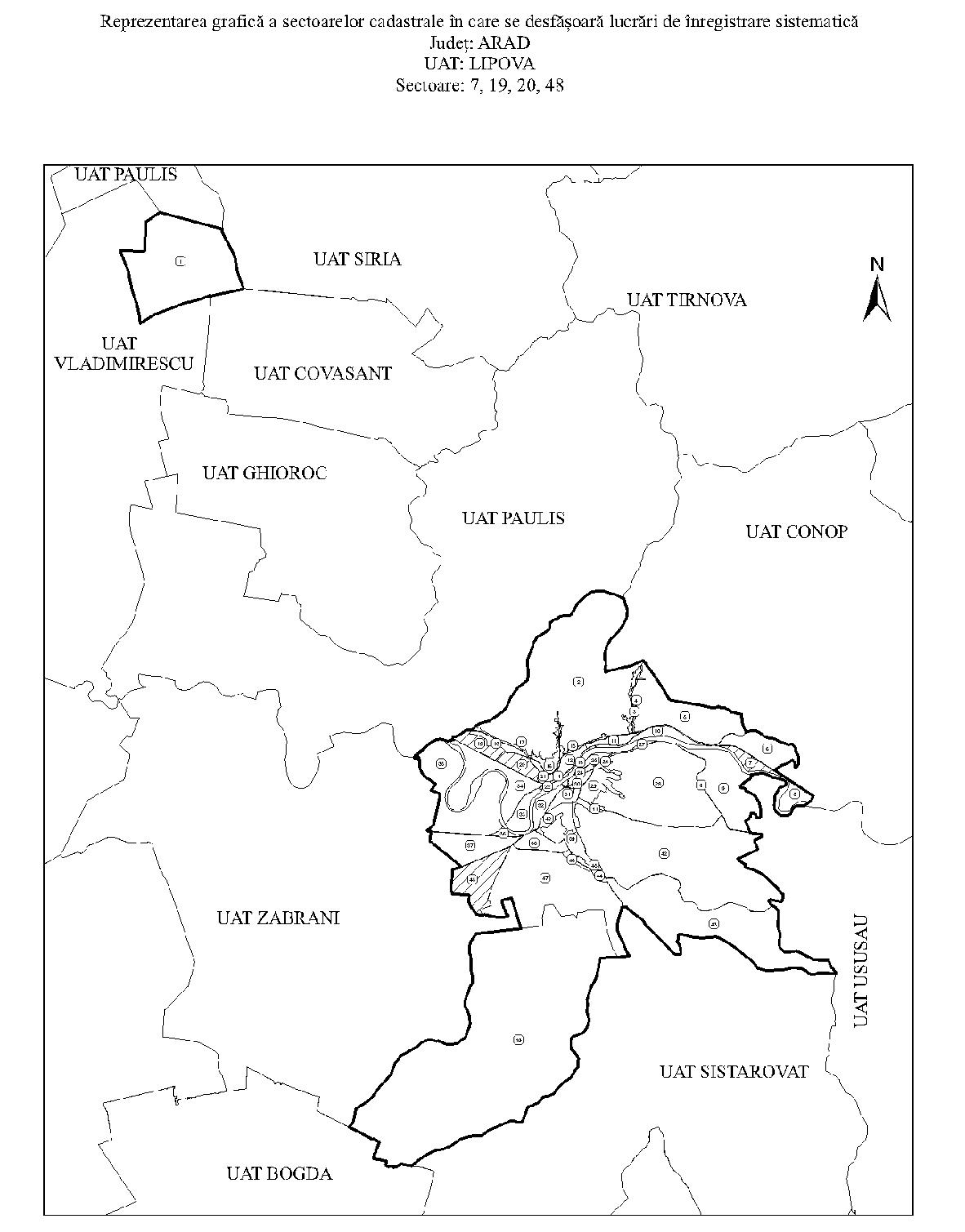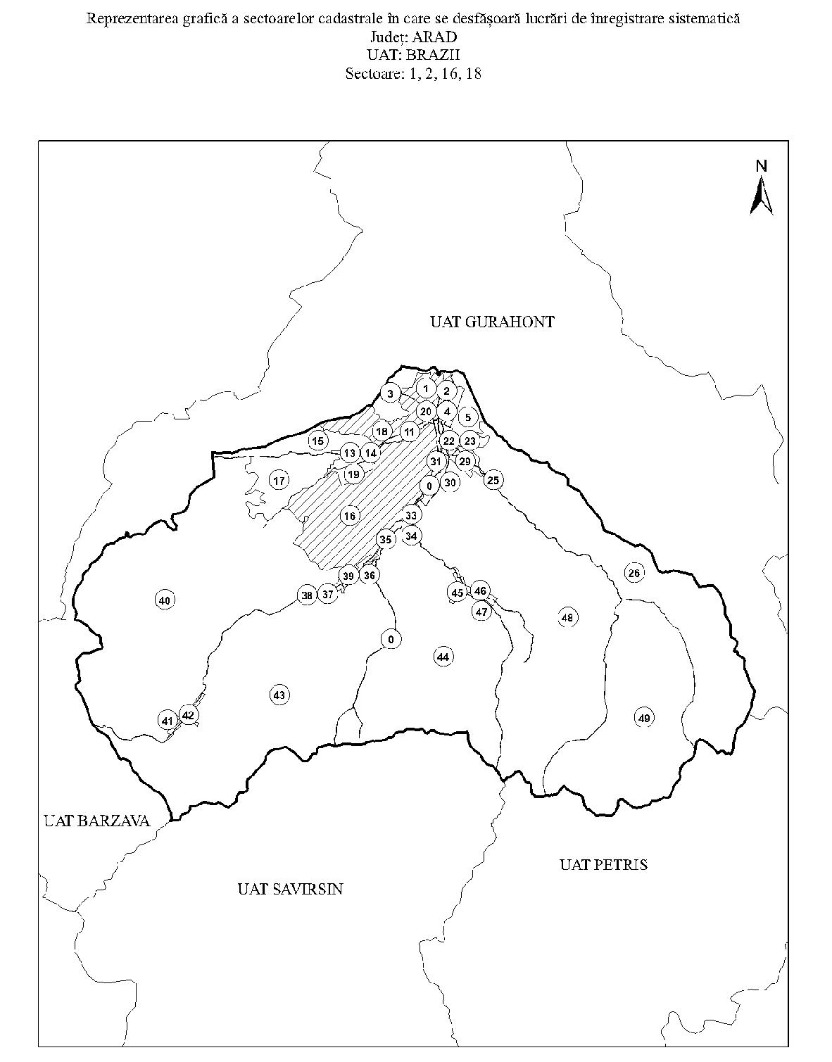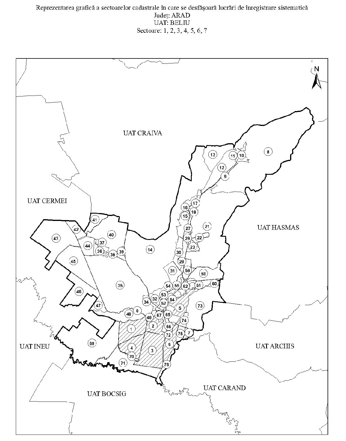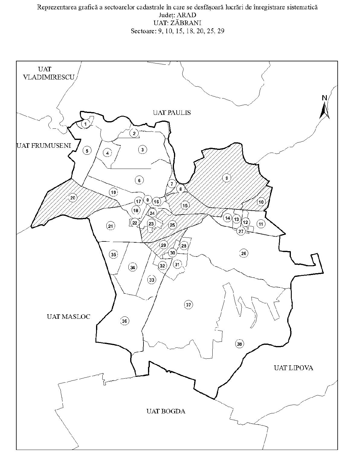 Având în vedere prevederile art. 11 alin. (1) din Legea cadastrului şi a publicităţii imobiliare nr. 7/1996, republicată, cu modificările şi completările ulterioare, şi ale art. 15 alin. (3) din Regulamentul de organizare şi funcţionare a Agenţiei Naţionale de Cadastru şi Publicitate Imobiliară, aprobat prin Hotărârea Guvernului nr. 1.288/2012, cu modificările şi completările ulterioare,în temeiul art. 3 alin. (13) din Legea cadastrului şi a publicităţii imobiliare nr. 7/1996, republicată, cu modificările şi completările ulterioare,directorul general al Agenţiei Naţionale de Cadastru şi Publicitate Imobiliară emite prezentul ordin. Articolul 1 Se aprobă începerea lucrărilor de înregistrare sistematică a imobilelor, pe sectoare cadastrale, situate pe teritoriul a 41 de unităţi administrativ-teritoriale din judeţul Arad, după cum urmează: a)unitatea administrativ-teritorială Almaş - sectoarele cadastrale nr. 2, 8, 9, 10, 11, 12 şi 28; b)unitatea administrativ-teritorială Apateu - sectoarele cadastrale nr. 6, 7, 8, 12, 15, 21, 24 şi 29; c)unitatea administrativ-teritorială Archiş - sectoarele cadastrale nr. 6, 7, 8, 9, 22, 36, 37 şi 40; d)unitatea administrativ-teritorială Beliu - sectoarele cadastrale nr. 1, 2, 3, 4, 5, 6 şi 7; e)unitatea administrativ-teritorială Bârzava - sectoarele cadastrale nr. 48, 52, 53, 54, 61 şi 65; f)unitatea administrativ-teritorială Brazii - sectoarele cadastrale nr. 1, 2, 16 şi 18; g)unitatea administrativ-teritorială Buteni - sectoarele cadastrale nr. 15, 18, 19, 30, 57, 58, 59, 60, 62, 63 şi 64; h)unitatea administrativ-teritorială Cărand - sectoarele cadastrale nr. 4, 5, 6, 7, 11, 12, 15, 21, 24, 28 şi 29; i)unitatea administrativ-teritorială Cermei - sectoarele cadastrale nr. 3, 8, 9, 12, 17, 20 şi 21; j)unitatea administrativ-teritorială Chişineu-Criş - sectoarele cadastrale nr. 4, 5, 17 şi 24; k)unitatea administrativ-teritorială Curtici - sectoarele cadastrale nr. 3, 4, 5, 6, 7, 11, 13, 14, 15 şi 16; l)unitatea administrativ-teritorială Dezna - sectoarele cadastrale nr. 15, 16, 17, 22, 23, 25, 40, 41 şi 70; m)unitatea administrativ-teritorială Dieci - sectoarele cadastrale nr. 6, 9 şi 13; n)unitatea administrativ-teritorială Felnac - sectoarele cadastrale nr. 1, 2, 3, 4, 9, 12 şi 13; o)unitatea administrativ-teritorială Grăniceri - sectoarele cadastrale nr. 1, 20 şi 21; p)unitatea administrativ-teritorială Gurahonţ - sectoarele cadastrale nr. 2, 3, 4, 5, 7, 9, 14, 15 şi 18; q)unitatea administrativ-teritorială Igneşti - sectoarele cadastrale nr. 3, 6, 8, 11, 24, 25, 26, 28, 30, 37, 39, 40, 43, 44 şi 45; r)unitatea administrativ-teritorială Ineu - sectoarele cadastrale nr. 5, 6 şi 8; s)unitatea administrativ-teritorială Iratoşu - sectoarele cadastrale nr. 4, 5, 9 şi 10; ş)unitatea administrativ-teritorială Lipova - sectoarele cadastrale nr. 7, 19, 20 şi 48; t)unitatea administrativ-teritorială Mişca - sectoarele cadastrale nr. 2, 3, 12, 15, 18, 41 şi 42; ţ)unitatea administrativ-teritorială Moneasa - sectoarele cadastrale nr. 19, 24, 29 şi 38; u)unitatea administrativ-teritorială Nădlac - sectoarele cadastrale nr. 11, 12, 14, 15 şi 40; v)unitatea administrativ-teritorială Olari - sectoarele cadastrale nr. 2, 3, 4, 8, 14 şi 15; w)unitatea administrativ-teritorială Păuliş - sectoarele cadastrale nr. 2, 7, 8, 25, 29 şi 35; x)unitatea administrativ-teritorială Pecica - sectoarele cadastrale nr. 4, 5, 21, 22, 23, 24, 25 şi 27; y)unitatea administrativ-teritorială Sântana - sectoarele cadastrale nr. 2, 3, 12, 16 şi 26; z)unitatea administrativ-teritorială Săvârşin - sectoarele cadastrale nr. 38, 39, 40, 41 şi 42;aa) unitatea administrativ-teritorială Sebiş - sectoarele cadastrale nr. 12, 13, 29, 30, 33 şi 37; bb) unitatea administrativ-teritorială Şeitin - sectoarele cadastrale nr. 3, 4, 6, 8, 15 şi 16; cc) unitatea administrativ-teritorială Şepreuş - sectoarele cadastrale nr. 9, 13, 14, 15, 16, 27, 30, 31, 46 şi 47; dd) unitatea administrativ-teritorială Şicula - sectoarele cadastrale nr. 10, 11, 12, 13 şi 14; ee) unitatea administrativ-teritorială Şilindia - sectoarele cadastrale nr. 2, 4, 5, 6, 10 şi 11; ff) unitatea administrativ-teritorială Şimand - sectoarele cadastrale nr. 4, 16, 18 şi 22; gg) unitatea administrativ-teritorială Sintea Mare - sectoarele cadastrale nr. 2, 7, 11 şi 12; hh) unitatea administrativ-teritorială Şiştarovăţ – sectoarele cadastrale nr. 1, 3, 5 şi 17; ii) unitatea administrativ-teritorială Socodor - sectoarele cadastrale nr. 5, 8, 9, 10, 12, 20, 21, 22, 25, 26, 27 şi 28; jj) unitatea administrativ-teritorială Vărădia de Mureş - sectoarele cadastrale nr. 50, 53, 54, 70, 72, 73 şi 74; kk) unitatea administrativ-teritorială Zăbrani - sectoarele cadastrale nr. 9, 10, 15, 18, 20, 25 şi 29; ll) unitatea administrativ-teritorială Zădăreni - sectoarele cadastrale nr. 20, 22 şi 27; mm) unitatea administrativ-teritorială Zărand - sectoarele cadastrale nr. 9, 10, 11, 12, 22, 26 şi 27. Articolul 2 Reprezentarea grafică a sectoarelor cadastrale în care se desfăşoară lucrările de înregistrare sistematică a imobilelor este prevăzută în anexele nr. 1-41 la prezentul ordin. Articolul 3 Anexele nr. 1-41*) fac parte integrantă din prezentul ordin. *) Anexele nr. 1-41 sunt reproduse în facsimil. Articolul 4 Prezentul ordin se publică în Monitorul Oficial al României, Partea I. Directorul general al Agenţiei Naţionale de Cadastru şi Publicitate Imobiliară,Radu Codruţ ŞtefănescuANEXA Nr. 1