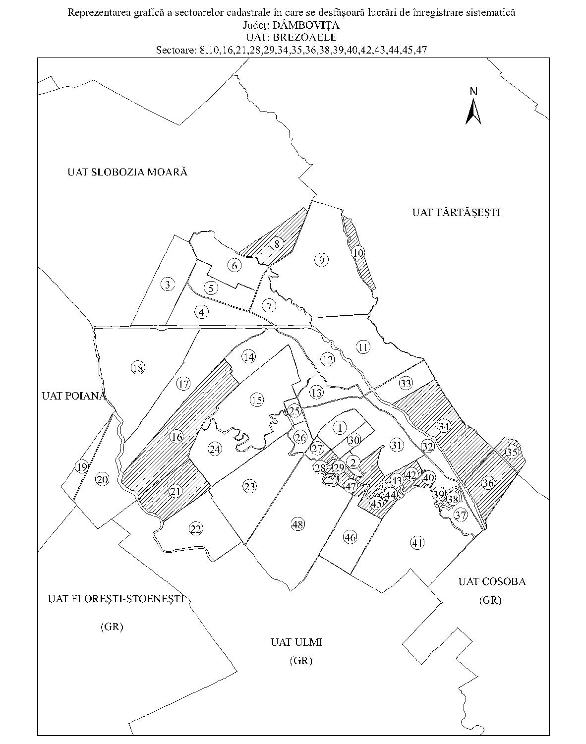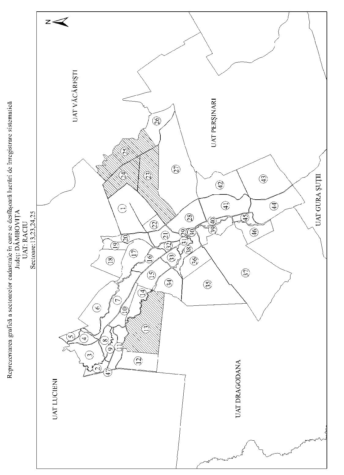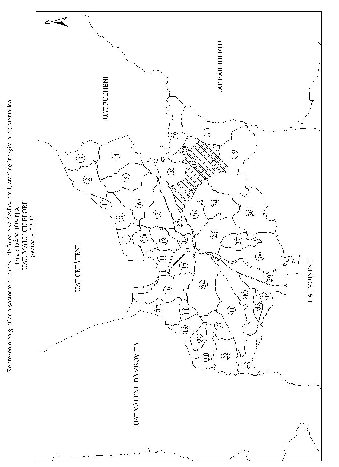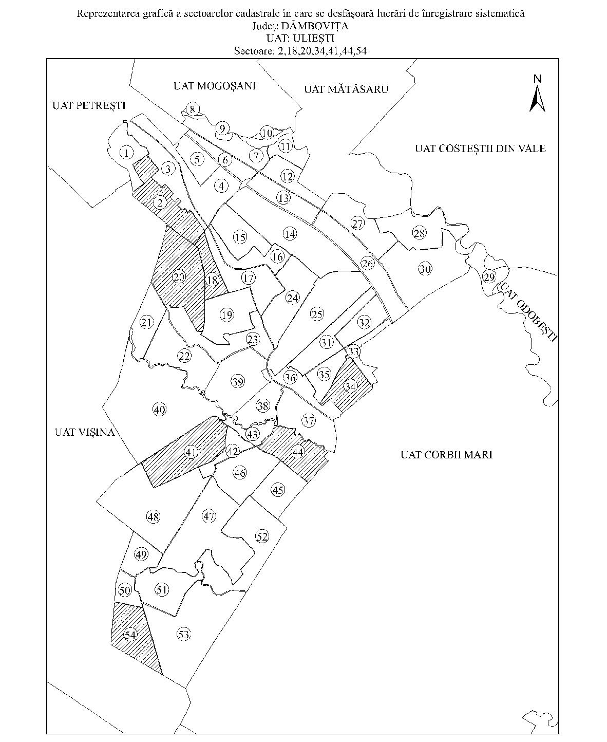 Având în vedere prevederile art. 11 alin. (1) din Legea cadastrului şi a publicităţii imobiliare nr. 7/1996, republicată, cu modificările şi completările ulterioare, şi ale art. 15 alin. (3) din Regulamentul de organizare şi funcţionare a Agenţiei Naţionale de Cadastru şi Publicitate Imobiliară, aprobat prin Hotărârea Guvernului nr. 1.288/2012, cu modificările şi completările ulterioare, în temeiul art. 3 alin. (13) din Legea cadastrului şi a publicităţii imobiliare nr. 7/1996, republicată, cu modificările şi completările ulterioare, directorul general al Agenţiei Naţionale de Cadastru şi Publicitate Imobiliară emite prezentul ordin. Articolul 1 Se aprobă începerea lucrărilor de înregistrare sistematică a imobilelor, pe sectoare cadastrale, situate pe teritoriul a 9 unităţi administrativ-teritoriale din judeţul Dâmboviţa, după cum urmează: a)unitatea administrativ-teritorială Braniştea - sectoarele cadastrale nr. 4, 10 şi 27; b)unitatea administrativ-teritorială Brezoaele - sectoarele cadastrale nr. 8, 10, 16, 21, 28, 29, 34, 35, 36, 38, 39, 40, 42, 43, 44, 45 şi 47; c)unitatea administrativ-teritorială Doiceşti - sectoarele cadastrale nr. 36 şi 37; d)unitatea administrativ-teritorială Malu cu Flori - sectoarele cadastrale nr. 32 şi 33; e)unitatea administrativ-teritorială Morteni - sectoarele cadastrale nr. 2, 3, 6, 8, 9, 19, 20, 23 şi 28; f)unitatea administrativ-teritorială Moţăieni - sectoarele cadastrale nr. 14 şi 15; g)unitatea administrativ-teritorială Raciu - sectoarele cadastrale nr. 13, 23, 24 şi 25; h)unitatea administrativ-teritorială Răscăeţi - sectoarele cadastrale nr. 5, 10, 11, 20, 21, 24, 28, 30 şi 32; i)unitatea administrativ-teritorială Ulieşti - sectoarele cadastrale nr. 2, 18, 20, 34, 41, 44 şi 54. Articolul 2 Reprezentarea grafică a sectoarelor cadastrale în care se desfăşoară lucrările de înregistrare sistematică a imobilelor este prevăzută în anexele nr. 1-9 la prezentul ordin. Articolul 3 Anexele nr. 1-9*) fac parte integrantă din prezentul ordin. *) Anexele nr. 1-9 sunt reproduse în facsimil. Articolul 4 Prezentul ordin se publică în Monitorul Oficial al României, Partea I. Directorul general al Agenţiei Naţionale de Cadastru şi Publicitate Imobiliară, Radu Codruţ Ştefănescu ANEXA Nr. 1 ANEXA Nr. 2 ANEXA Nr. 3 ANEXA Nr. 4 ANEXA Nr. 5 ANEXA Nr. 6 ANEXA Nr. 7 ANEXA Nr. 8 ANEXA Nr. 9