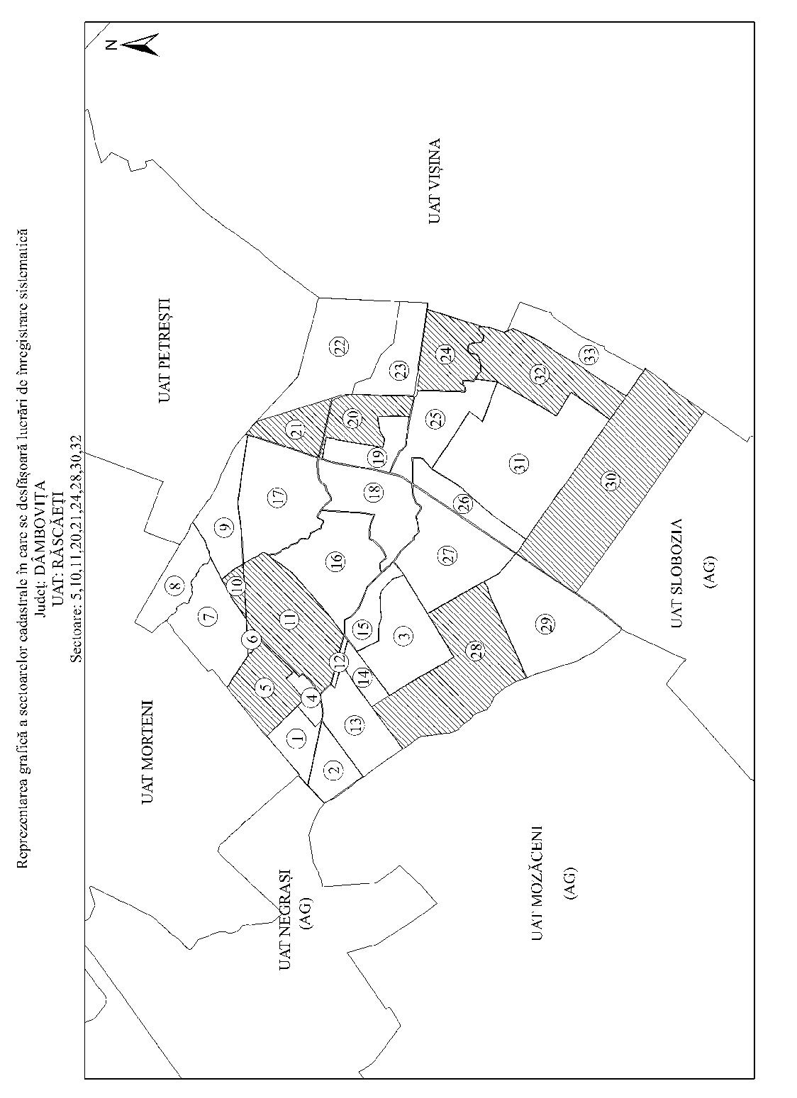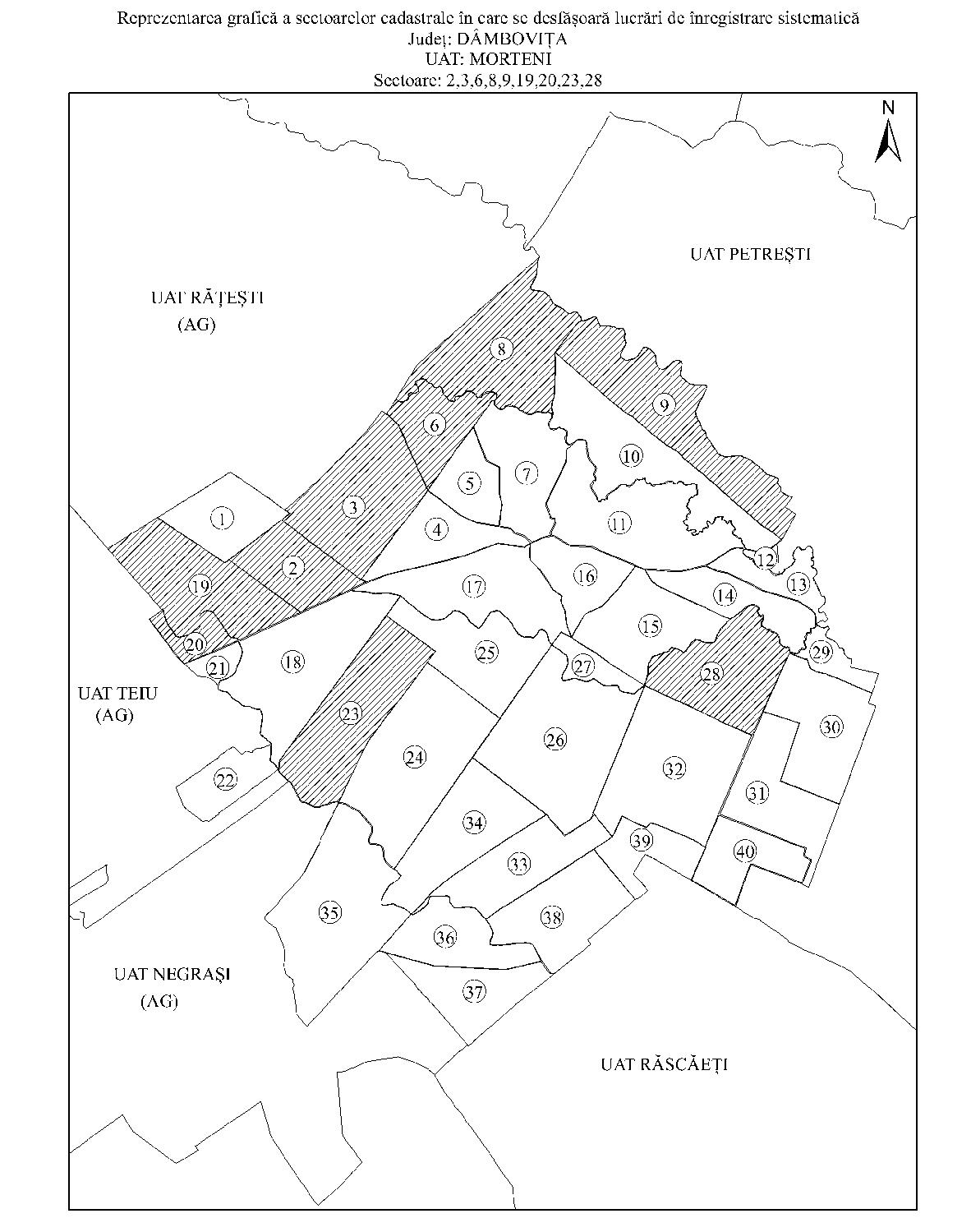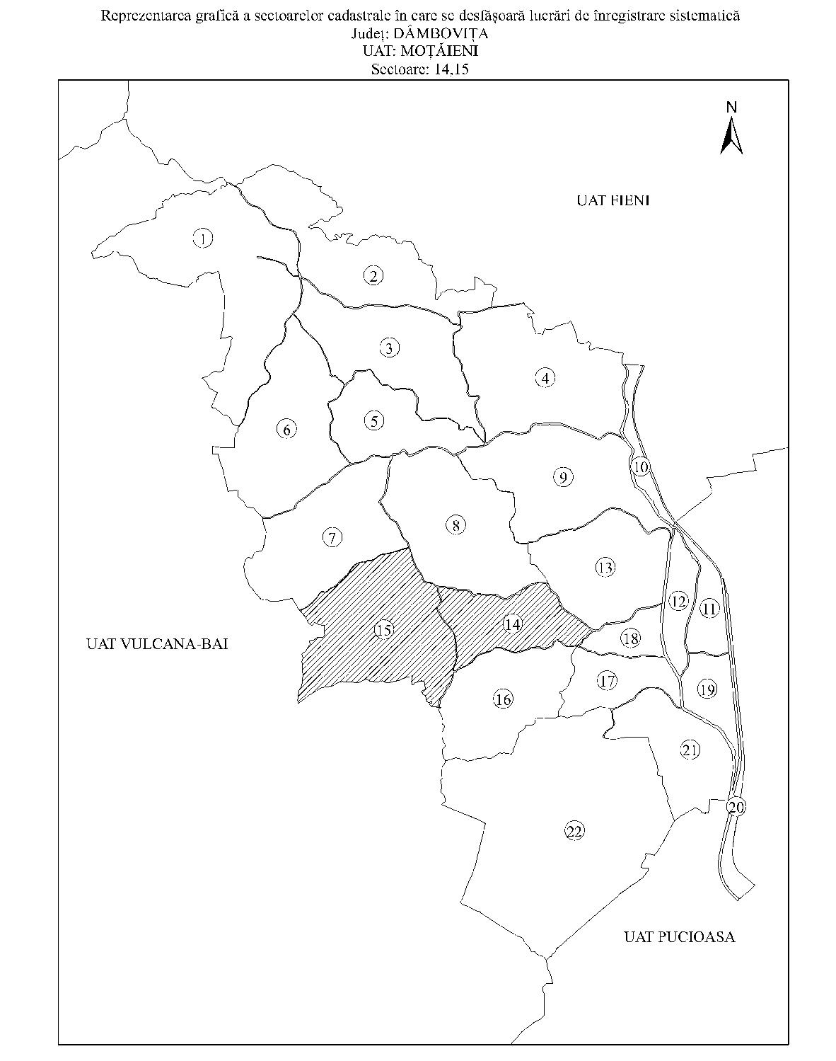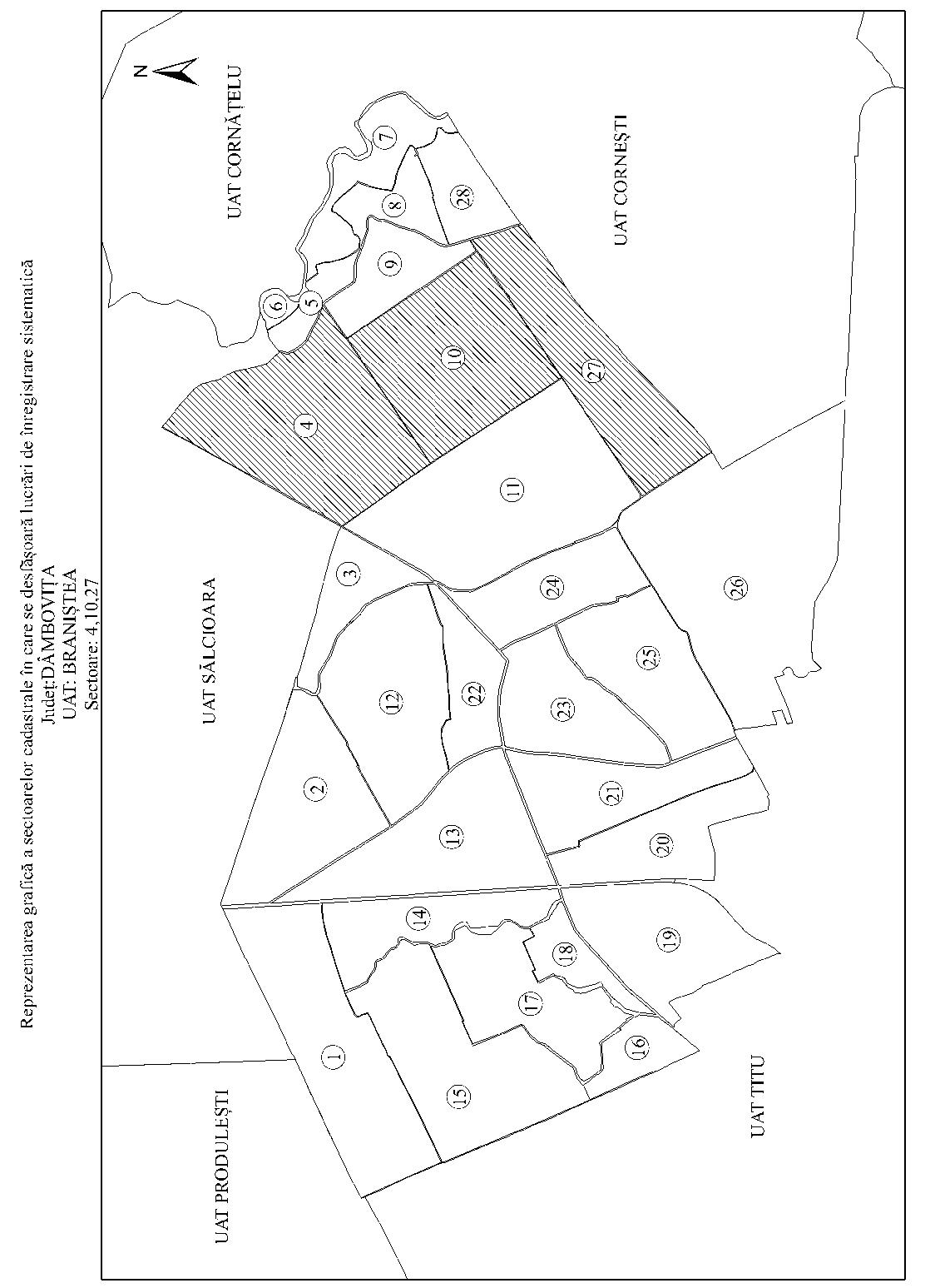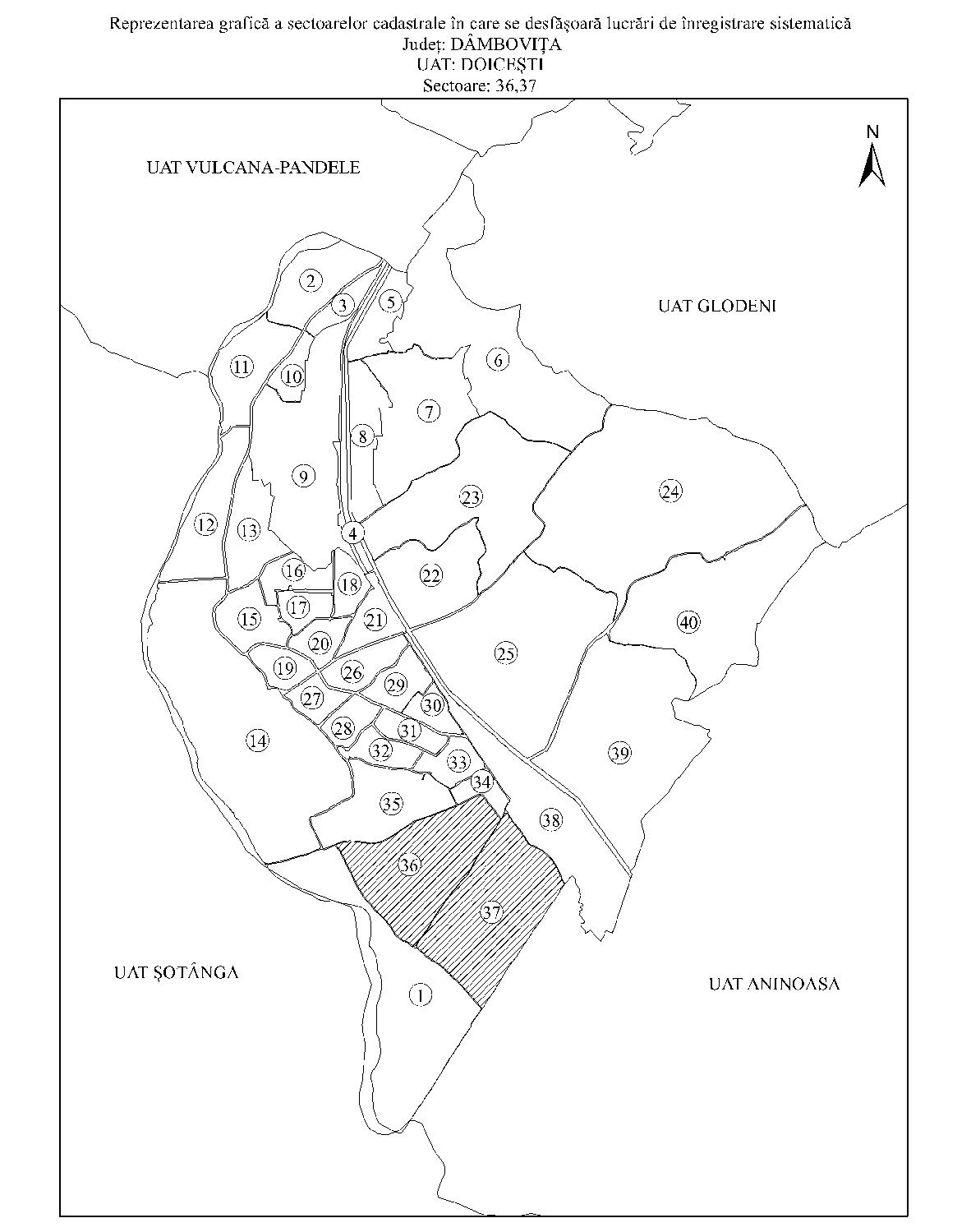 Având în vedere prevederile art. 11 alin. (1) din Legea cadastrului şi a publicităţii imobiliare nr. 7/1996, republicată, cu modificările şi completările ulterioare, şi ale art. 15 alin. (3) din Regulamentul de organizare şi funcţionare a Agenţiei Naţionale de Cadastru şi Publicitate Imobiliară, aprobat prin Hotărârea Guvernului nr. 1.288/2012, cu modificările şi completările ulterioare, în temeiul art. 3 alin. (13) din Legea cadastrului şi a publicităţii imobiliare nr. 7/1996, republicată, cu modificările şi completările ulterioare, directorul general al Agenţiei Naţionale de Cadastru şi Publicitate Imobiliară emite prezentul ordin. Articolul 1 Se aprobă începerea lucrărilor de înregistrare sistematică a imobilelor, pe sectoare cadastrale, situate pe teritoriul a 9 unităţi administrativ-teritoriale din judeţul Dâmboviţa, după cum urmează: a)unitatea administrativ-teritorială Braniştea - sectoarele cadastrale nr. 4, 10 şi 27; b)unitatea administrativ-teritorială Brezoaele - sectoarele cadastrale nr. 8, 10, 16, 21, 28, 29, 34, 35, 36, 38, 39, 40, 42, 43, 44, 45 şi 47; c)unitatea administrativ-teritorială Doiceşti - sectoarele cadastrale nr. 36 şi 37; d)unitatea administrativ-teritorială Malu cu Flori - sectoarele cadastrale nr. 32 şi 33; e)unitatea administrativ-teritorială Morteni - sectoarele cadastrale nr. 2, 3, 6, 8, 9, 19, 20, 23 şi 28; f)unitatea administrativ-teritorială Moţăieni - sectoarele cadastrale nr. 14 şi 15; g)unitatea administrativ-teritorială Raciu - sectoarele cadastrale nr. 13, 23, 24 şi 25; h)unitatea administrativ-teritorială Răscăeţi - sectoarele cadastrale nr. 5, 10, 11, 20, 21, 24, 28, 30 şi 32; i)unitatea administrativ-teritorială Ulieşti - sectoarele cadastrale nr. 2, 18, 20, 34, 41, 44 şi 54. Articolul 2 Reprezentarea grafică a sectoarelor cadastrale în care se desfăşoară lucrările de înregistrare sistematică a imobilelor este prevăzută în anexele nr. 1-9 la prezentul ordin. Articolul 3 Anexele nr. 1-9*) fac parte integrantă din prezentul ordin. *) Anexele nr. 1-9 sunt reproduse în facsimil. Articolul 4 Prezentul ordin se publică în Monitorul Oficial al României, Partea I. Directorul general al Agenţiei Naţionale de Cadastru şi Publicitate Imobiliară, Radu Codruţ Ştefănescu ANEXA Nr. 1 ANEXA Nr. 2 ANEXA Nr. 3 ANEXA Nr. 4 ANEXA Nr. 5 ANEXA Nr. 6 ANEXA Nr. 7 ANEXA Nr. 8 ANEXA Nr. 9