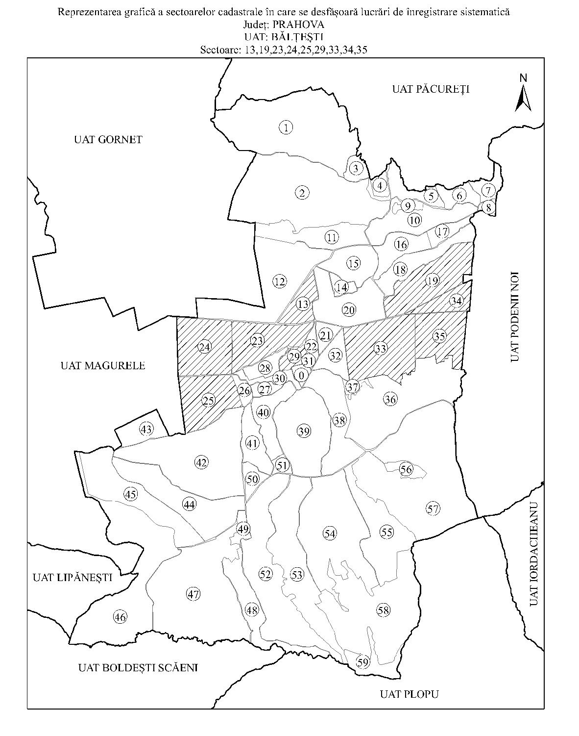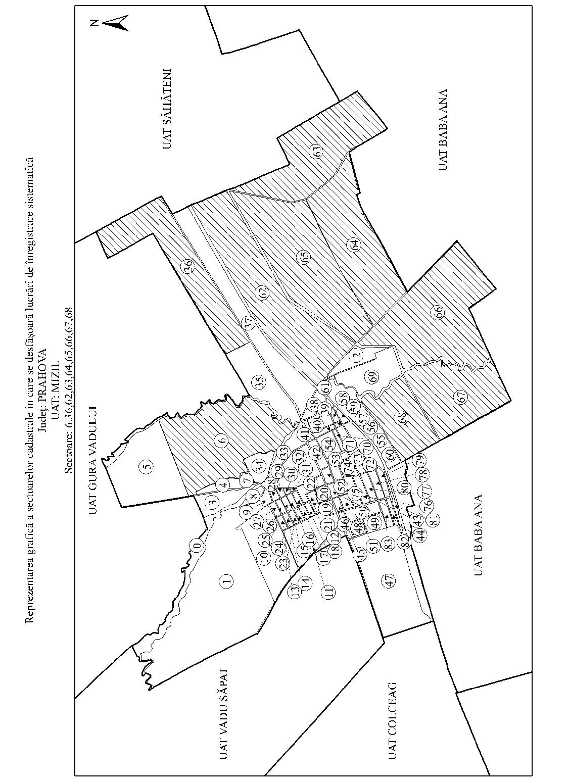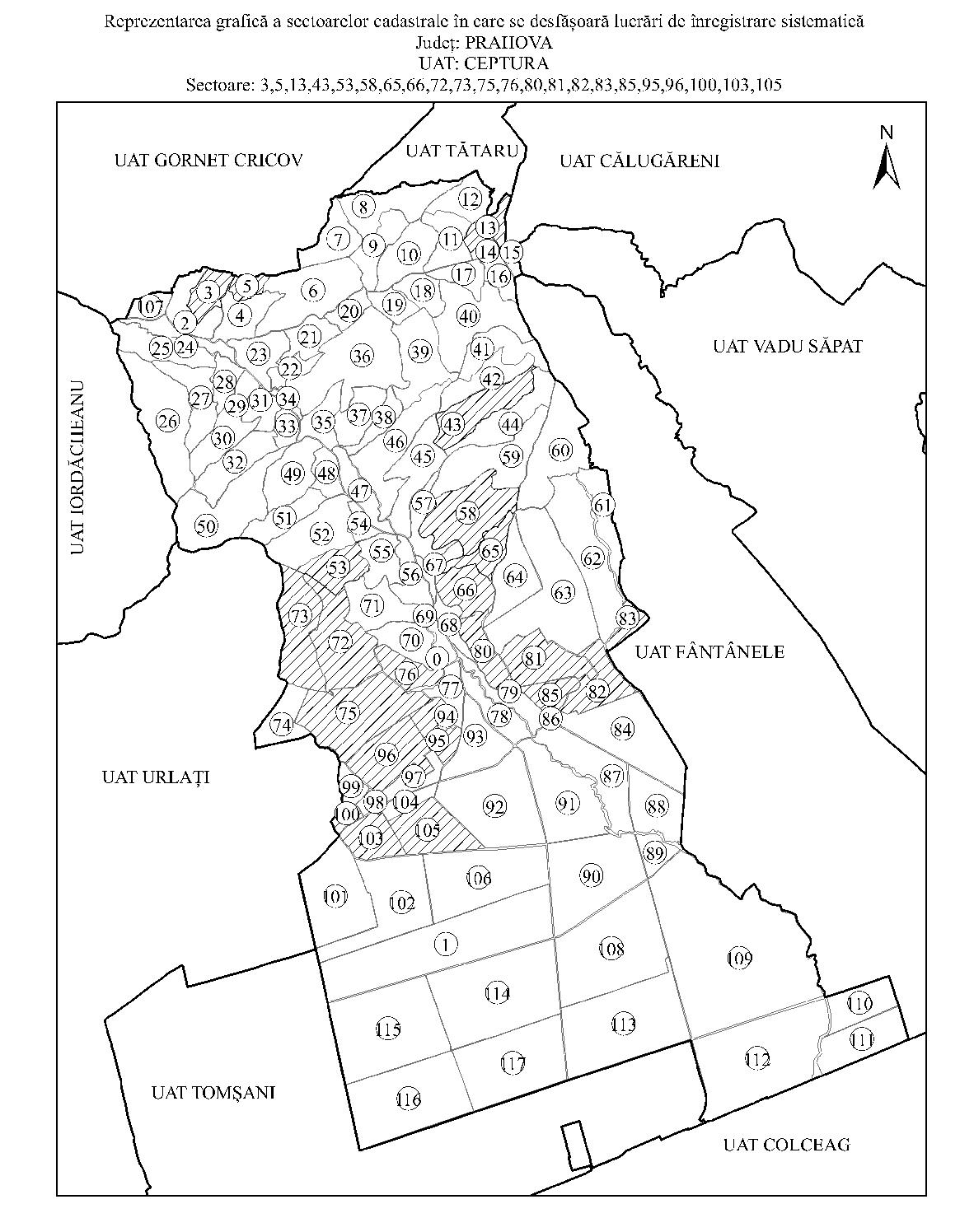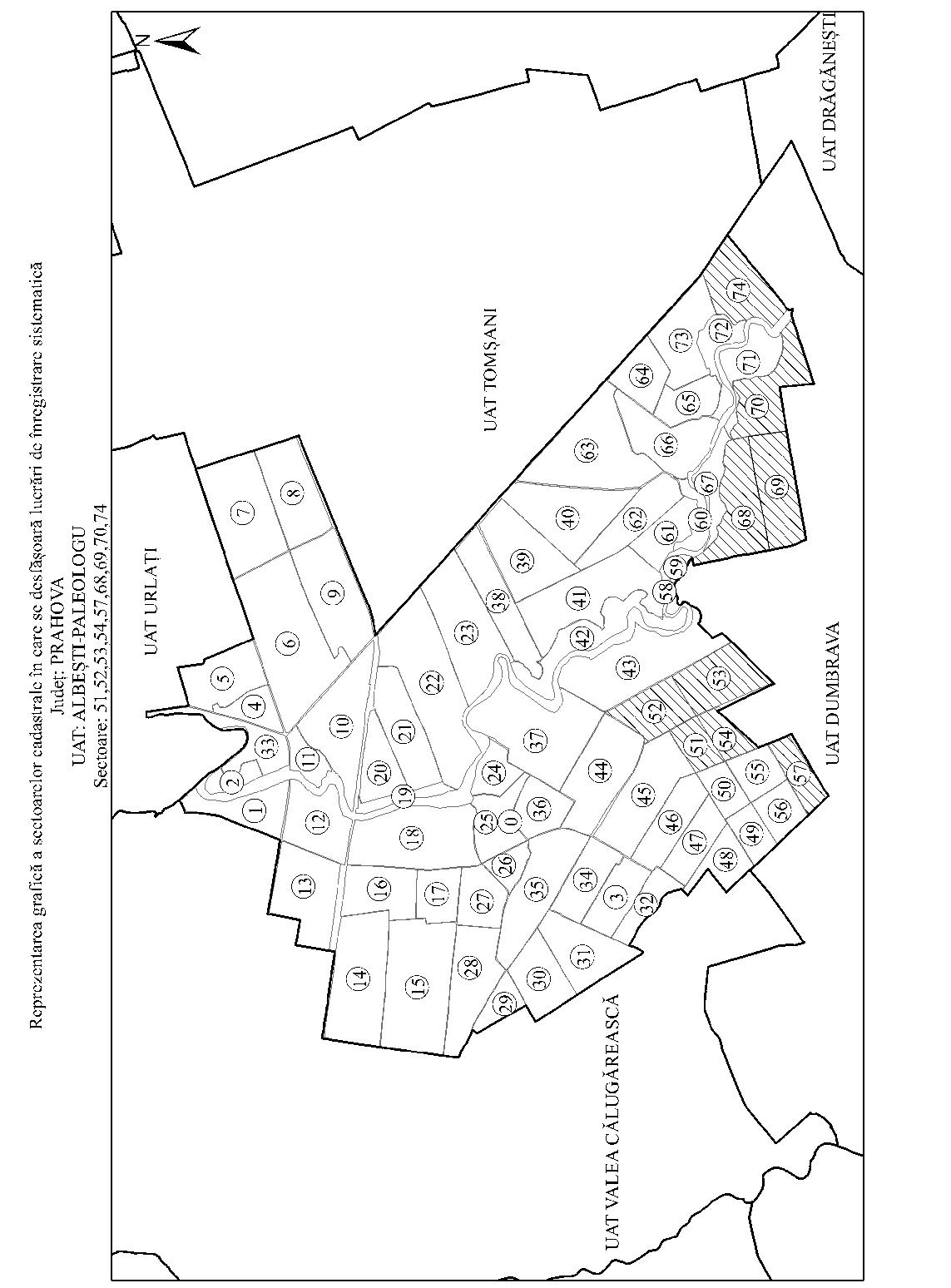 Având în vedere prevederile art. 11 alin. (1) din Legea cadastrului şi a publicităţii imobiliare nr. 7/1996, republicată, cu modificările şi completările ulterioare, şi ale art. 15 alin. (3) din Regulamentul de organizare şi funcţionare a Agenţiei Naţionale de Cadastru şi Publicitate Imobiliară, aprobat prin Hotărârea Guvernului nr. 1.288/2012, cu modificările şi completările ulterioare,în temeiul art. 3 alin. (13) din Legea cadastrului şi a publicităţii imobiliare nr. 7/1996, republicată, cu modificările şi completările ulterioare,directorul general al Agenţiei Naţionale de Cadastru şi Publicitate Imobiliară emite prezentul ordin. Articolul 1Se aprobă începerea lucrărilor de înregistrare sistematică a imobilelor, pe sectoare cadastrale, situate pe teritoriul a 10 unităţi administrativ-teritoriale din judeţul Prahova, după cum urmează: a)unitatea administrativ-teritorială Albeşti-Paleologu - sectoarele cadastrale nr. 51, 52, 53, 54, 57, 68, 69, 70 şi 74; b)unitatea administrativ-teritorială Bălţeşti - sectoarele cadastrale nr. 13, 19, 23, 24, 25, 29, 33, 34 şi 35; c)unitatea administrativ-teritorială Blejoi - sectoarele cadastrale nr. 4, 5, 8, 22, 23 şi 32; d)unitatea administrativ-teritorială Ceptura - sectoarele cadastrale nr. 3, 5, 13, 43, 53, 58, 65, 66, 72, 73, 75, 76, 80, 81, 82, 83, 85, 95, 96, 100, 103 şi 105; e)unitatea administrativ-teritorială Colceag - sectoarele cadastrale nr. 7, 8, 9, 10, 25, 39 şi 49; f)unitatea administrativ-teritorială Fântânele - sectoarele cadastrale nr. 12, 13, 14, 16, 17, 18, 19, 20, 21, 28, 32, 33, 34 şi 35; g)unitatea administrativ-teritorială Gura Vitioarei - sectoarele cadastrale nr. 46, 47, 53 şi 54; h)unitatea administrativ-teritorială Mizil - sectoarele cadastrale nr. 6, 36, 62, 63, 64, 65, 66, 67 şi 68; i)unitatea administrativ-teritorială Sălciile - sectoarele cadastrale nr. 7, 8, 12, 16, 17, 18, 37 şi 38; j)unitatea administrativ-teritorială Tomşani - sectoarele cadastrale nr. 19, 26, 28 şi 32. Articolul 2Reprezentarea grafică a sectoarelor cadastrale în care se desfăşoară lucrările de înregistrare sistematică a imobilelor este prevăzută în anexele nr. 1-10 la prezentul ordin. Articolul 3Anexele nr. 1-10*) fac parte integrantă din prezentul ordin.*) Anexele nr. 1-10 sunt reproduse în facsimil. Articolul 4 Prezentul ordin se publică în Monitorul Oficial al României, Partea I. Directorul general al Agenţiei Naţionale de Cadastru şi Publicitate Imobiliară,Radu Codruţ Ştefănescu ANEXA Nr. 1