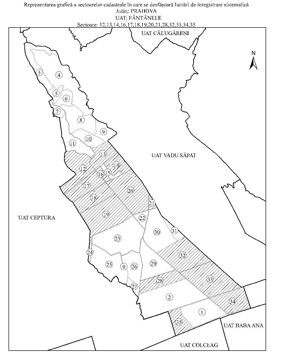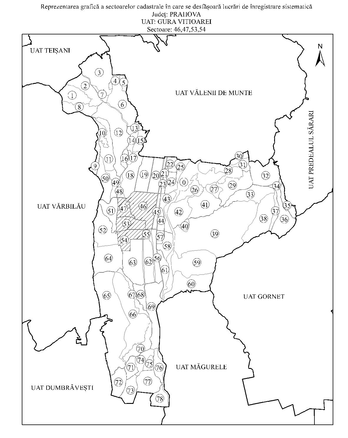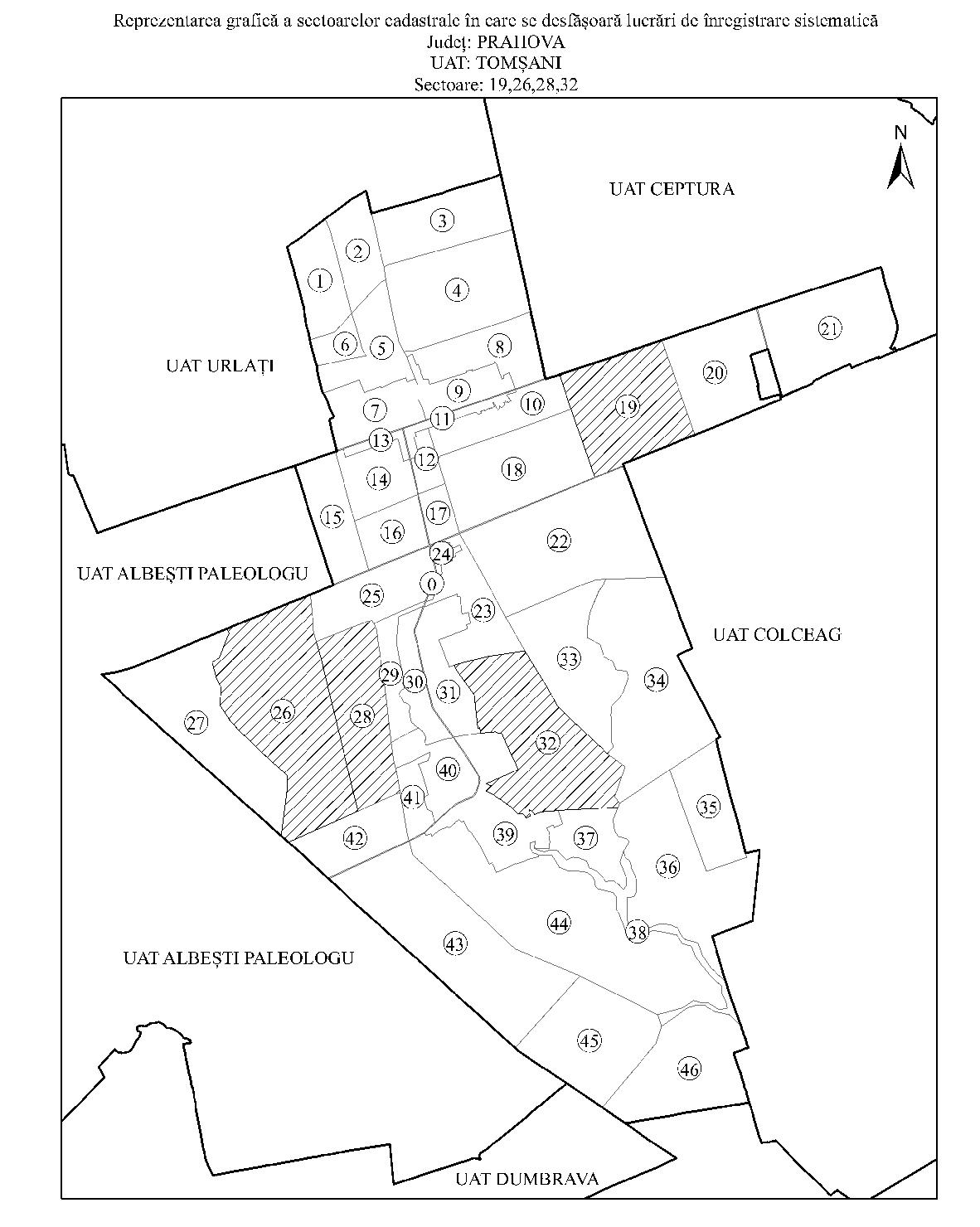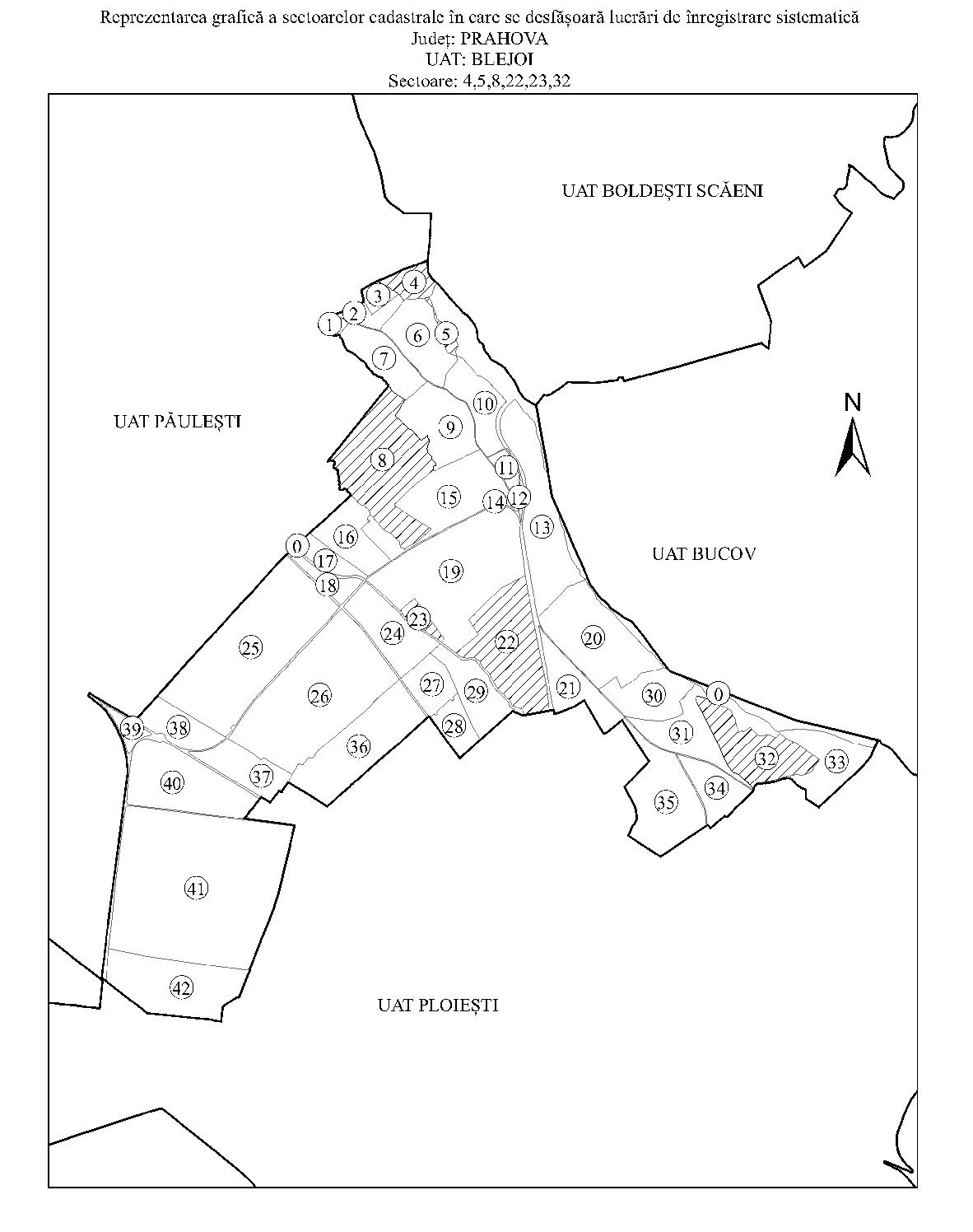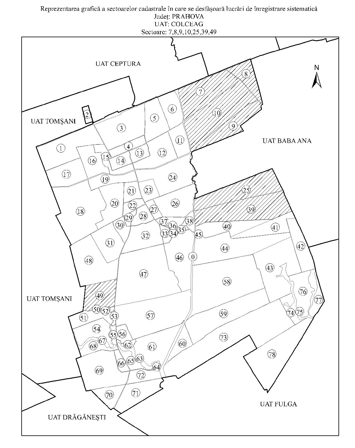 Având în vedere prevederile art. 11 alin. (1) din Legea cadastrului şi a publicităţii imobiliare nr. 7/1996, republicată, cu modificările şi completările ulterioare, şi ale art. 15 alin. (3) din Regulamentul de organizare şi funcţionare a Agenţiei Naţionale de Cadastru şi Publicitate Imobiliară, aprobat prin Hotărârea Guvernului nr. 1.288/2012, cu modificările şi completările ulterioare,în temeiul art. 3 alin. (13) din Legea cadastrului şi a publicităţii imobiliare nr. 7/1996, republicată, cu modificările şi completările ulterioare,directorul general al Agenţiei Naţionale de Cadastru şi Publicitate Imobiliară emite prezentul ordin. Articolul 1Se aprobă începerea lucrărilor de înregistrare sistematică a imobilelor, pe sectoare cadastrale, situate pe teritoriul a 10 unităţi administrativ-teritoriale din judeţul Prahova, după cum urmează: a)unitatea administrativ-teritorială Albeşti-Paleologu - sectoarele cadastrale nr. 51, 52, 53, 54, 57, 68, 69, 70 şi 74; b)unitatea administrativ-teritorială Bălţeşti - sectoarele cadastrale nr. 13, 19, 23, 24, 25, 29, 33, 34 şi 35; c)unitatea administrativ-teritorială Blejoi - sectoarele cadastrale nr. 4, 5, 8, 22, 23 şi 32; d)unitatea administrativ-teritorială Ceptura - sectoarele cadastrale nr. 3, 5, 13, 43, 53, 58, 65, 66, 72, 73, 75, 76, 80, 81, 82, 83, 85, 95, 96, 100, 103 şi 105; e)unitatea administrativ-teritorială Colceag - sectoarele cadastrale nr. 7, 8, 9, 10, 25, 39 şi 49; f)unitatea administrativ-teritorială Fântânele - sectoarele cadastrale nr. 12, 13, 14, 16, 17, 18, 19, 20, 21, 28, 32, 33, 34 şi 35; g)unitatea administrativ-teritorială Gura Vitioarei - sectoarele cadastrale nr. 46, 47, 53 şi 54; h)unitatea administrativ-teritorială Mizil - sectoarele cadastrale nr. 6, 36, 62, 63, 64, 65, 66, 67 şi 68; i)unitatea administrativ-teritorială Sălciile - sectoarele cadastrale nr. 7, 8, 12, 16, 17, 18, 37 şi 38; j)unitatea administrativ-teritorială Tomşani - sectoarele cadastrale nr. 19, 26, 28 şi 32. Articolul 2Reprezentarea grafică a sectoarelor cadastrale în care se desfăşoară lucrările de înregistrare sistematică a imobilelor este prevăzută în anexele nr. 1-10 la prezentul ordin. Articolul 3Anexele nr. 1-10*) fac parte integrantă din prezentul ordin.*) Anexele nr. 1-10 sunt reproduse în facsimil. Articolul 4 Prezentul ordin se publică în Monitorul Oficial al României, Partea I. Directorul general al Agenţiei Naţionale de Cadastru şi Publicitate Imobiliară,Radu Codruţ Ştefănescu ANEXA Nr. 1