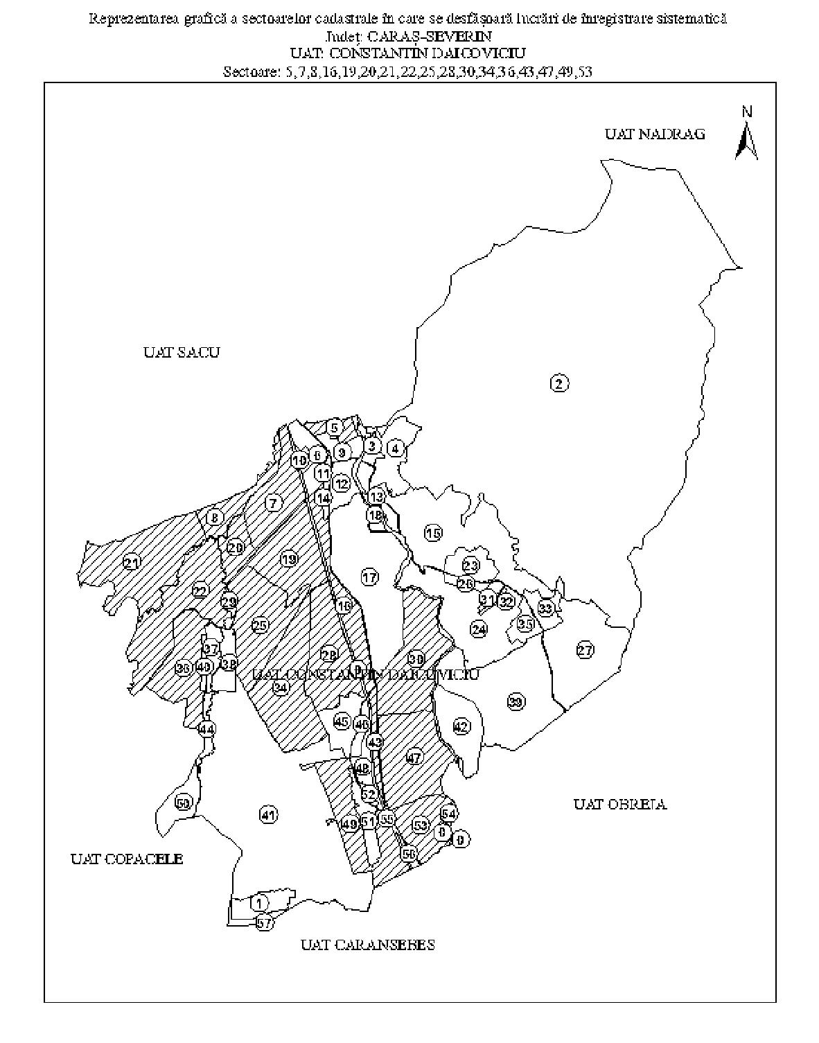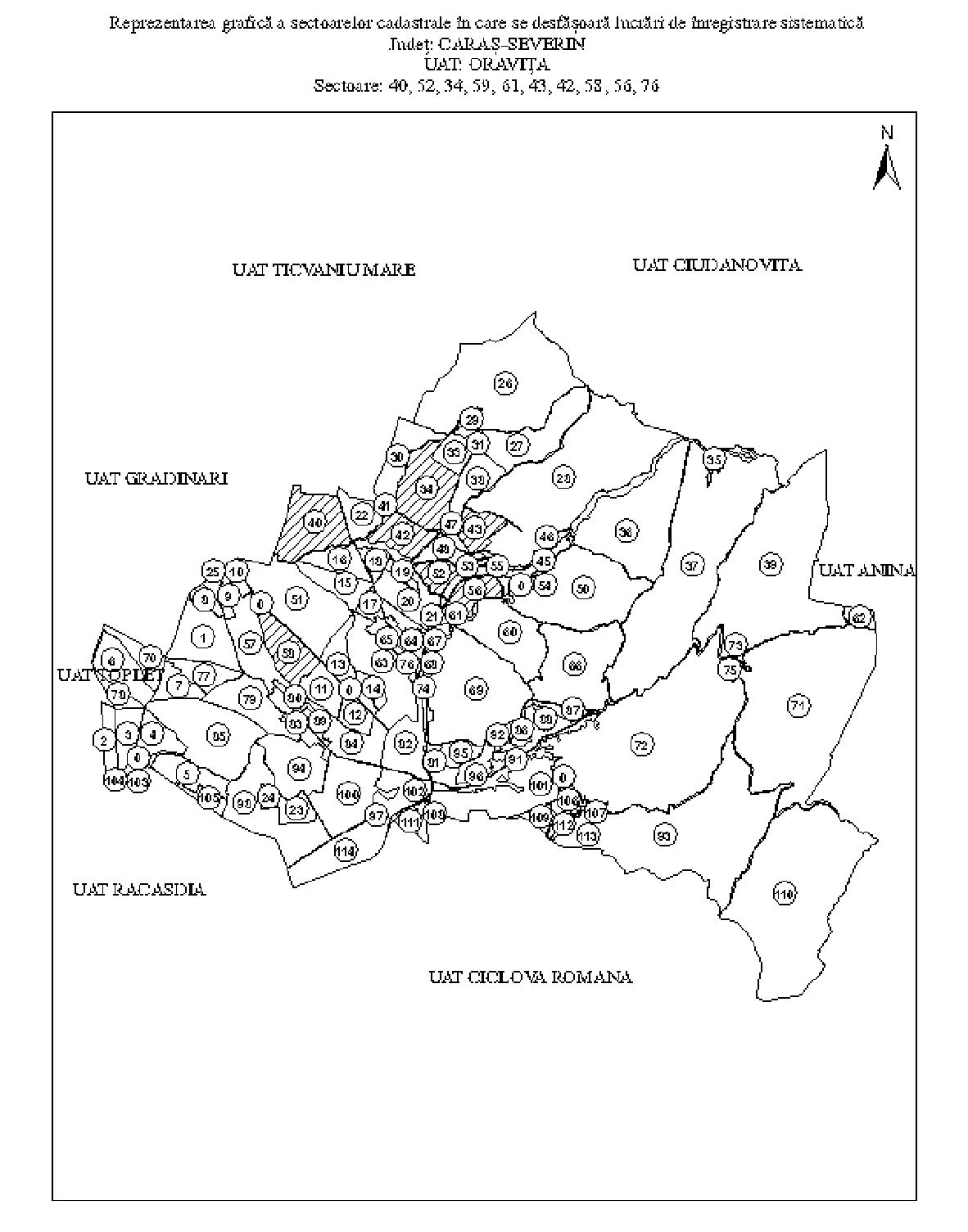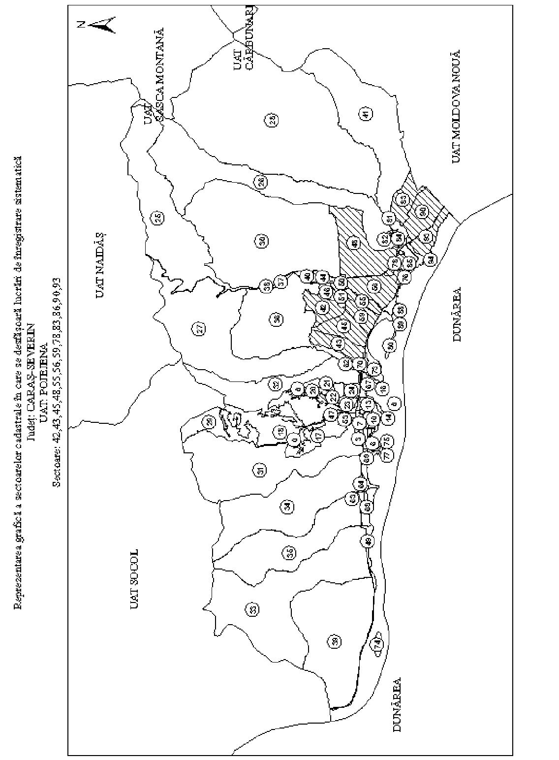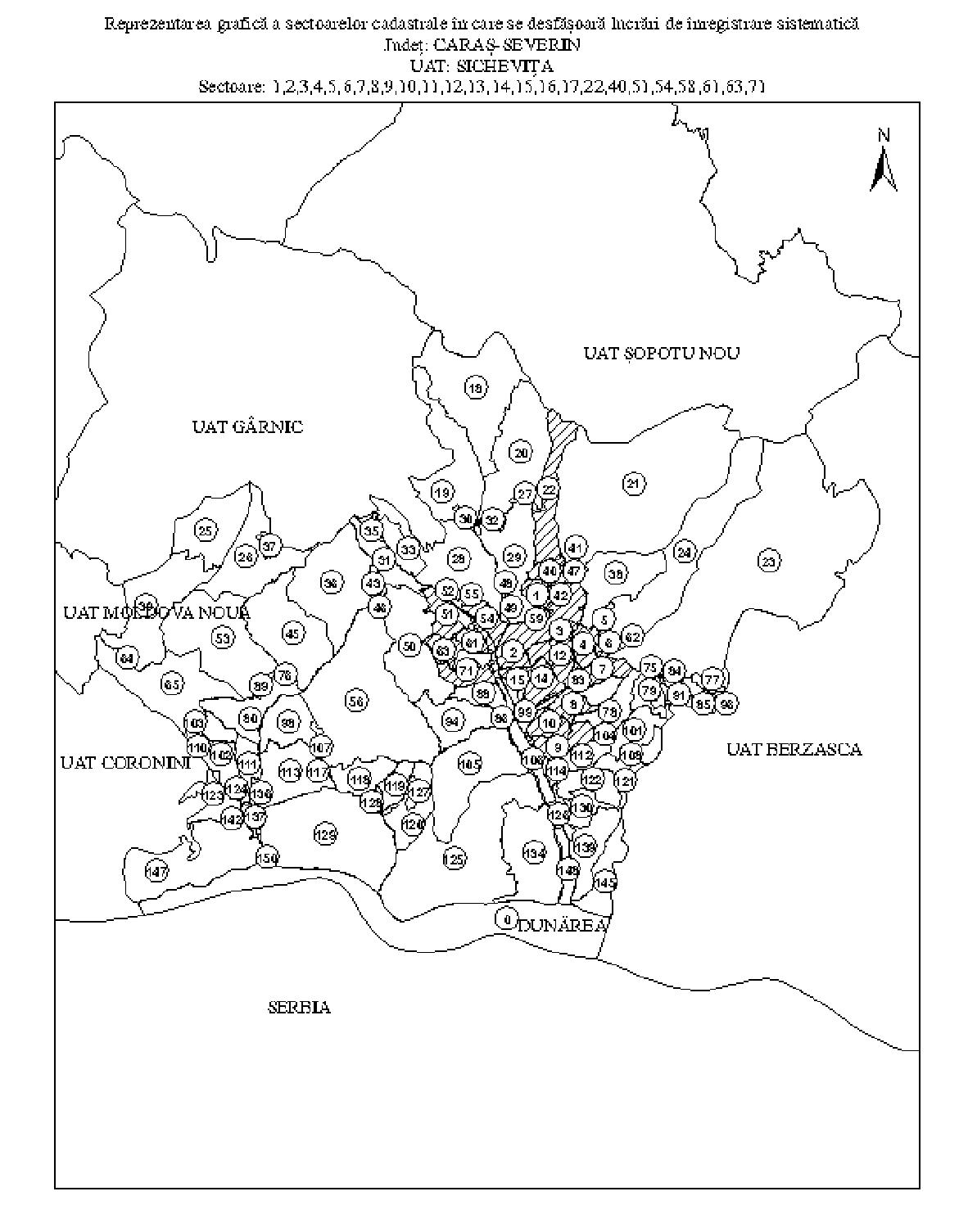 Având în vedere prevederile art. 11 alin. (1) din Legea cadastrului şi a publicităţii imobiliare nr. 7/1996, republicată, cu modificările şi completările ulterioare, şi ale art. 15 alin. (3) din Regulamentul de organizare şi funcţionare a Agenţiei Naţionale de Cadastru şi Publicitate Imobiliară, aprobat prin Hotărârea Guvernului nr. 1.288/2012, cu modificările şi completările ulterioare, în temeiul art. 3 alin. (13) din Legea cadastrului şi a publicităţii imobiliare nr. 7/1996, republicată, cu modificările şi completările ulterioare, directorul general al Agenţiei Naţionale de Cadastru şi Publicitate Imobiliară emite prezentul ordin. Articolul 1 Se aprobă începerea lucrărilor de înregistrare sistematică a imobilelor, pe sectoare cadastrale, situate pe teritoriul a 19 unităţi administrativ–teritoriale din judeţul Caraş-Severin, după cum urmează: a)unitatea administrativ-teritorială Bănia - sectoarele cadastrale nr. 4, 5, 7, 8 şi 14; b)unitatea administrativ-teritorială Băuţar - sectorul cadastral nr. 13; c)unitatea administrativ-teritorială Brebu - sectoarele cadastrale nr. 14, 15, 16, 18, 23, 25, 27, 28, 30, 31, 32, 36, 37 şi 39; d)unitatea administrativ-teritorială Constantin Daicoviciu - sectoarele cadastrale nr. 5, 7, 8, 16, 19, 20, 21, 22, 25, 28, 30, 34, 36, 43, 47, 49 şi 53; e)unitatea administrativ-teritorială Copăcele - sectorul cadastral nr. 28; f)unitatea administrativ-teritorială Dalboşeţ - sectoarele cadastrale nr. 1, 6, 7, 8, 10, 11, 13, 15, 23 şi 26; g)unitatea administrativ-teritorială Doclin - sectoarele cadastrale nr. 3, 4 şi 20; h)unitatea administrativ-teritorială Eftimie Murgu - sectorul cadastral nr. 1; i)unitatea administrativ-teritorială Fârliug - sectorul cadastral nr. 58; j)unitatea administrativ-teritorială Gârnic - sectoarele cadastrale nr. 5, 6, 7, 9 şi 10; k)unitatea administrativ-teritorială Glimboca - sectoarele cadastrale nr. 6, 8, 9, 11, 12, 13, 18, 23, 26, 29 şi 30; l)unitatea administrativ-teritorială Lăpuşnicu Mare - sectoarele cadastrale nr. 36 şi 38; m)unitatea administrativ-teritorială Obreja - sectoarele cadastrale nr. 28 şi 29; n)unitatea administrativ-teritorială Oraviţa - sectoarele cadastrale nr. 34, 40, 42, 43, 52, 56, 58, 59, 61 şi 76; o)unitatea administrativ-teritorială Pojejena - sectoarele cadastrale nr. 42, 43, 45, 48, 55, 56, 59, 78, 83, 86, 90 şi 93; p)unitatea administrativ-teritorială Sicheviţa - sectoarele cadastrale nr. 1, 2, 3, 4, 5, 6, 7, 8, 9, 10, 11, 12, 13, 14, 15, 16, 17, 22, 40, 51, 54, 55, 58, 61, 63 şi 71; q)unitatea administrativ-teritorială Socol - sectoarele cadastrale nr. 53, 54, 55, 56, 63, 64, 83, 93, 95 şi 96; r)unitatea administrativ-teritorială Teregova - sectoarele cadastrale nr. 11, 12, 13, 14, 18, 19, 20, 27, 28, 29, 30, 31, 32, 33, 35, 36, 37, 38, 39, 40, 41, 42, 43, 45, 46, 47, 48, 49, 50, 51, 52, 54, 55, 56, 57, 58, 59, 60, 61, 63, 64, 65, 69, 71, 72, 76, 77, 81, 85, 88, 89, 99, 103, 115, 116, 126, 128, 129 şi 136; s)unitatea administrativ-teritorială Turnu Ruieni - sectoarele cadastrale nr. 18, 24, 27, 36, 41, 42, 55, 57, 59, 66, 68, 70, 75, 76, 79, 80, 87 şi 89. Articolul 2 Reprezentarea grafică a sectoarelor cadastrale în care se desfăşoară lucrările de înregistrare sistematică a imobilelor este prevăzută în anexele nr. 1-19 la prezentul ordin. Articolul 3 Anexele nr. 1-19*) fac parte integrantă din prezentul ordin. *) Anexele nr. 1-19 sunt reproduse în facsimil. Articolul 4 Prezentul ordin se publică în Monitorul Oficial al României, Partea I. Directorul general al Agenţiei Naţionale de Cadastru şi Publicitate Imobiliară, Radu Codruţ Ştefănescu ANEXA Nr. 1