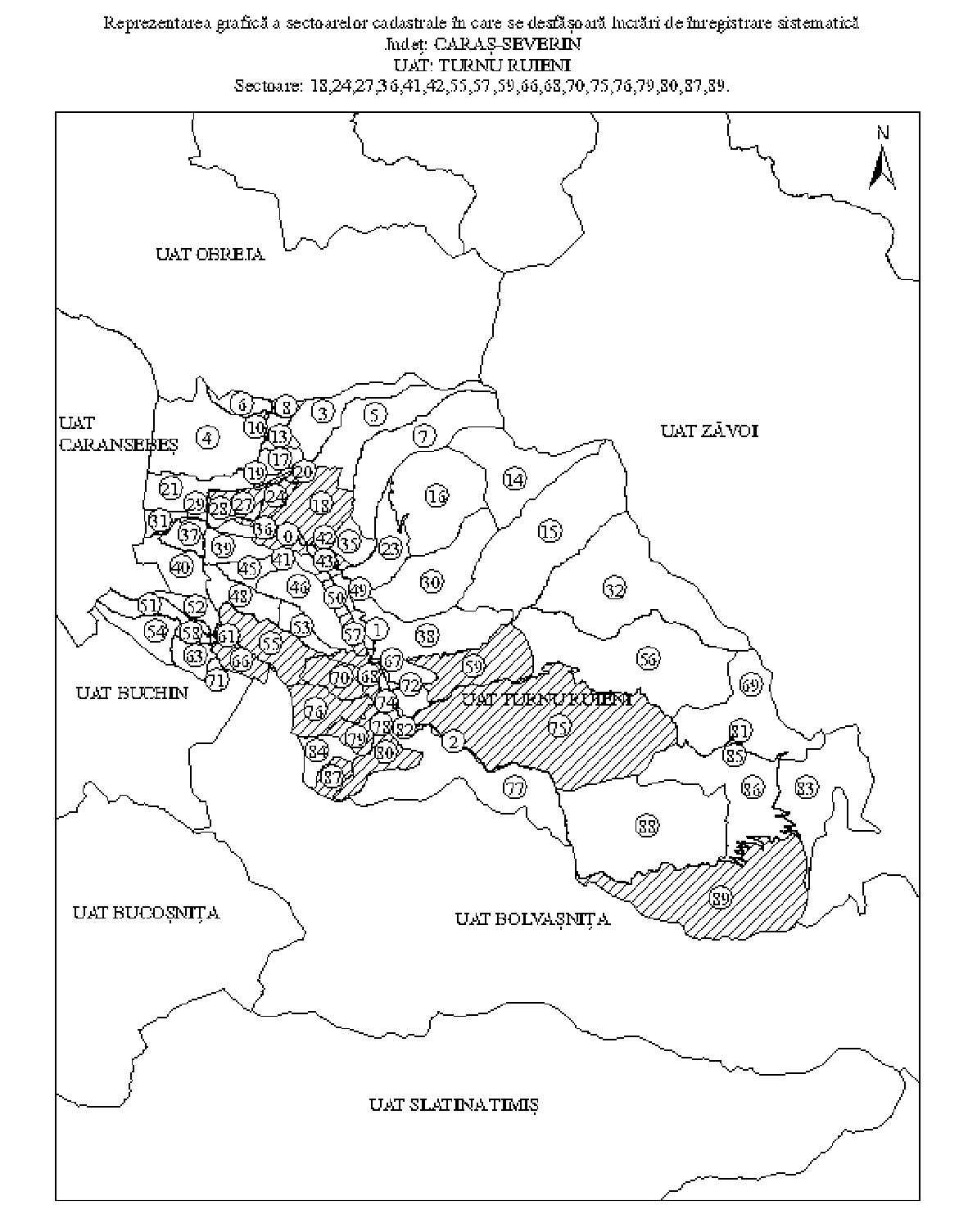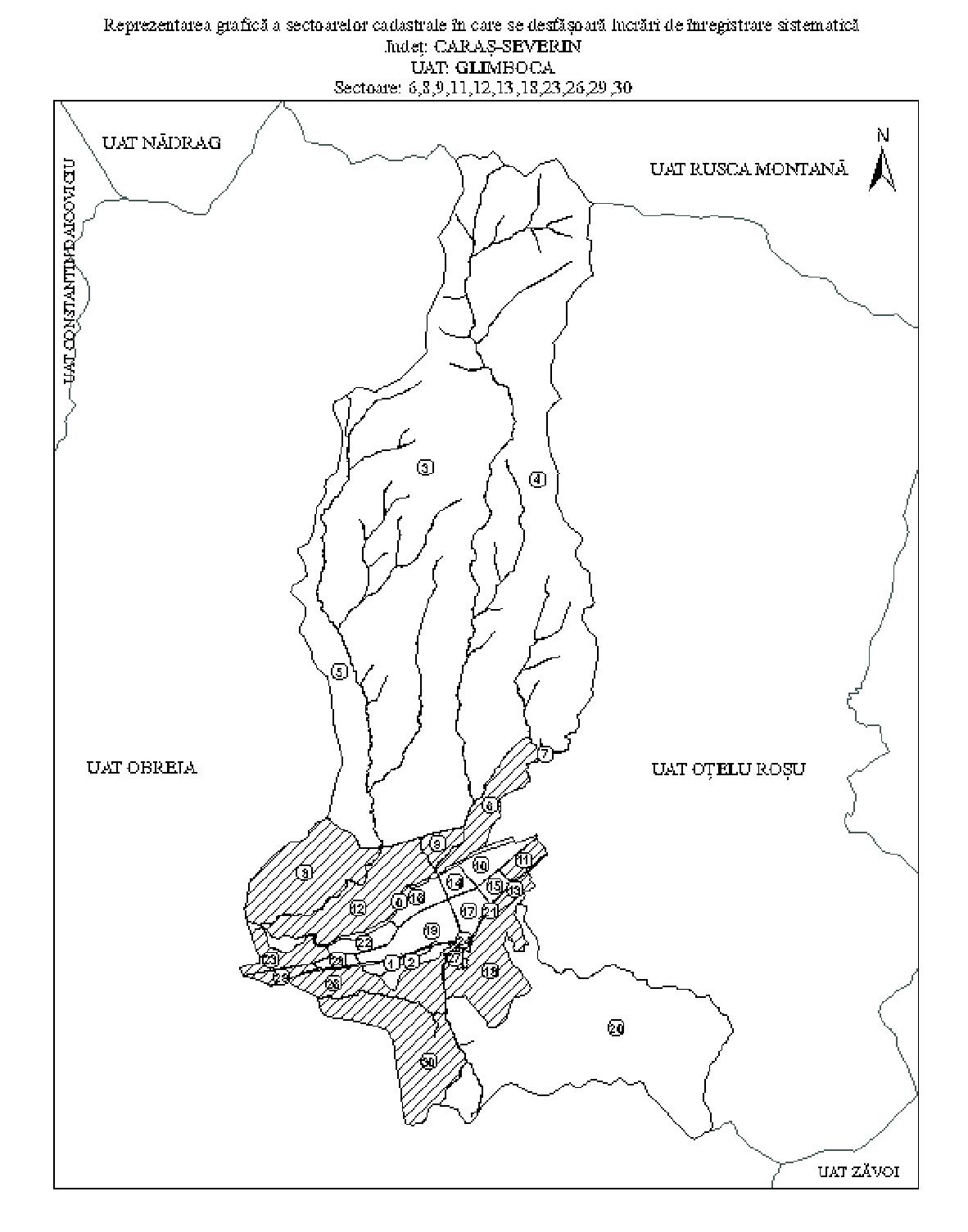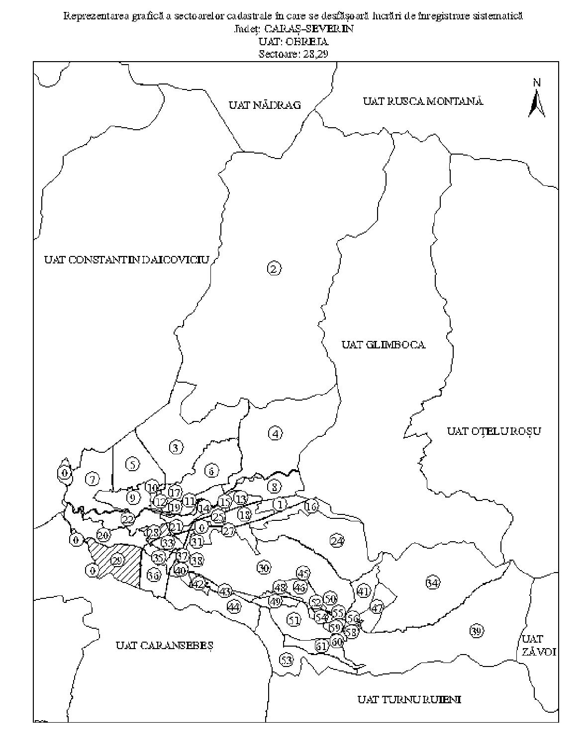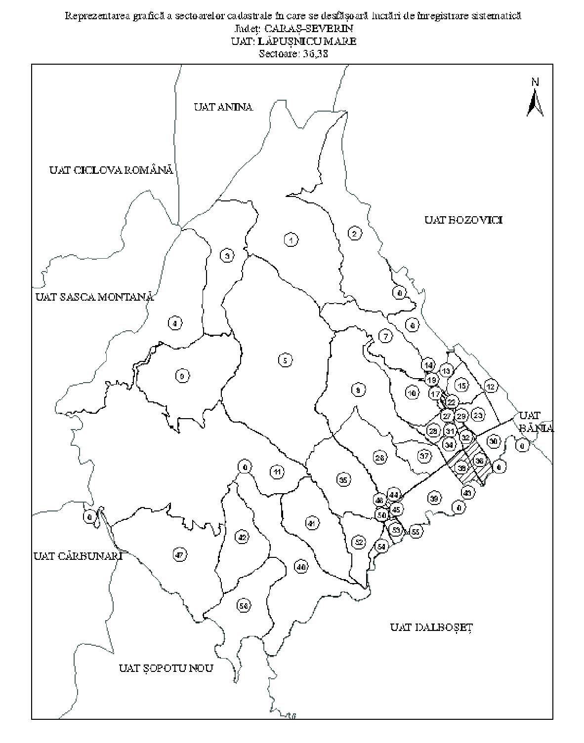 Având în vedere prevederile art. 11 alin. (1) din Legea cadastrului şi a publicităţii imobiliare nr. 7/1996, republicată, cu modificările şi completările ulterioare, şi ale art. 15 alin. (3) din Regulamentul de organizare şi funcţionare a Agenţiei Naţionale de Cadastru şi Publicitate Imobiliară, aprobat prin Hotărârea Guvernului nr. 1.288/2012, cu modificările şi completările ulterioare, în temeiul art. 3 alin. (13) din Legea cadastrului şi a publicităţii imobiliare nr. 7/1996, republicată, cu modificările şi completările ulterioare, directorul general al Agenţiei Naţionale de Cadastru şi Publicitate Imobiliară emite prezentul ordin. Articolul 1 Se aprobă începerea lucrărilor de înregistrare sistematică a imobilelor, pe sectoare cadastrale, situate pe teritoriul a 19 unităţi administrativ–teritoriale din judeţul Caraş-Severin, după cum urmează: a)unitatea administrativ-teritorială Bănia - sectoarele cadastrale nr. 4, 5, 7, 8 şi 14; b)unitatea administrativ-teritorială Băuţar - sectorul cadastral nr. 13; c)unitatea administrativ-teritorială Brebu - sectoarele cadastrale nr. 14, 15, 16, 18, 23, 25, 27, 28, 30, 31, 32, 36, 37 şi 39; d)unitatea administrativ-teritorială Constantin Daicoviciu - sectoarele cadastrale nr. 5, 7, 8, 16, 19, 20, 21, 22, 25, 28, 30, 34, 36, 43, 47, 49 şi 53; e)unitatea administrativ-teritorială Copăcele - sectorul cadastral nr. 28; f)unitatea administrativ-teritorială Dalboşeţ - sectoarele cadastrale nr. 1, 6, 7, 8, 10, 11, 13, 15, 23 şi 26; g)unitatea administrativ-teritorială Doclin - sectoarele cadastrale nr. 3, 4 şi 20; h)unitatea administrativ-teritorială Eftimie Murgu - sectorul cadastral nr. 1; i)unitatea administrativ-teritorială Fârliug - sectorul cadastral nr. 58; j)unitatea administrativ-teritorială Gârnic - sectoarele cadastrale nr. 5, 6, 7, 9 şi 10; k)unitatea administrativ-teritorială Glimboca - sectoarele cadastrale nr. 6, 8, 9, 11, 12, 13, 18, 23, 26, 29 şi 30; l)unitatea administrativ-teritorială Lăpuşnicu Mare - sectoarele cadastrale nr. 36 şi 38; m)unitatea administrativ-teritorială Obreja - sectoarele cadastrale nr. 28 şi 29; n)unitatea administrativ-teritorială Oraviţa - sectoarele cadastrale nr. 34, 40, 42, 43, 52, 56, 58, 59, 61 şi 76; o)unitatea administrativ-teritorială Pojejena - sectoarele cadastrale nr. 42, 43, 45, 48, 55, 56, 59, 78, 83, 86, 90 şi 93; p)unitatea administrativ-teritorială Sicheviţa - sectoarele cadastrale nr. 1, 2, 3, 4, 5, 6, 7, 8, 9, 10, 11, 12, 13, 14, 15, 16, 17, 22, 40, 51, 54, 55, 58, 61, 63 şi 71; q)unitatea administrativ-teritorială Socol - sectoarele cadastrale nr. 53, 54, 55, 56, 63, 64, 83, 93, 95 şi 96; r)unitatea administrativ-teritorială Teregova - sectoarele cadastrale nr. 11, 12, 13, 14, 18, 19, 20, 27, 28, 29, 30, 31, 32, 33, 35, 36, 37, 38, 39, 40, 41, 42, 43, 45, 46, 47, 48, 49, 50, 51, 52, 54, 55, 56, 57, 58, 59, 60, 61, 63, 64, 65, 69, 71, 72, 76, 77, 81, 85, 88, 89, 99, 103, 115, 116, 126, 128, 129 şi 136; s)unitatea administrativ-teritorială Turnu Ruieni - sectoarele cadastrale nr. 18, 24, 27, 36, 41, 42, 55, 57, 59, 66, 68, 70, 75, 76, 79, 80, 87 şi 89. Articolul 2 Reprezentarea grafică a sectoarelor cadastrale în care se desfăşoară lucrările de înregistrare sistematică a imobilelor este prevăzută în anexele nr. 1-19 la prezentul ordin. Articolul 3 Anexele nr. 1-19*) fac parte integrantă din prezentul ordin. *) Anexele nr. 1-19 sunt reproduse în facsimil. Articolul 4 Prezentul ordin se publică în Monitorul Oficial al României, Partea I. Directorul general al Agenţiei Naţionale de Cadastru şi Publicitate Imobiliară, Radu Codruţ Ştefănescu ANEXA Nr. 1