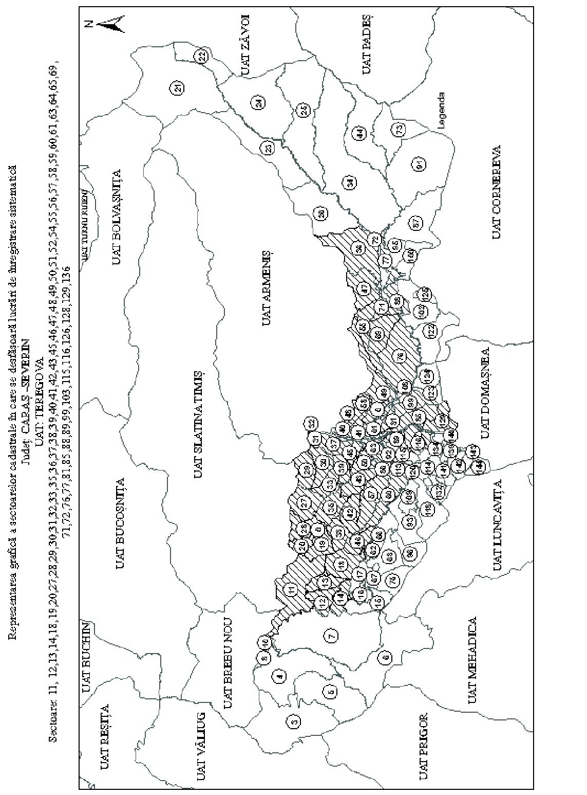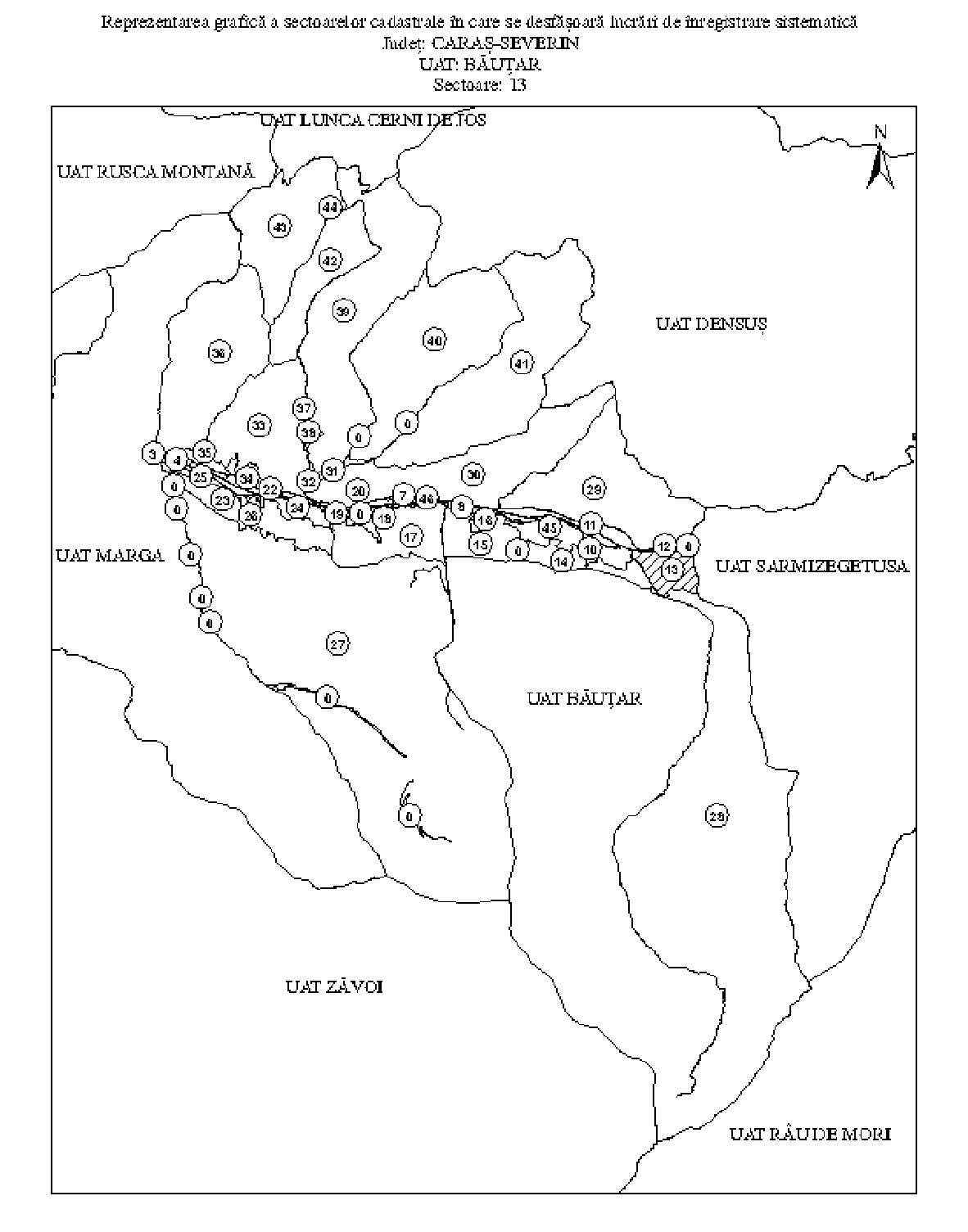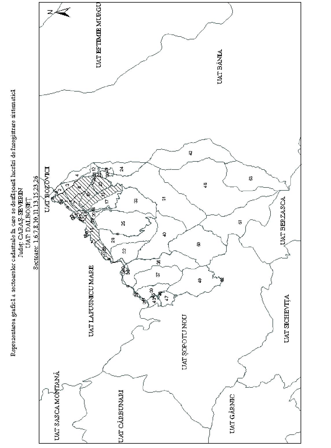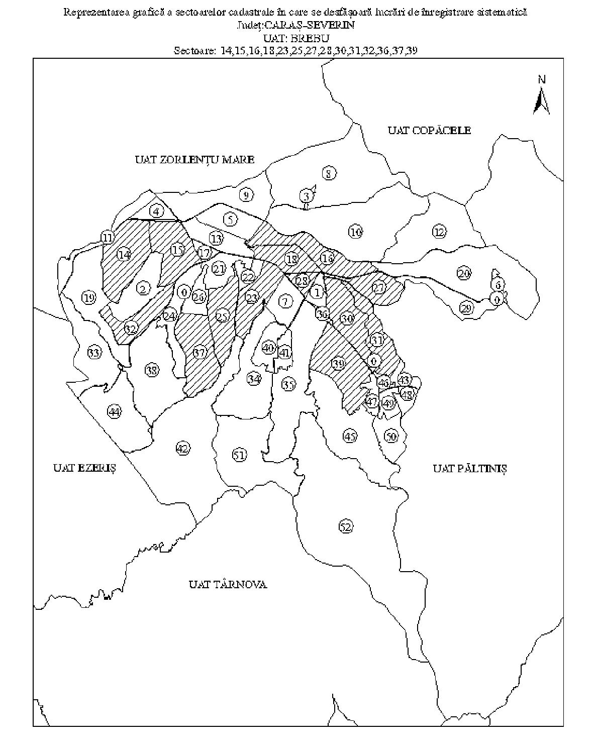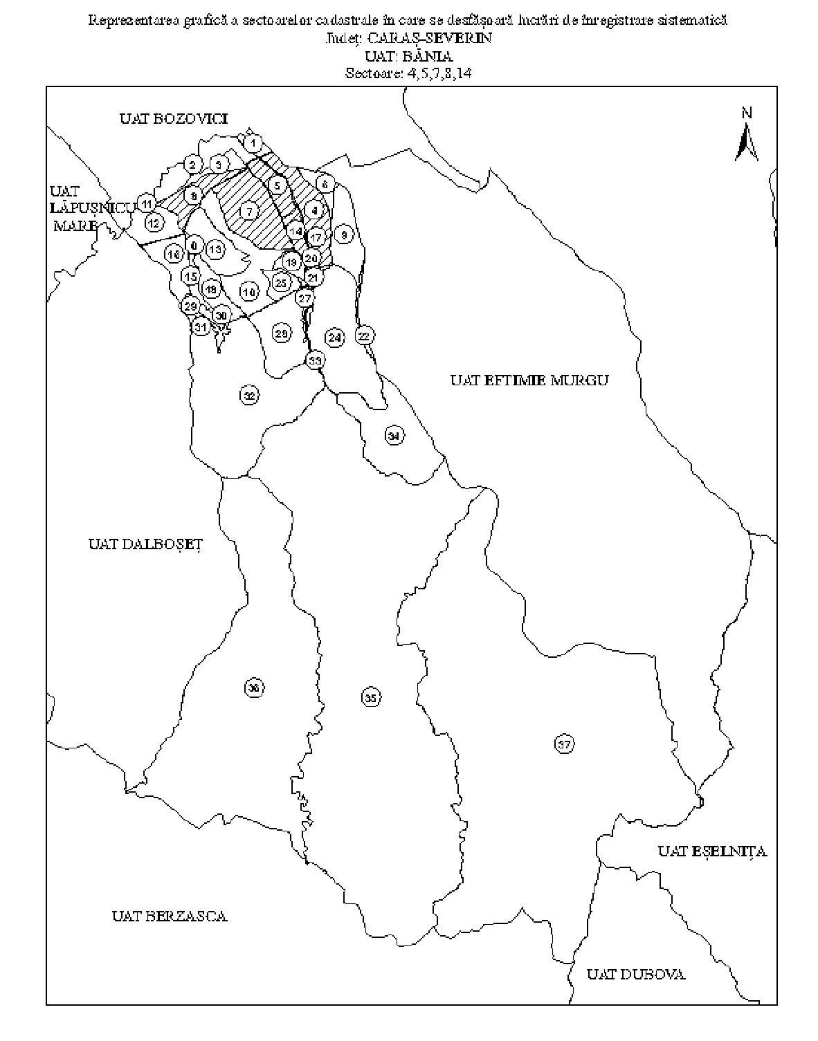 Având în vedere prevederile art. 11 alin. (1) din Legea cadastrului şi a publicităţii imobiliare nr. 7/1996, republicată, cu modificările şi completările ulterioare, şi ale art. 15 alin. (3) din Regulamentul de organizare şi funcţionare a Agenţiei Naţionale de Cadastru şi Publicitate Imobiliară, aprobat prin Hotărârea Guvernului nr. 1.288/2012, cu modificările şi completările ulterioare, în temeiul art. 3 alin. (13) din Legea cadastrului şi a publicităţii imobiliare nr. 7/1996, republicată, cu modificările şi completările ulterioare, directorul general al Agenţiei Naţionale de Cadastru şi Publicitate Imobiliară emite prezentul ordin. Articolul 1 Se aprobă începerea lucrărilor de înregistrare sistematică a imobilelor, pe sectoare cadastrale, situate pe teritoriul a 19 unităţi administrativ–teritoriale din judeţul Caraş-Severin, după cum urmează: a)unitatea administrativ-teritorială Bănia - sectoarele cadastrale nr. 4, 5, 7, 8 şi 14; b)unitatea administrativ-teritorială Băuţar - sectorul cadastral nr. 13; c)unitatea administrativ-teritorială Brebu - sectoarele cadastrale nr. 14, 15, 16, 18, 23, 25, 27, 28, 30, 31, 32, 36, 37 şi 39; d)unitatea administrativ-teritorială Constantin Daicoviciu - sectoarele cadastrale nr. 5, 7, 8, 16, 19, 20, 21, 22, 25, 28, 30, 34, 36, 43, 47, 49 şi 53; e)unitatea administrativ-teritorială Copăcele - sectorul cadastral nr. 28; f)unitatea administrativ-teritorială Dalboşeţ - sectoarele cadastrale nr. 1, 6, 7, 8, 10, 11, 13, 15, 23 şi 26; g)unitatea administrativ-teritorială Doclin - sectoarele cadastrale nr. 3, 4 şi 20; h)unitatea administrativ-teritorială Eftimie Murgu - sectorul cadastral nr. 1; i)unitatea administrativ-teritorială Fârliug - sectorul cadastral nr. 58; j)unitatea administrativ-teritorială Gârnic - sectoarele cadastrale nr. 5, 6, 7, 9 şi 10; k)unitatea administrativ-teritorială Glimboca - sectoarele cadastrale nr. 6, 8, 9, 11, 12, 13, 18, 23, 26, 29 şi 30; l)unitatea administrativ-teritorială Lăpuşnicu Mare - sectoarele cadastrale nr. 36 şi 38; m)unitatea administrativ-teritorială Obreja - sectoarele cadastrale nr. 28 şi 29; n)unitatea administrativ-teritorială Oraviţa - sectoarele cadastrale nr. 34, 40, 42, 43, 52, 56, 58, 59, 61 şi 76; o)unitatea administrativ-teritorială Pojejena - sectoarele cadastrale nr. 42, 43, 45, 48, 55, 56, 59, 78, 83, 86, 90 şi 93; p)unitatea administrativ-teritorială Sicheviţa - sectoarele cadastrale nr. 1, 2, 3, 4, 5, 6, 7, 8, 9, 10, 11, 12, 13, 14, 15, 16, 17, 22, 40, 51, 54, 55, 58, 61, 63 şi 71; q)unitatea administrativ-teritorială Socol - sectoarele cadastrale nr. 53, 54, 55, 56, 63, 64, 83, 93, 95 şi 96; r)unitatea administrativ-teritorială Teregova - sectoarele cadastrale nr. 11, 12, 13, 14, 18, 19, 20, 27, 28, 29, 30, 31, 32, 33, 35, 36, 37, 38, 39, 40, 41, 42, 43, 45, 46, 47, 48, 49, 50, 51, 52, 54, 55, 56, 57, 58, 59, 60, 61, 63, 64, 65, 69, 71, 72, 76, 77, 81, 85, 88, 89, 99, 103, 115, 116, 126, 128, 129 şi 136; s)unitatea administrativ-teritorială Turnu Ruieni - sectoarele cadastrale nr. 18, 24, 27, 36, 41, 42, 55, 57, 59, 66, 68, 70, 75, 76, 79, 80, 87 şi 89. Articolul 2 Reprezentarea grafică a sectoarelor cadastrale în care se desfăşoară lucrările de înregistrare sistematică a imobilelor este prevăzută în anexele nr. 1-19 la prezentul ordin. Articolul 3 Anexele nr. 1-19*) fac parte integrantă din prezentul ordin. *) Anexele nr. 1-19 sunt reproduse în facsimil. Articolul 4 Prezentul ordin se publică în Monitorul Oficial al României, Partea I. Directorul general al Agenţiei Naţionale de Cadastru şi Publicitate Imobiliară, Radu Codruţ Ştefănescu ANEXA Nr. 1