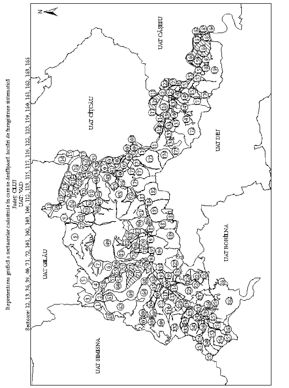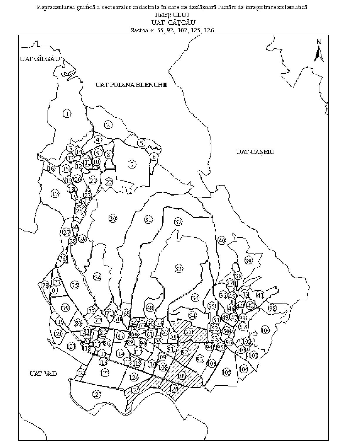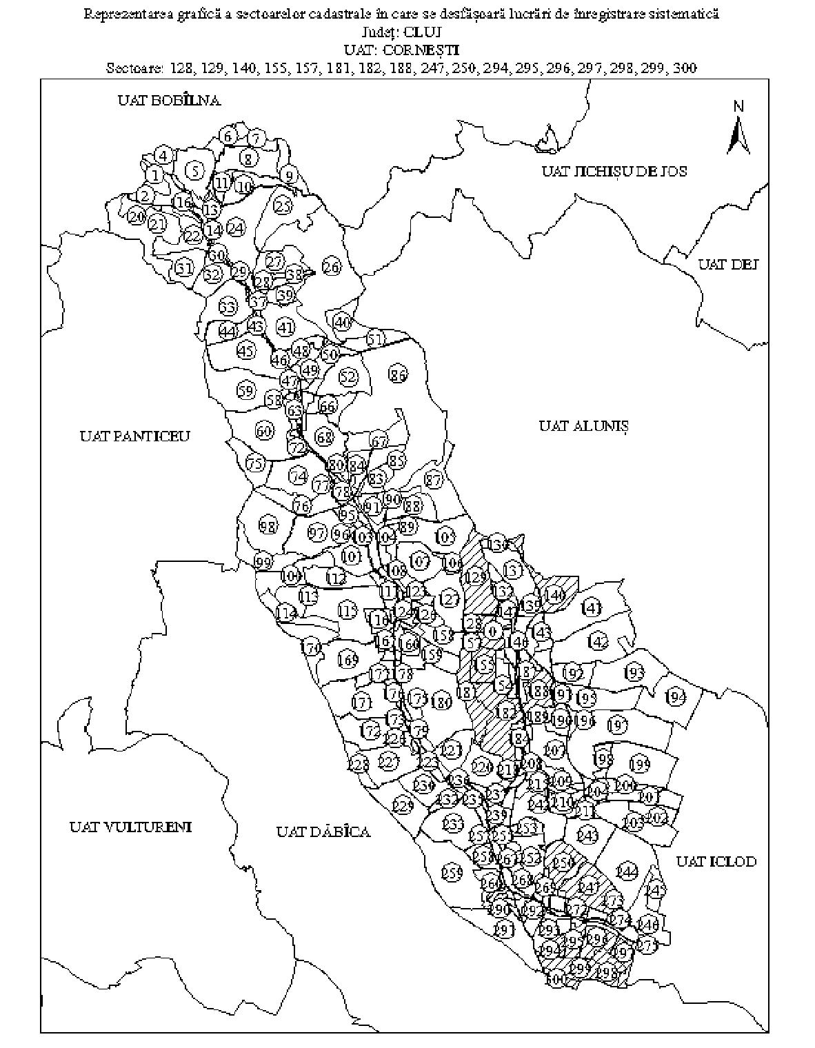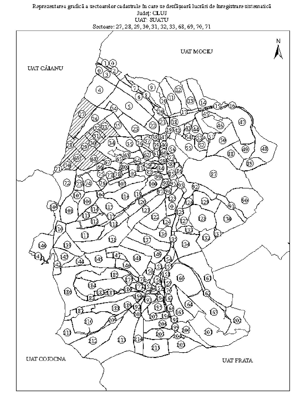 Având în vedere prevederile art. 11 alin. (1) din Legea cadastrului şi a publicităţii imobiliare nr. 7/1996, republicată, cu modificările şi completările ulterioare, şi ale art. 15 alin. (3) din Regulamentul de organizare şi funcţionare a Agenţiei Naţionale de Cadastru şi Publicitate Imobiliară, aprobat prin Hotărârea Guvernului nr. 1.288/2012, cu modificările şi completările ulterioare, în temeiul art. 3 alin. (13) din Legea cadastrului şi a publicităţii imobiliare nr. 7/1996, republicată, cu modificările şi completările ulterioare, directorul general al Agenţiei Naţionale de Cadastru şi Publicitate Imobiliară emite prezentul ordin. Articolul 1 Se aprobă începerea lucrărilor de înregistrare sistematică a imobilelor, pe sectoare cadastrale, situate pe teritoriul a 12 unităţi administrativ-teritoriale din judeţul Cluj, după cum urmează: a)unitatea administrativ-teritorială Aşchileu - sectoarele cadastrale nr. 121, 161, 166, 167, 168 şi 183; b)unitatea administrativ-teritorială Bobâlna - sectoarele cadastrale nr. 28, 29 şi 30; c)unitatea administrativ-teritorială Bonţida - sectoarele cadastrale nr. 145, 146, 147, 148, 150 şi 160; d)unitatea administrativ-teritorială Cămăraşu - sectoarele cadastrale nr. 1, 2, 117 şi 178; e)unitatea administrativ-teritorială Câţcău - sectoarele cadastrale nr. 55, 92, 107, 125 şi 126; f)unitatea administrativ-teritorială Corneşti - sectoarele cadastrale nr. 128, 129, 140, 155, 157, 181, 182, 188, 247, 250, 294, 295, 296, 297, 298, 299 şi 300; g)unitatea administrativ-teritorială Cuzdrioara - sectoarele cadastrale nr. 63, 64, 65, 66, 67, 69, 70, 72, 73 şi 74; h)unitatea administrativ-teritorială Ploscoş - sectoarele cadastrale nr. 4, 5, 6, 35, 43, 44, 51, 52, 53, 54, 58, 59, 60, 61 şi 62; i)unitatea administrativ-teritorială Sic - sectoarele cadastrale nr. 26, 27, 161, 162, 163, 177 şi 178; j)unitatea administrativ-teritorială Sânpaul - sectoarele cadastrale nr. 84, 86, 87, 88, 89, 90, 91, 100, 107, 113, 114, 130, 131, 132, 133, 134, 156 şi 157; k)unitatea administrativ-teritorială Suatu - sectoarele cadastrale nr. 27, 28, 29, 30, 31, 32, 33, 68, 69, 70 şi 71; l)unitatea administrativ-teritorială Vad - sectoarele cadastrale nr. 12, 13, 36, 39, 40, 71, 72, 101, 102, 103, 109, 112, 113, 115, 117, 119, 122, 123, 159, 160, 161, 162, 163 şi 166. Articolul 2 Reprezentarea grafică a sectoarelor cadastrale în care se desfăşoară lucrările de înregistrare sistematică a imobilelor este prevăzută în anexele nr. 1-12 la prezentul ordin. Articolul 3 Anexele nr. 1-12*) fac parte integrantă din prezentul ordin. *) Anexele nr. 1-12 sunt reproduse în facsimil. Articolul 4 Prezentul ordin se publică în Monitorul Oficial al României, Partea I. Directorul general al Agenţiei Naţionale de Cadastru şi Publicitate Imobiliară, Radu Codruţ Ştefănescu ANEXA Nr. 1