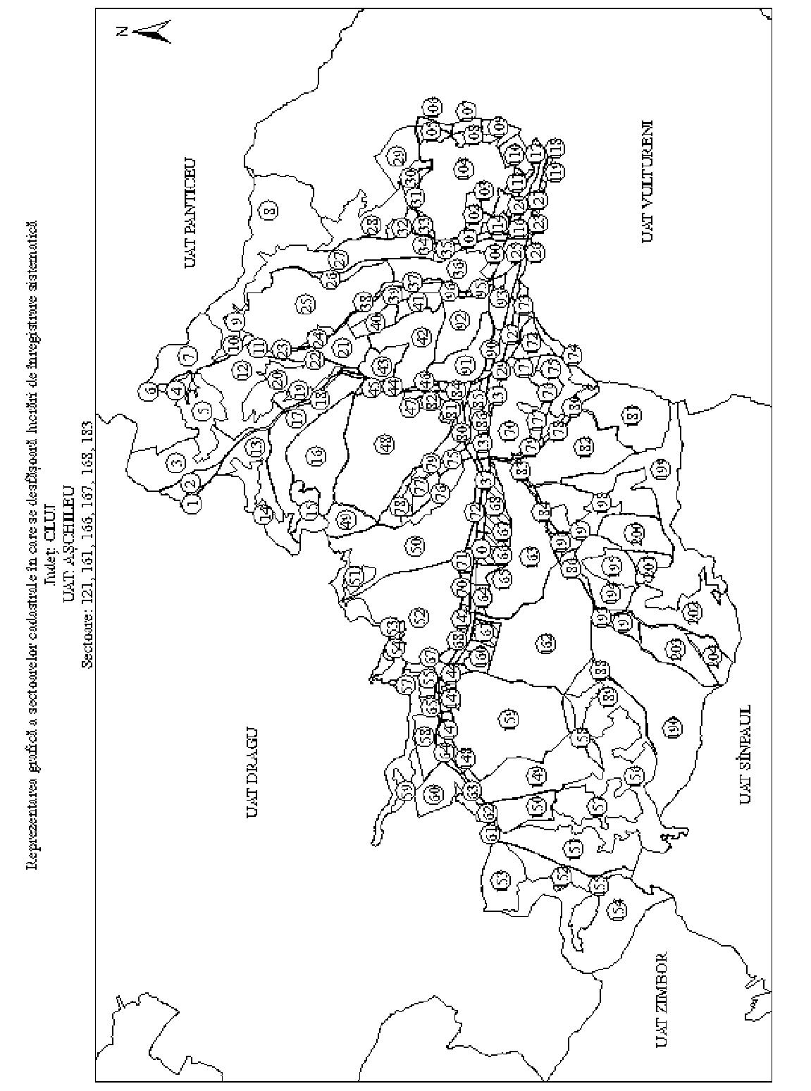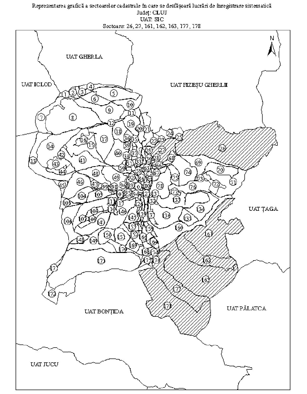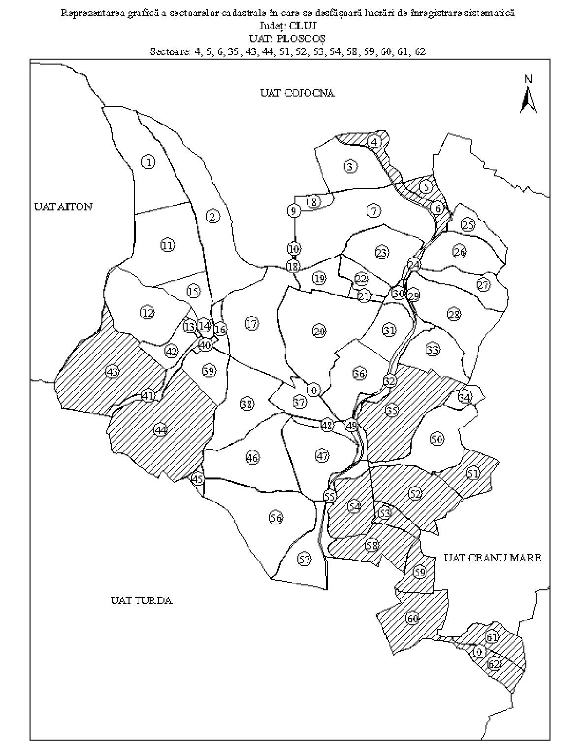Având în vedere prevederile art. 11 alin. (1) din Legea cadastrului şi a publicităţii imobiliare nr. 7/1996, republicată, cu modificările şi completările ulterioare, şi ale art. 15 alin. (3) din Regulamentul de organizare şi funcţionare a Agenţiei Naţionale de Cadastru şi Publicitate Imobiliară, aprobat prin Hotărârea Guvernului nr. 1.288/2012, cu modificările şi completările ulterioare, în temeiul art. 3 alin. (13) din Legea cadastrului şi a publicităţii imobiliare nr. 7/1996, republicată, cu modificările şi completările ulterioare, directorul general al Agenţiei Naţionale de Cadastru şi Publicitate Imobiliară emite prezentul ordin. Articolul 1 Se aprobă începerea lucrărilor de înregistrare sistematică a imobilelor, pe sectoare cadastrale, situate pe teritoriul a 12 unităţi administrativ-teritoriale din judeţul Cluj, după cum urmează: a)unitatea administrativ-teritorială Aşchileu - sectoarele cadastrale nr. 121, 161, 166, 167, 168 şi 183; b)unitatea administrativ-teritorială Bobâlna - sectoarele cadastrale nr. 28, 29 şi 30; c)unitatea administrativ-teritorială Bonţida - sectoarele cadastrale nr. 145, 146, 147, 148, 150 şi 160; d)unitatea administrativ-teritorială Cămăraşu - sectoarele cadastrale nr. 1, 2, 117 şi 178; e)unitatea administrativ-teritorială Câţcău - sectoarele cadastrale nr. 55, 92, 107, 125 şi 126; f)unitatea administrativ-teritorială Corneşti - sectoarele cadastrale nr. 128, 129, 140, 155, 157, 181, 182, 188, 247, 250, 294, 295, 296, 297, 298, 299 şi 300; g)unitatea administrativ-teritorială Cuzdrioara - sectoarele cadastrale nr. 63, 64, 65, 66, 67, 69, 70, 72, 73 şi 74; h)unitatea administrativ-teritorială Ploscoş - sectoarele cadastrale nr. 4, 5, 6, 35, 43, 44, 51, 52, 53, 54, 58, 59, 60, 61 şi 62; i)unitatea administrativ-teritorială Sic - sectoarele cadastrale nr. 26, 27, 161, 162, 163, 177 şi 178; j)unitatea administrativ-teritorială Sânpaul - sectoarele cadastrale nr. 84, 86, 87, 88, 89, 90, 91, 100, 107, 113, 114, 130, 131, 132, 133, 134, 156 şi 157; k)unitatea administrativ-teritorială Suatu - sectoarele cadastrale nr. 27, 28, 29, 30, 31, 32, 33, 68, 69, 70 şi 71; l)unitatea administrativ-teritorială Vad - sectoarele cadastrale nr. 12, 13, 36, 39, 40, 71, 72, 101, 102, 103, 109, 112, 113, 115, 117, 119, 122, 123, 159, 160, 161, 162, 163 şi 166. Articolul 2 Reprezentarea grafică a sectoarelor cadastrale în care se desfăşoară lucrările de înregistrare sistematică a imobilelor este prevăzută în anexele nr. 1-12 la prezentul ordin. Articolul 3 Anexele nr. 1-12*) fac parte integrantă din prezentul ordin. *) Anexele nr. 1-12 sunt reproduse în facsimil. Articolul 4 Prezentul ordin se publică în Monitorul Oficial al României, Partea I. Directorul general al Agenţiei Naţionale de Cadastru şi Publicitate Imobiliară, Radu Codruţ Ştefănescu ANEXA Nr. 1