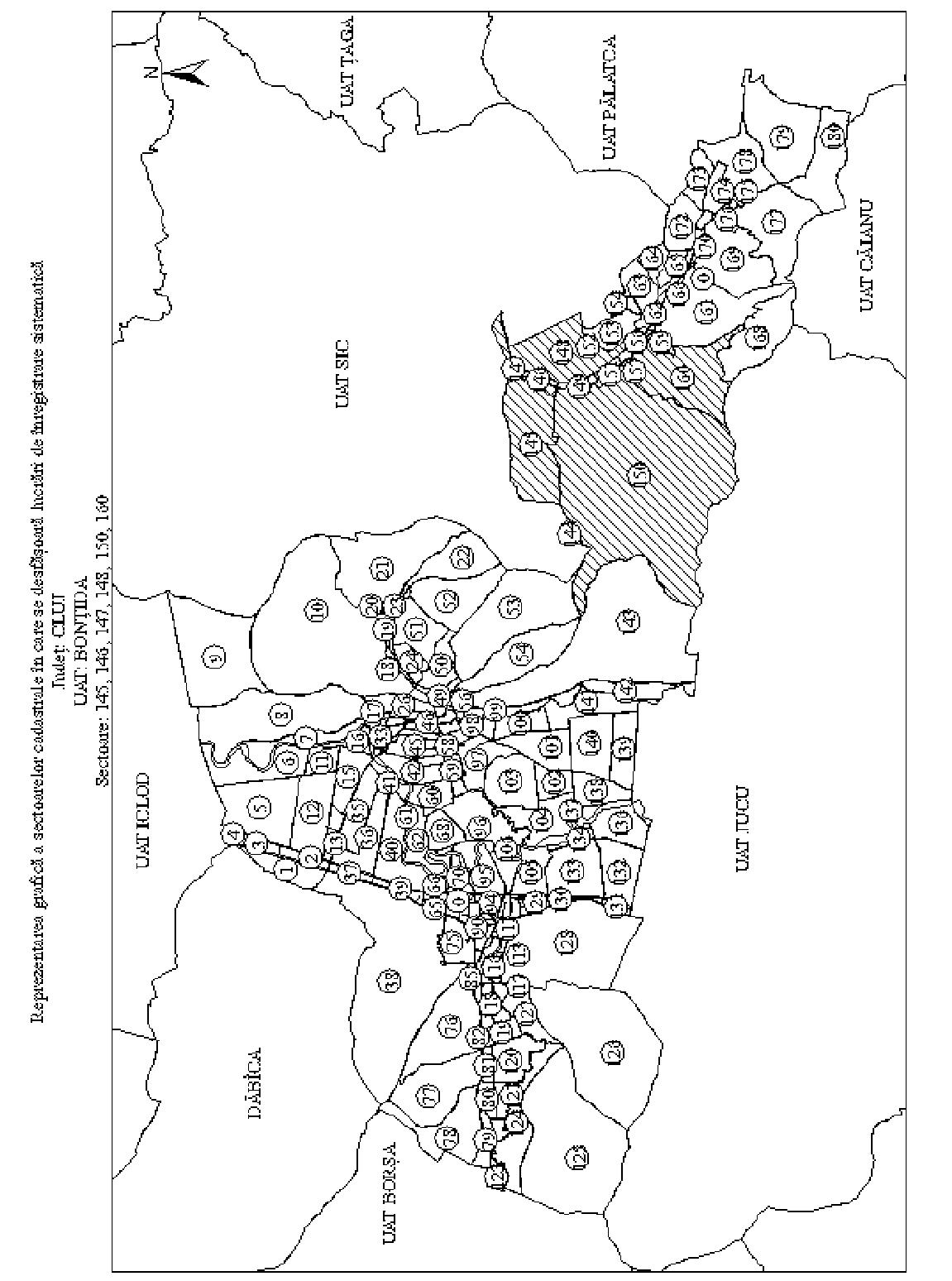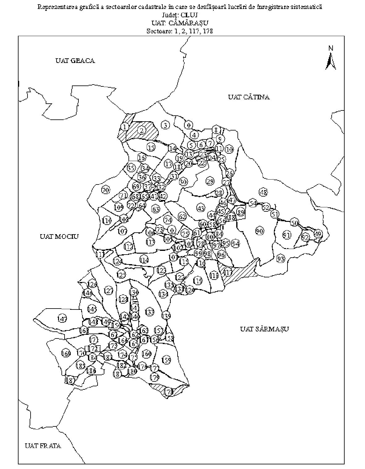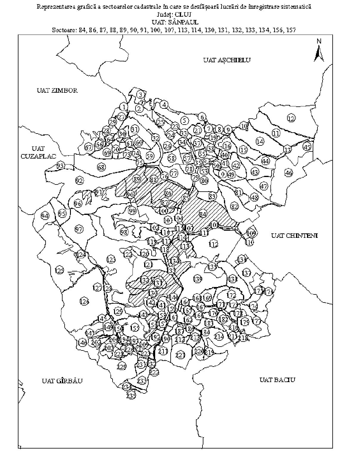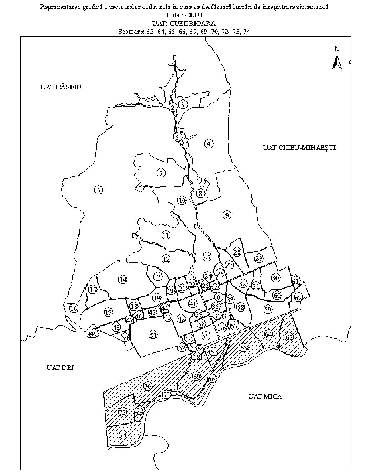 Având în vedere prevederile art. 11 alin. (1) din Legea cadastrului şi a publicităţii imobiliare nr. 7/1996, republicată, cu modificările şi completările ulterioare, şi ale art. 15 alin. (3) din Regulamentul de organizare şi funcţionare a Agenţiei Naţionale de Cadastru şi Publicitate Imobiliară, aprobat prin Hotărârea Guvernului nr. 1.288/2012, cu modificările şi completările ulterioare, în temeiul art. 3 alin. (13) din Legea cadastrului şi a publicităţii imobiliare nr. 7/1996, republicată, cu modificările şi completările ulterioare, directorul general al Agenţiei Naţionale de Cadastru şi Publicitate Imobiliară emite prezentul ordin. Articolul 1 Se aprobă începerea lucrărilor de înregistrare sistematică a imobilelor, pe sectoare cadastrale, situate pe teritoriul a 12 unităţi administrativ-teritoriale din judeţul Cluj, după cum urmează: a)unitatea administrativ-teritorială Aşchileu - sectoarele cadastrale nr. 121, 161, 166, 167, 168 şi 183; b)unitatea administrativ-teritorială Bobâlna - sectoarele cadastrale nr. 28, 29 şi 30; c)unitatea administrativ-teritorială Bonţida - sectoarele cadastrale nr. 145, 146, 147, 148, 150 şi 160; d)unitatea administrativ-teritorială Cămăraşu - sectoarele cadastrale nr. 1, 2, 117 şi 178; e)unitatea administrativ-teritorială Câţcău - sectoarele cadastrale nr. 55, 92, 107, 125 şi 126; f)unitatea administrativ-teritorială Corneşti - sectoarele cadastrale nr. 128, 129, 140, 155, 157, 181, 182, 188, 247, 250, 294, 295, 296, 297, 298, 299 şi 300; g)unitatea administrativ-teritorială Cuzdrioara - sectoarele cadastrale nr. 63, 64, 65, 66, 67, 69, 70, 72, 73 şi 74; h)unitatea administrativ-teritorială Ploscoş - sectoarele cadastrale nr. 4, 5, 6, 35, 43, 44, 51, 52, 53, 54, 58, 59, 60, 61 şi 62; i)unitatea administrativ-teritorială Sic - sectoarele cadastrale nr. 26, 27, 161, 162, 163, 177 şi 178; j)unitatea administrativ-teritorială Sânpaul - sectoarele cadastrale nr. 84, 86, 87, 88, 89, 90, 91, 100, 107, 113, 114, 130, 131, 132, 133, 134, 156 şi 157; k)unitatea administrativ-teritorială Suatu - sectoarele cadastrale nr. 27, 28, 29, 30, 31, 32, 33, 68, 69, 70 şi 71; l)unitatea administrativ-teritorială Vad - sectoarele cadastrale nr. 12, 13, 36, 39, 40, 71, 72, 101, 102, 103, 109, 112, 113, 115, 117, 119, 122, 123, 159, 160, 161, 162, 163 şi 166. Articolul 2 Reprezentarea grafică a sectoarelor cadastrale în care se desfăşoară lucrările de înregistrare sistematică a imobilelor este prevăzută în anexele nr. 1-12 la prezentul ordin. Articolul 3 Anexele nr. 1-12*) fac parte integrantă din prezentul ordin. *) Anexele nr. 1-12 sunt reproduse în facsimil. Articolul 4 Prezentul ordin se publică în Monitorul Oficial al României, Partea I. Directorul general al Agenţiei Naţionale de Cadastru şi Publicitate Imobiliară, Radu Codruţ Ştefănescu ANEXA Nr. 1