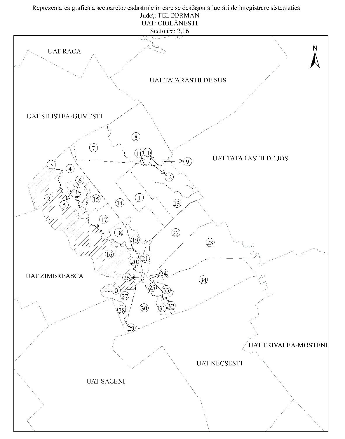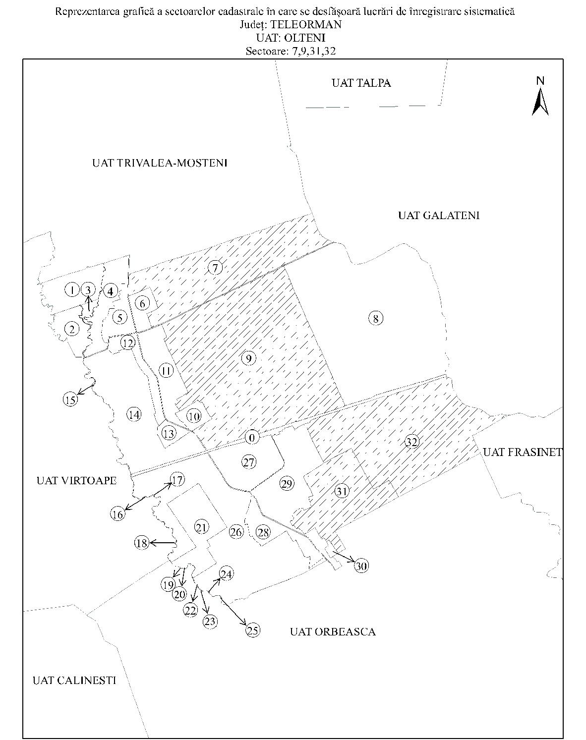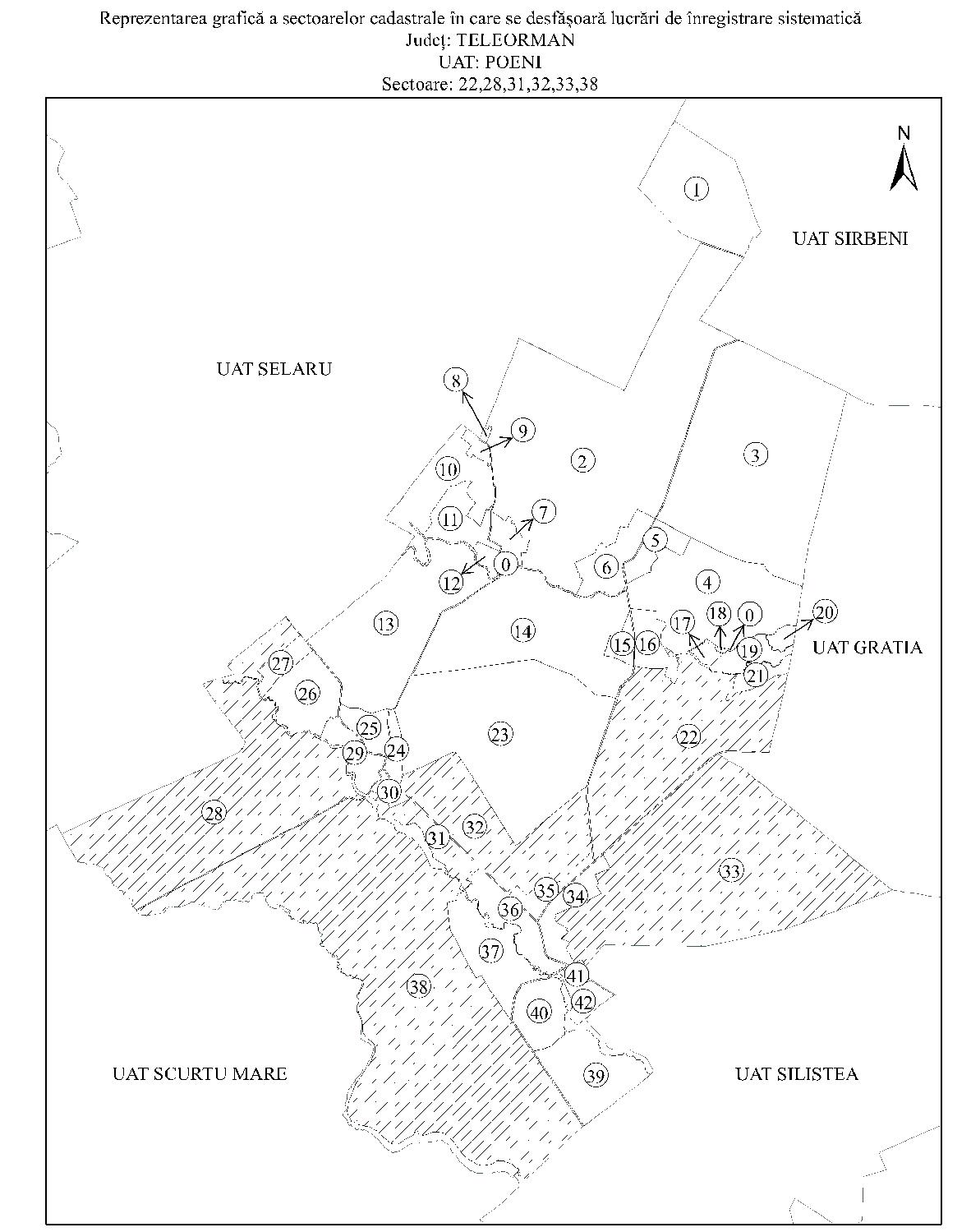 Având în vedere prevederile art. 11 alin. (1) din Legea cadastrului şi a publicităţii imobiliare nr. 7/1996, republicată, cu modificările şi completările ulterioare, şi ale art. 15 alin. (3) din Regulamentul de organizare şi funcţionare a Agenţiei Naţionale de Cadastru şi Publicitate Imobiliară, aprobat prin Hotărârea Guvernului nr. 1.288/2012, cu modificările şi completările ulterioare,în temeiul art. 3 alin. (13) din Legea cadastrului şi a publicităţii imobiliare nr. 7/1996, republicată, cu modificările şi completările ulterioare,directorul general al Agenţiei Naţionale de Cadastru şi Publicitate Imobiliară emite prezentul ordin. Articolul 1Se aprobă începerea lucrărilor de înregistrare sistematică a imobilelor, pe sectoare cadastrale, situate pe teritoriul a 4 unităţi administrativ-teritoriale din judeţul Teleorman, după cum urmează: a)unitatea administrativ-teritorială Ciolăneşti - sectoarele cadastrale nr. 2 şi 16; b)unitatea administrativ-teritorială Olteni - sectoarele cadastrale nr. 7, 9, 31 şi 32; c)unitatea administrativ-teritorială Poeni - sectoarele cadastrale nr. 22, 28, 31, 32, 33 şi 38; d)unitatea administrativ-teritorială Viişoara - sectoarele cadastrale nr. 6, 7 şi 8. Articolul 2Reprezentarea grafică a sectoarelor cadastrale în care se desfăşoară lucrările de înregistrare sistematică a imobilelor este prevăzută în anexele nr. 1-4*) la prezentul ordin. *) Anexele nr. 1-4 sunt reproduse în facsimil. Articolul 3Anexele nr. 1-4 fac parte integrantă din prezentul ordin. Articolul 4 Prezentul ordin se publică în Monitorul Oficial al României, Partea I.Directorul general al Agenţiei Naţionale de Cadastru şi Publicitate Imobiliară,Radu-Codruţ ŞtefănescuANEXA Nr. 1 ANEXA Nr. 2 ANEXA Nr. 3 ANEXA Nr. 4