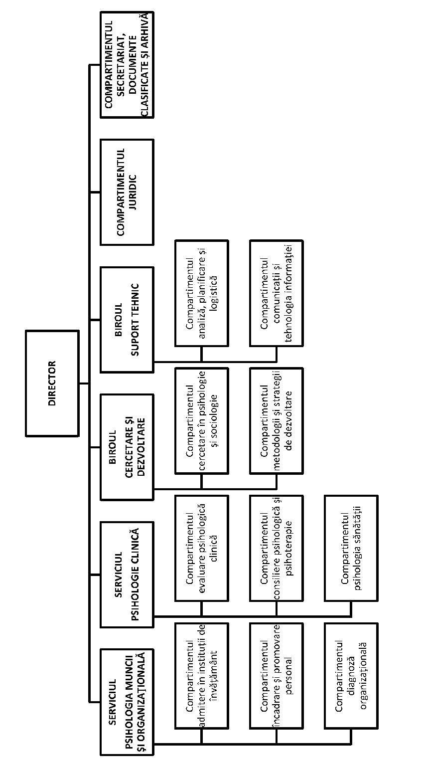 f)Compartimentul juridic; g)Compartimentul secretariat, documente clasificate şi arhivă. (2) Organigrama Centrului este prezentată în anexa nr. 1.(3) Diagrama principalelor relaţii ale Centrului este prevăzută în anexa nr. 2 Articolul 7Şefii serviciilor/birourilor şi coordonatorii compartimentelor independente răspund în condiţiile legii, potrivit fişei posturilor, în faţa directorului Centrului sau a înlocuitorului legal, de activitatea structurilor organizatorice pe care le conduc/coordonează. Capitolul IIIAtribuţiile Centrului Articolul 8 (1) Centrul are următoarele atribuţii generale:a)execută sau coordonează, după caz, măsuri pentru proiectarea şi optimizarea cadrului normativ, conceptual, procedural şi metodologic al activităţilor din sfera de responsabilitate; b)asigură concepţia unitară a organizării şi desfăşurării activităţii de psihologie din competenţă şi avizează metodologiile/procedurile de lucru ale structurilor de specialitate aflate în coordonare; c)planifică, organizează şi desfăşoară activitatea de evaluare psihologică în scopul participării la concursurile de admitere în instituţiile de formare a personalului ministerului, selecţionării în vederea încadrării/angajării, trecerii poliţiştilor/cadrelor militare într-o categorie/corp superior, promovării în funcţii de conducere, transferului în minister al unor specialişti din instituţiile publice de apărare şi siguranţă naţională, stabilirii situaţiei medico-profesionale/militare pe baza diagnosticului psihiatric, participării la misiuni internaţionale şi multinaţionale, îndeplinirii funcţiilor de reprezentare externă, executării activităţilor/misiunilor care expun personalul angajat în desfăşurarea lor la riscuri psihosociale, exercitării controlului financiar preventiv propriu, atestării pentru activităţi cu cifru, atestării instructorilor şi evaluatorilor conducătorilor auto, acordării dreptului de a conduce autovehicule aparţinând unităţilor ministerului, precum şi în alte situaţii prevăzute de reglementările în vigoare; d)analizează şi soluţionează contestaţiile cu privire la avizul psihologic, formulate în condiţiile legii; e)asigură asistenţa psihologică a personalului unităţilor din componenţa aparatului central al ministerului şi subordonate acestuia care nu au încadrat psiholog; f)organizează şi desfăşoară activităţi de diagnoză organizaţională la nivelul structurilor ministerului; g)organizează şi desfăşoară sondaje de opinie, anchete şi cercetări sociologice în rândul personalului ministerului şi, dacă se impune, al cetăţenilor beneficiari ai serviciilor prestate de structurile ministerului şi/sau în cadrul instituţiilor colaboratoare; h)planifică, organizează şi desfăşoară activităţi de cercetare psihologică aplicativă în scopul fundamentării ştiinţifice şi al creşterii calităţii actului psihologic; i)stabileşte/actualizează criteriile de încadrare a activităţilor în condiţii cu grad ridicat de risc psihosocial şi coordonează studiile de analiză psihologică a activităţii profesionale; j)coordonează, controlează şi monitorizează activitatea desfăşurată de structurile/personalul cu atribuţii în domeniul activităţii de psihologie cu privire la modul de aplicare şi respectare a cadrului normativ intern specific activităţii de psihologie, din aria de competenţă; k)stabileşte atribuţiile generale pentru structurile de profil, respectiv personalul de specialitate, aflate în coordonare, pe care le modifică sau le completează, după caz, ori de câte ori este nevoie; l)organizează şi desfăşoară activitatea de verificare a cunoştinţelor, aptitudinilor şi competenţelor de/în specialitate, în cadrul comisiilor de concurs/examen organizate în conformitate cu activitatea specifică pe linia resurselor umane privind ocuparea posturilor vacante cu atribuţii în domeniul activităţii de psihologie; m)asigură formarea profesională continuă a personalului unităţii; n)organizează periodic, singur sau în colaborare cu inspectoratele generale, direcţiile generale/direcţiile şi instituţiile de învăţământ din structura ministerului, convocări de specialitate, în scopul analizării dificultăţilor apărute în activitate, diseminării informaţiilor, a experienţei şi a bunelor practici, precum şi al clarificării unor aspecte concrete ale exercitării profesiei de psiholog şi aplicării unitare a dispoziţiilor legale din domeniu; o)organizează şi desfăşoară, în condiţiile legii, stagii de practică de specialitate în domeniul psihologiei şi al sociologiei pentru studenţii/masteranzii din cadrul instituţiilor de învăţământ superior civile; p)propune şi desfăşoară activităţi de relaţii internaţionale în domeniul de competenţă, în conformitate cu interesele instituţiei şi potrivit procedurilor legale stabilite; q)organizează şi desfăşoară activităţile pentru gestiunea datelor specifice şi stabileşte formularele şi termenele necesare întocmirii situaţiilor statistice; r)constituie, gestionează şi actualizează, în conformitate cu reglementările în vigoare, baze de date specifice necesare îndeplinirii atribuţiilor; s)analizează şi avizează, în limita competenţelor, achiziţia de instrumente, metode şi tehnici de specialitate care urmează să fie utilizate în activitatea de psihologie de către unităţile din structura ministerului; t)organizează şi desfăşoară, în colaborare cu Institutul de Studii pentru Ordine Publică, cursurile de carieră şi de perfecţionare curentă a activităţii destinate psihologilor încadraţi în unităţi centrale şi teritoriale ale ministerului; u)participă, prin personalul anume desemnat, la manifestări cu caracter ştiinţific şi profesional de profil, precum şi la realizarea unor relaţii de colabora