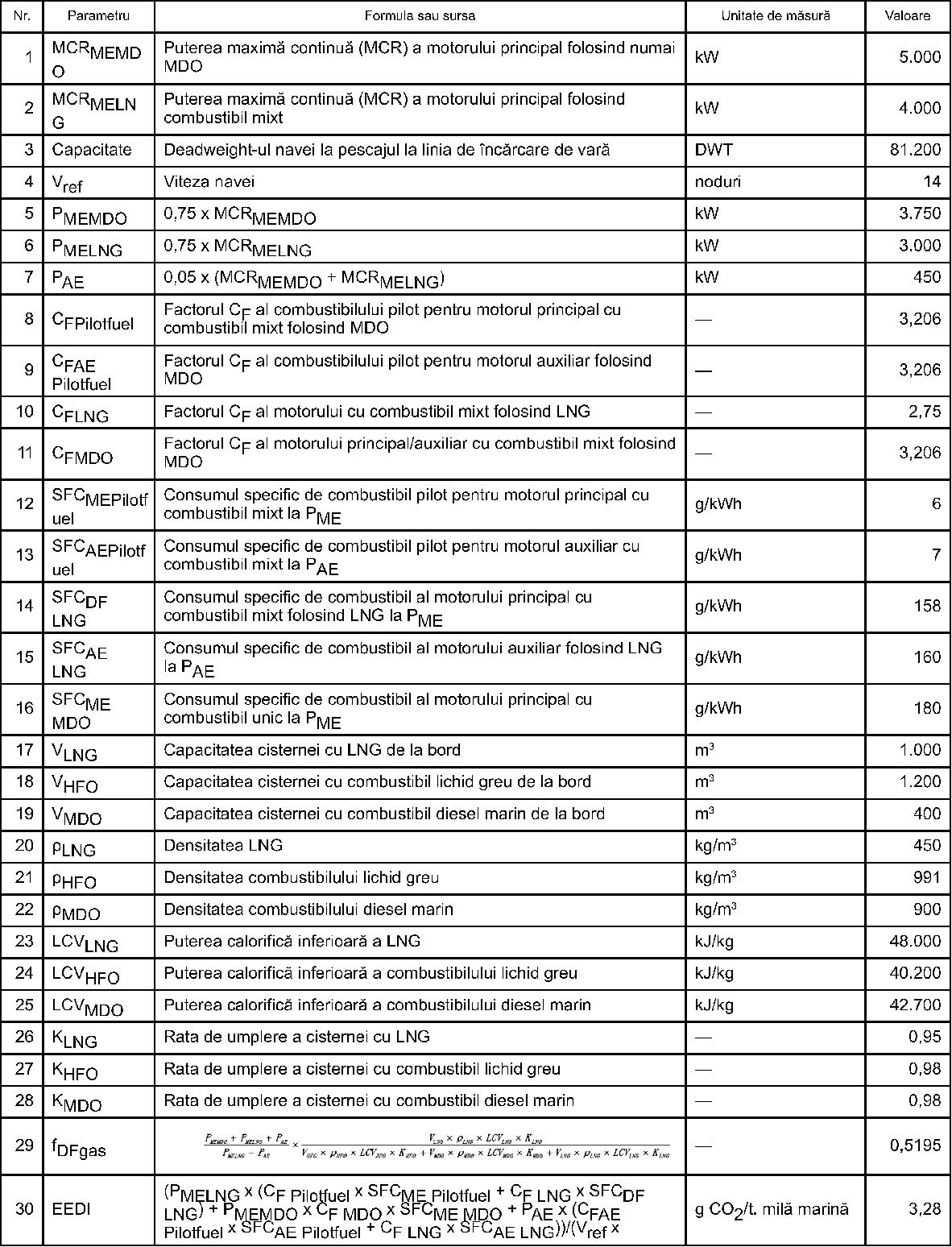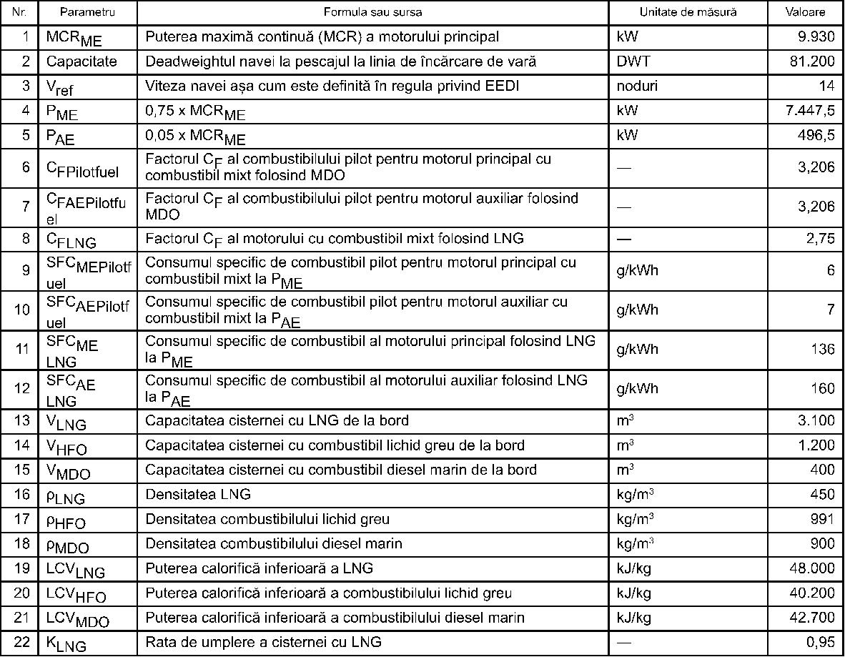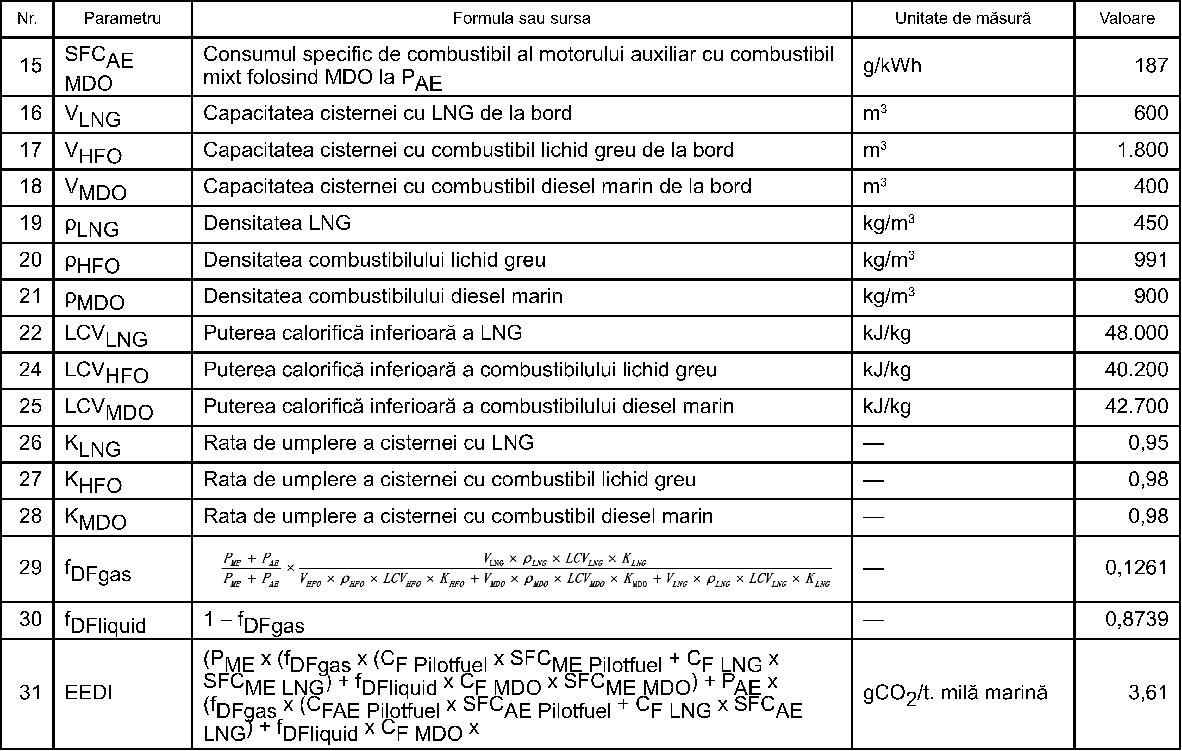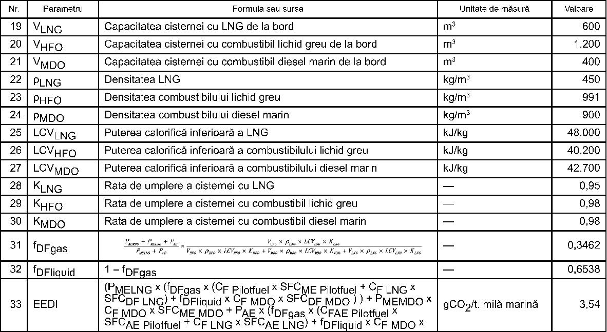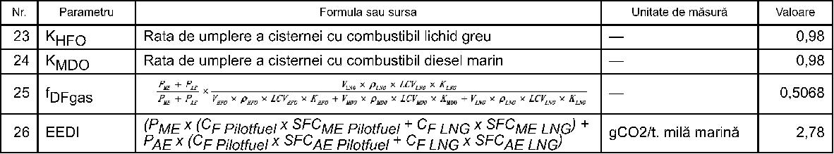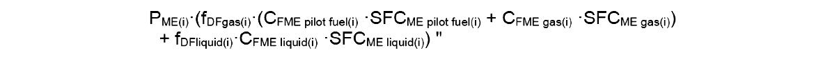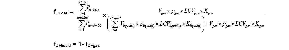în care: fDFgas este raportul de disponibilitate al combustibilului gazos corijat ţinând cont de raportul de putere al motoarelor cu gaz faţă de totalul motoarelor; fDFgas ar trebui să nu fie mai mare de 1; Vgas este capacitatea netă totală a combustibilului gazos de la bord, exprimată în m3. Dacă sunt utilizate alte dispozitive, cum ar fi containere-cisternă LNG interschimbabile (specializate) şi/sau dispozitive permiţând frecvente reumpleri cu gaz, atunci capacitatea instalaţiei complete de alimentare cu LNG ar trebui folosită pentru Vgas. Rata de evaporare (BOR) a tancurilor de marfă cu gaz poate fi calculată şi inclusă în Vgas dacă ele sunt racordate la instalaţia de alimentare cu combustibil gazos (FGSS); Vliquid este capacitatea netă totală a combustibilului lichid de la bord, exprimată în m3, a rezervoarelor de combustibil lichid racordate în permanenţă la circuitul de combustibil al navei. Dacă un rezervor de combustibil este izolat cu valve de închidere permanente, Vliquid al rezervorului de combustibil poate fi neglijată; ρgas este densitatea combustibilului gazos, exprimată în kg/m3; ρliquid este densitatea fiecărui combustibil lichid, exprimată în kg/m3; LCVgas este puterea calorifică inferioară a combustibilului gazos, exprimată în kJ/kg; LCVliquid este puterea calorifică inferioară a combustibilului lichid, exprimată în kJ/kg; Kgas este rata de umplere a rezervoarelor de combustibil gazos; Kliquid este rata de umplere a rezervoarelor de combustibil lichid; Ptotal este puterea totală instalată a motoarelor, PME şi PAE, exprimată în kW; Pgasfuel este puterea instalată a motoarelor cu combustibil mixt, PME şi PAE, exprimată în kW; .1 dacă capacitatea totală a combustibilului gazos este egală cu cel puţin 50% din capacitatea de combustibil afectată motoarelor cu combustibil mixt, şi anume fDFgas ≥ 0,5, atunci combustibilul gazos este considerat «combustibil principal» şi fDFgas = 1 şi fDFliquid = 0 pentru fiecare motor cu combustibil mixt; .2 dacă fDFgas < 0,5, atunci combustibilul gazos nu este considerat «combustibil principal». CF şi SFC folosite pentru calcularea EEDI pentru fiecare motor cu combustibil mixt (atât motorul principal, cât şi motoarele auxiliare) ar trebui calculate ca fiind media ponderată a CF şi SFC pentru modurile lichid şi gazos, în funcţie de fDFgas şi fDFliquid, şi termenul original PME(i) CFME(i) SFCME(i) din formula de calcul al EEDI trebuie de aceea înlocuit cu formula următoare: