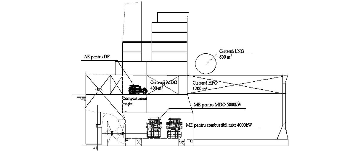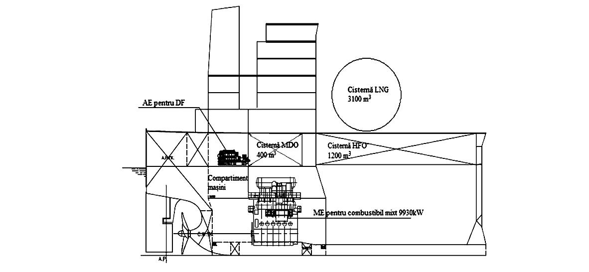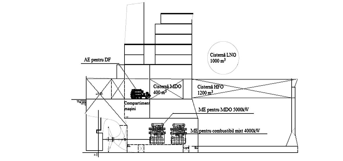 Cazul 3: LNG nu este considerat «combustibilul principal» dacă motorul principal cu combustibil mixt şi motorul auxiliar cu combustibil mixt (LNG, combustibil diesel marin pilot MDO; fără generator pe ax) sunt echipate cu cisterne cu LNG mai mici.